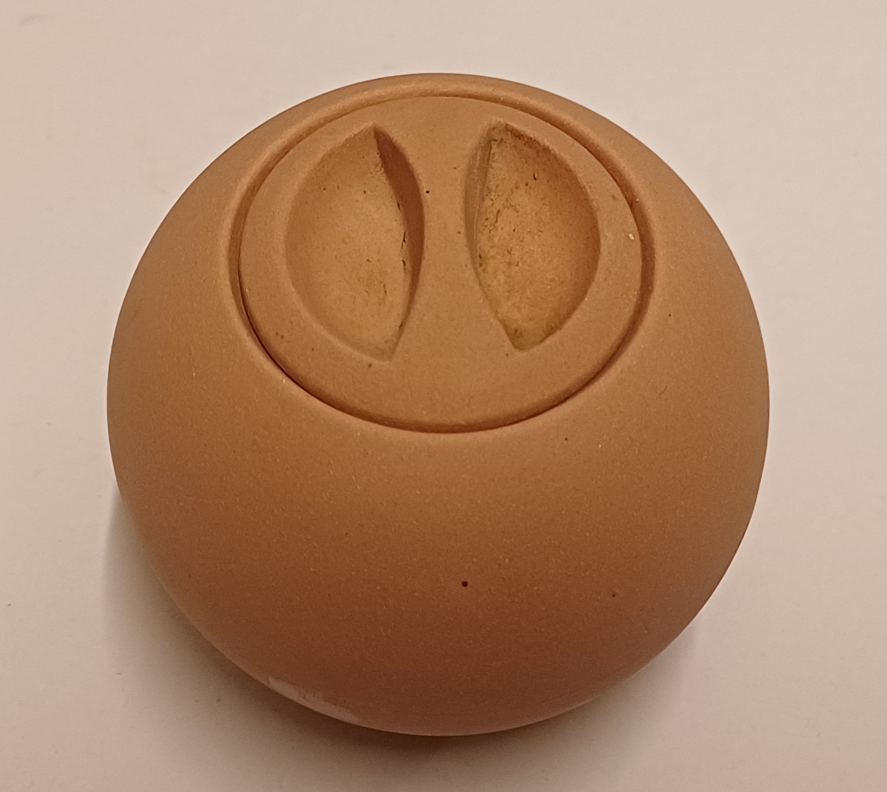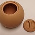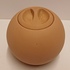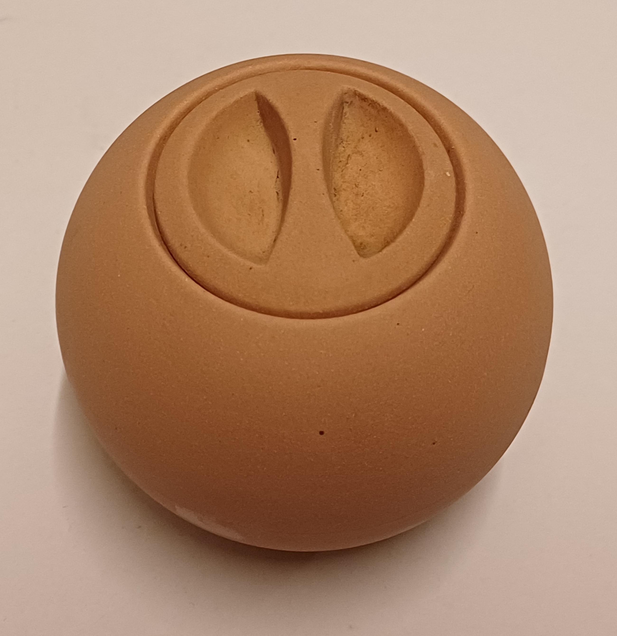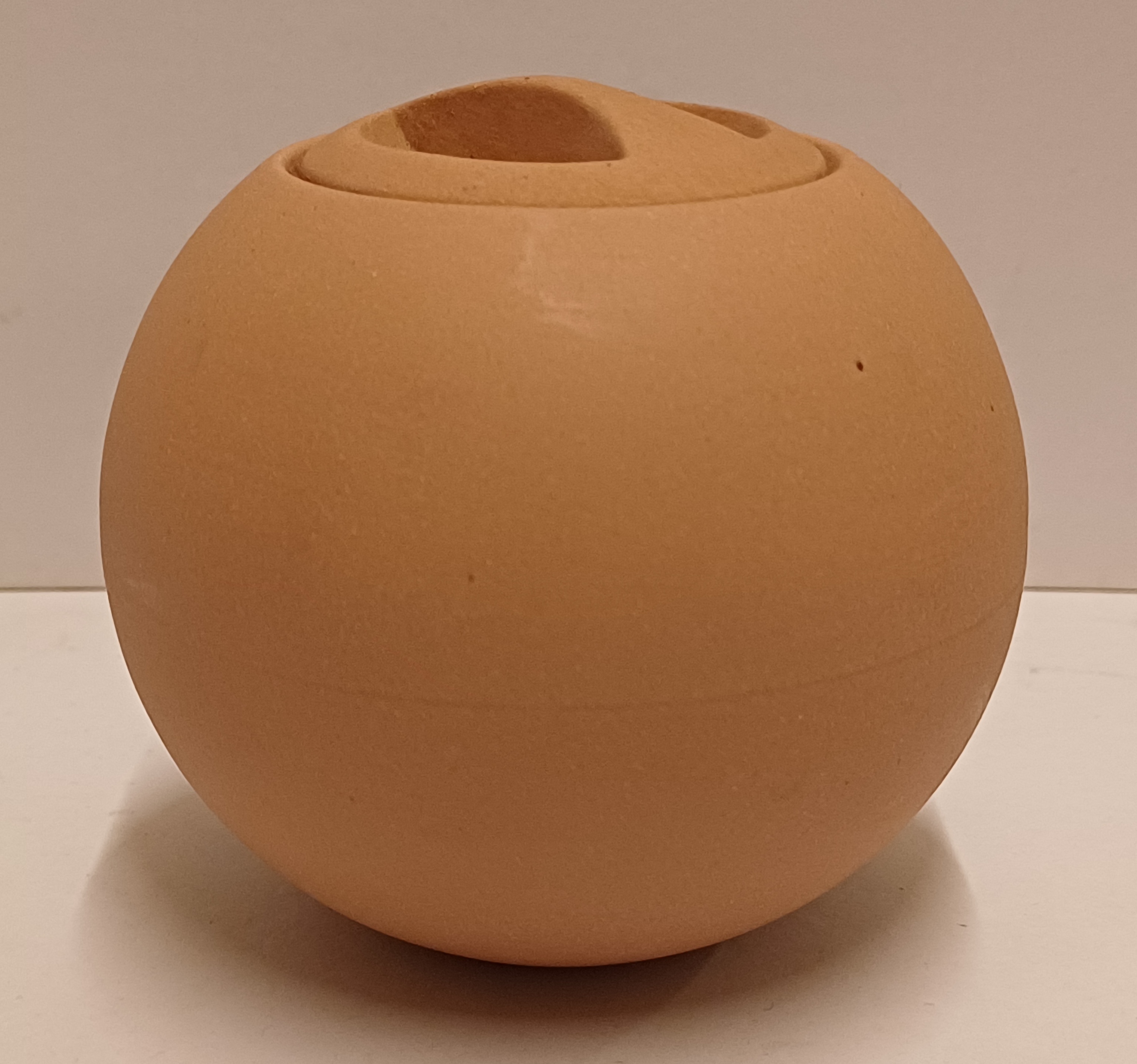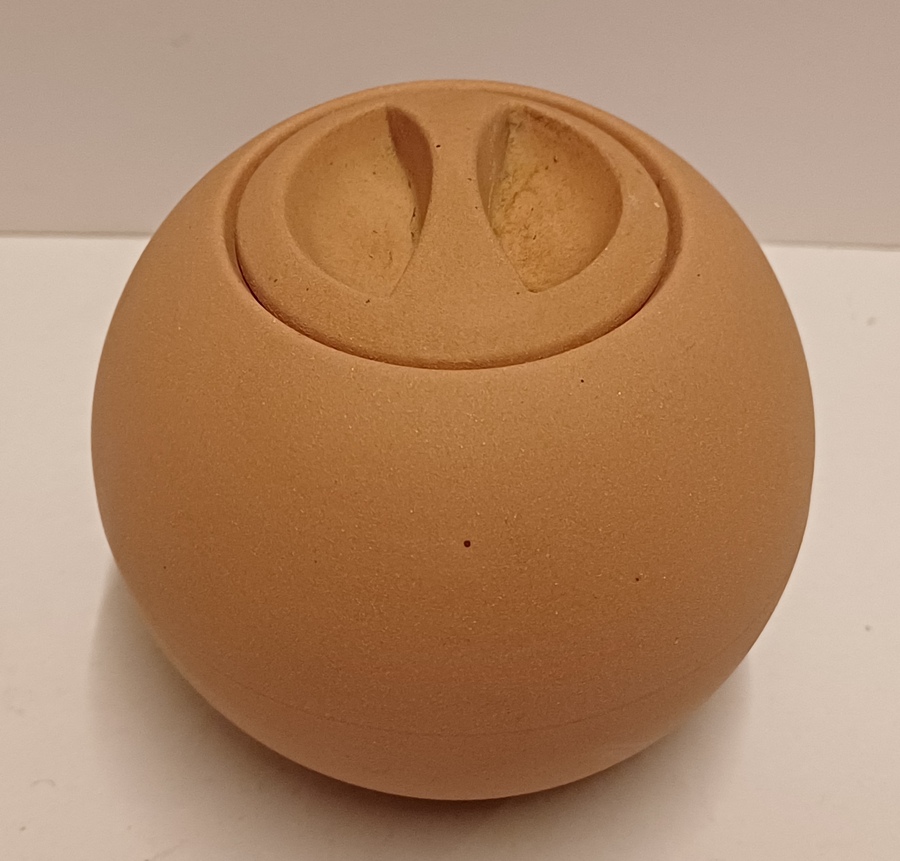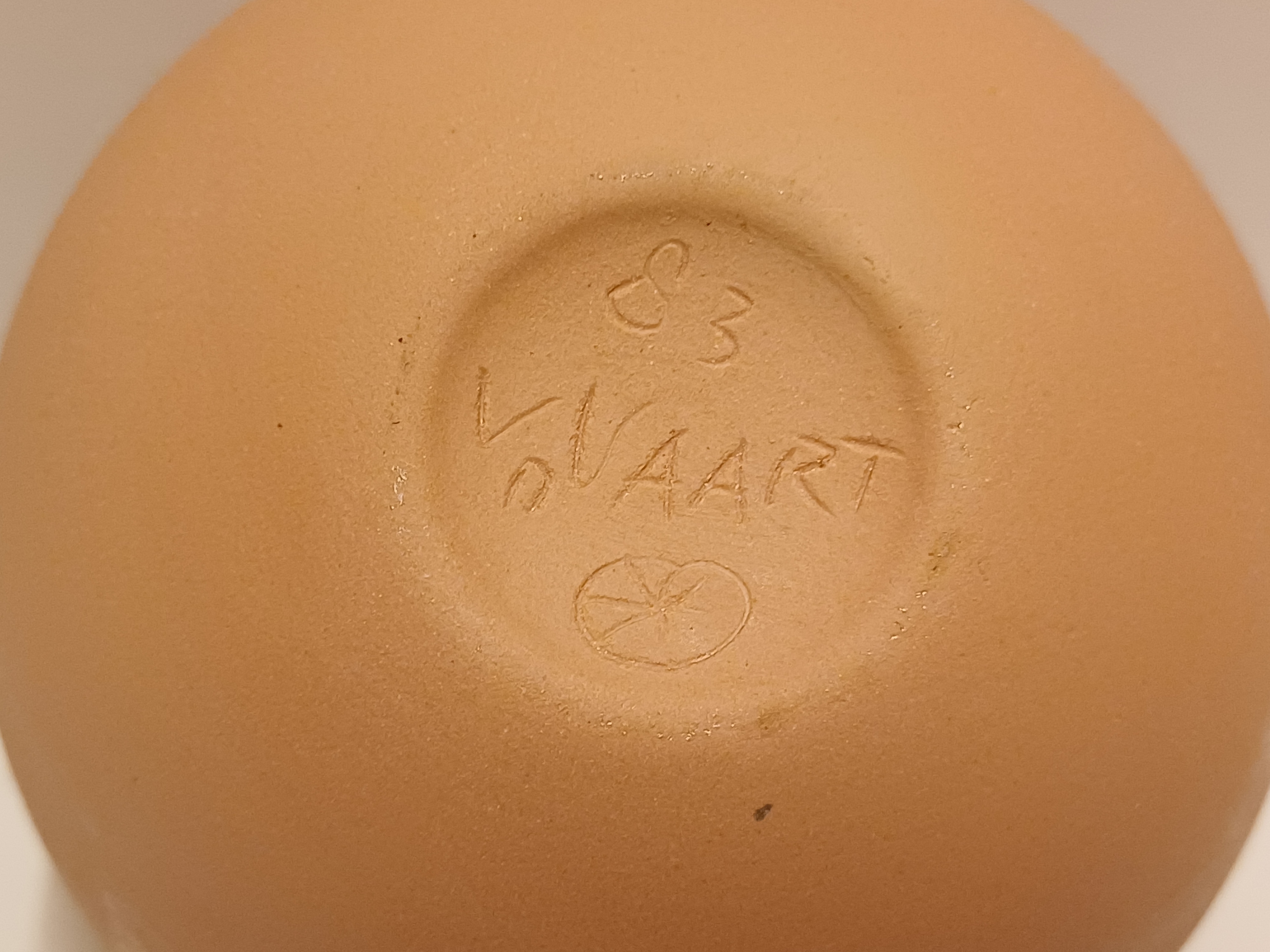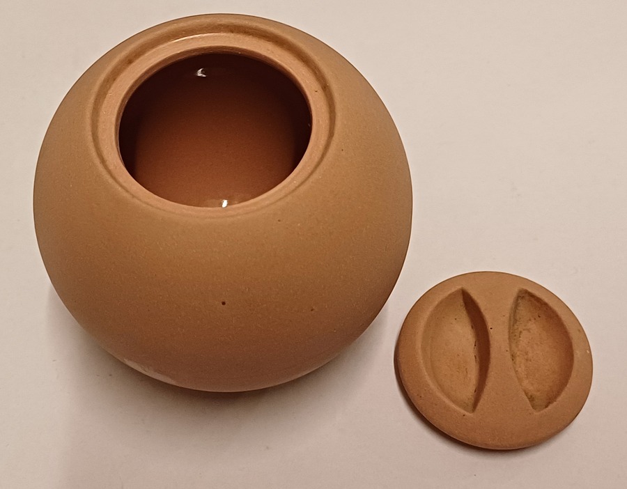 Klein rond model dekselpotje, met matte glazuur van buiten. Onderzijde met signatuur en datering ´83.