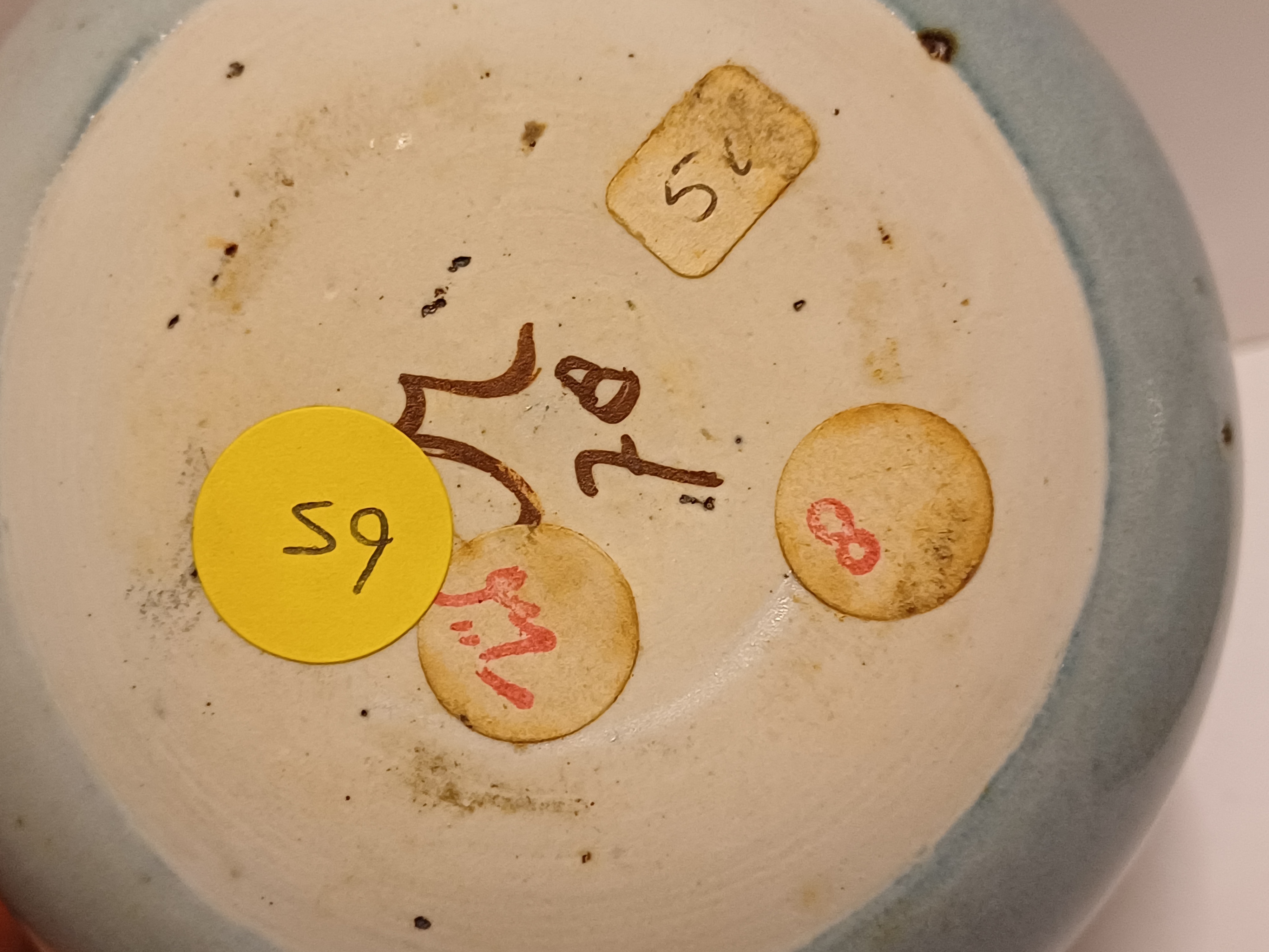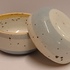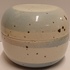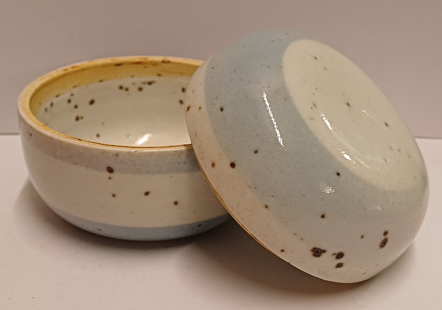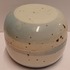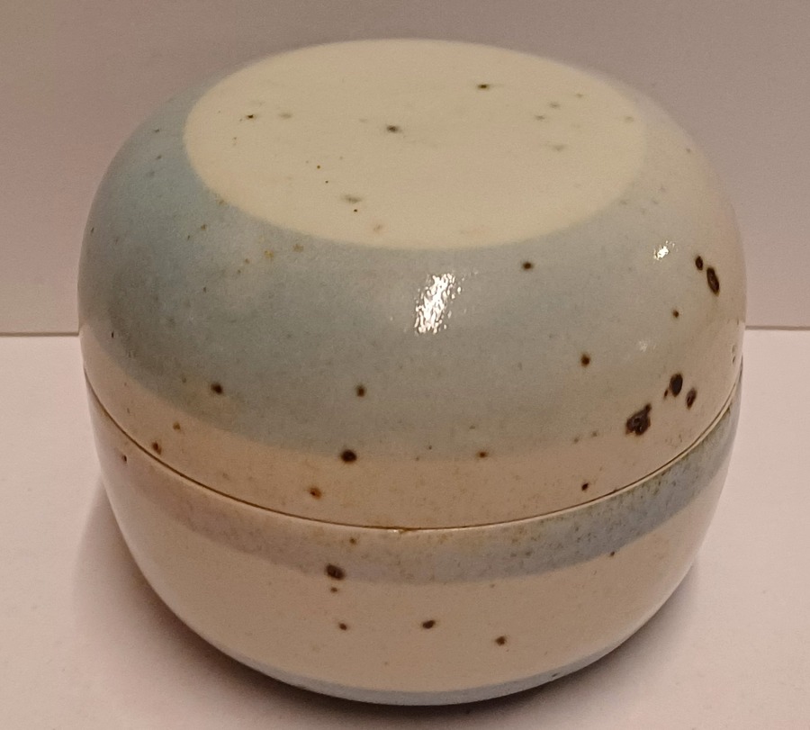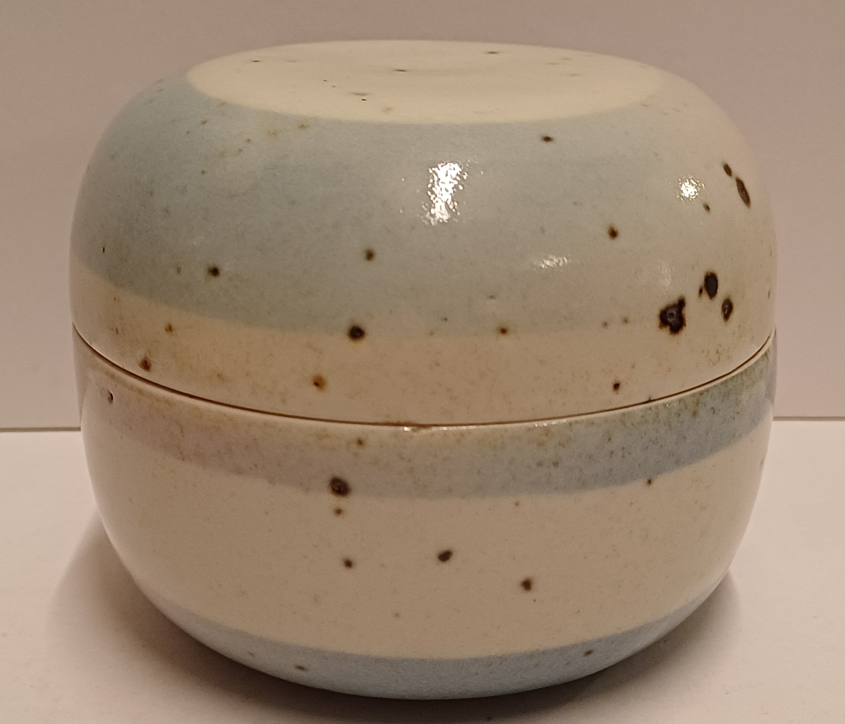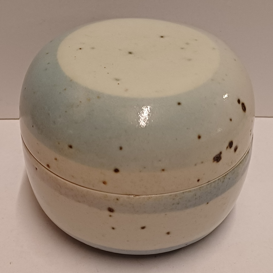 Aardewerken bolle deksledoos met lichtblauwe banen op wit gevlekt fond. Onderzijde met kunstenaars signatuur en datering '78