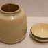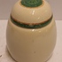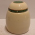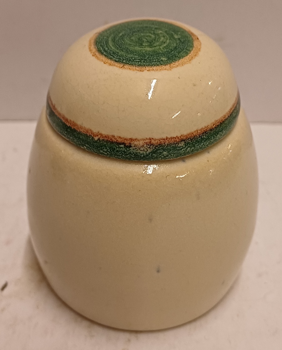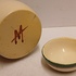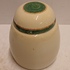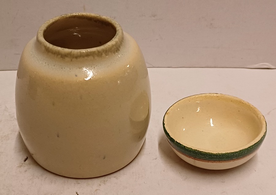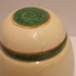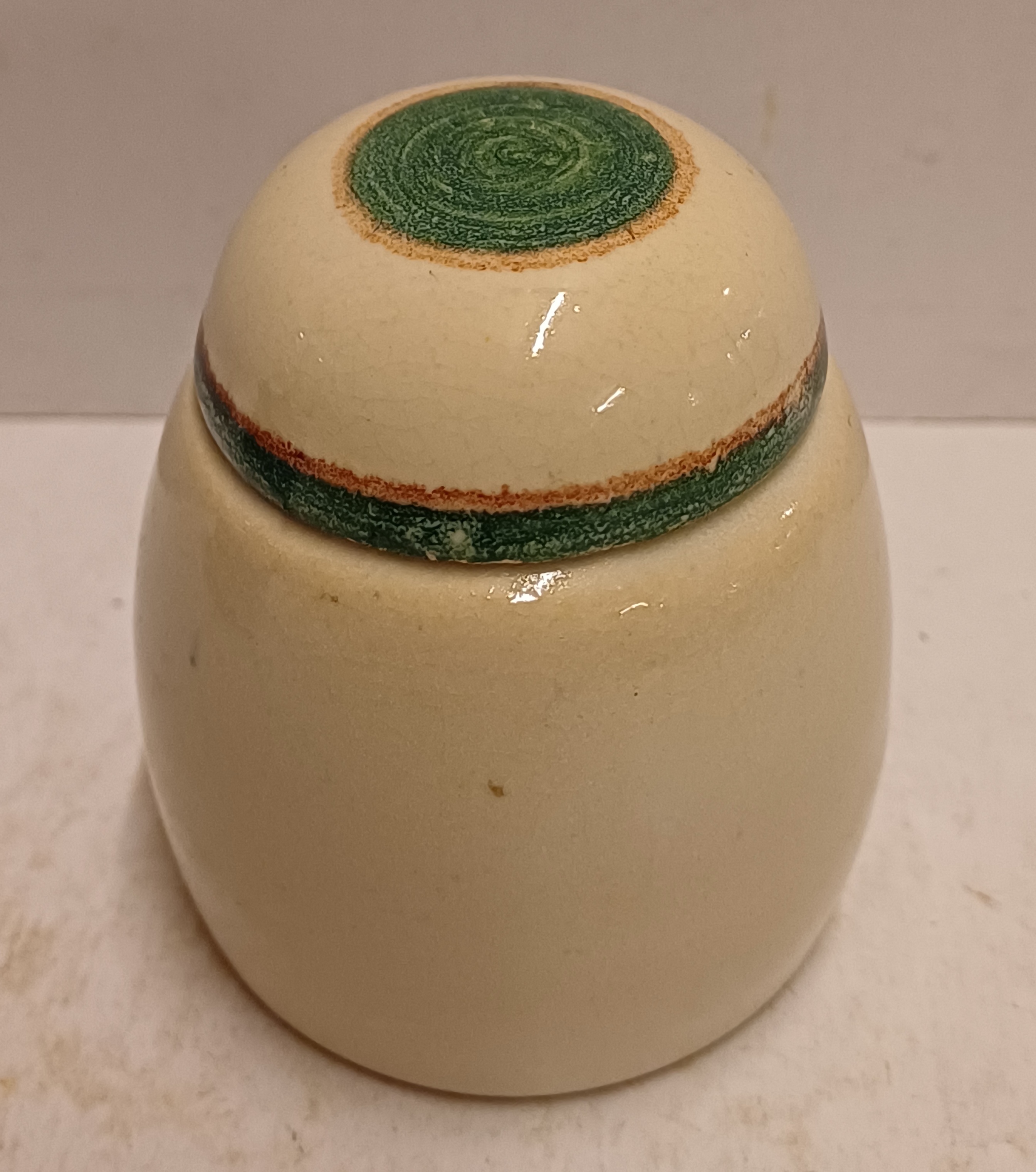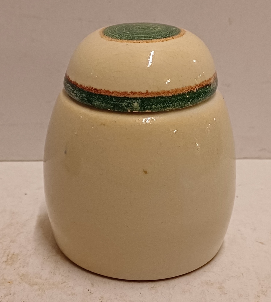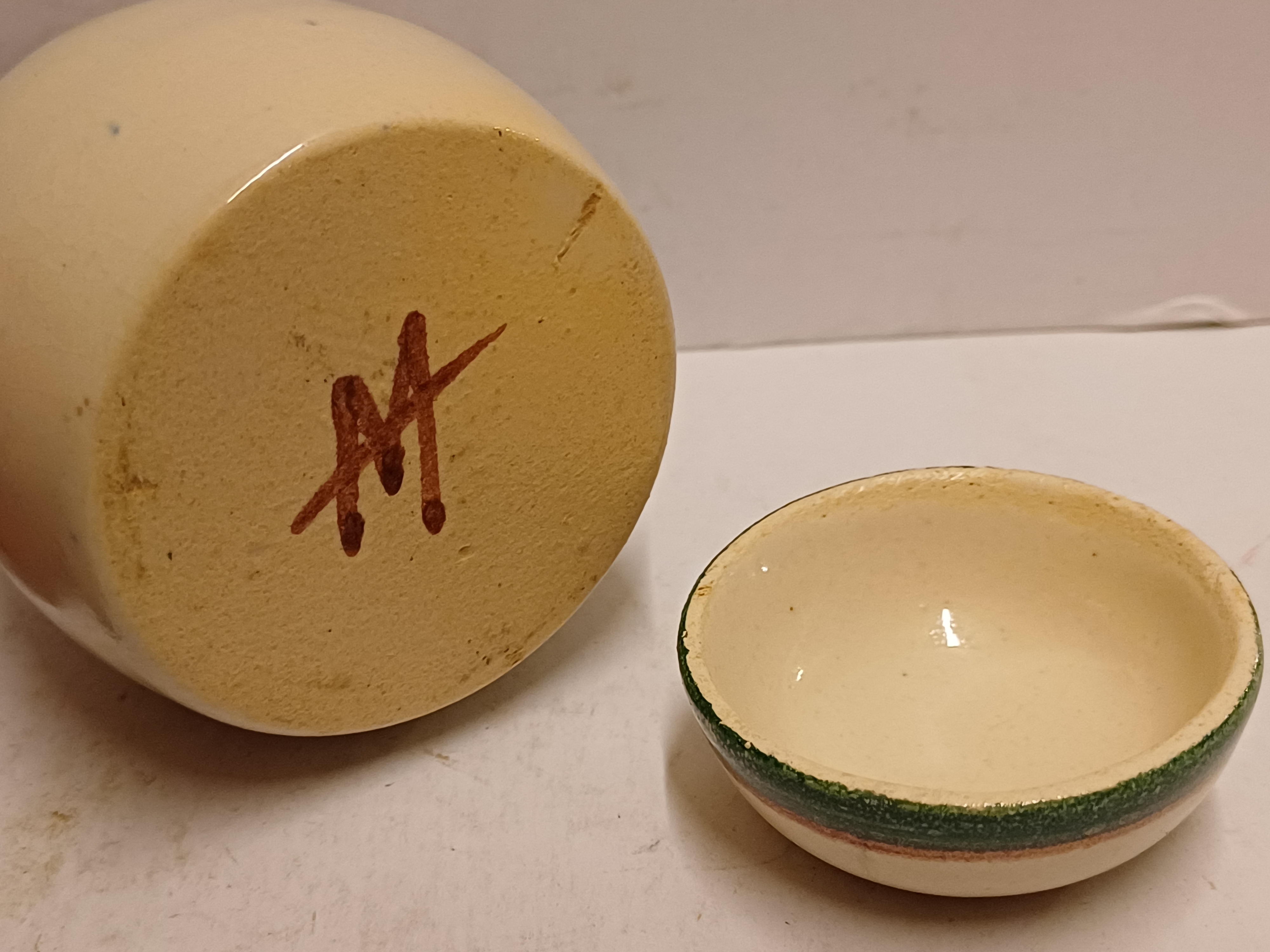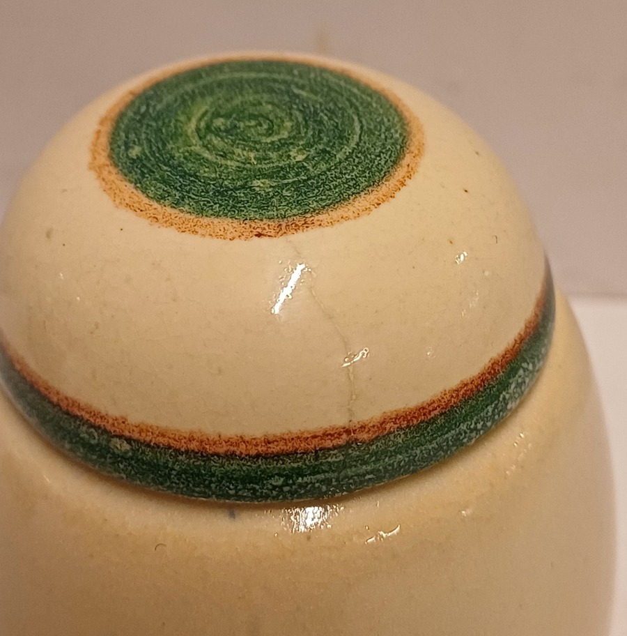 Scatolina smaltata color crema con coperchio, decorata con bande verdi e arancioni. Fondo con firma.