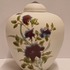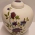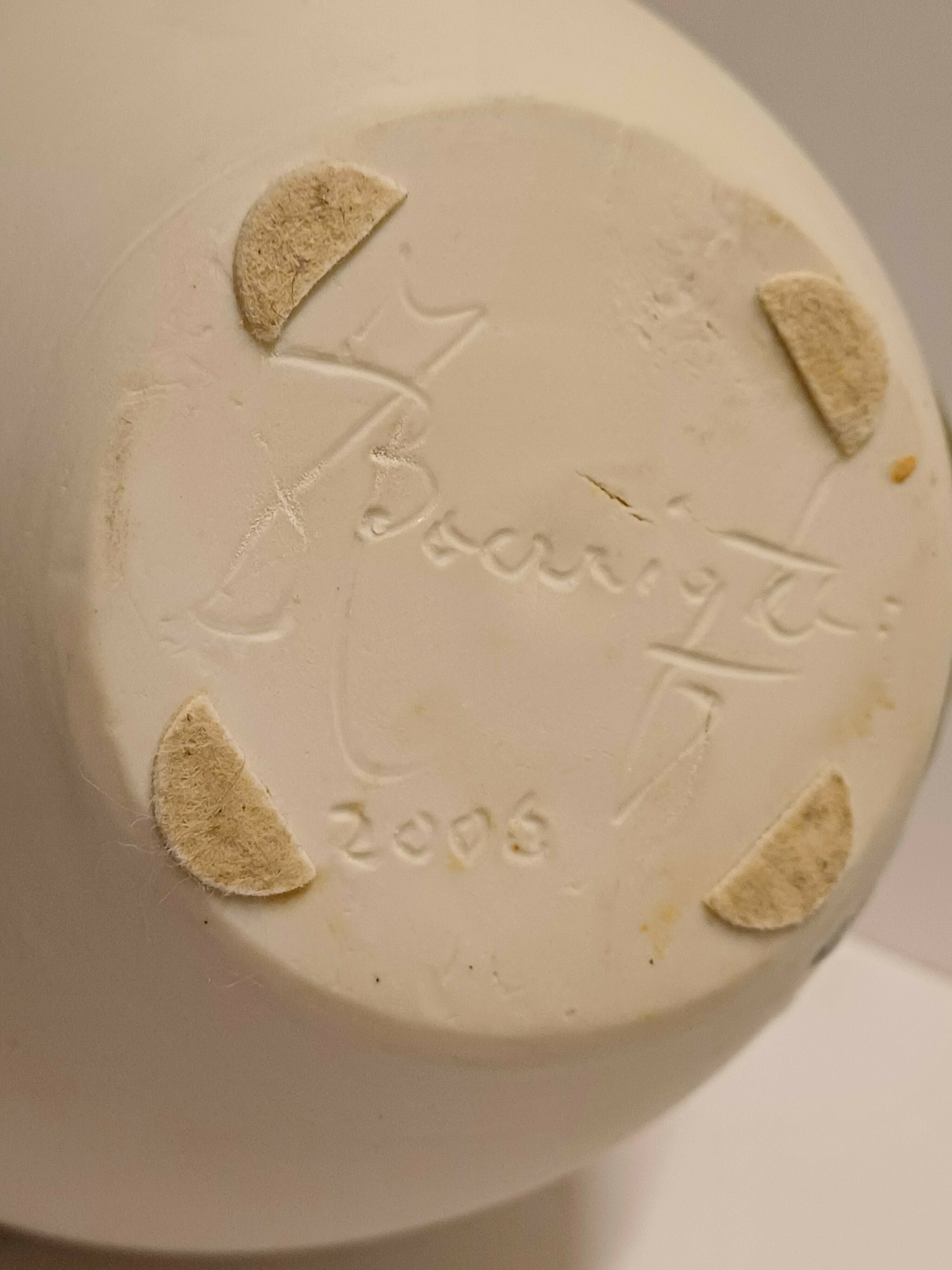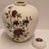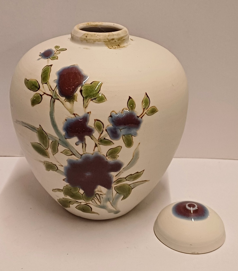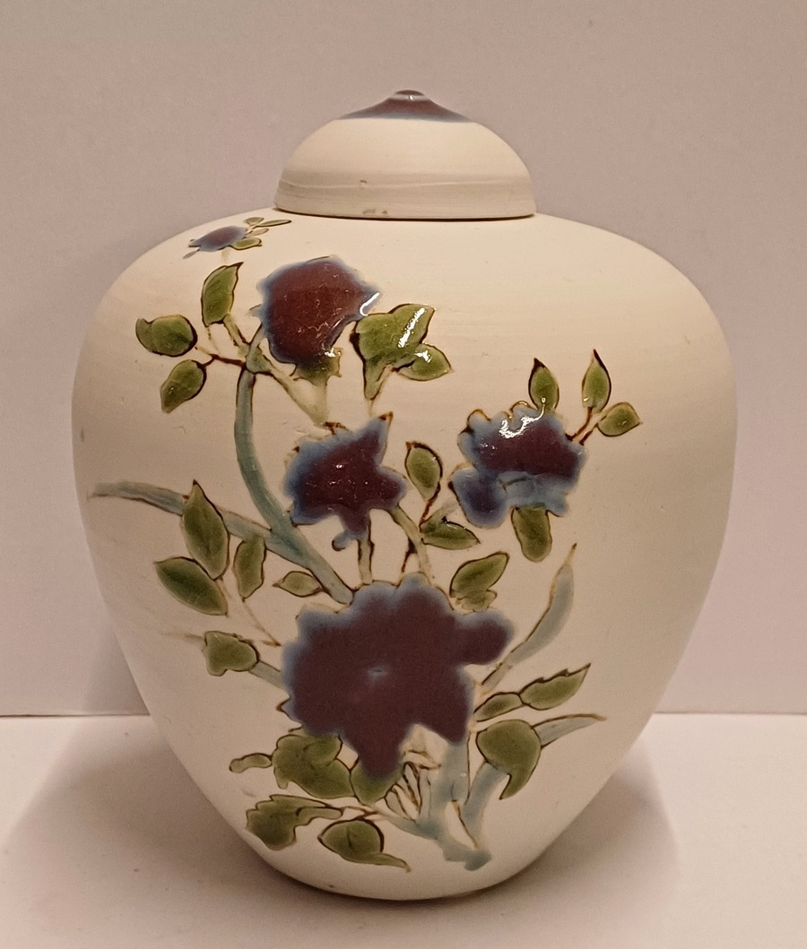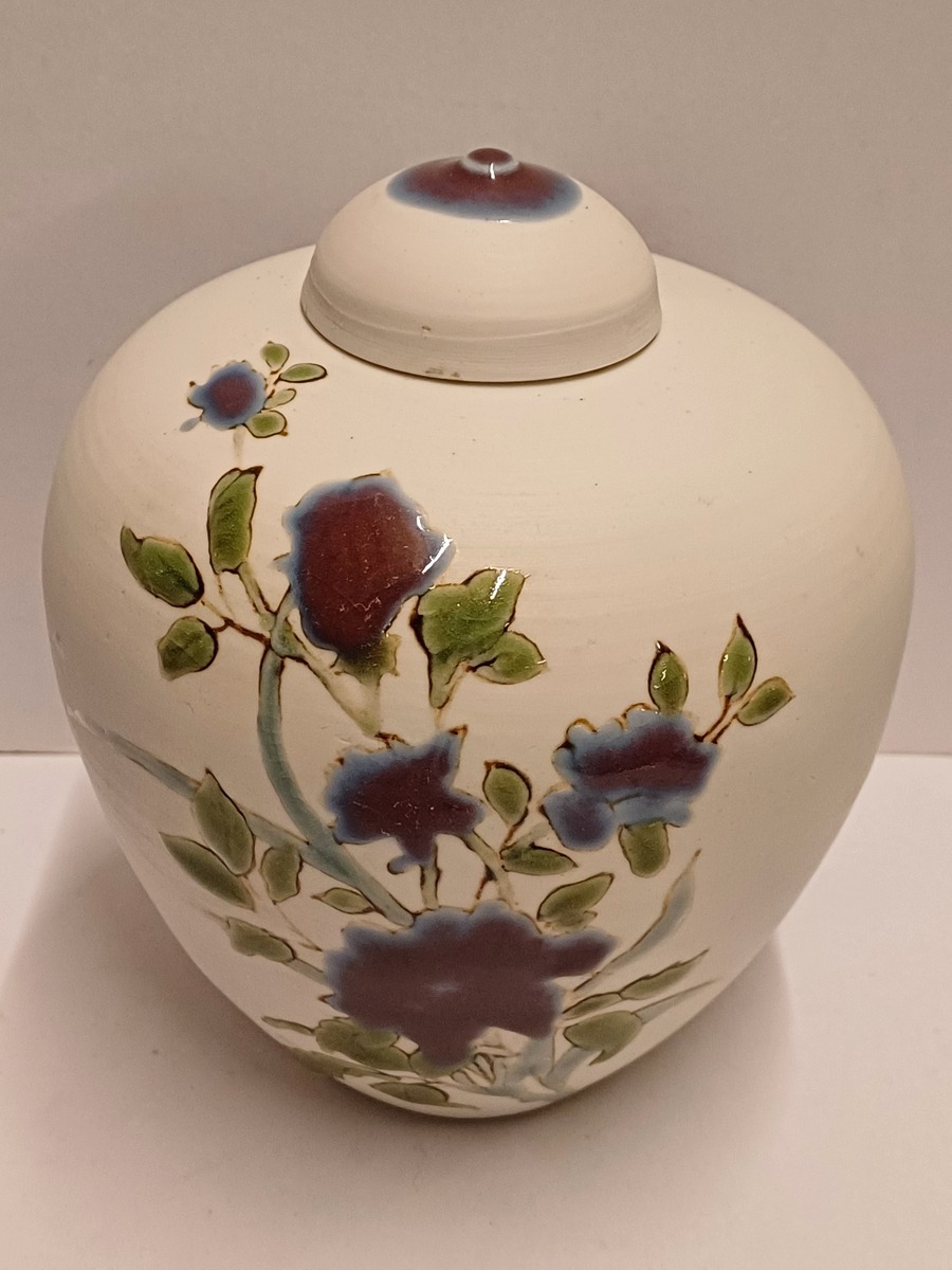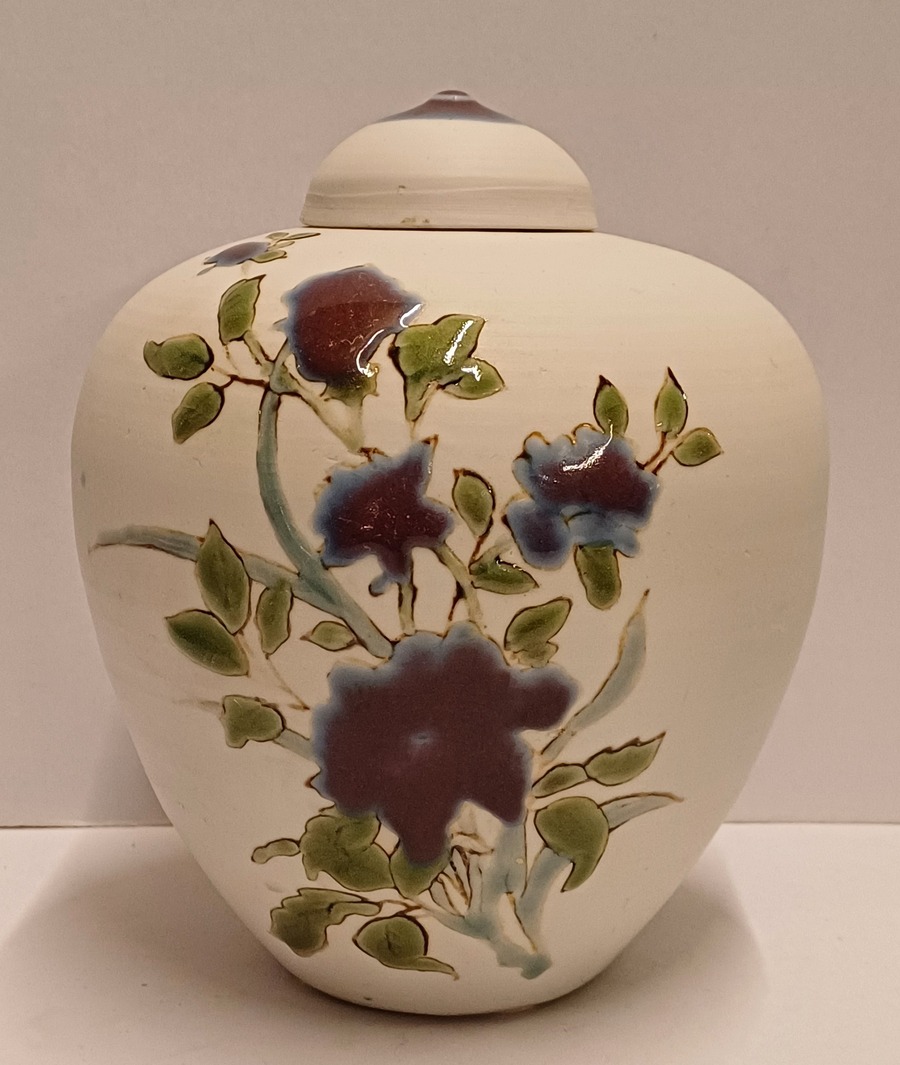 Dekslepot van porselein klei met floraal decor met paarse bloem verder niet geglazuurd. Onderzijde gesigneerd en gedateerd 2006.