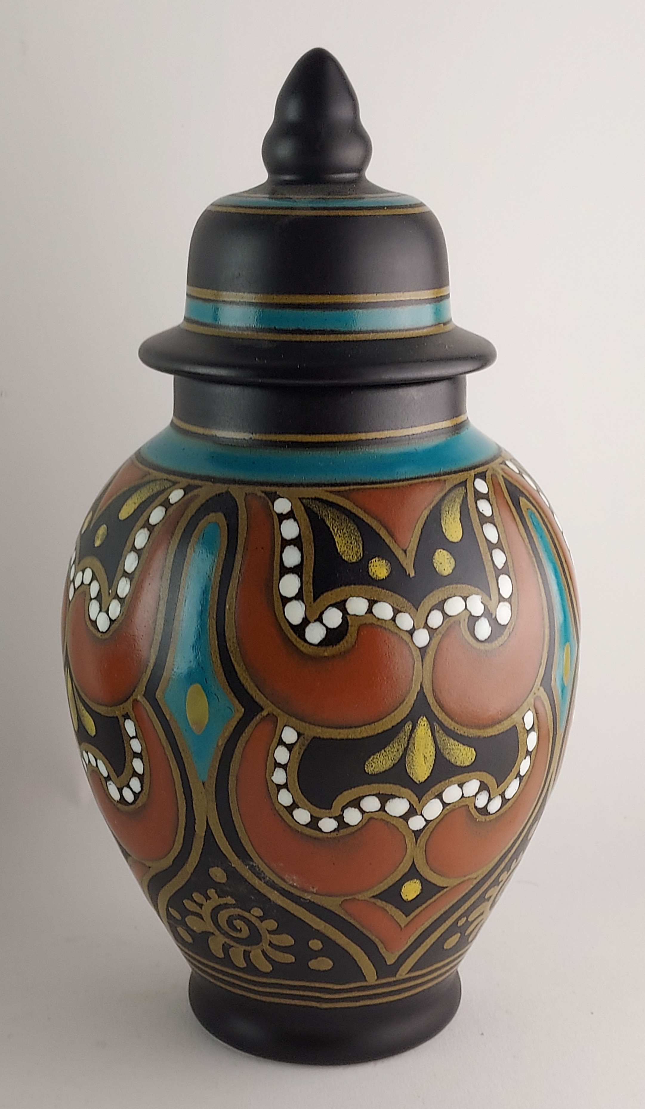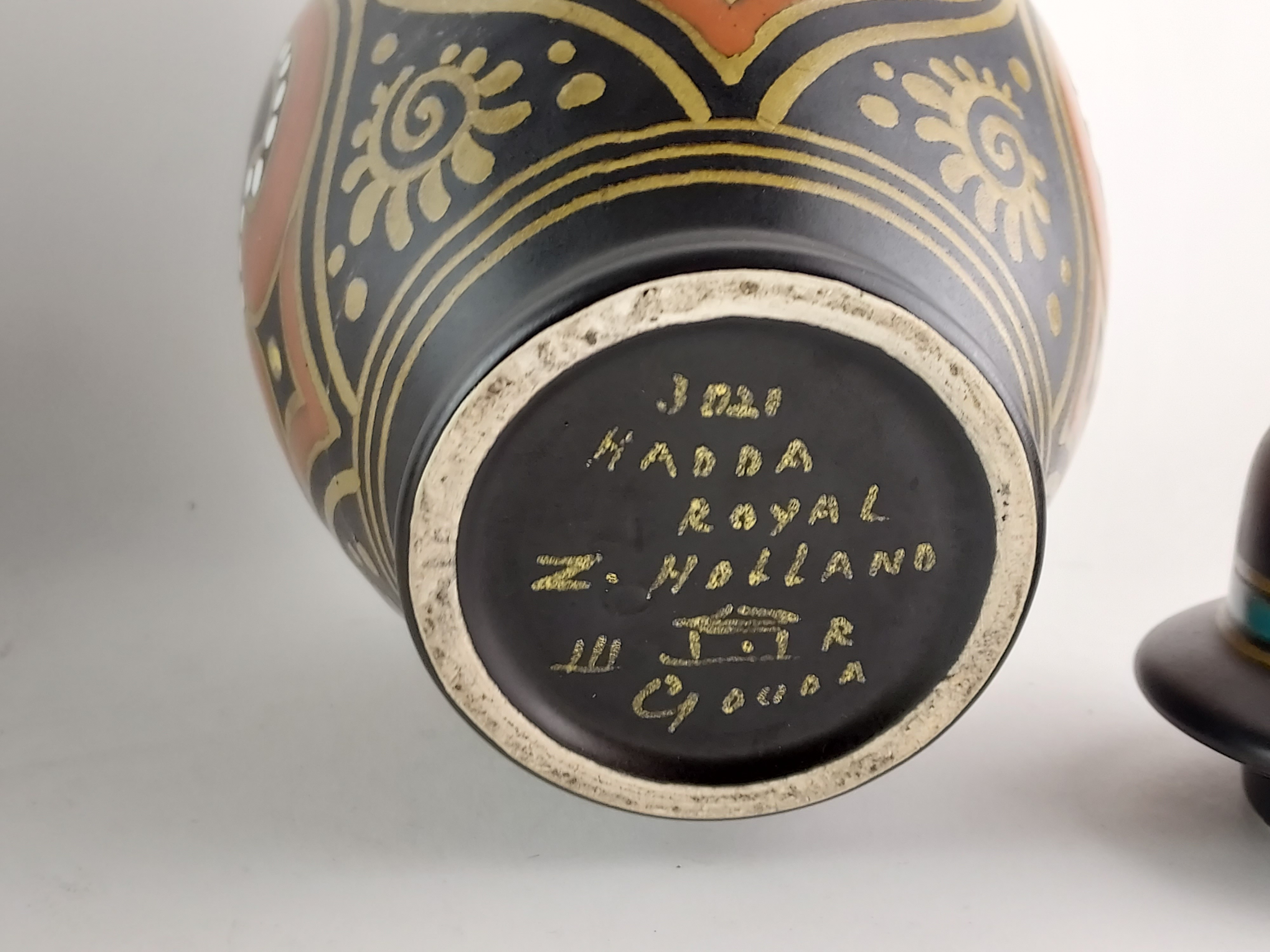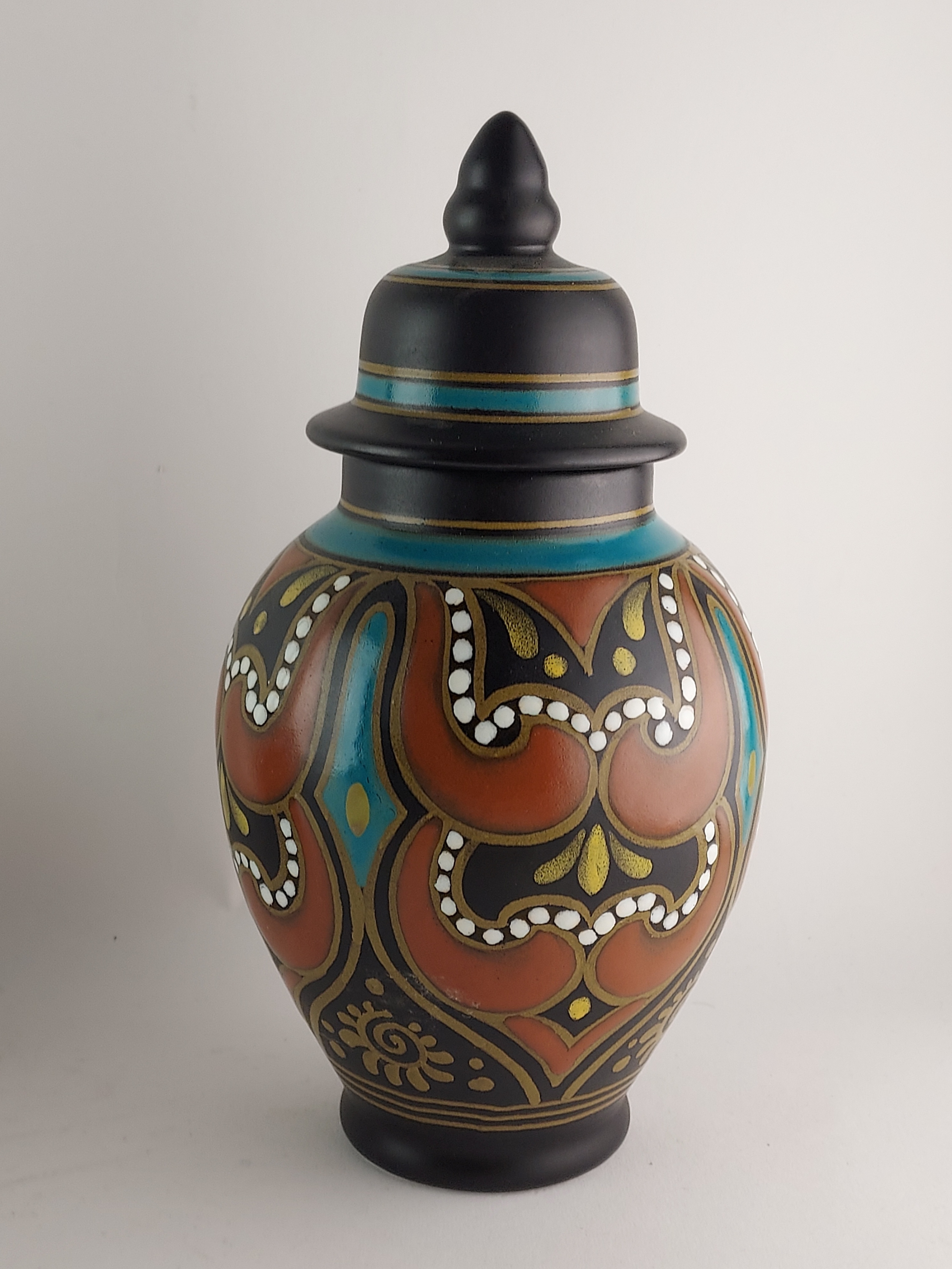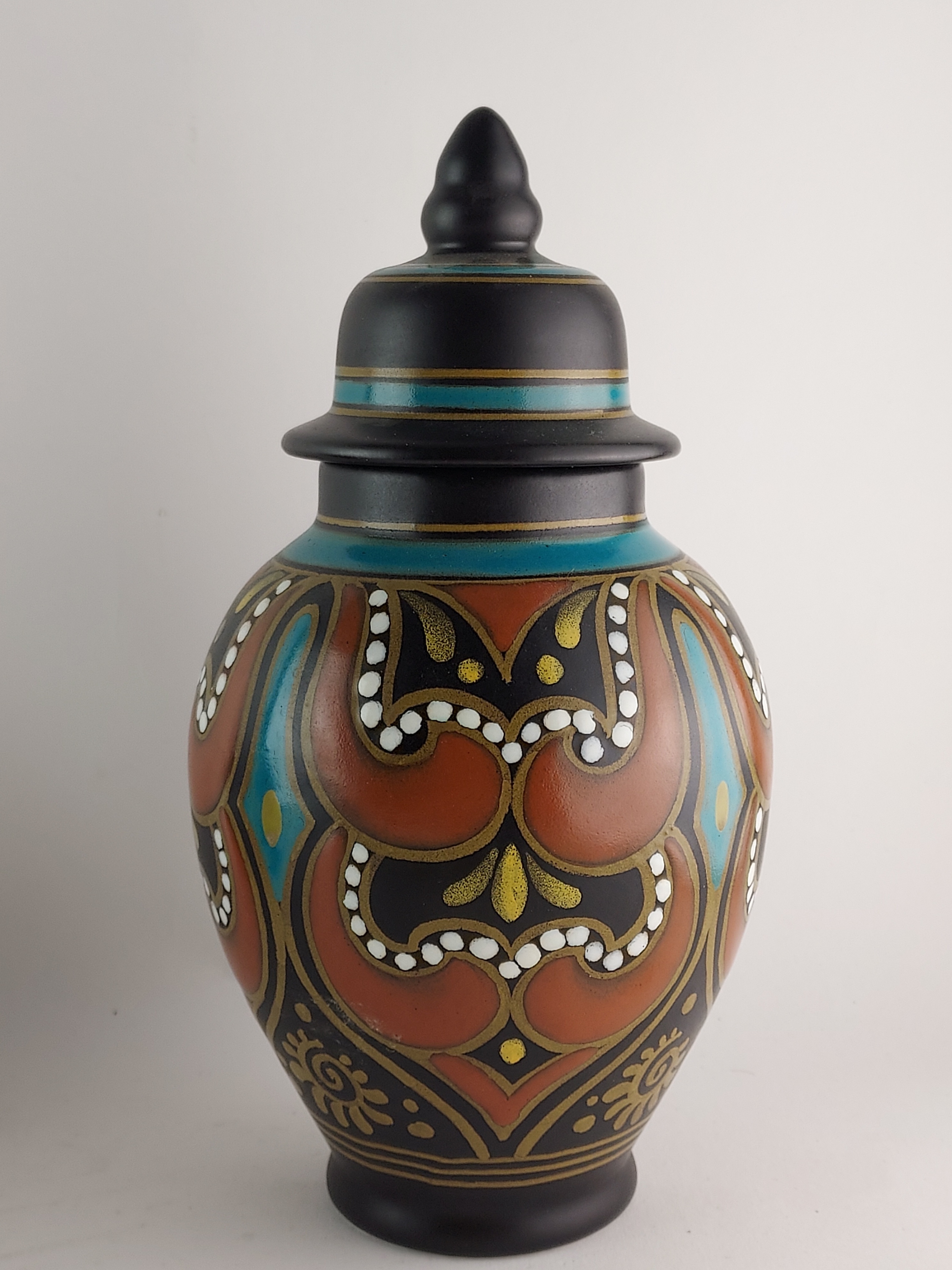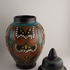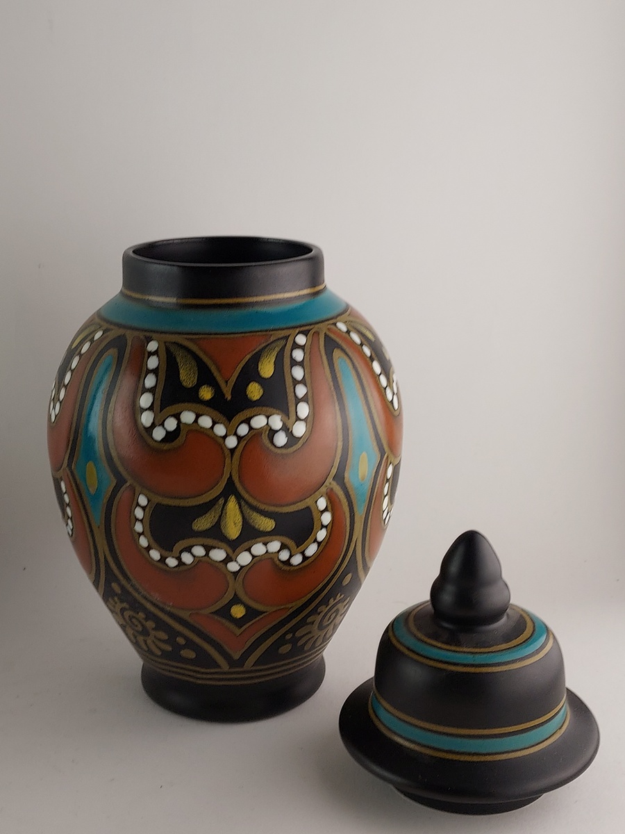 Vaso con coperchio in terracotta con decoro stilizzato su sfondo nero. Parte inferiore con marchio di fabbrica, nome del decoro Hadda, circa 1935.