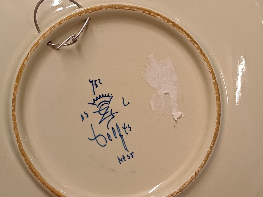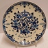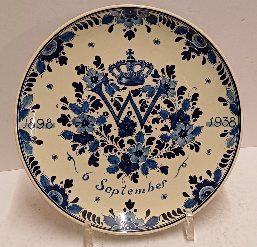 Delfts blauw gedecoreerd bord met afbeelding van een gekroonde W en de datum 6 sept 1938.