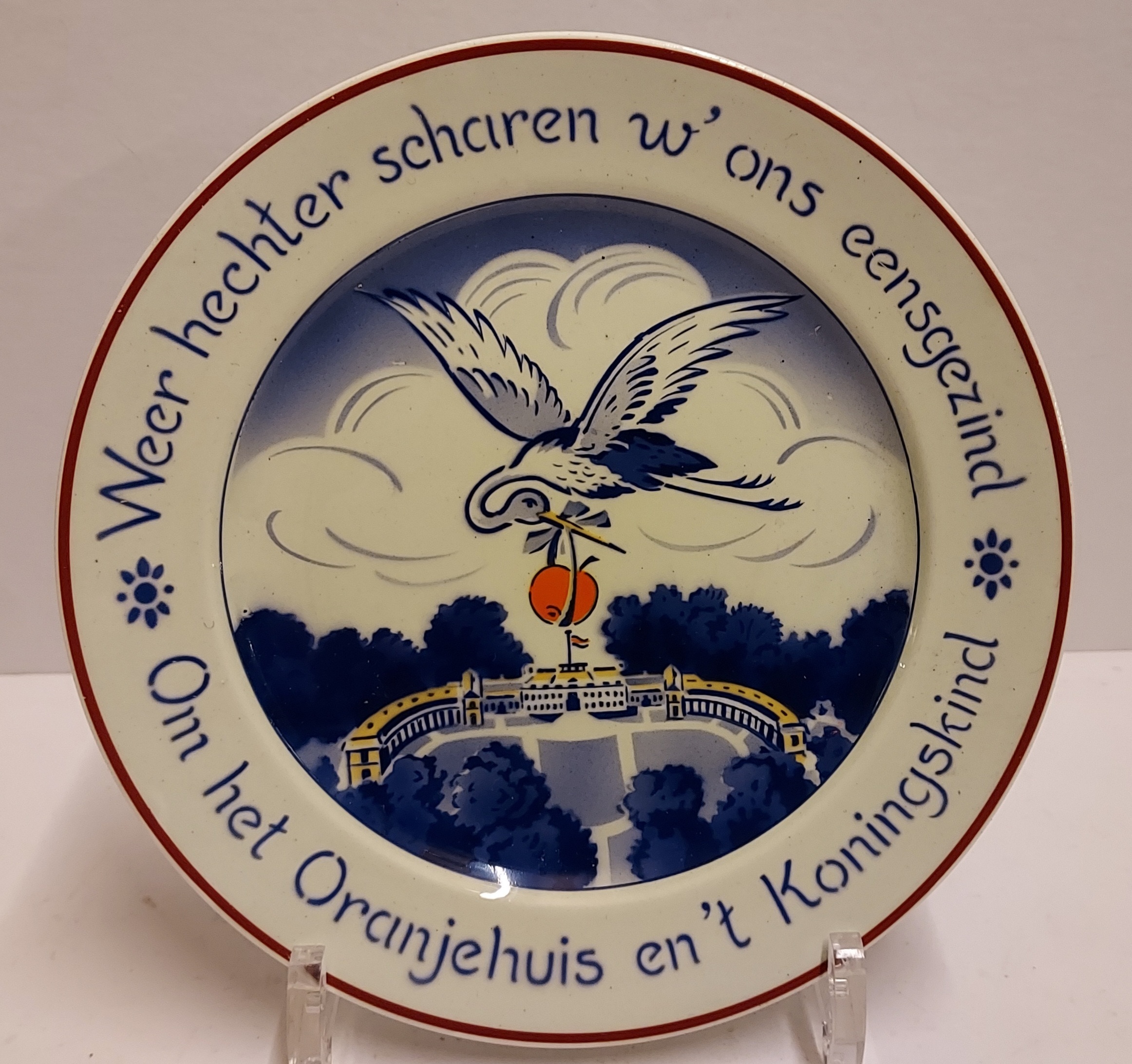 Con decorazione di cicogna con mela arancione e il testo "Weer hechter scharen w'ons eensgezind Om het oranjehuis en 't koningskind". Retro con marchio di fabbrica.