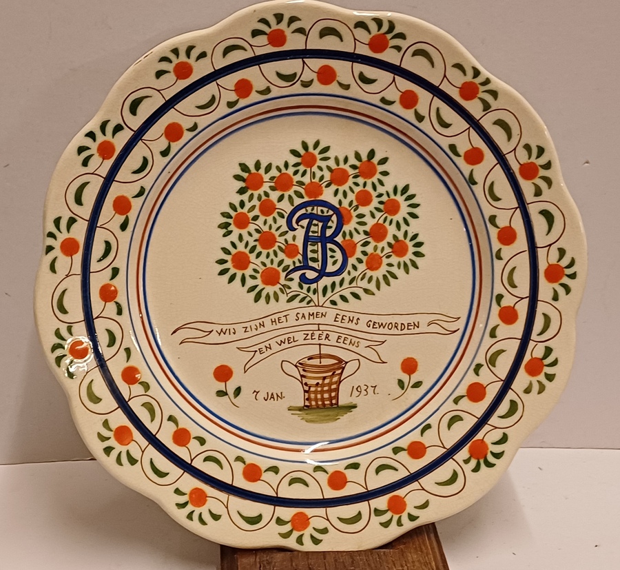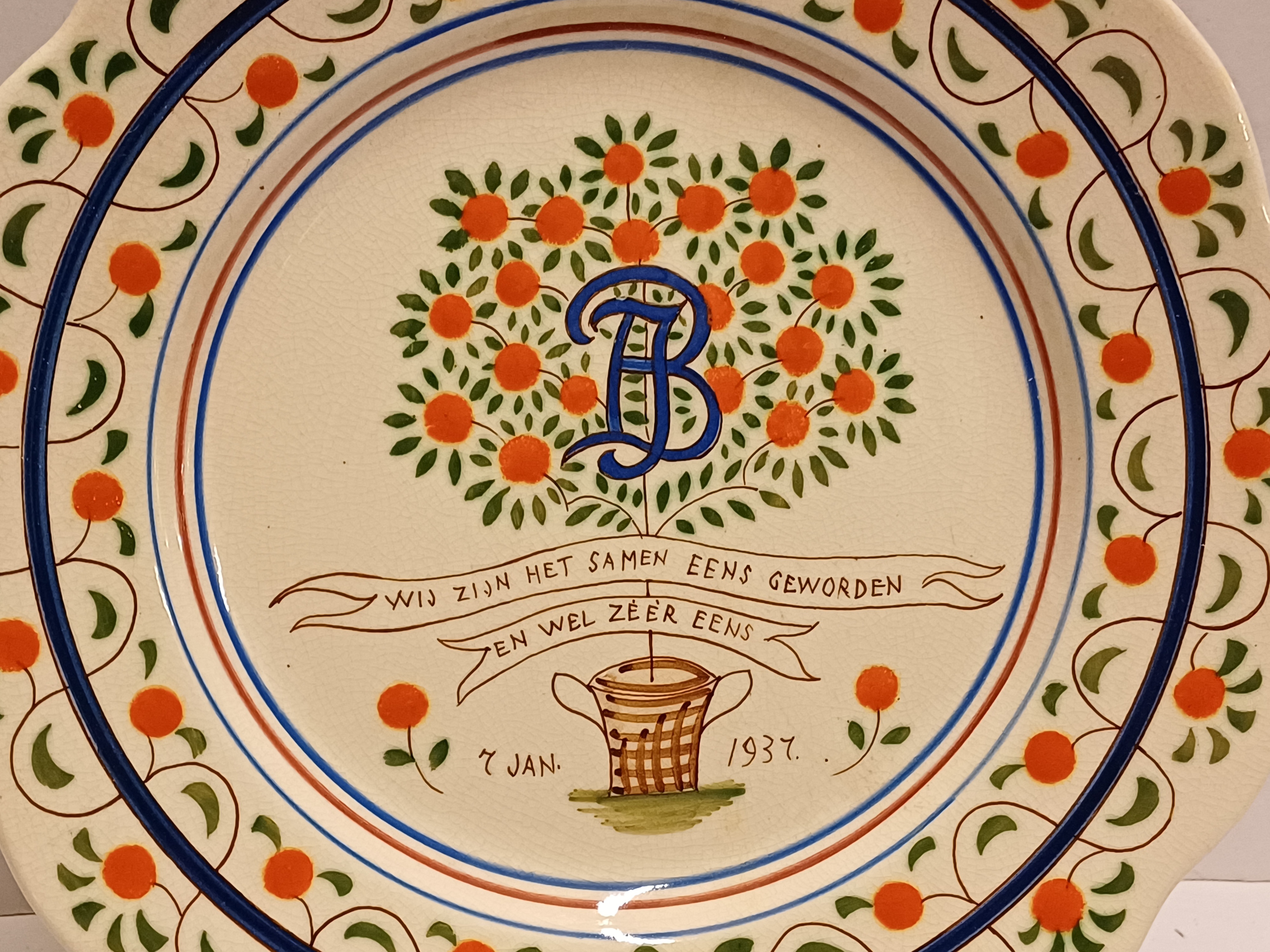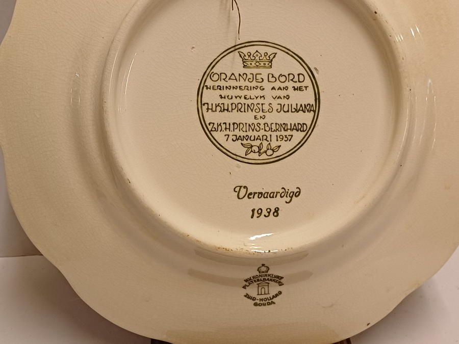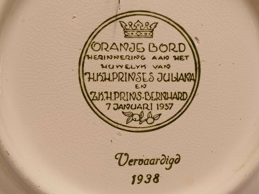 Piatto arancione commemorativo del matrimonio di Juliana e Bernard nel 1937. Retro con marchio di fabbrica.