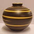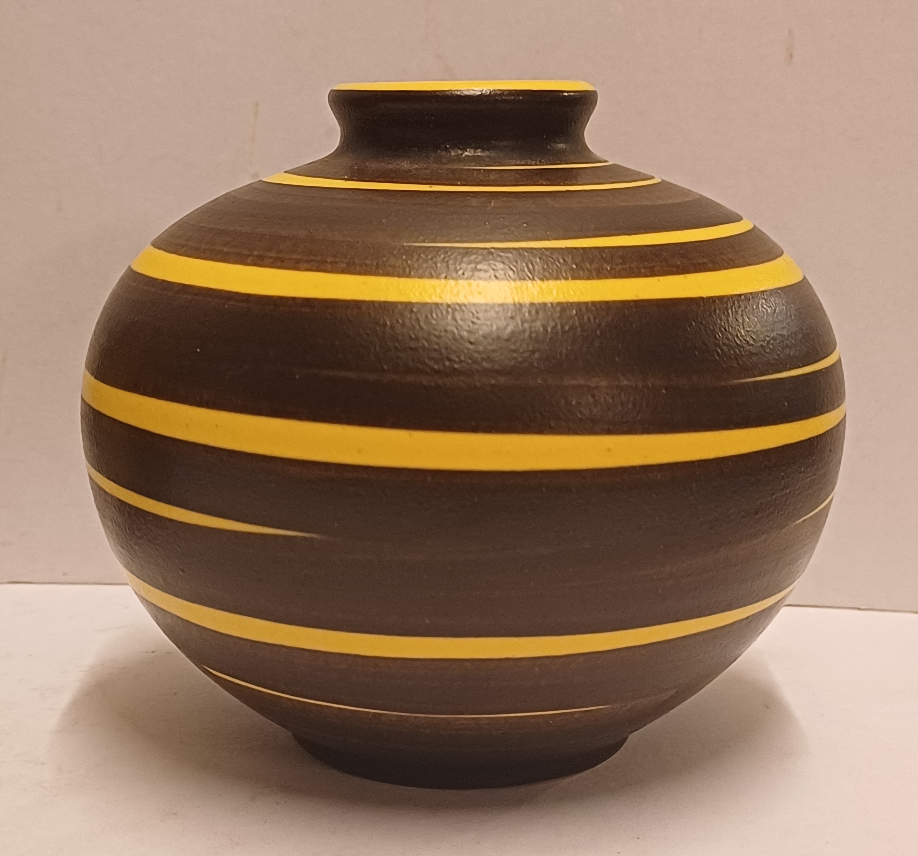 Gegoten vaas met met geel bruin strepen decor. Onderzijde met modelnummer 9-8