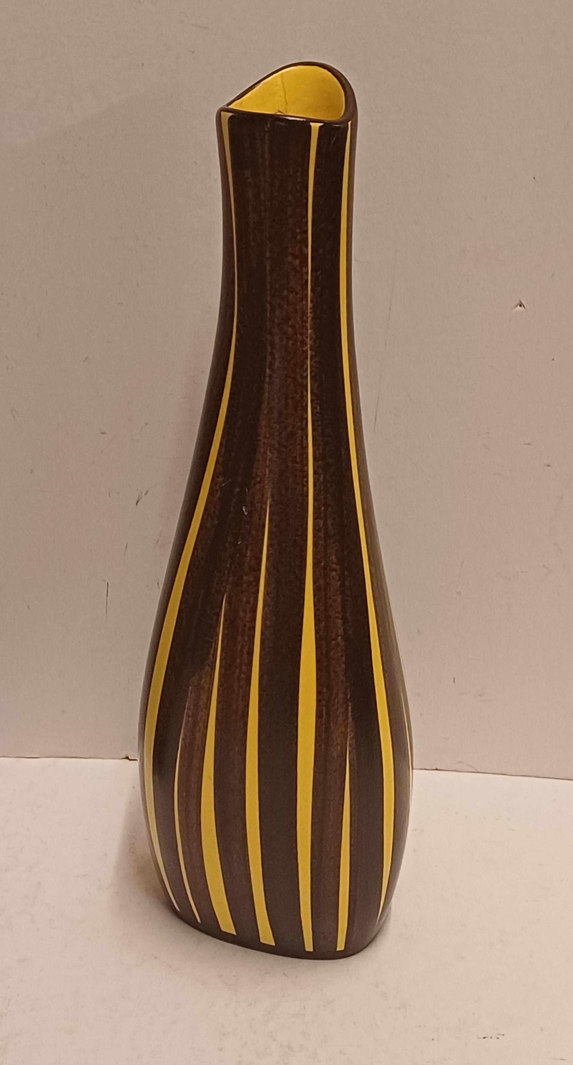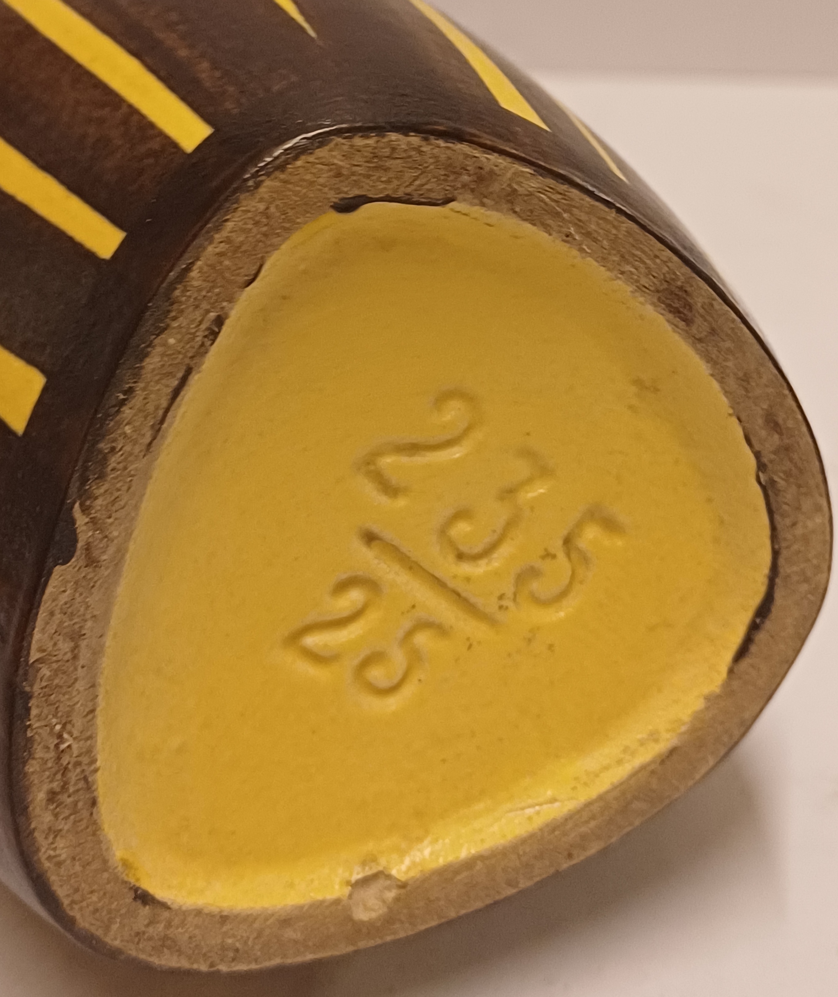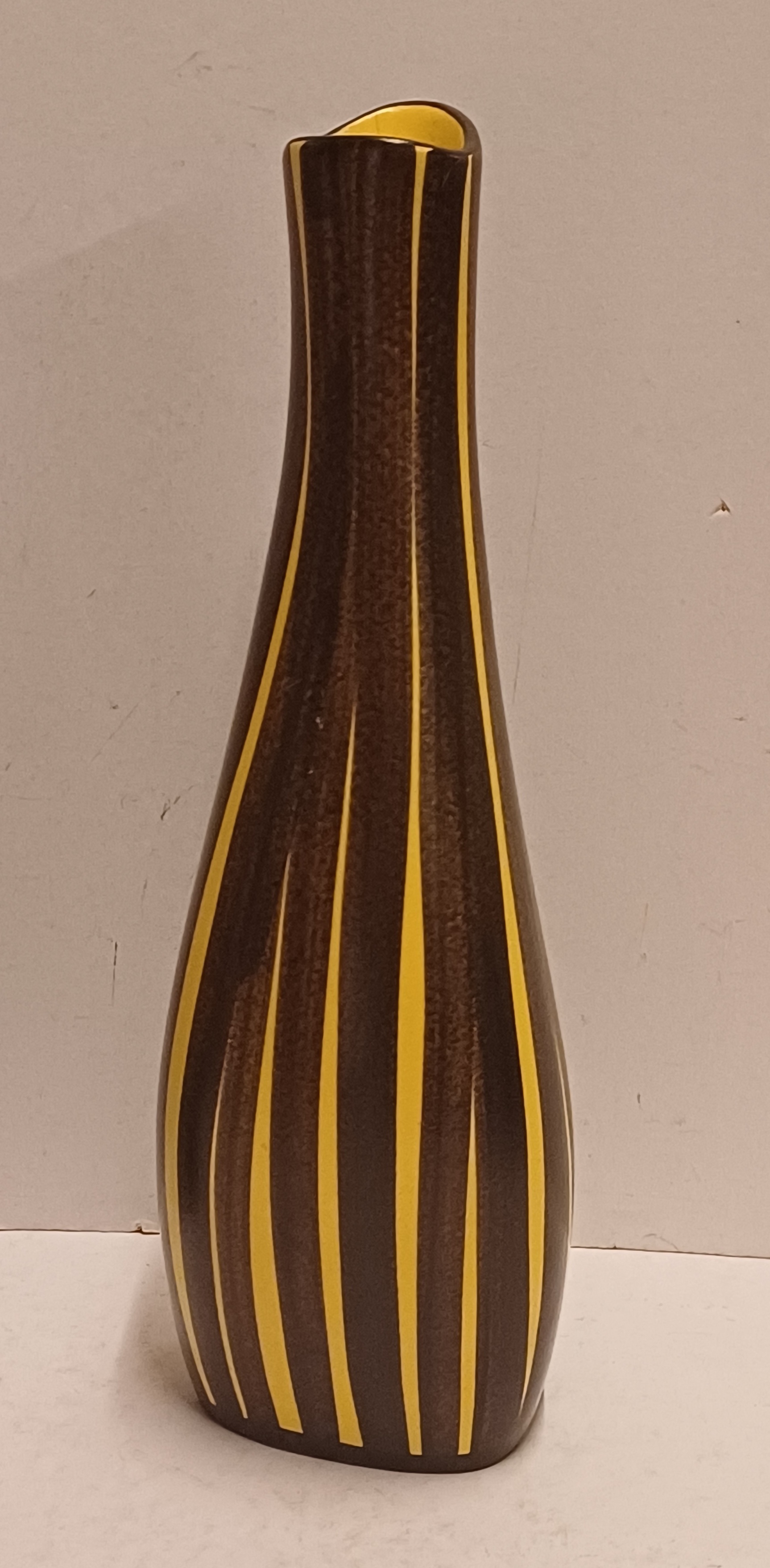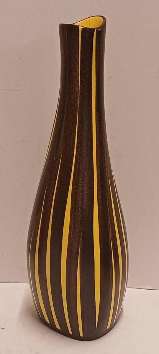 Gegoten vaas met met geel bruin strepen decor. Onderzijde met modelnummer 225-25