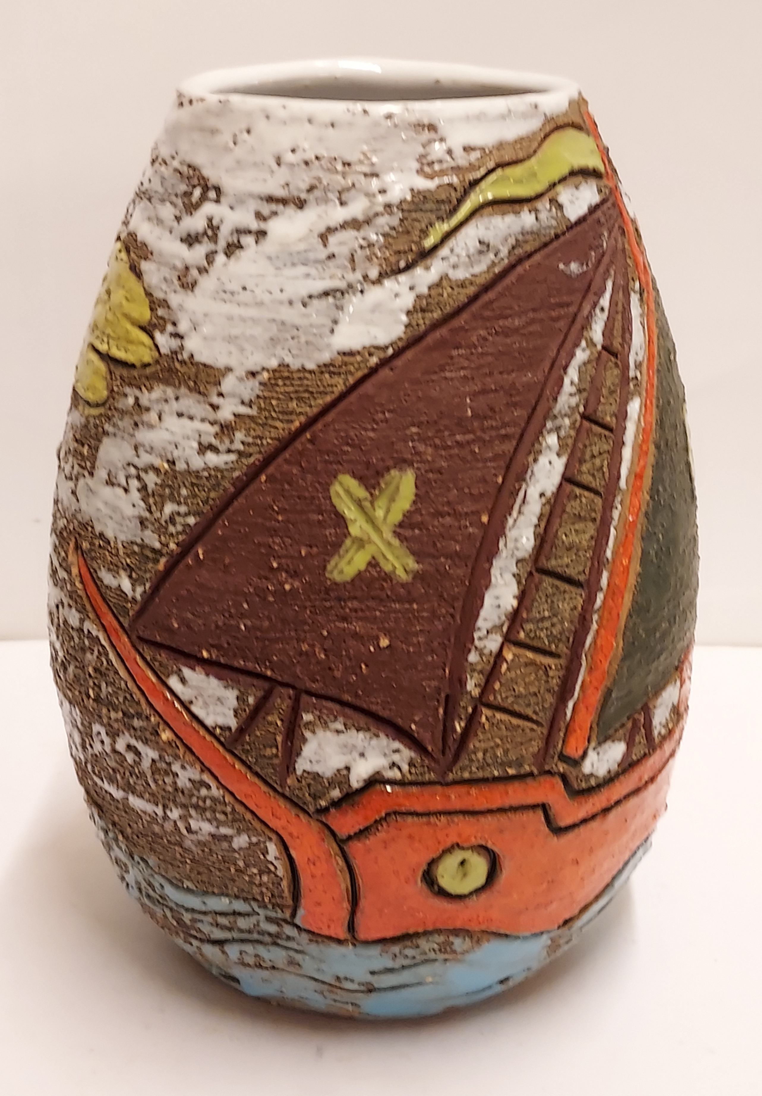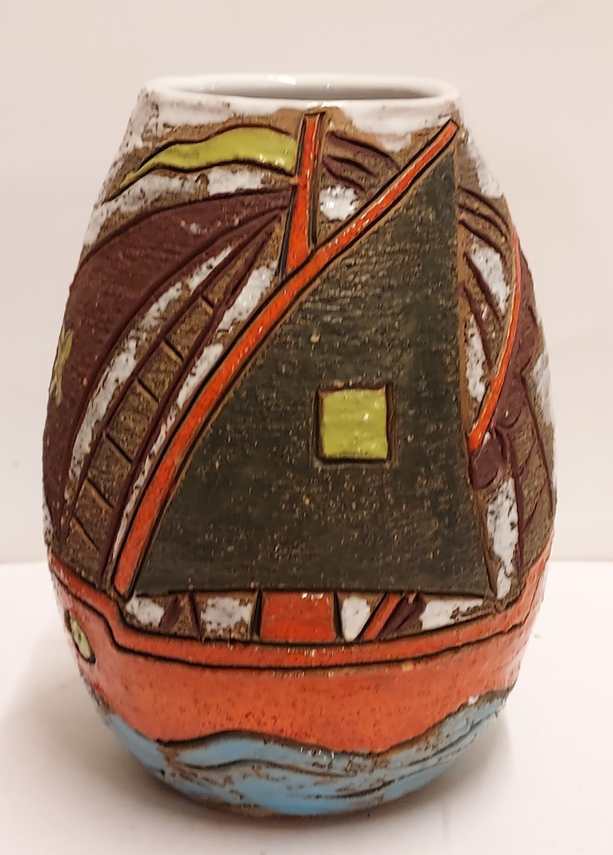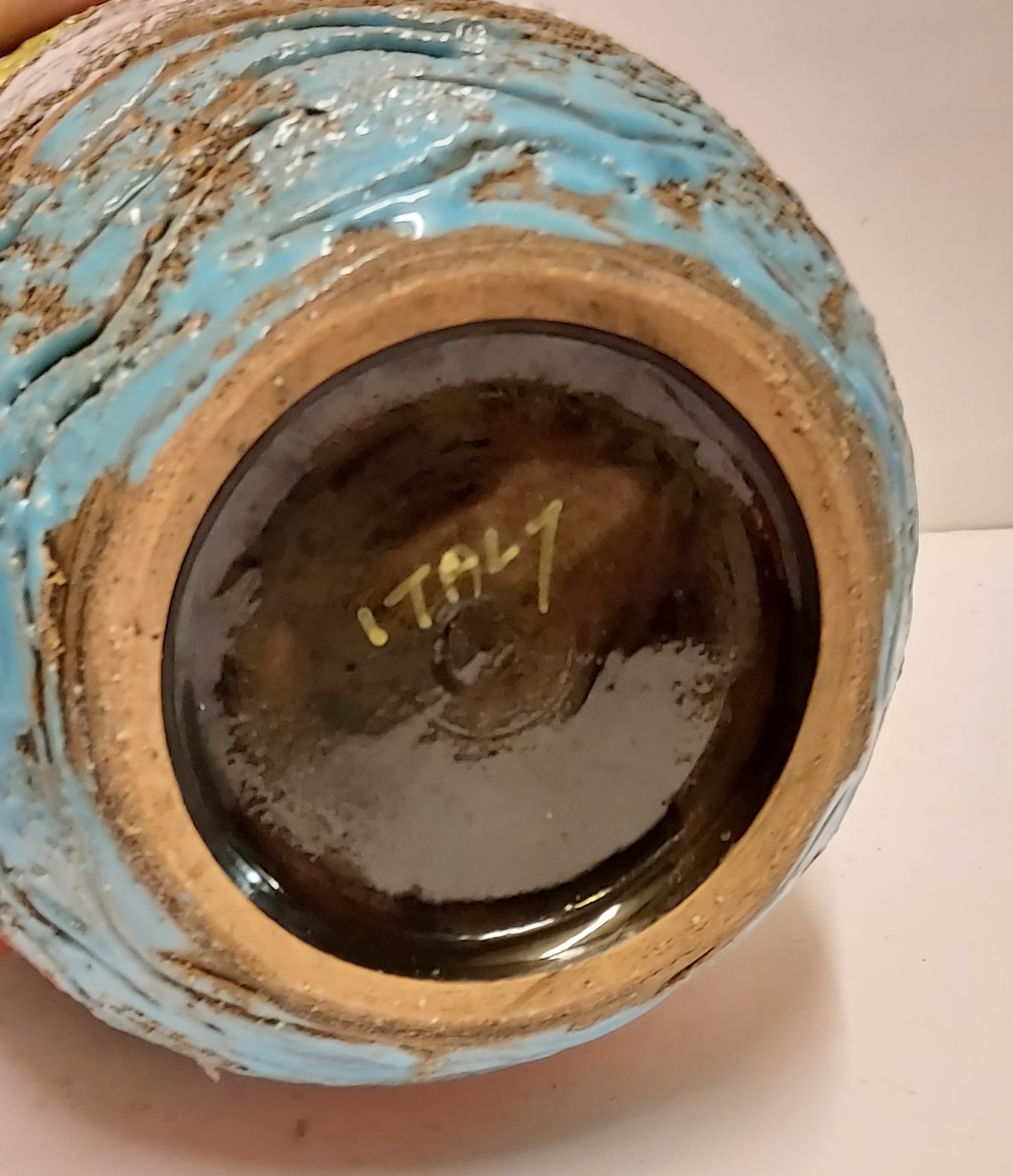 Vaso in terracotta con decorazione di una nave intorno. Parte inferiore marcata Italy.