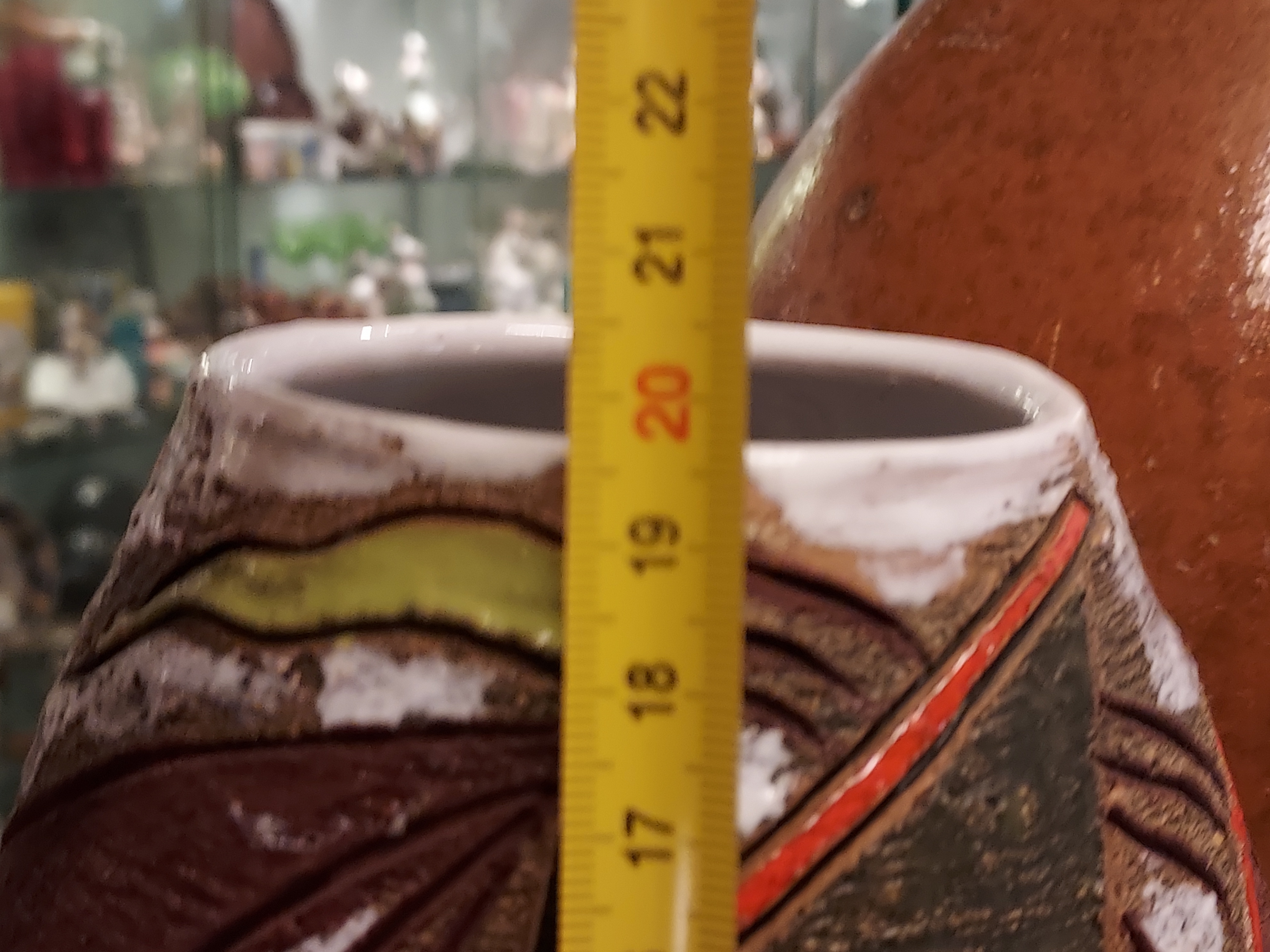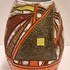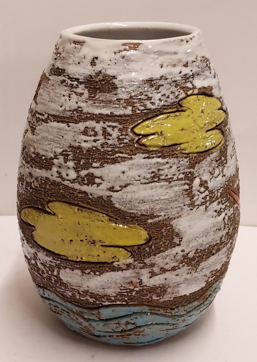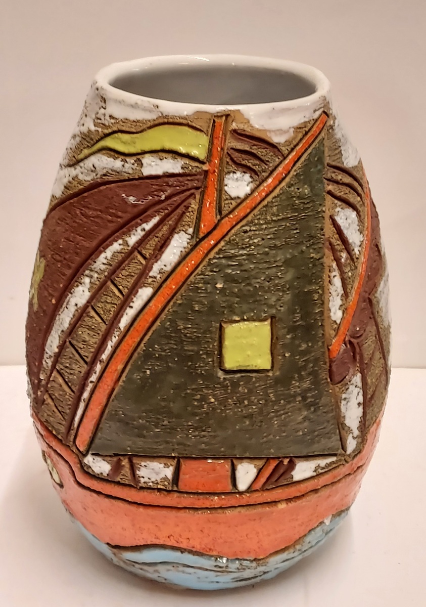 Vaso in terracotta con decorazione di una nave intorno. Parte inferiore marcata Italy.