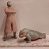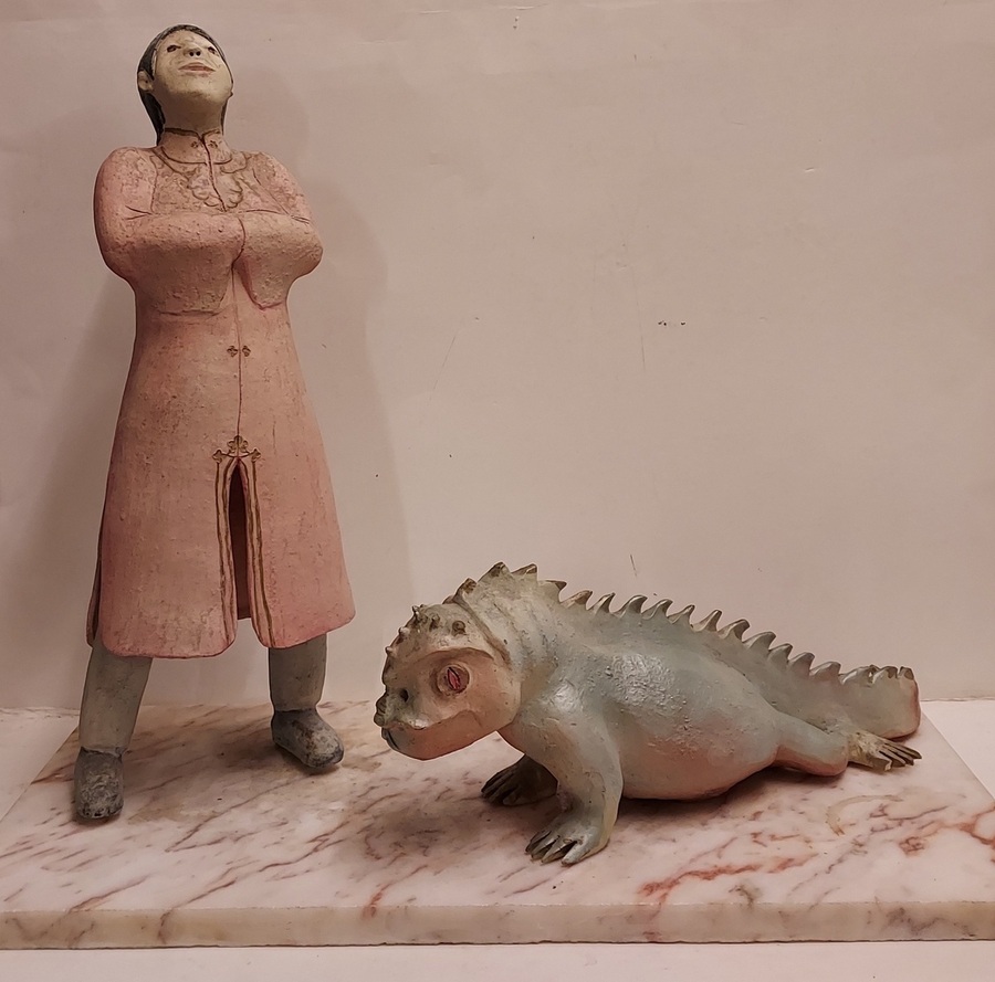 "La principessa e il drago" Scultura multipla di una figura in piedi con lucertola, su lastra di pietra naturale. Ex collezione Ongering Groningen. Tiratura di 40 pezzi.