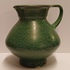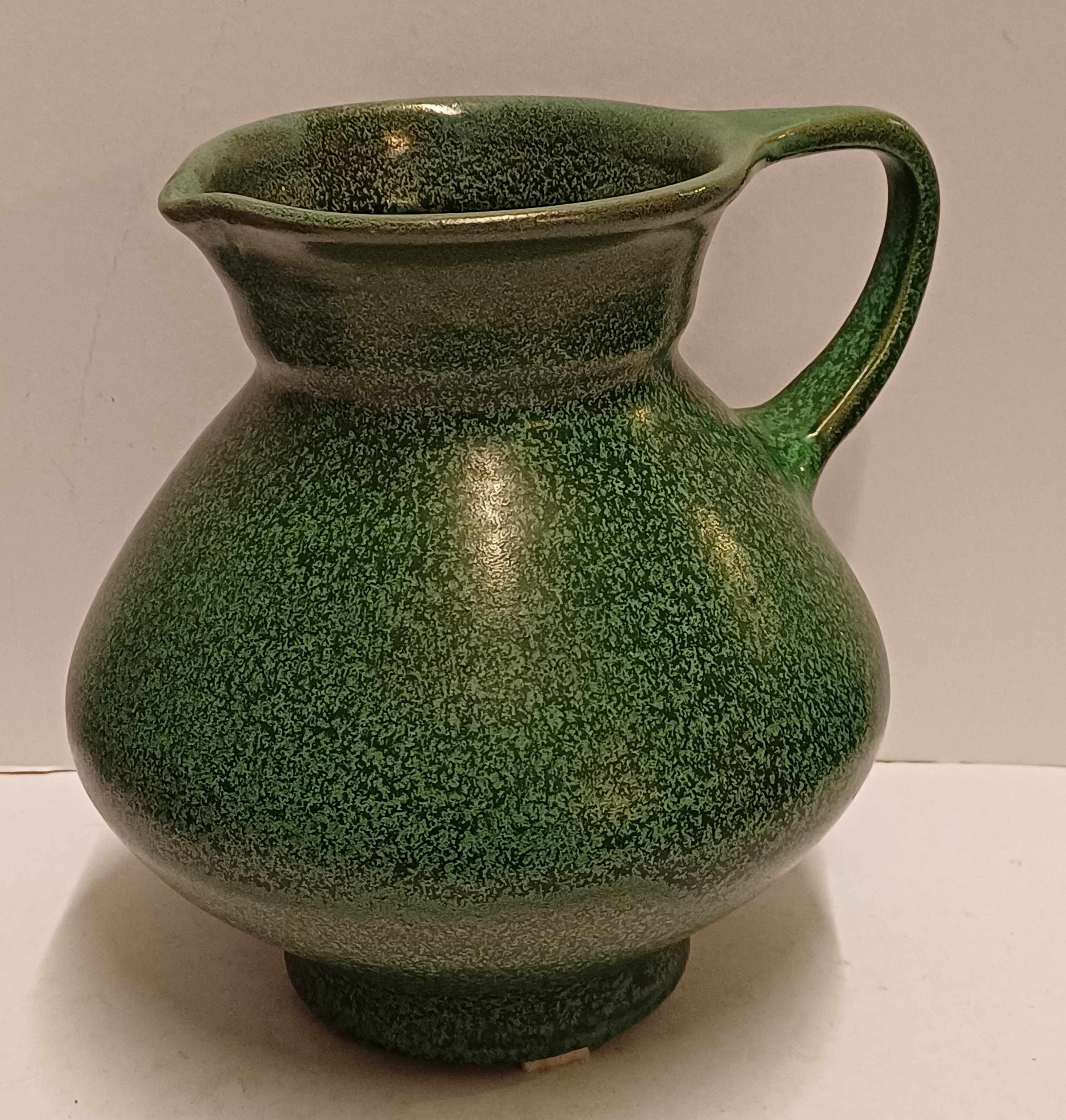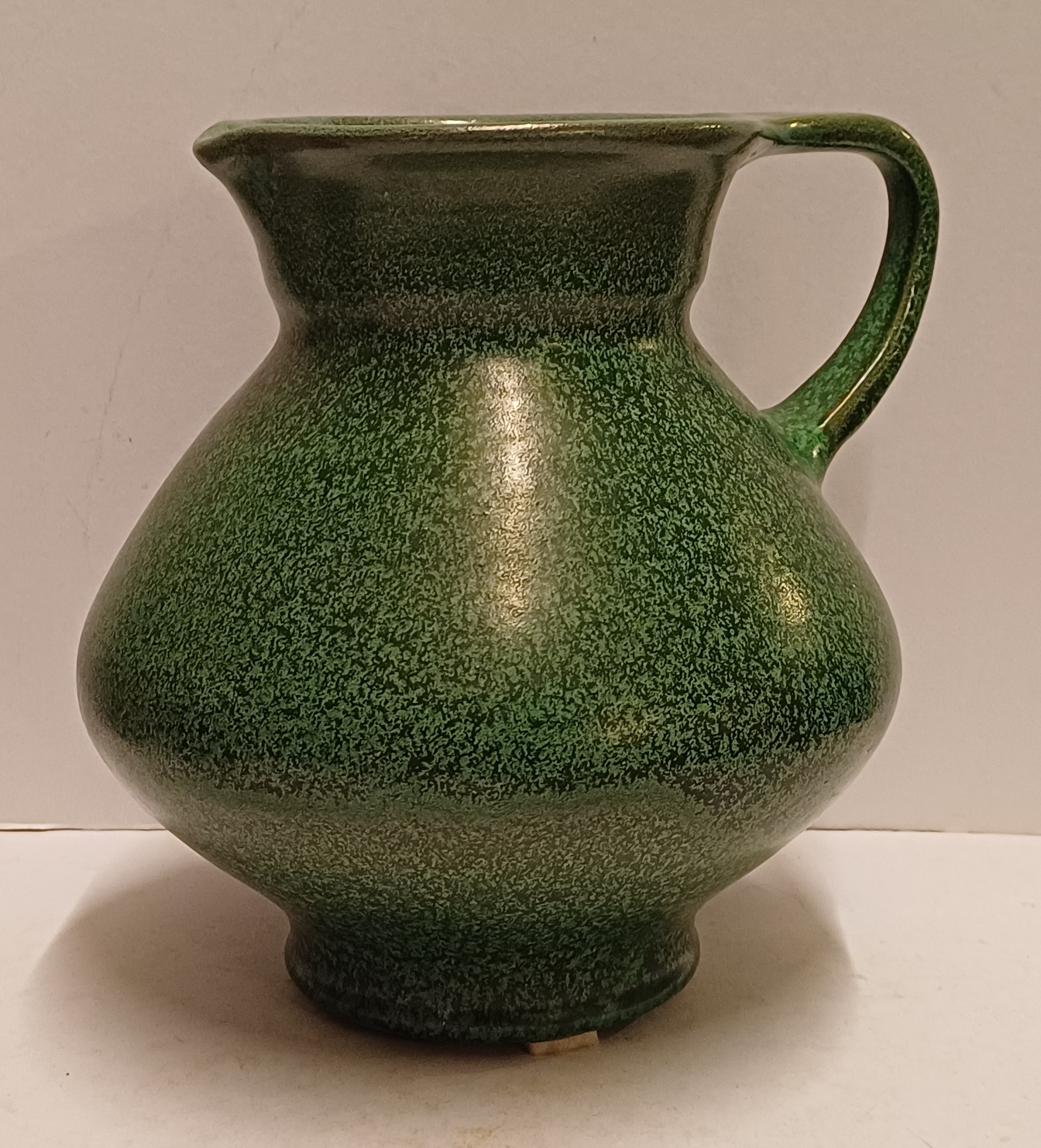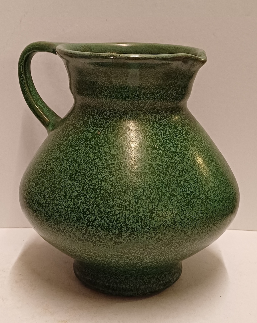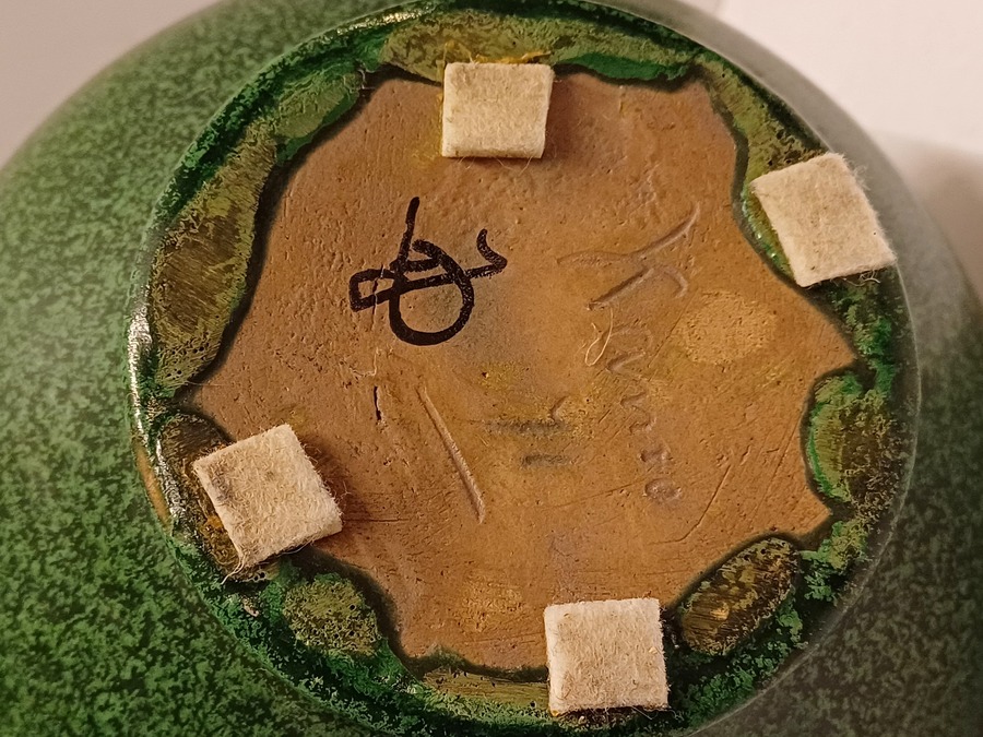 Aardewerken kan met groene gewolkte glazuur. Onderzijde gesigneerd.