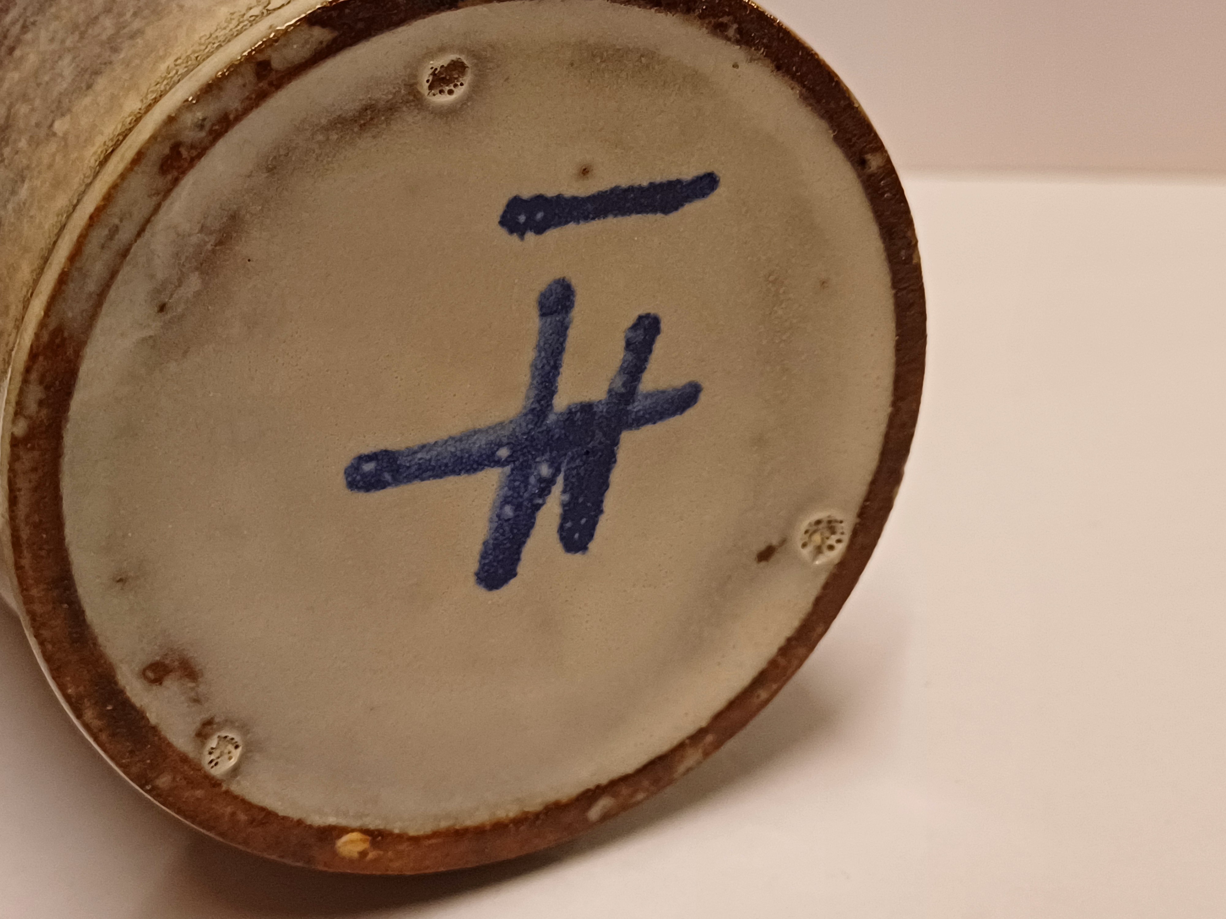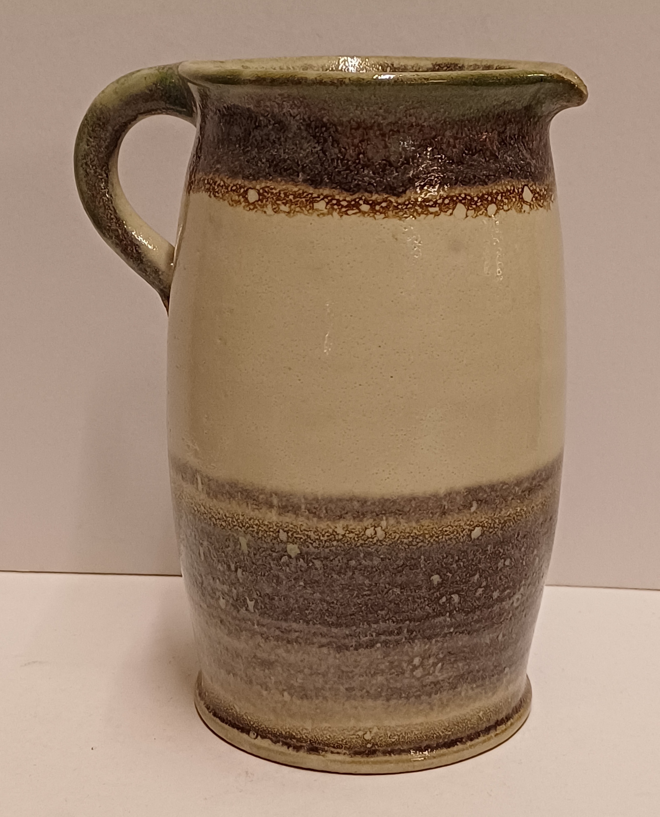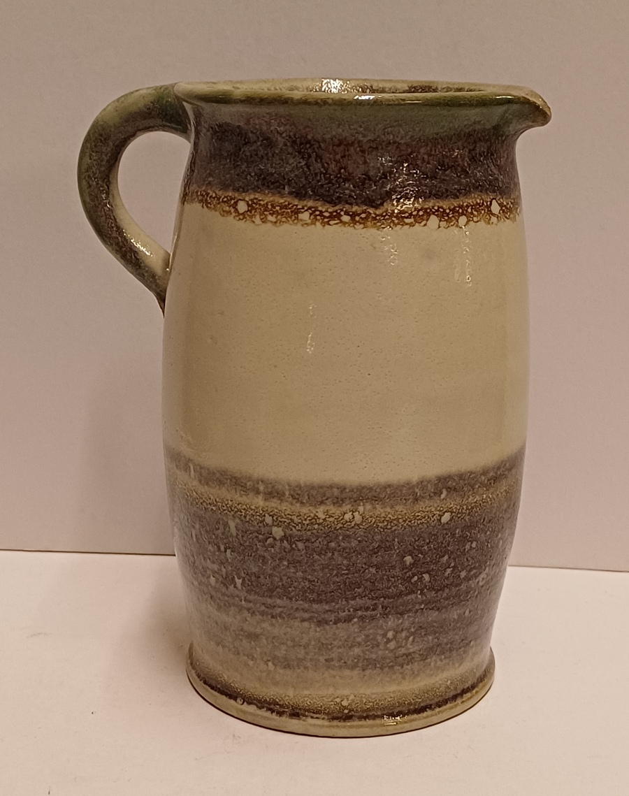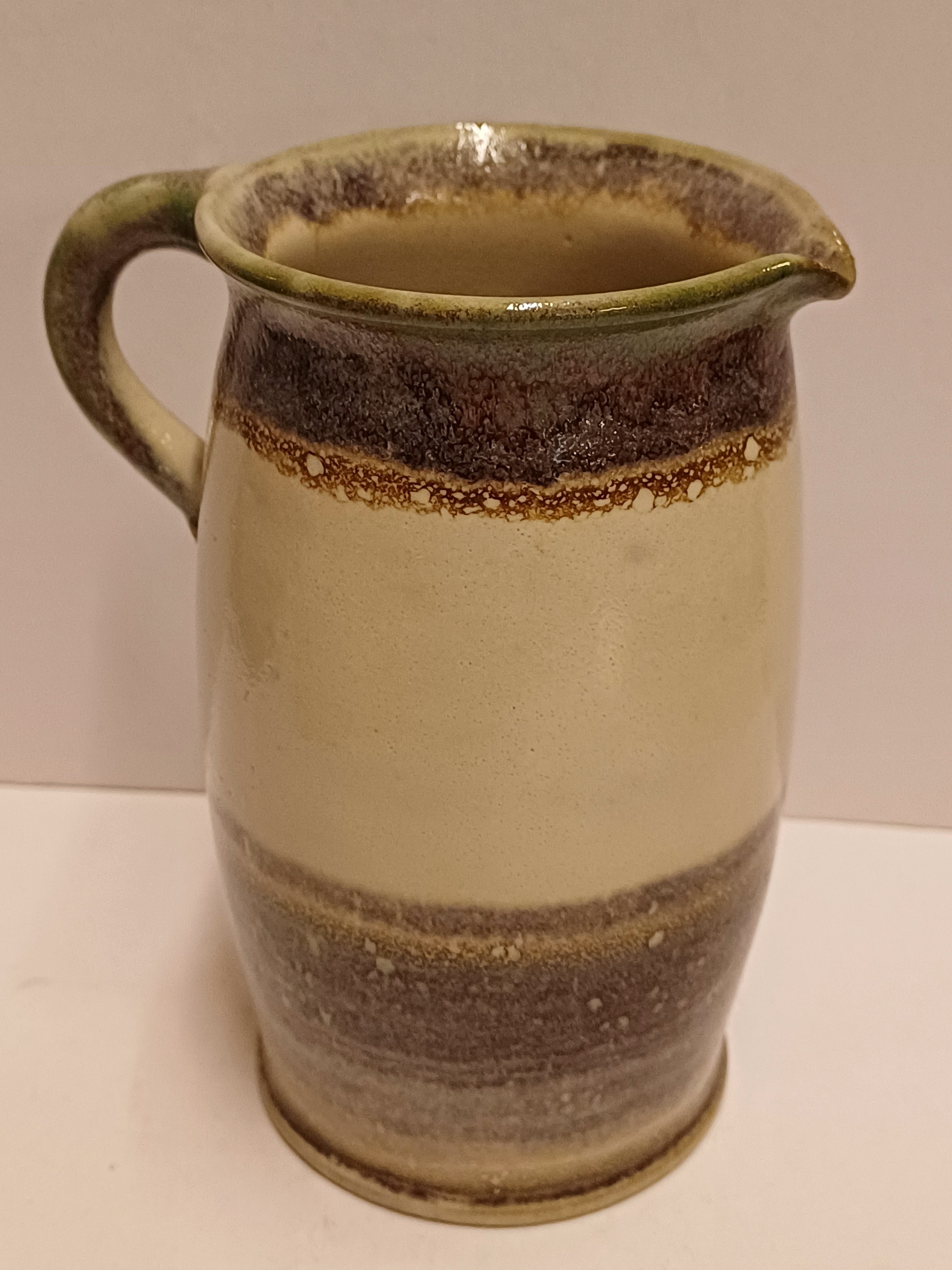 Aardewerken schenkkannetje met horizontaal band decor. Onderzijde met signatuur.