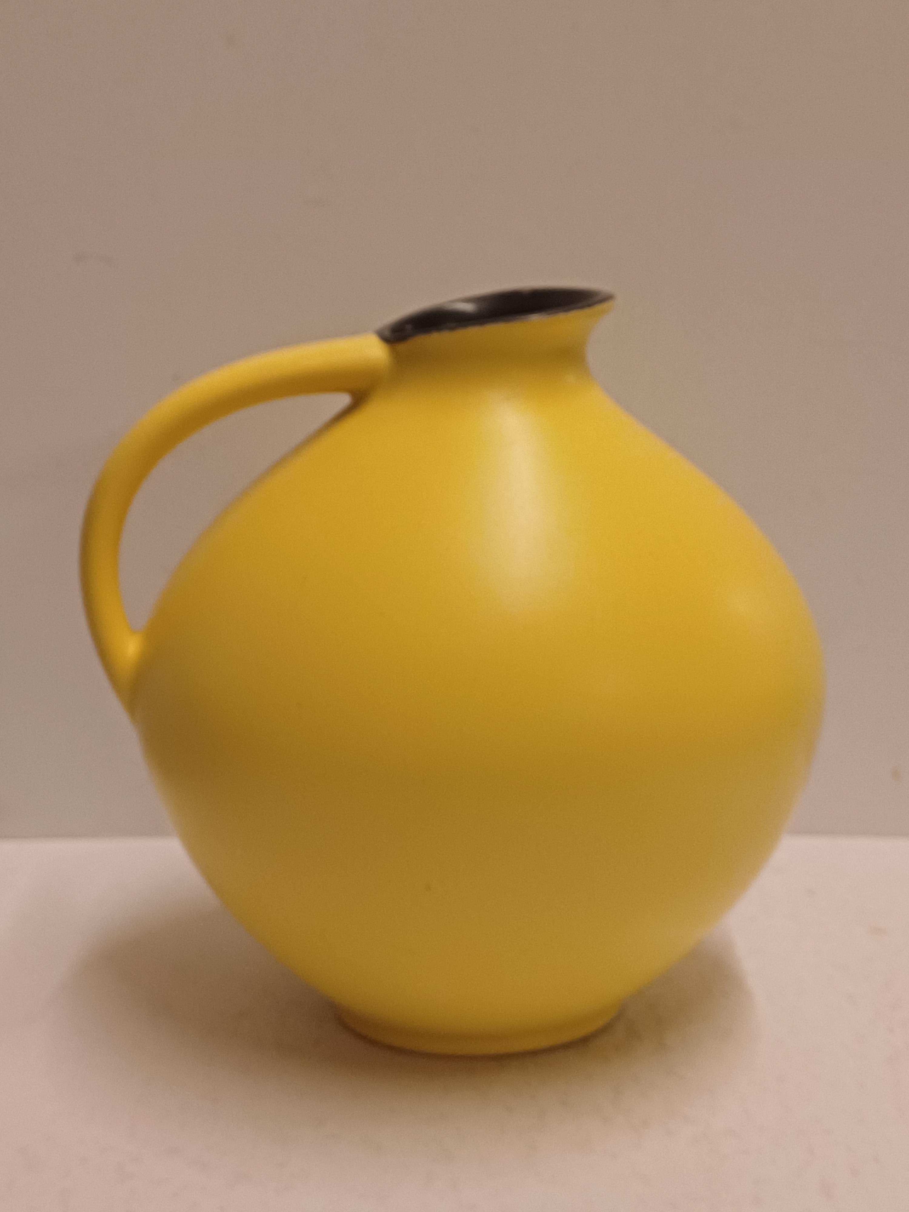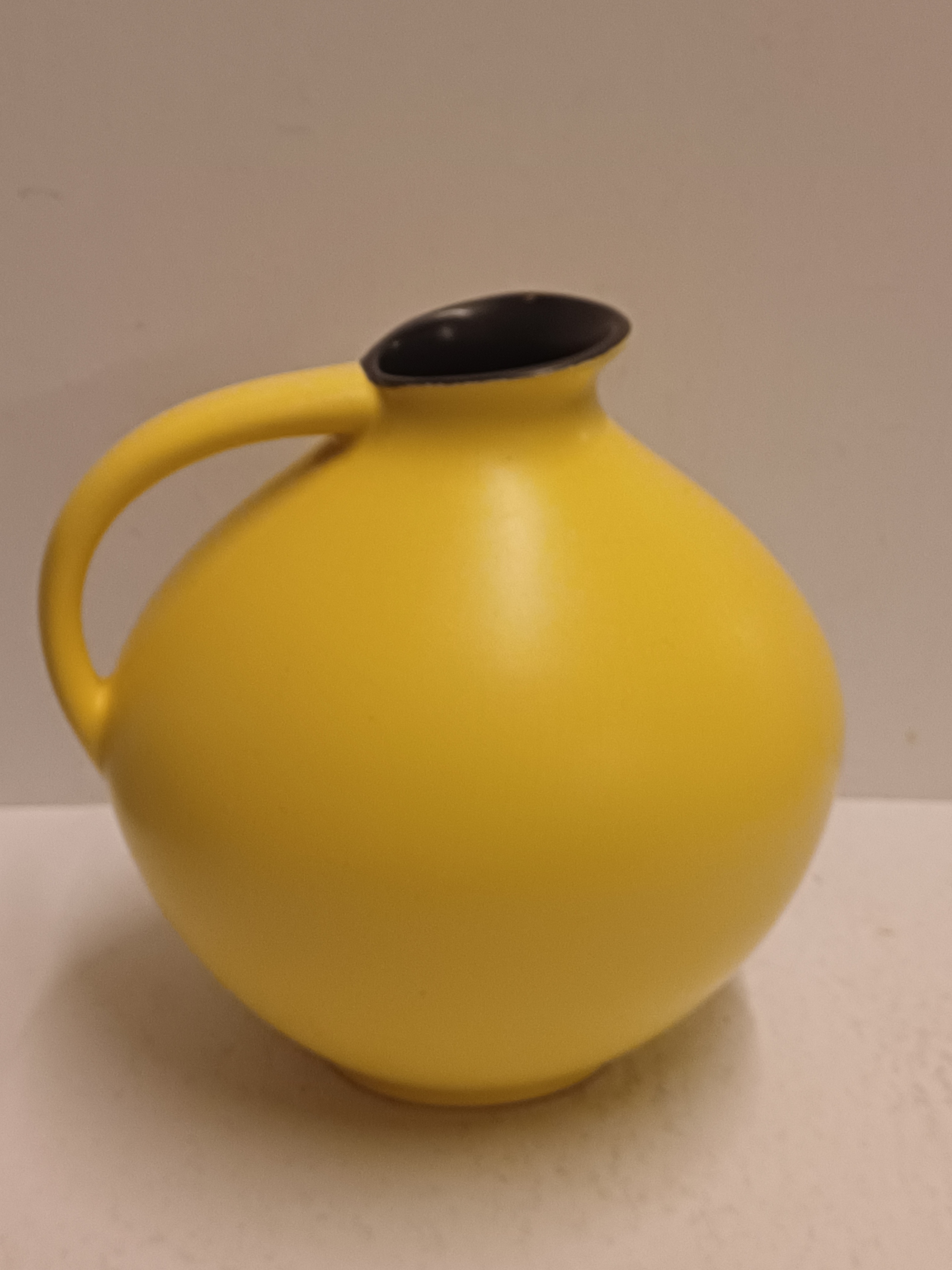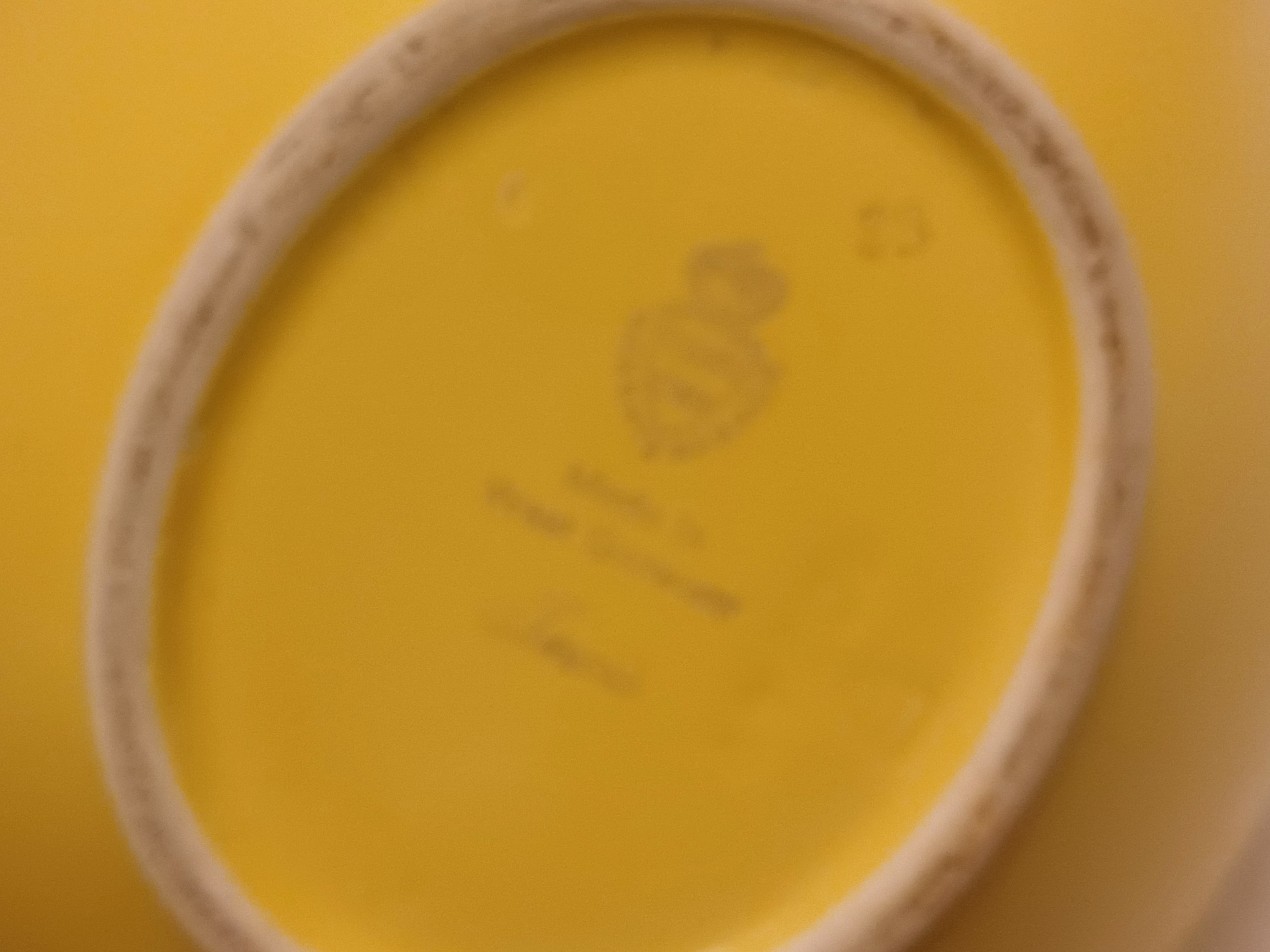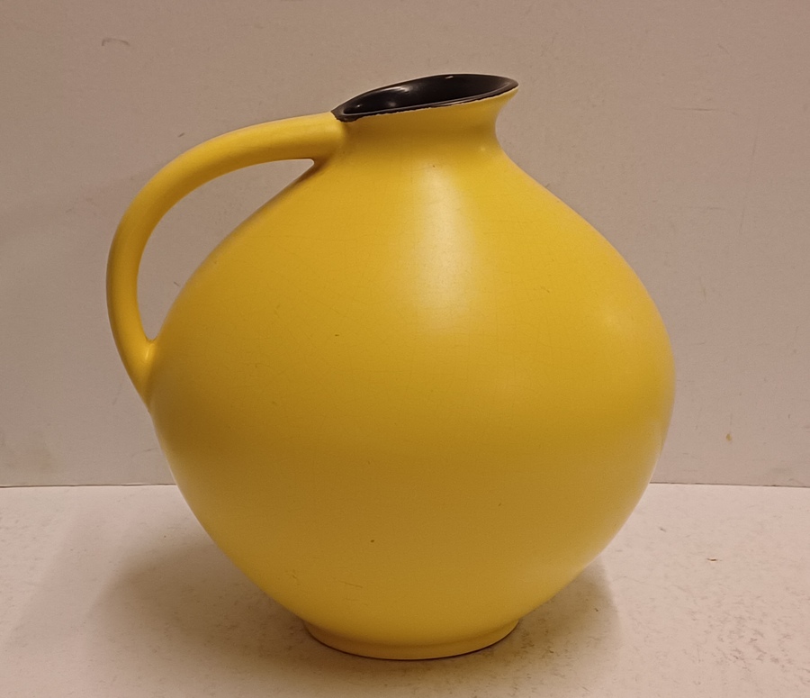 Sierkan met gele spuitglazuur en zwarte binnenzijde. Decornaam Taxis, onderzijde met fabrieksmerk.