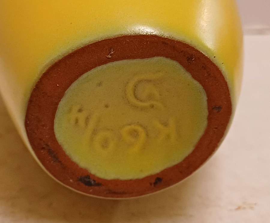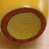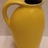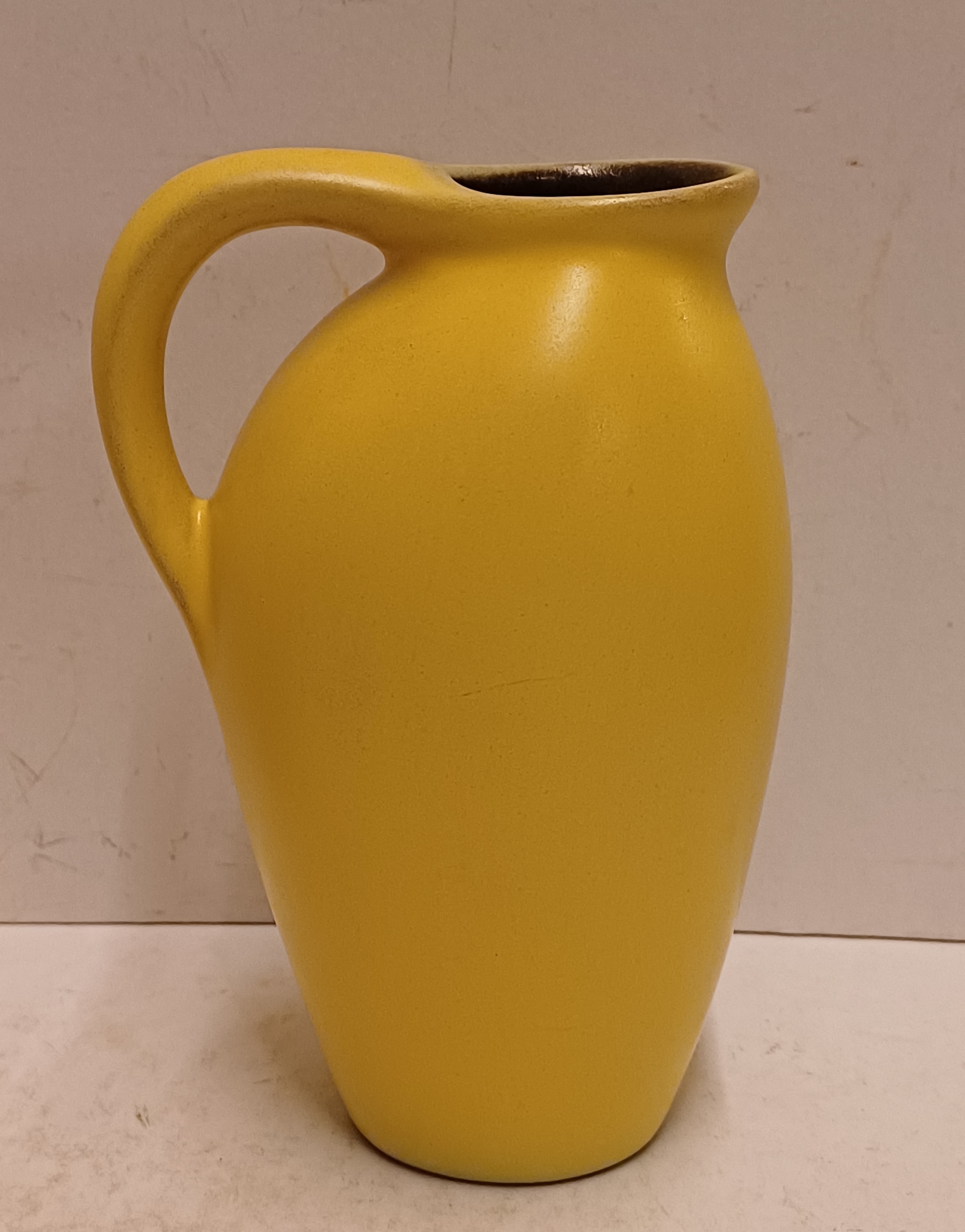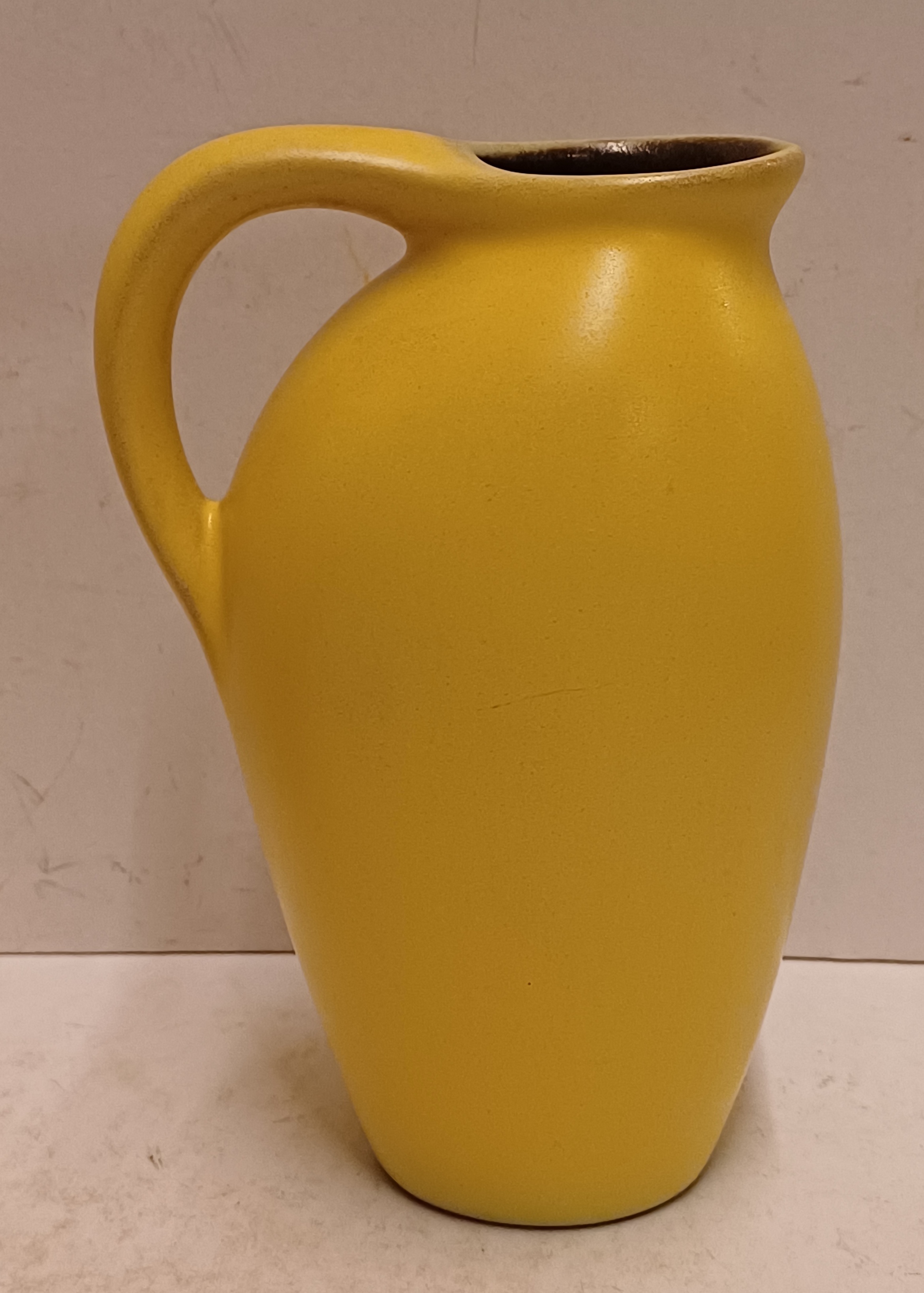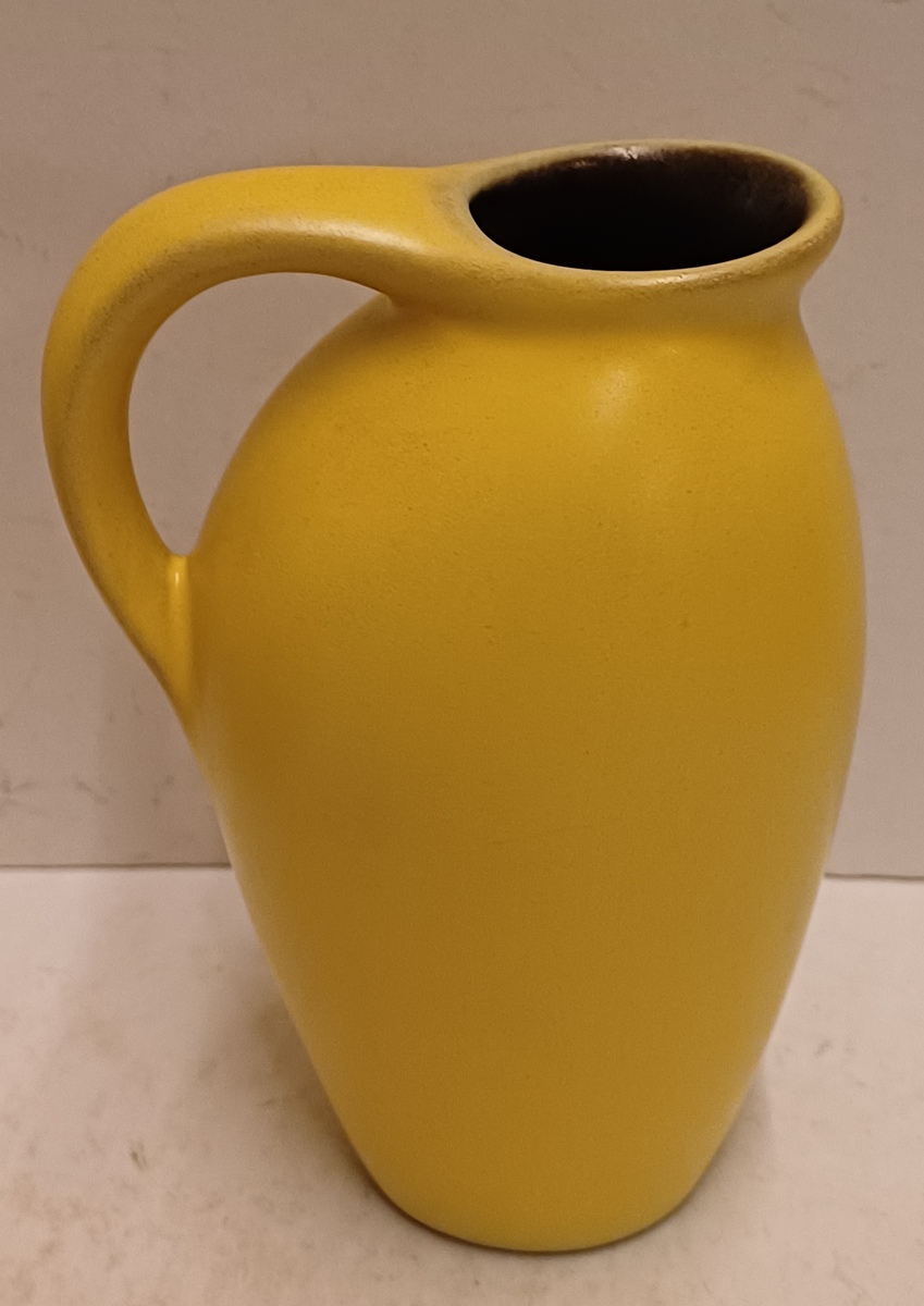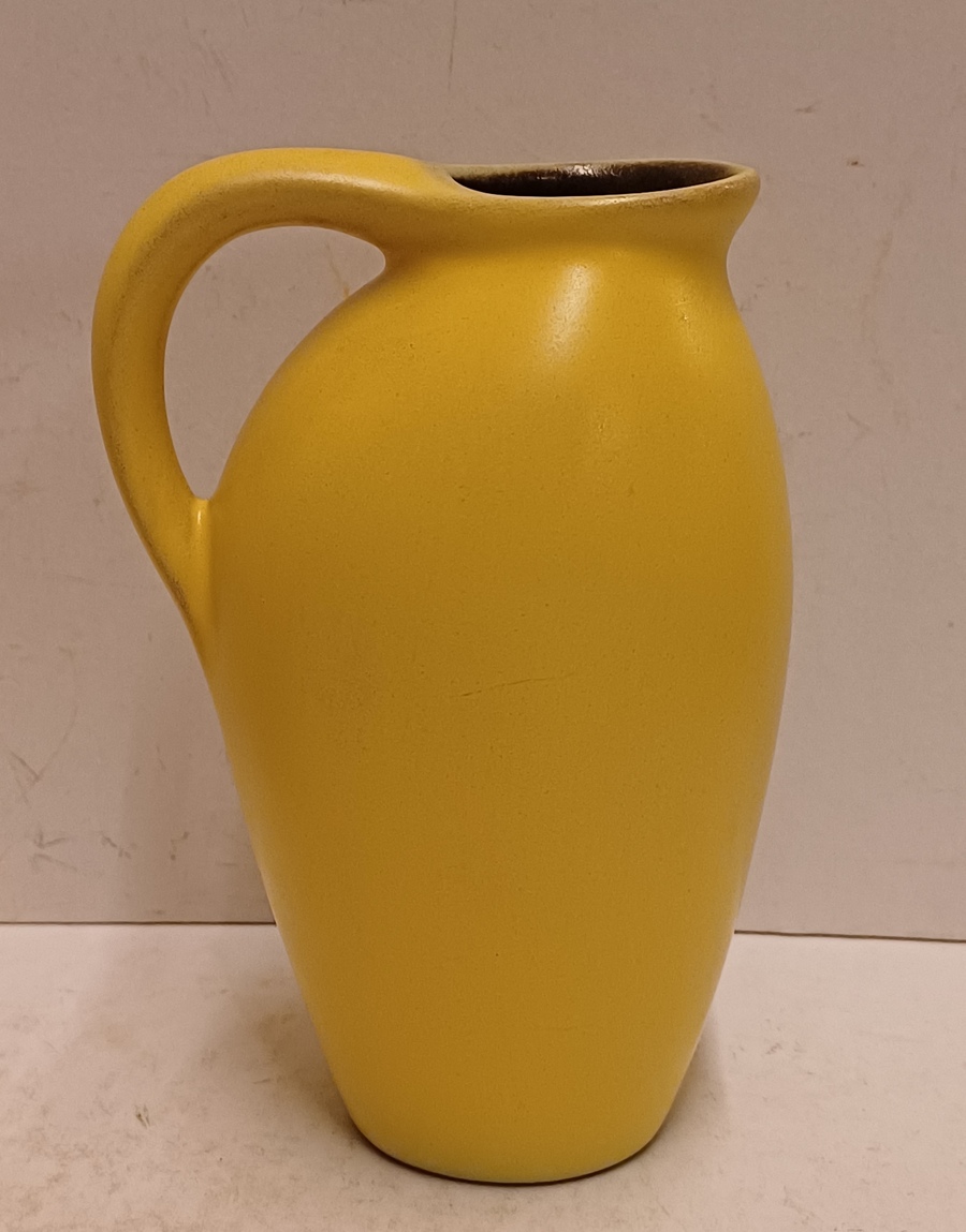 Gegoten aardwerken kannetje met gele glazuur en zwarte binnenzijde. Onderzijde met fabrieksmerk.