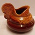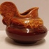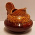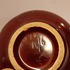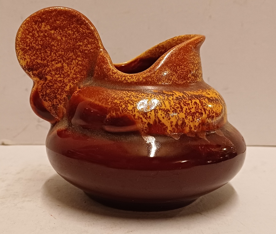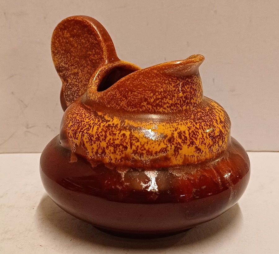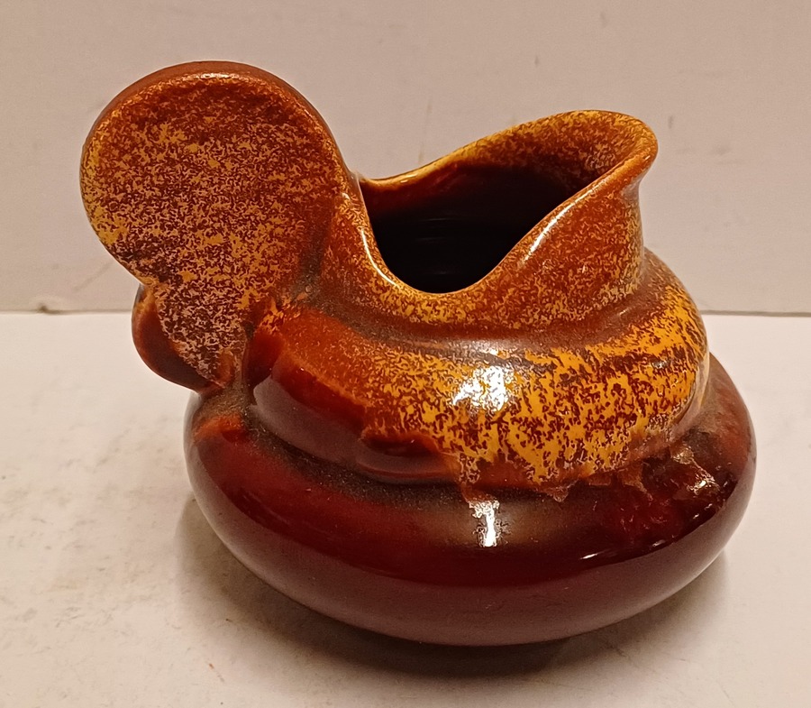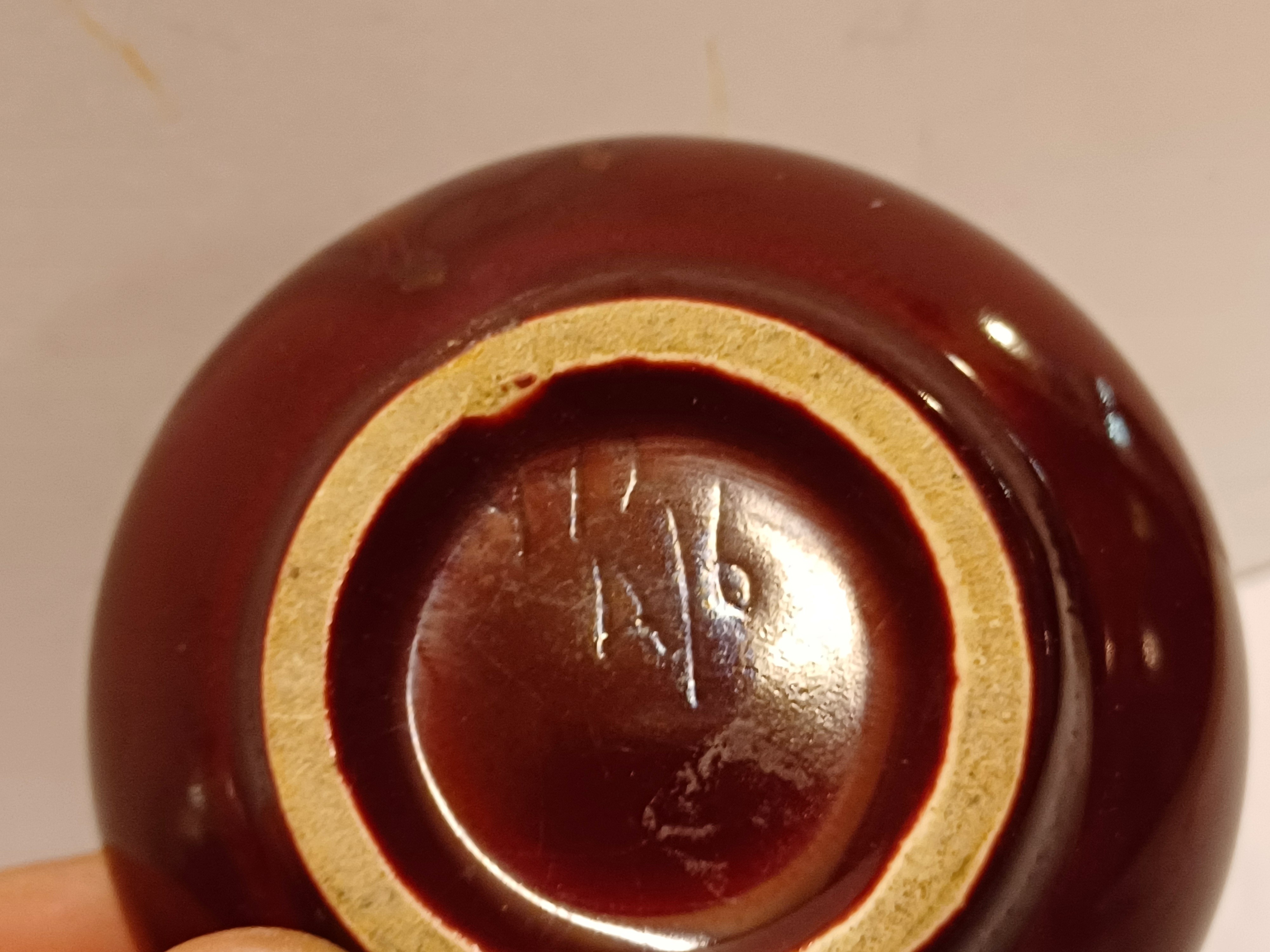 Platelen miniatuur sierkan met bordeaux rode glazuur met gevlamde oranje glazuur aan de bovenzijde . Niet gesigneerd alleen genummerd.