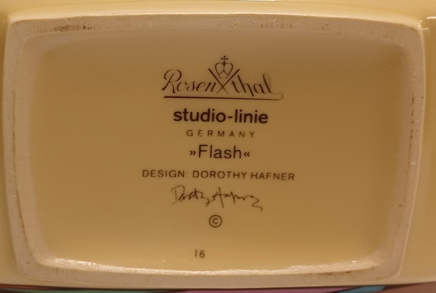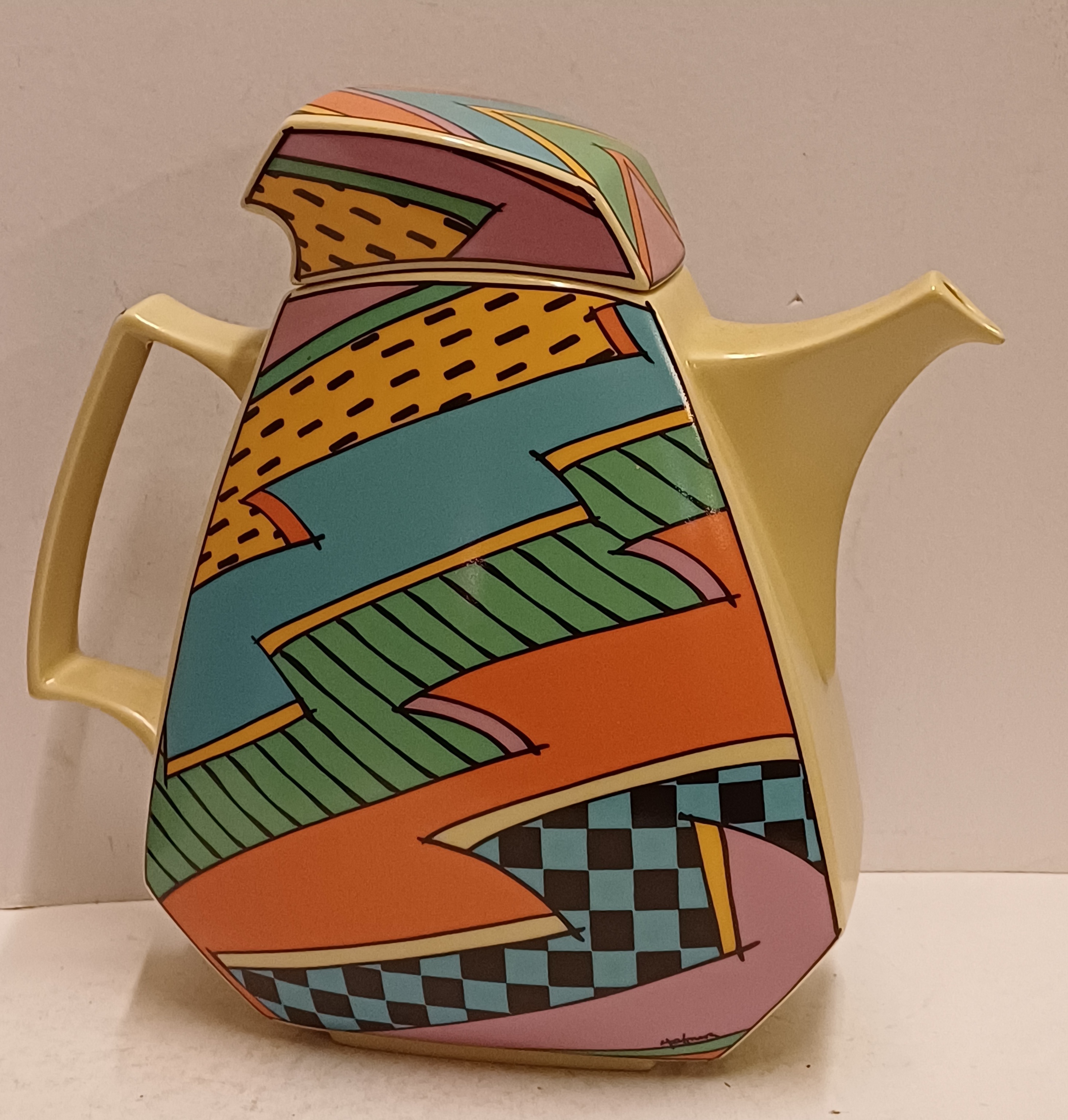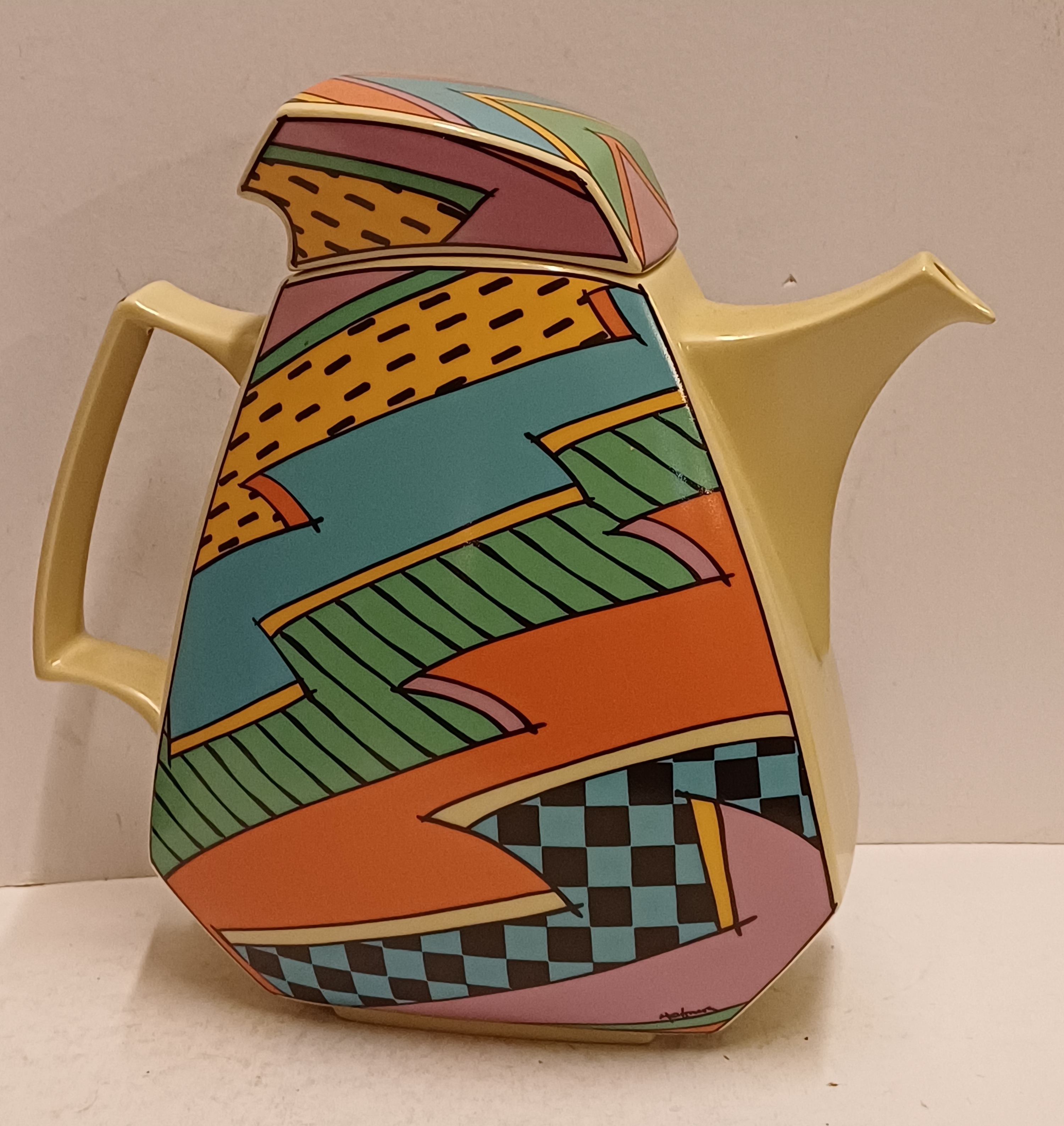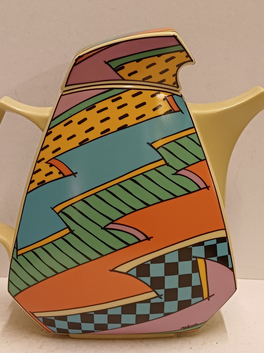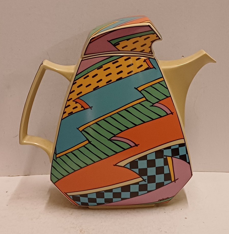 Caffettiera in ceramica con decoro policromo Memphis Flash. Design di Dorothy Hafner, realizzata da Rosenthal Studio Line.
