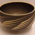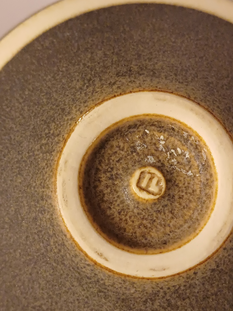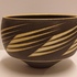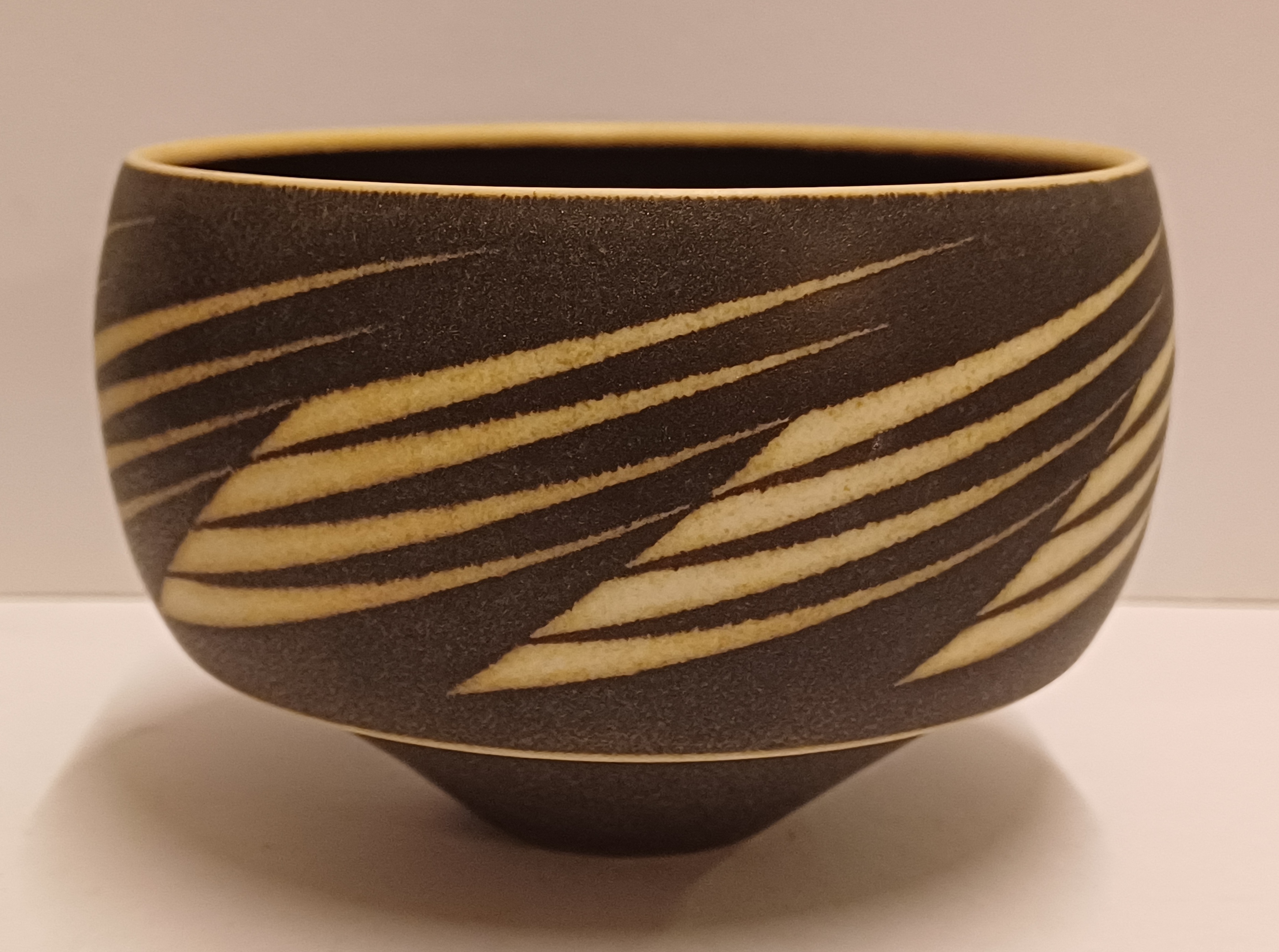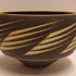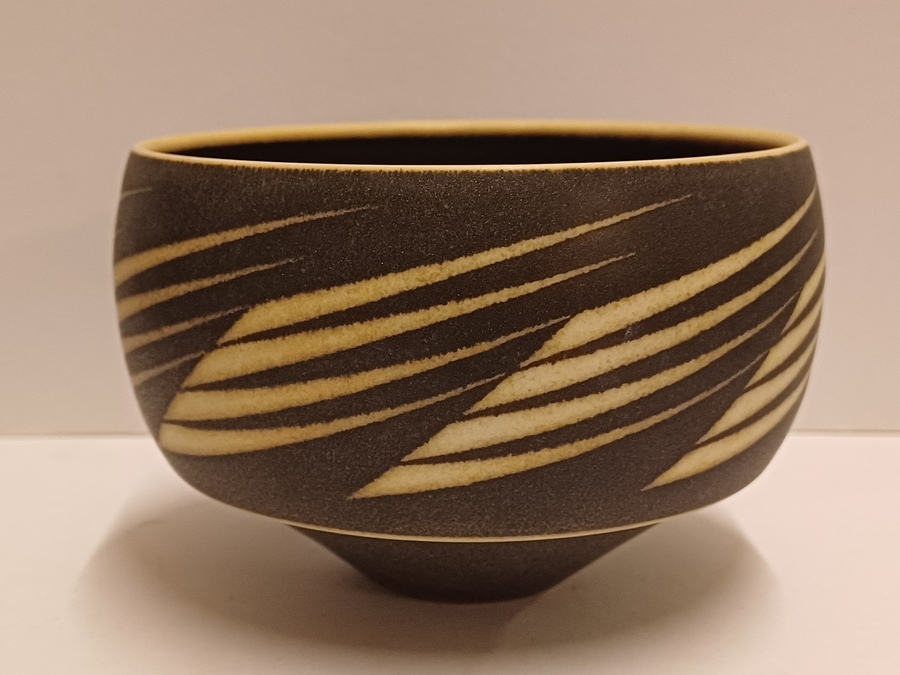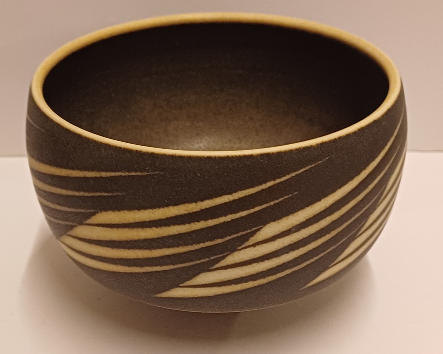 Aardewerken kom met matte zwarte glazuur met witte rand en geometrische decoratie. Onderzijde met kunstenaars monogram.
