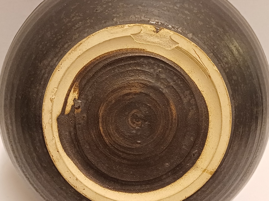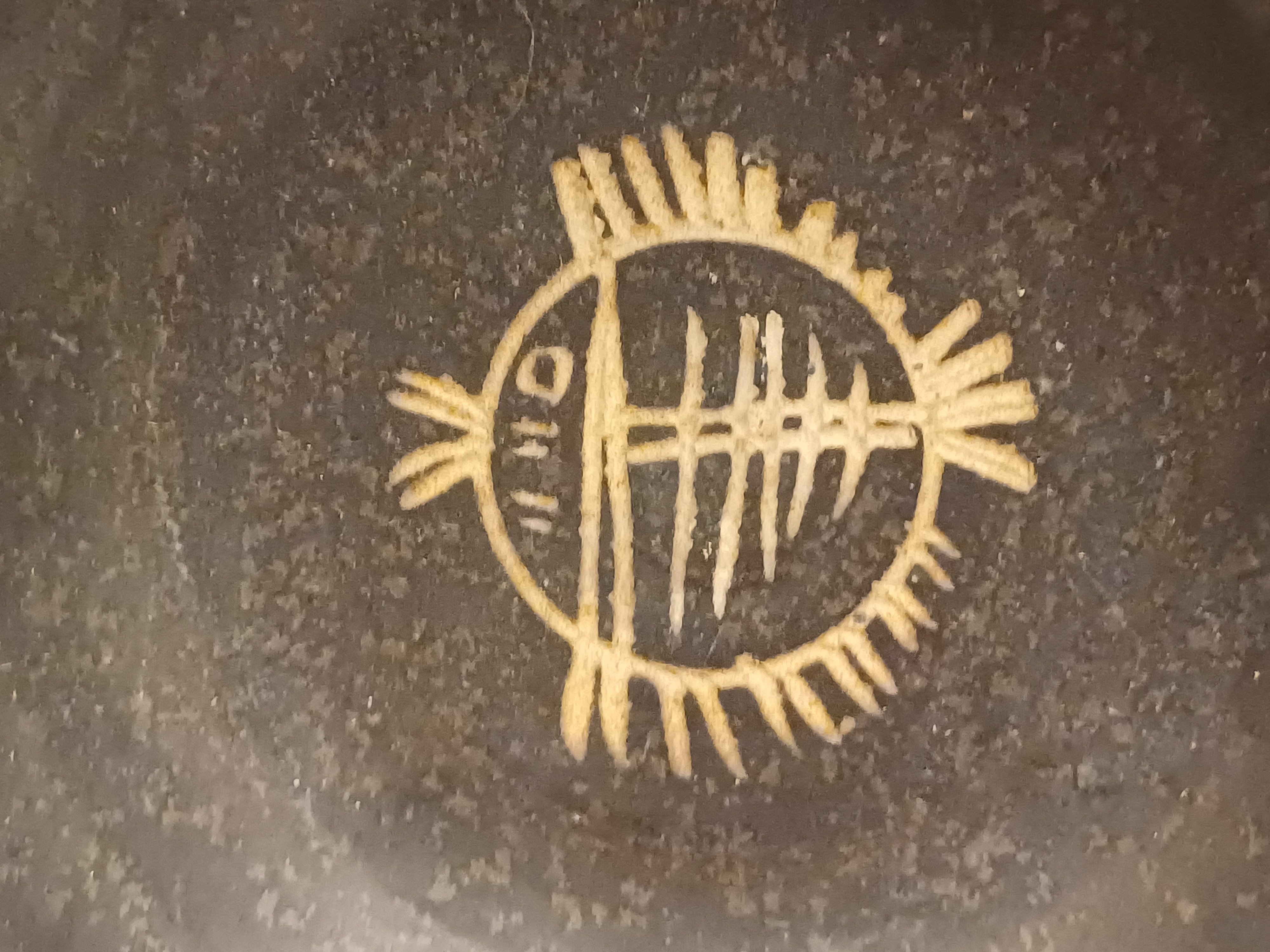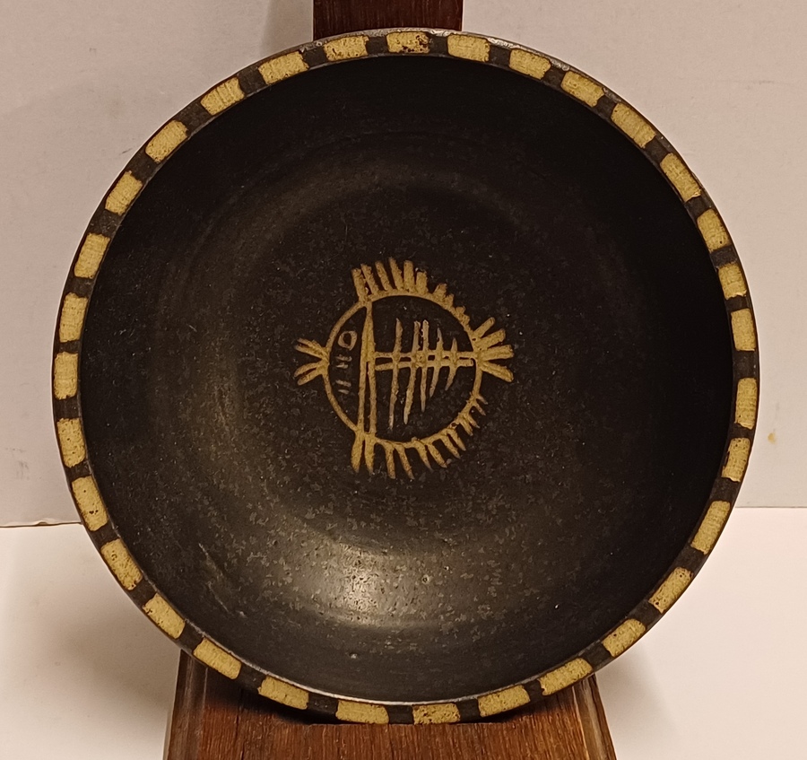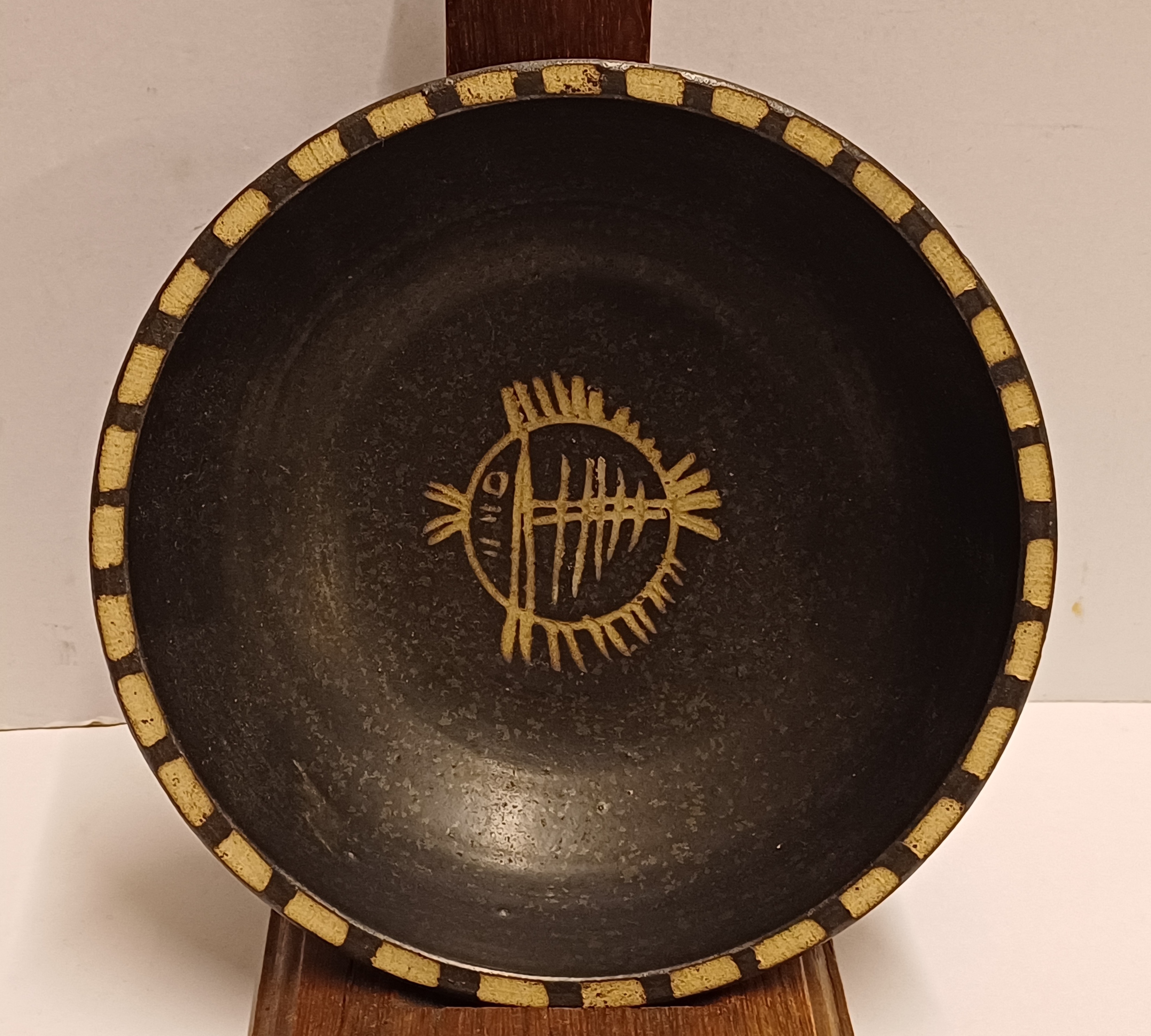 Ciotolina in terracotta con smalto nero e decorazione a risparmio raffigurante un pesce e un bordo a puntini. Non firmata.