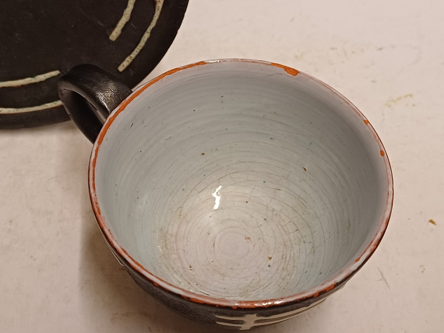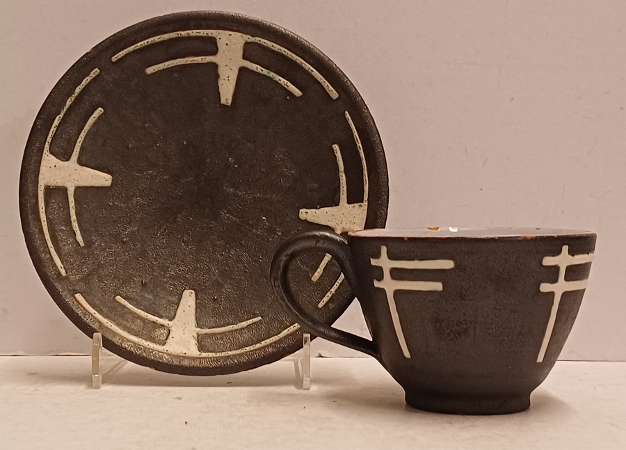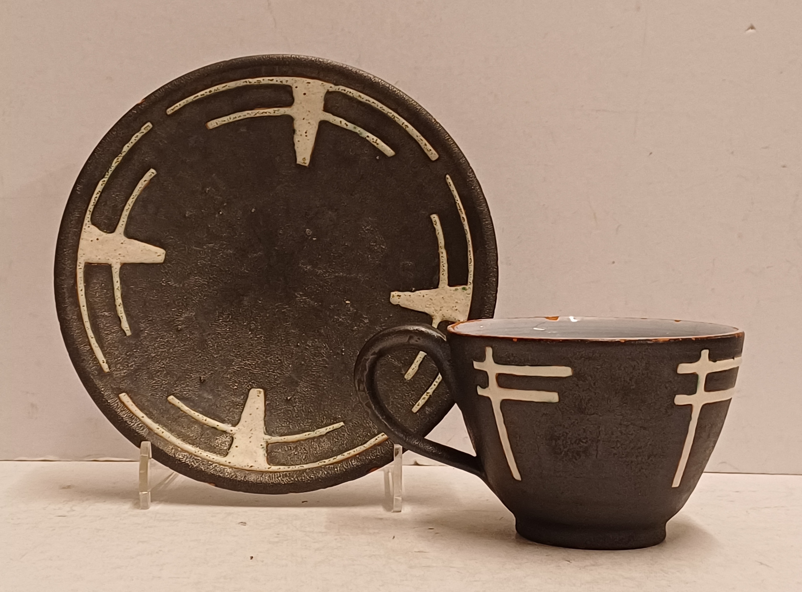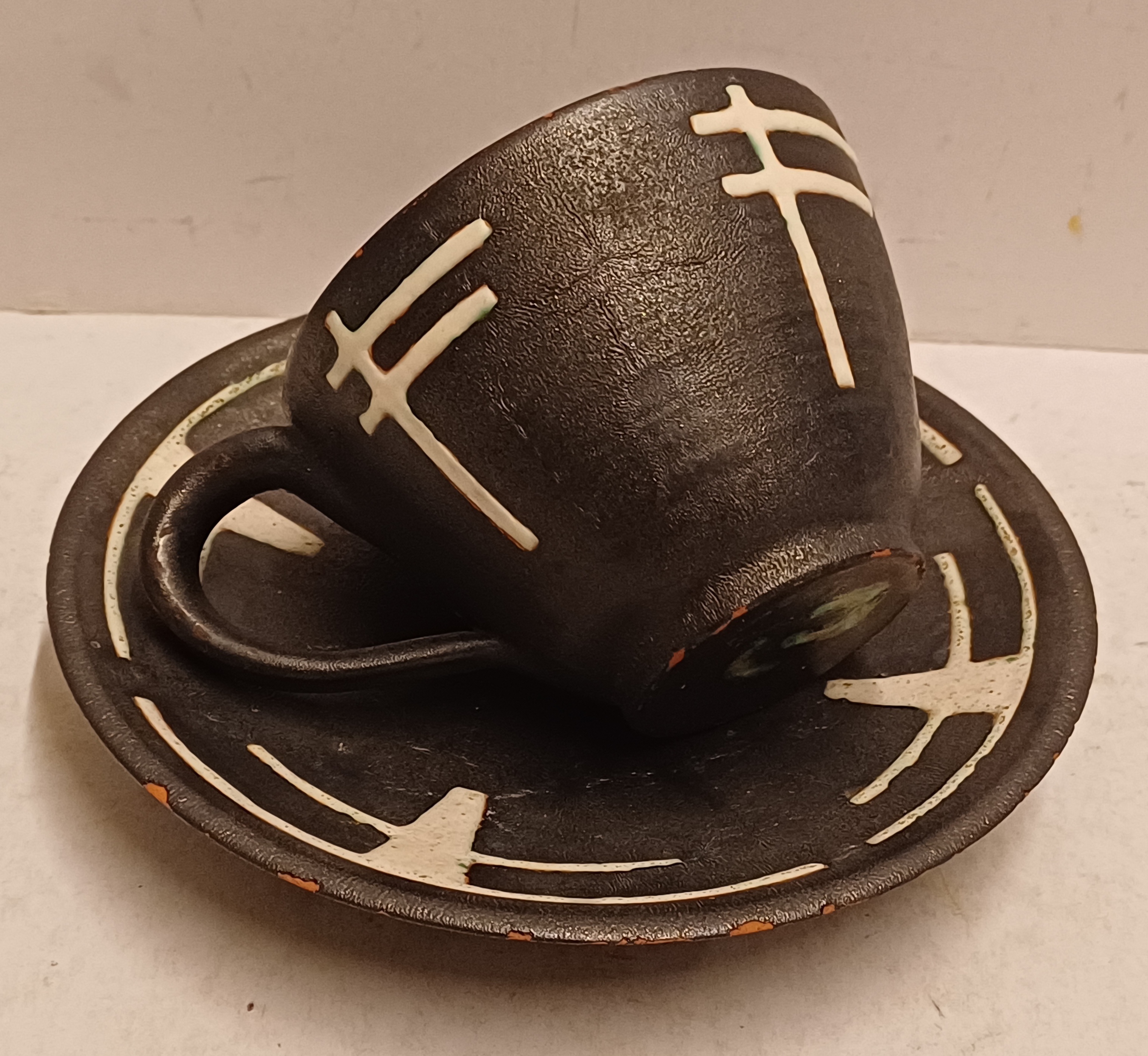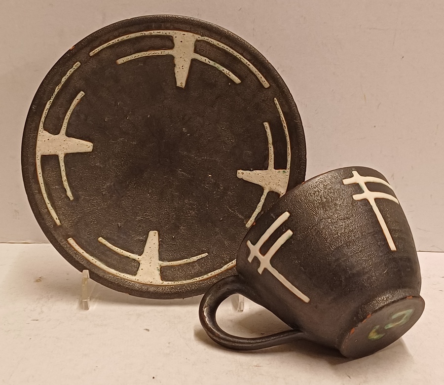 Hangedraaide kop en schotel met mat zwarte glazuur en witte abstracte decoratie. Onderzijde gesigneerd in groen CU. Ontwerp Jan Schuurkes.