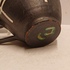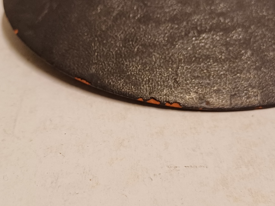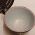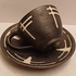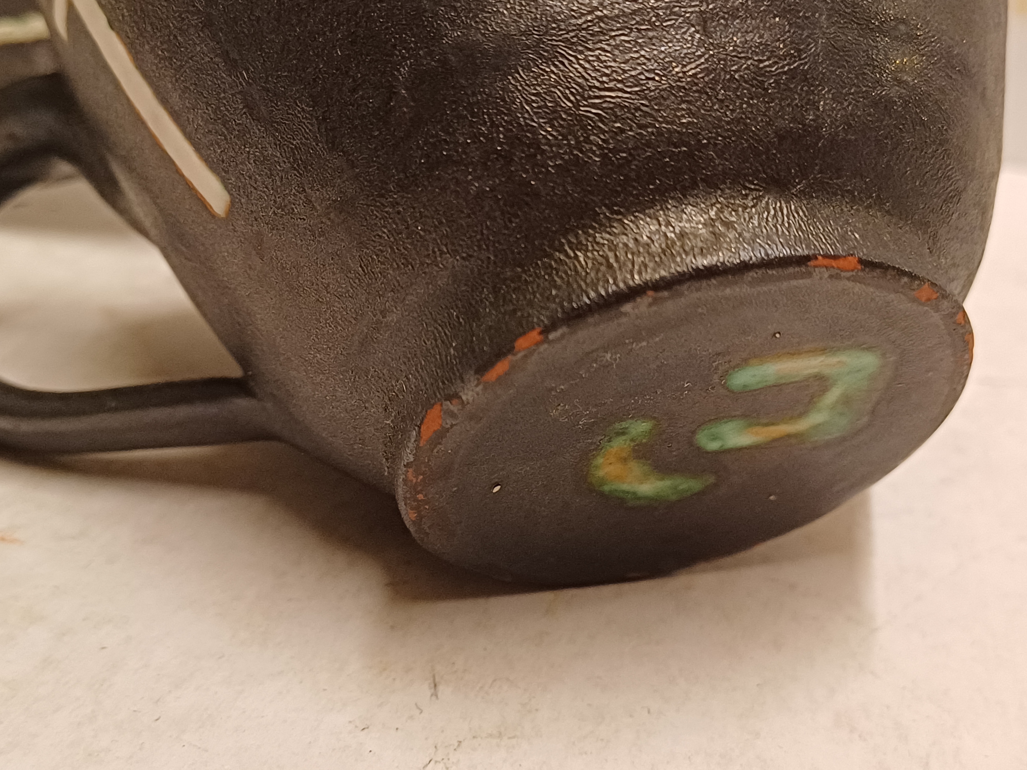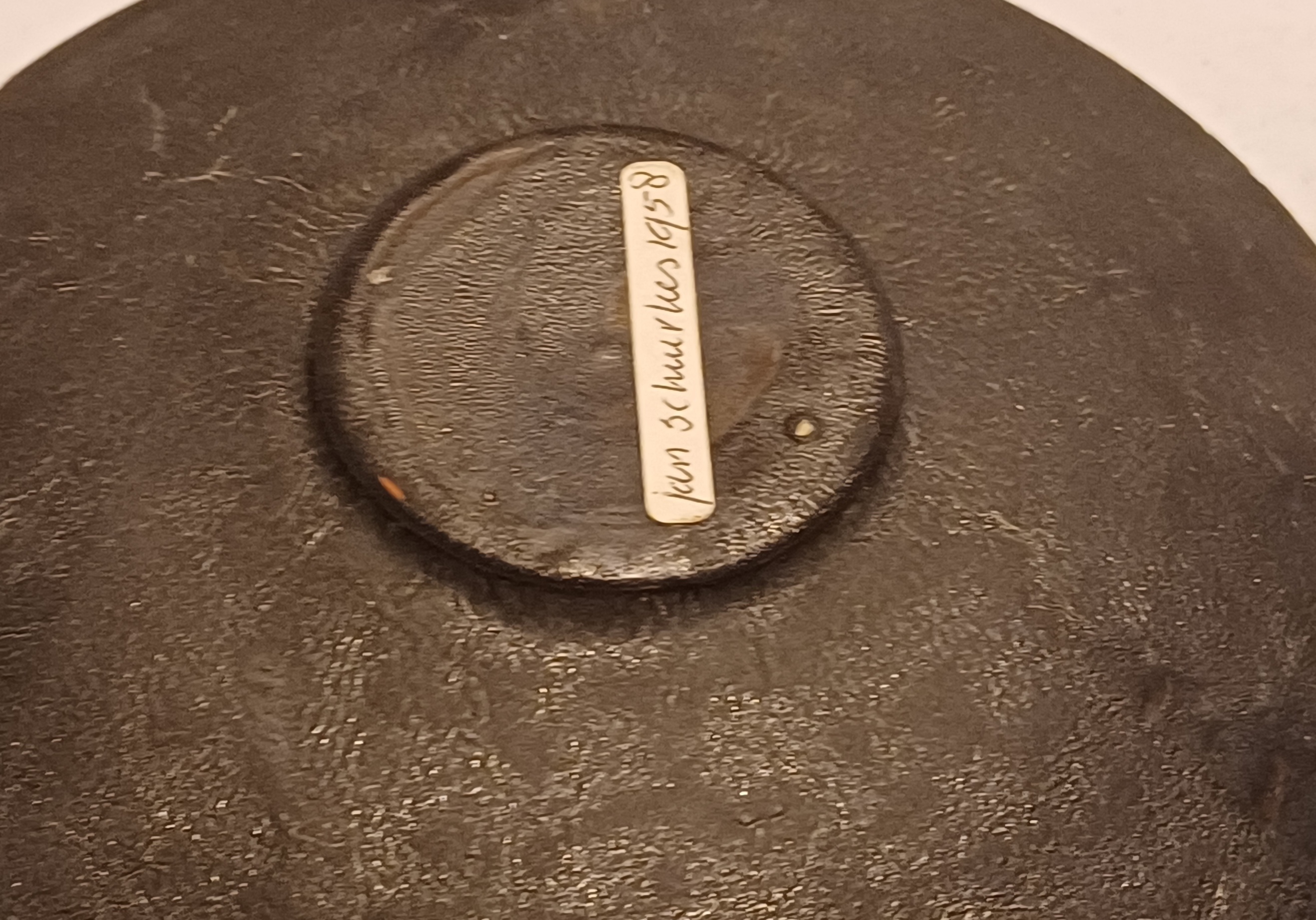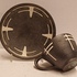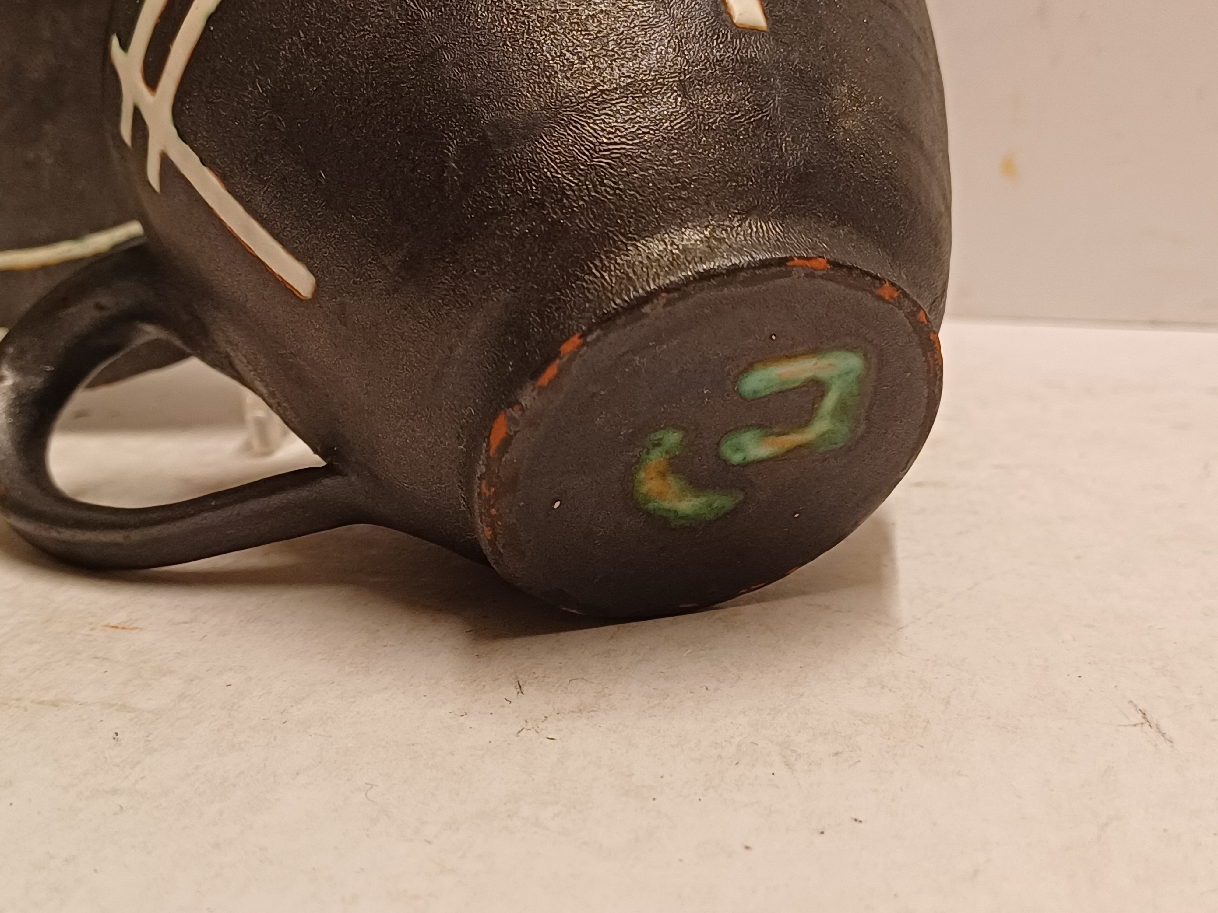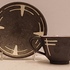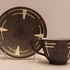 Hangedraaide kop en schotel met mat zwarte glazuur en witte abstracte decoratie. Onderzijde gesigneerd in groen CU. Ontwerp Jan Schuurkes.