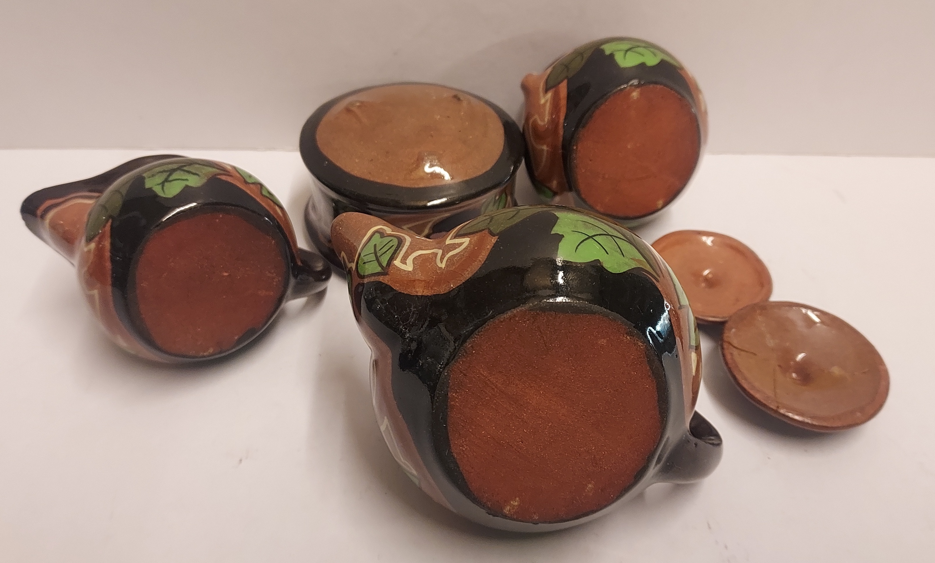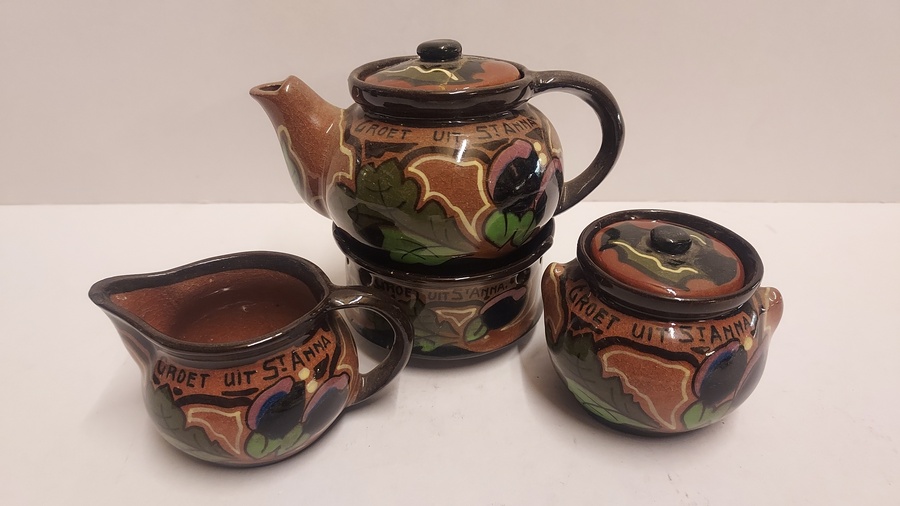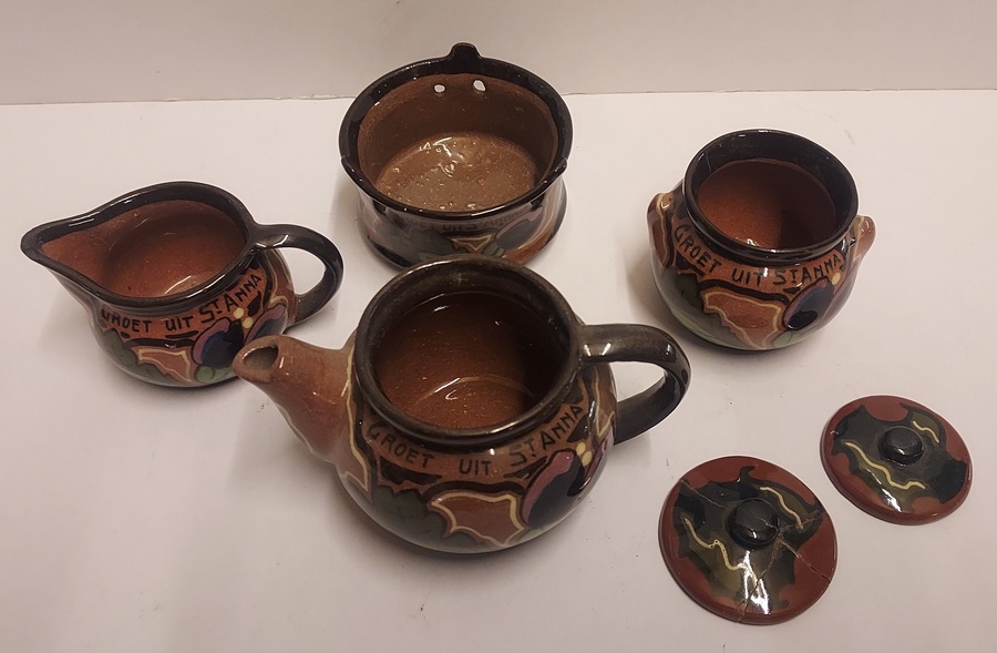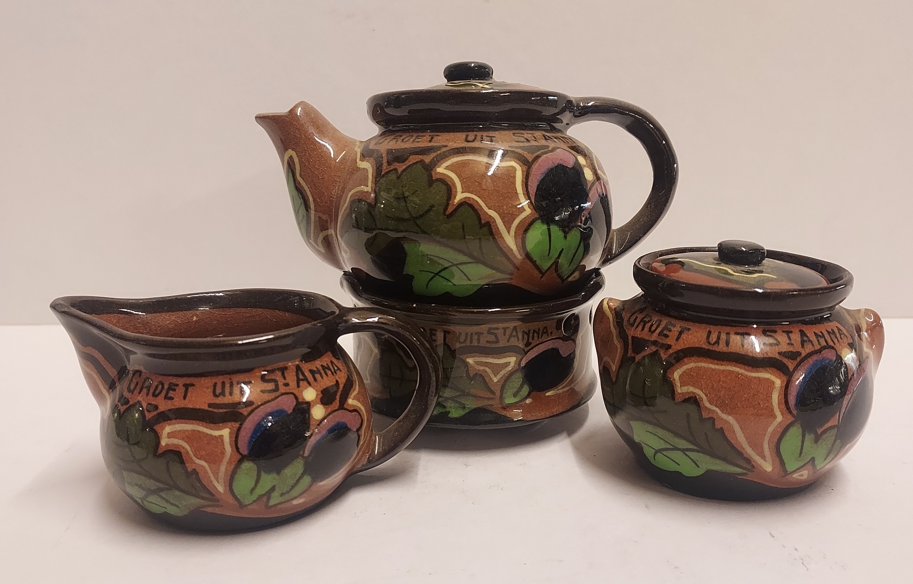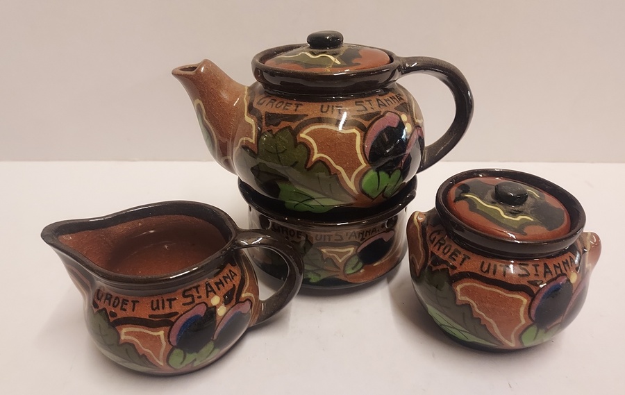 Un servizio in maiolica lucida composto da quattro pezzi, tutti con l'iscrizione Groet buit St Anna. Non firmato.