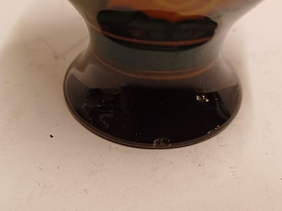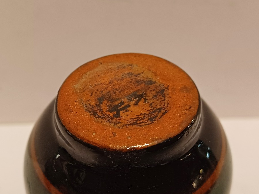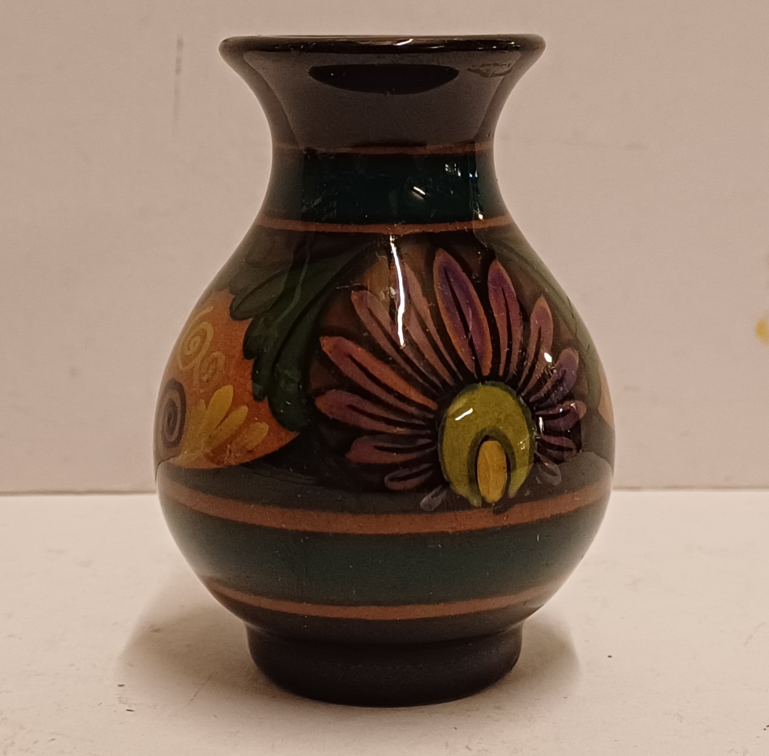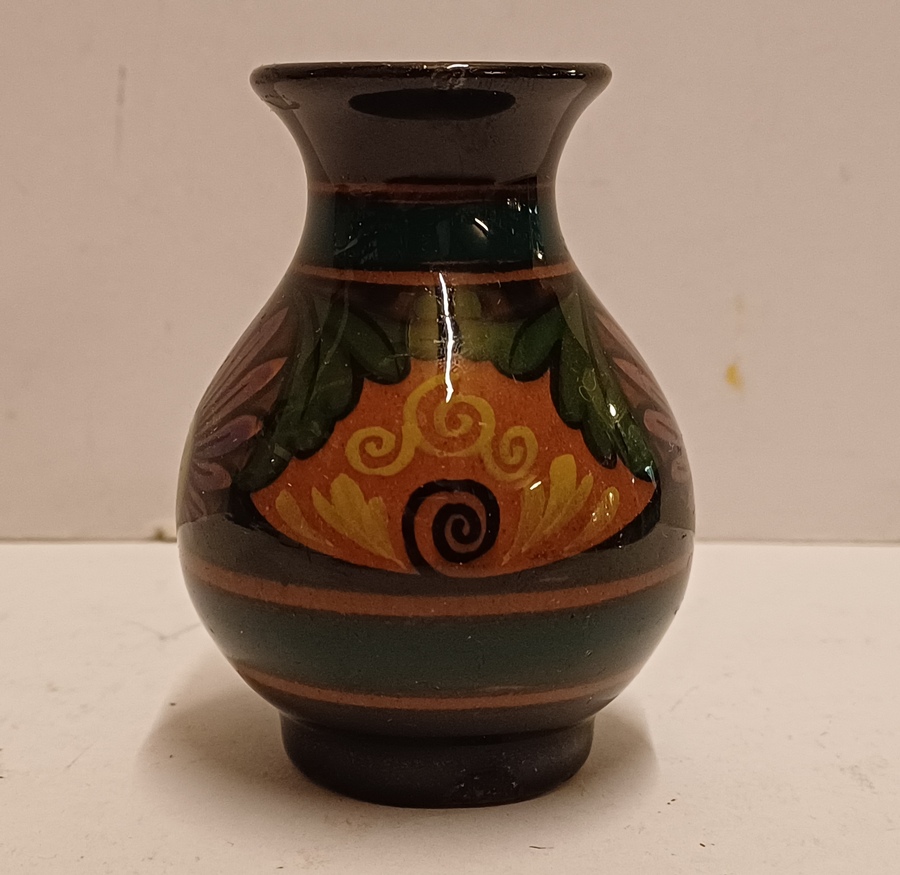 Vasetto in piastrelle lucide con decoro floreale stilizzato. Parte inferiore marcata.