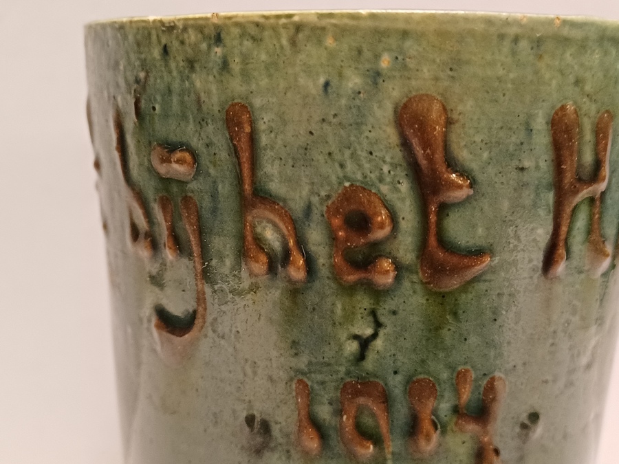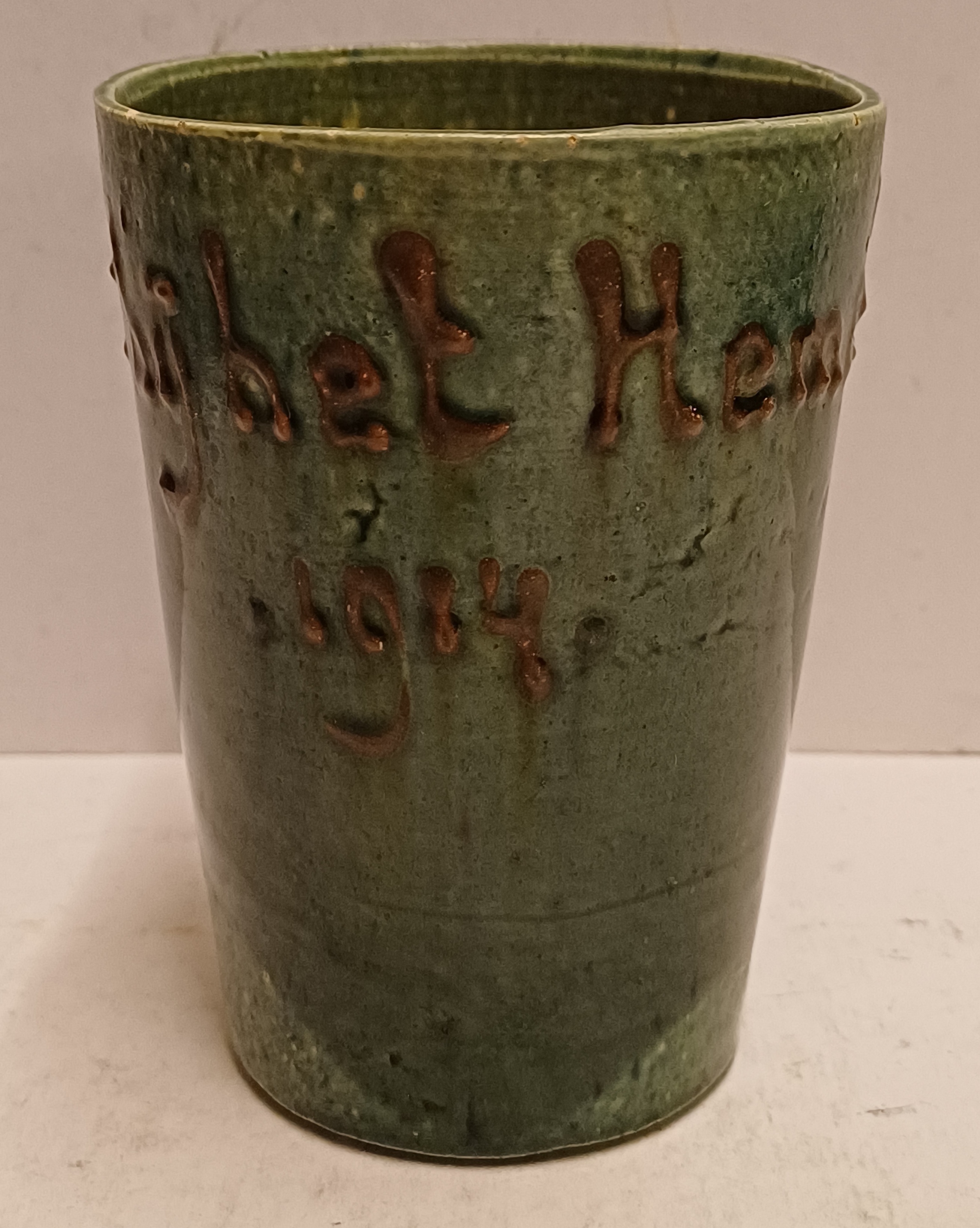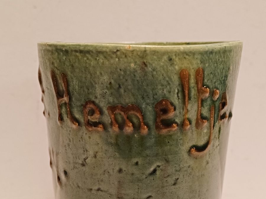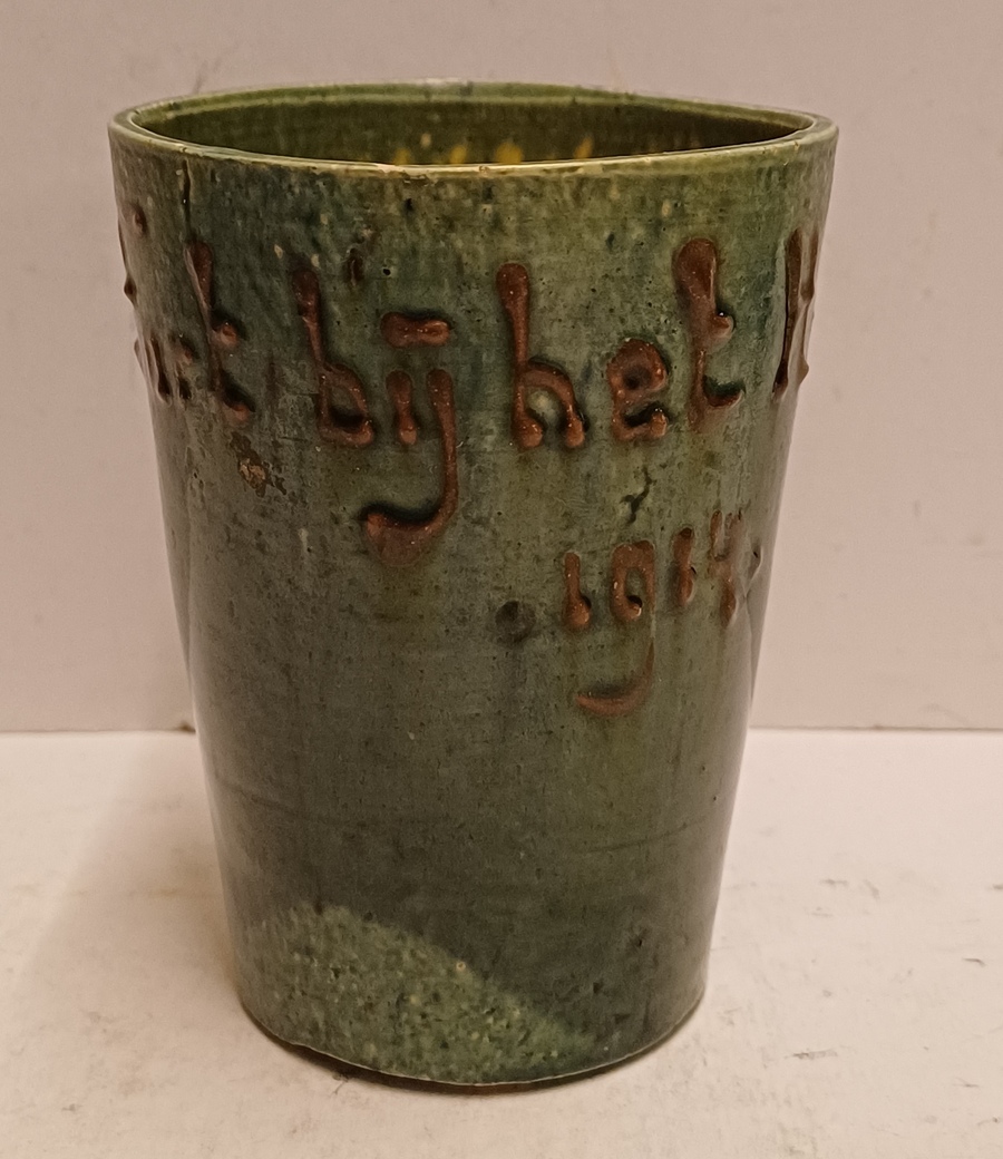 Aardewerken blauw groen geglazuurde beker met in slibdecor de tekst "Fort bij het hemeltje" Niet gesigneerd