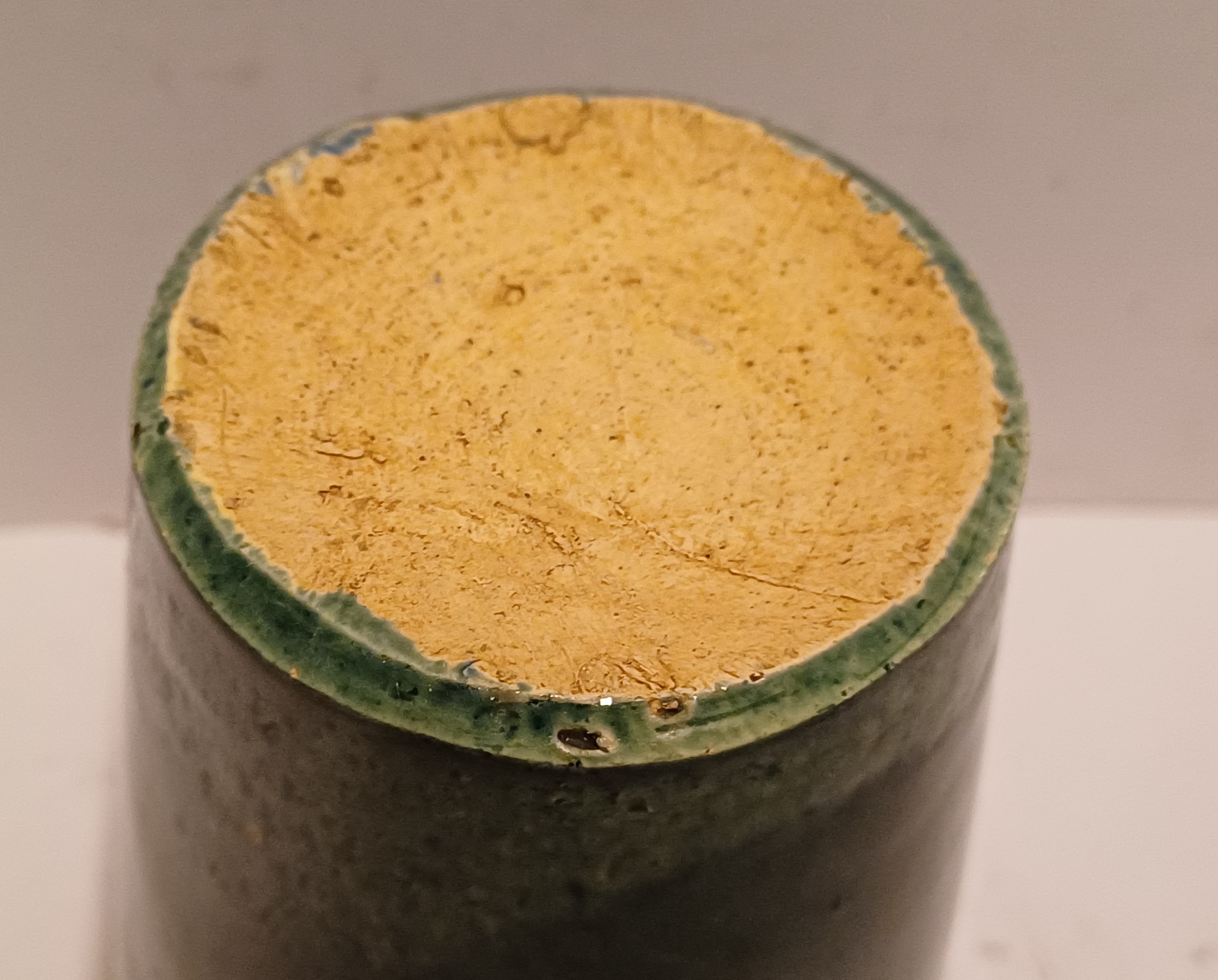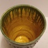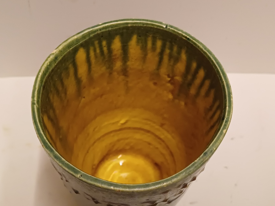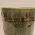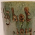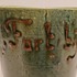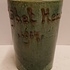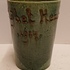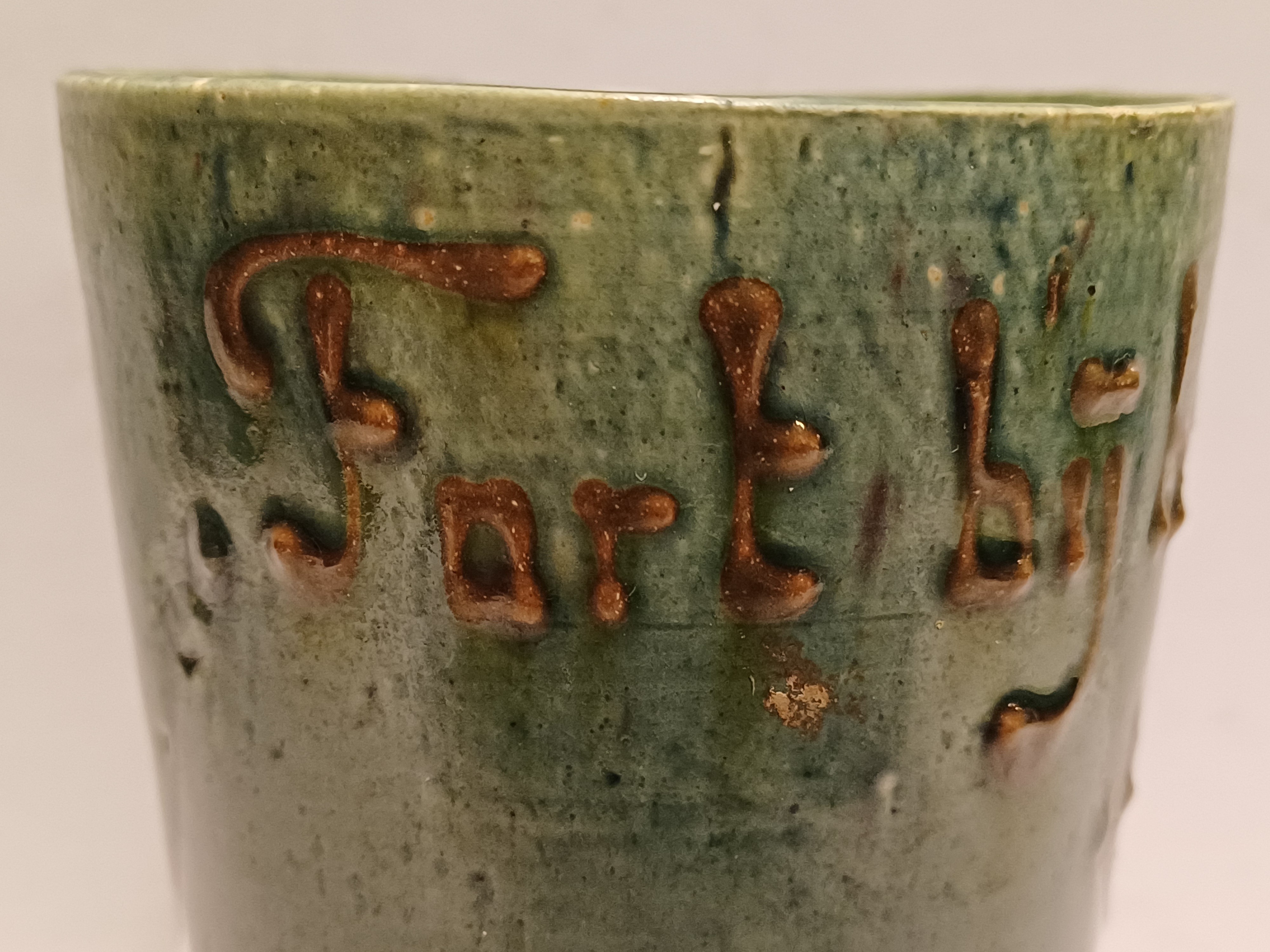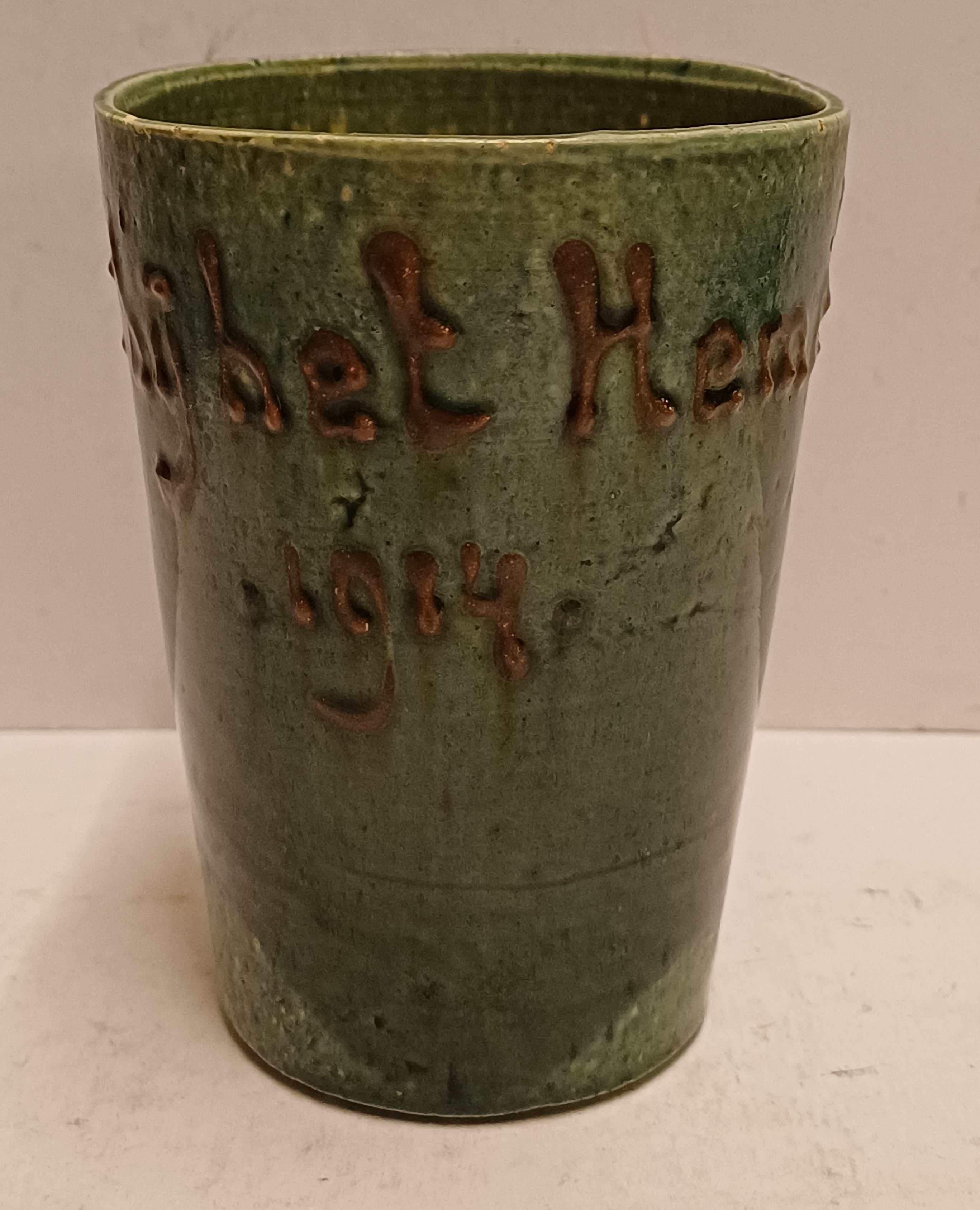 Aardewerken blauw groen geglazuurde beker met in slibdecor de tekst "Fort bij het hemeltje" Niet gesigneerd
