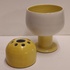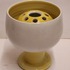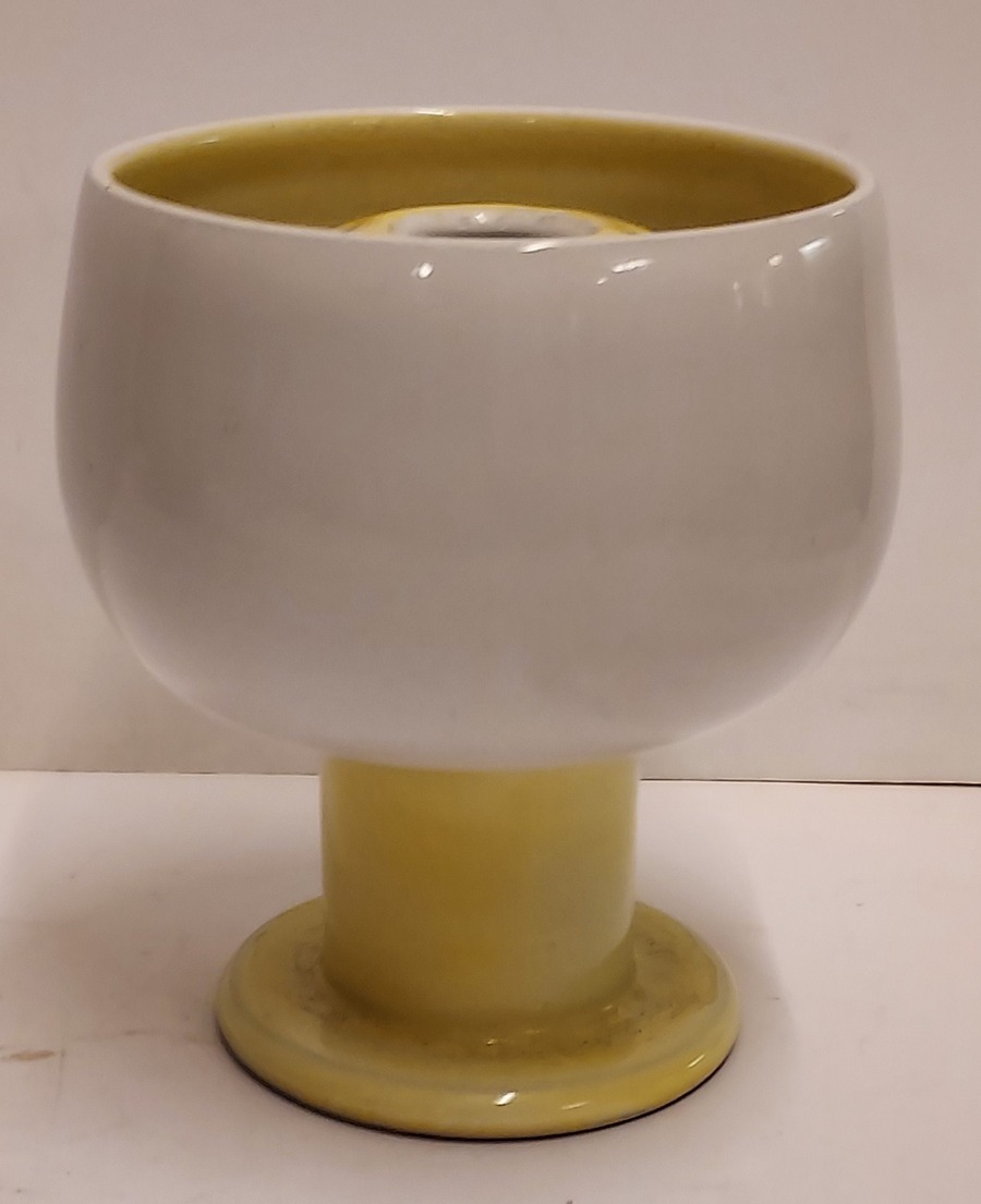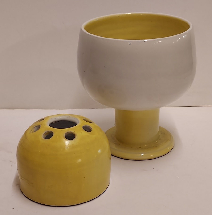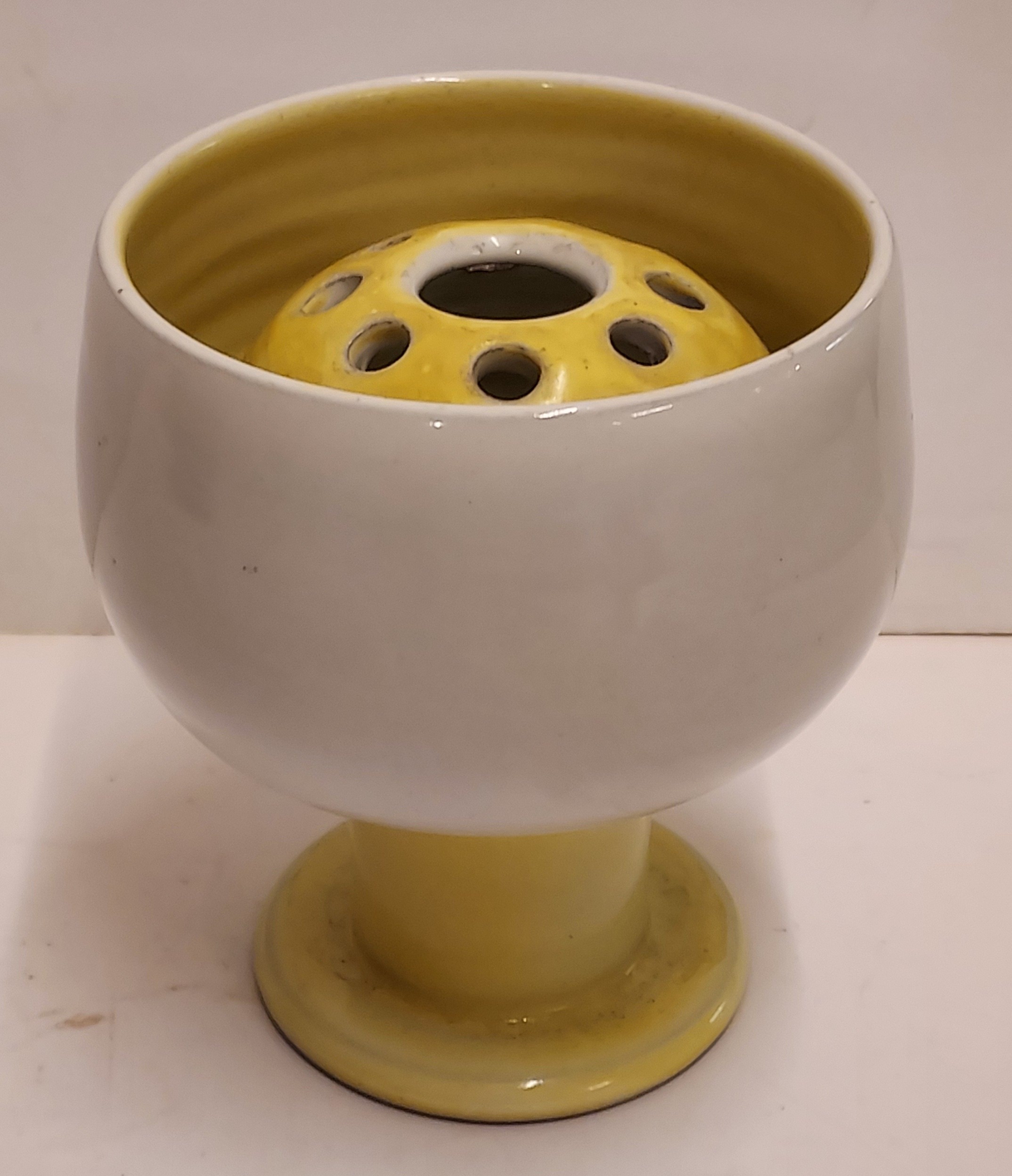 Piedistallo bianco con giallo e interno con spuntone per rose libero. Inferiore con logo a forma di alveare e data 1960. Design attribuito a Ettore Sottsass.