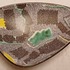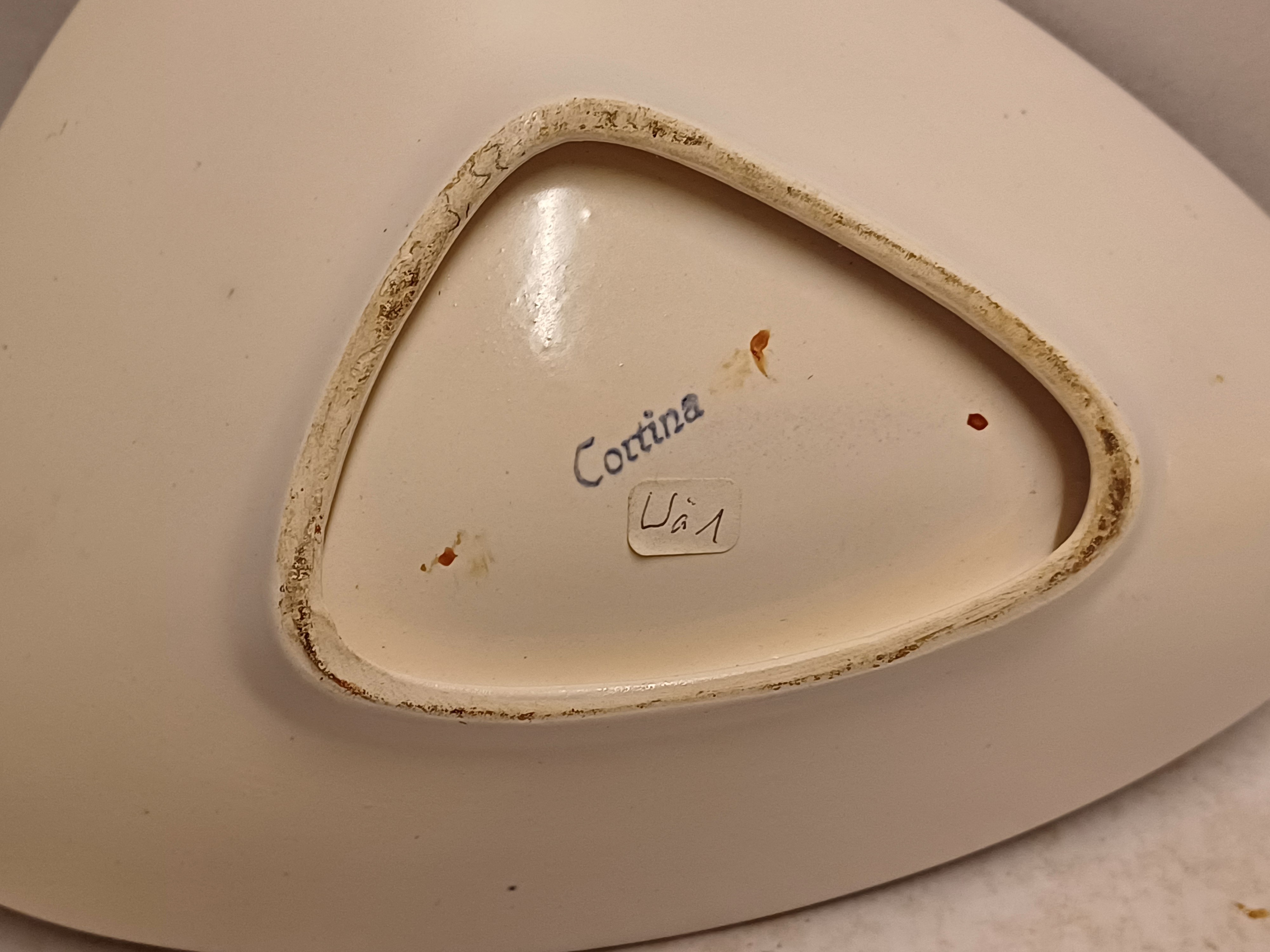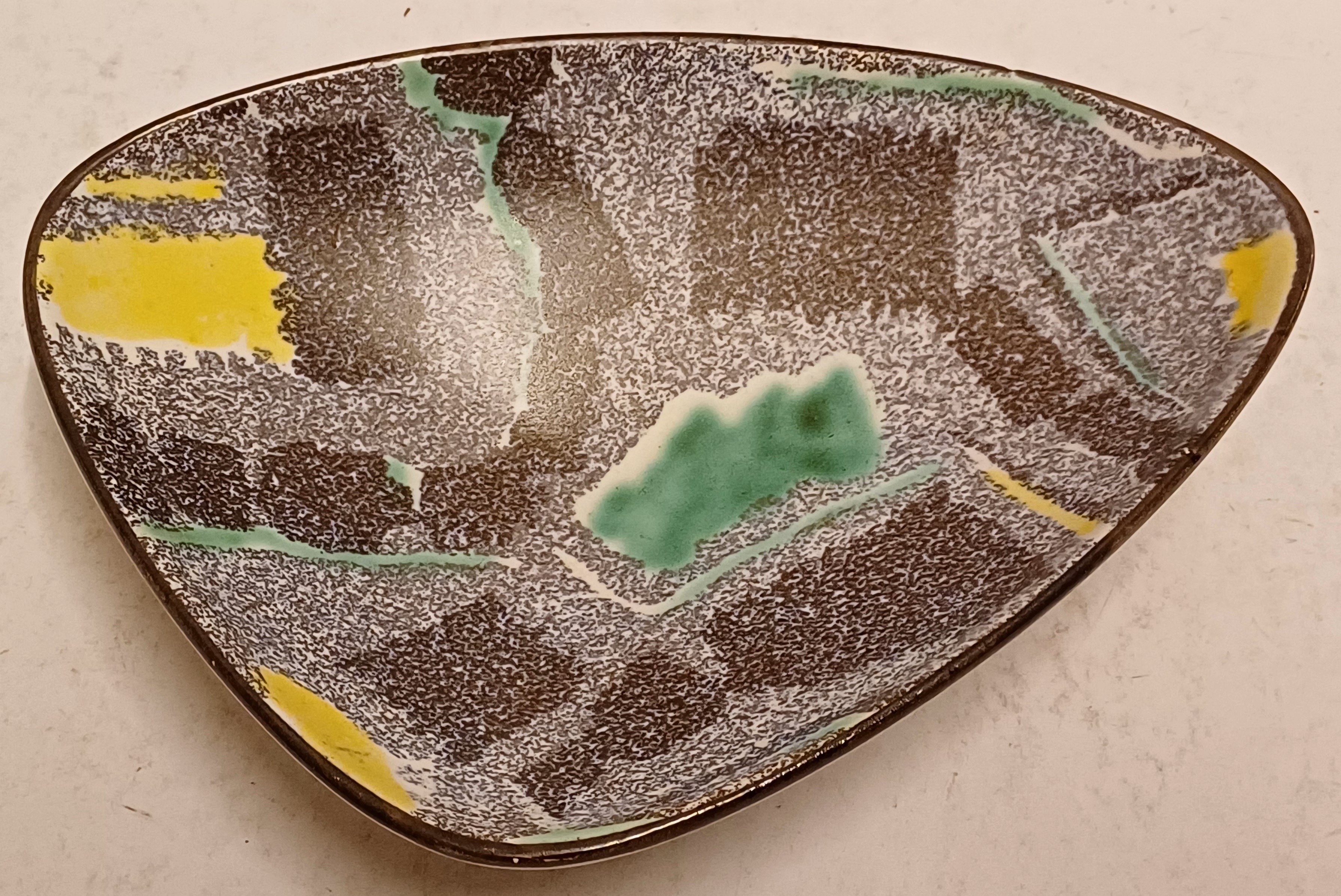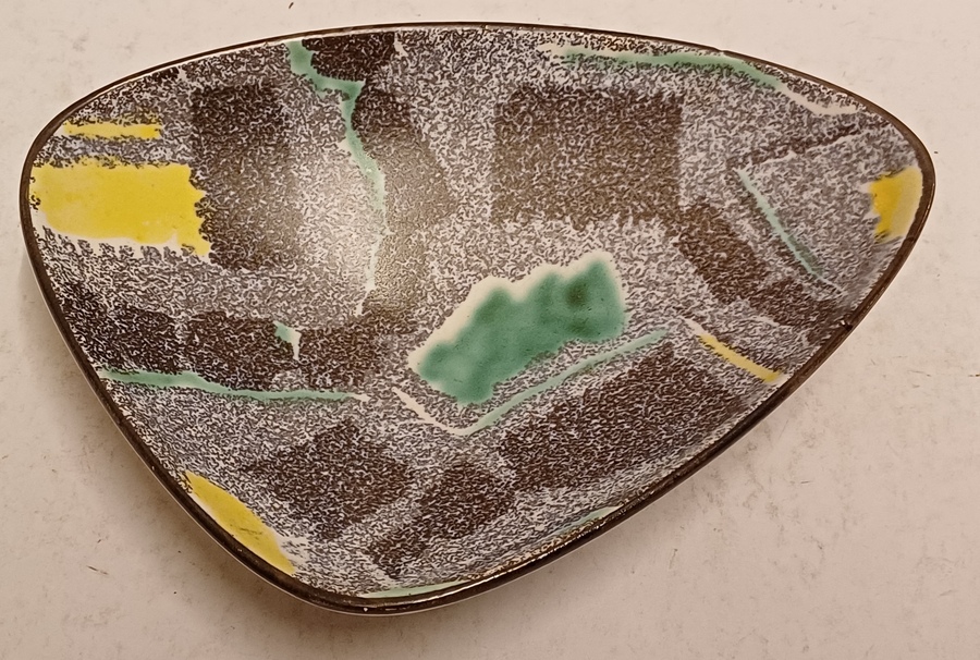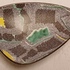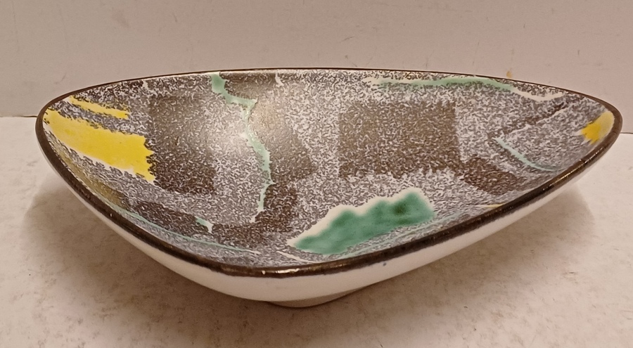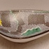 Schaal met meerkleurige print op gespikkeld grijs fond. Onderzijde met decornaam.