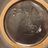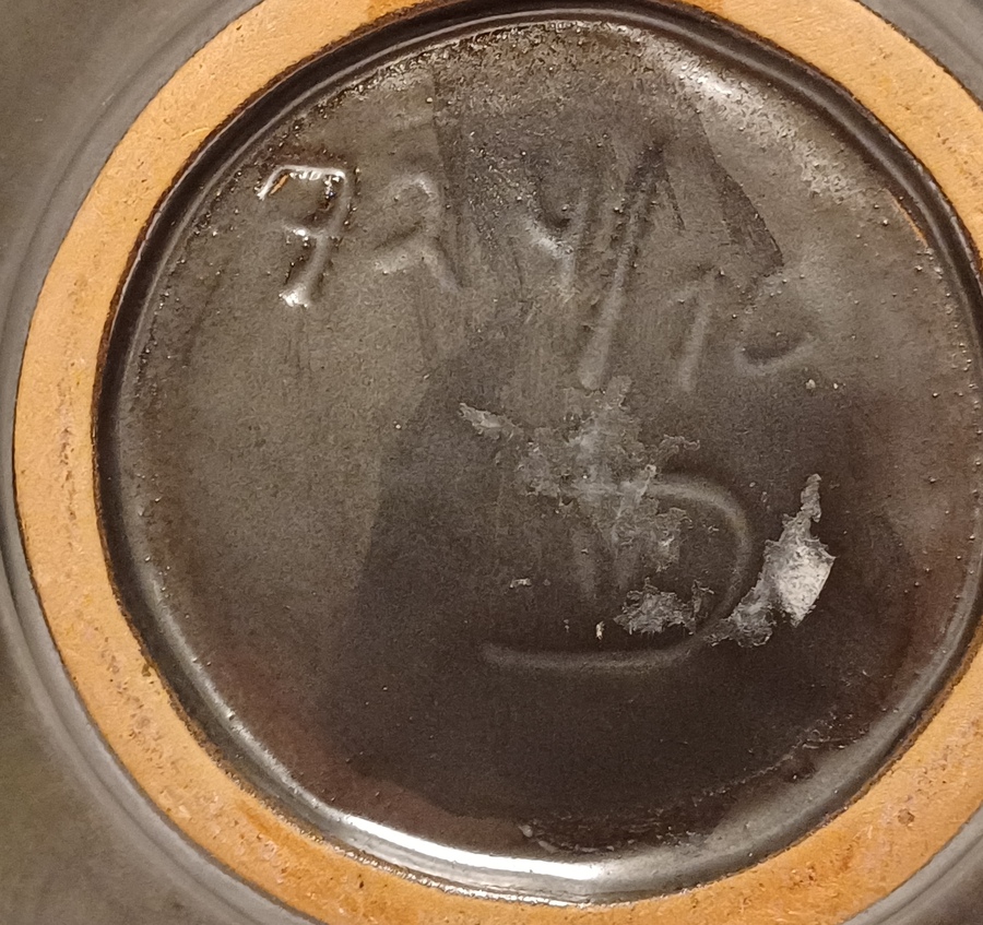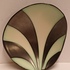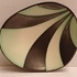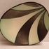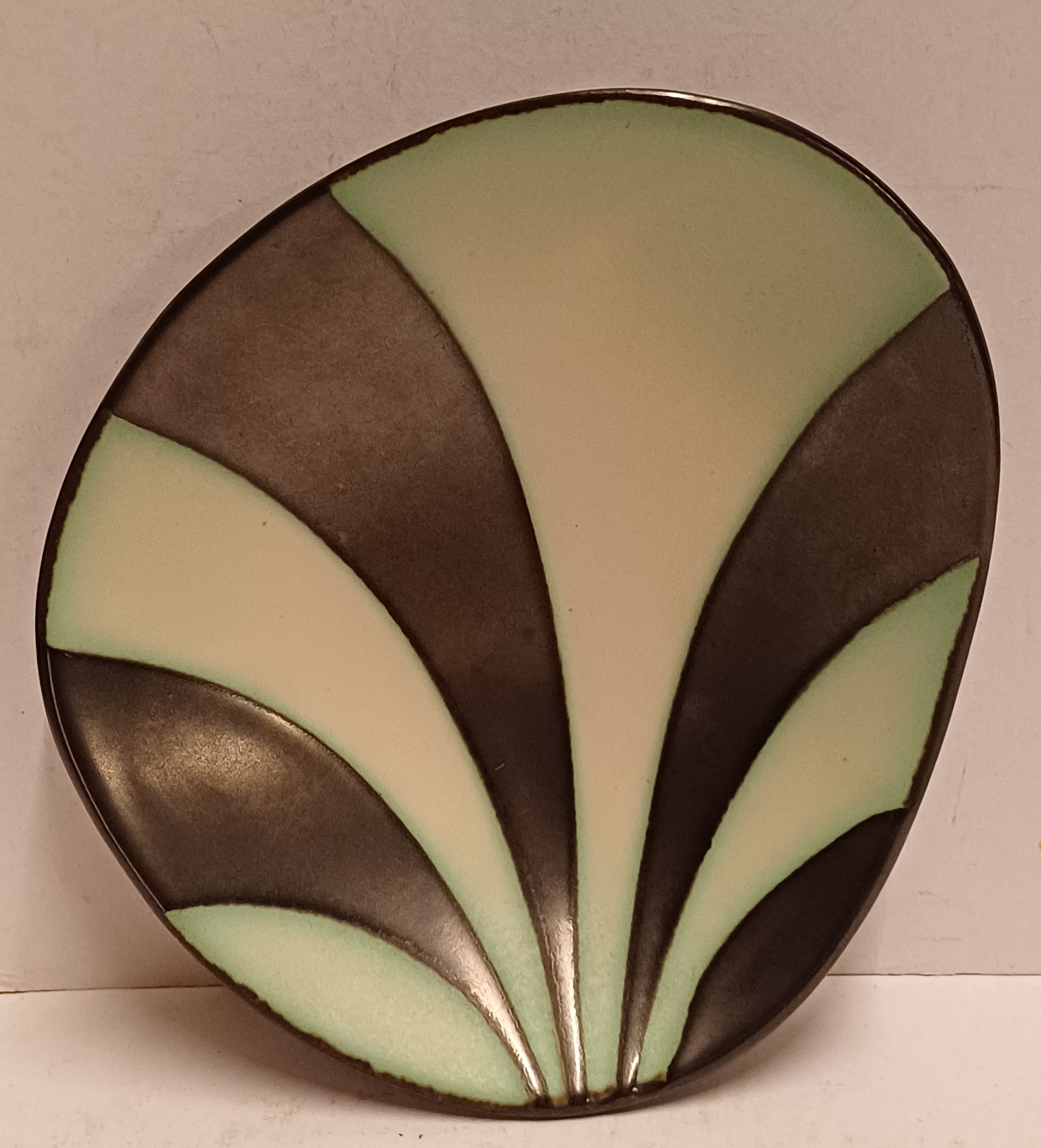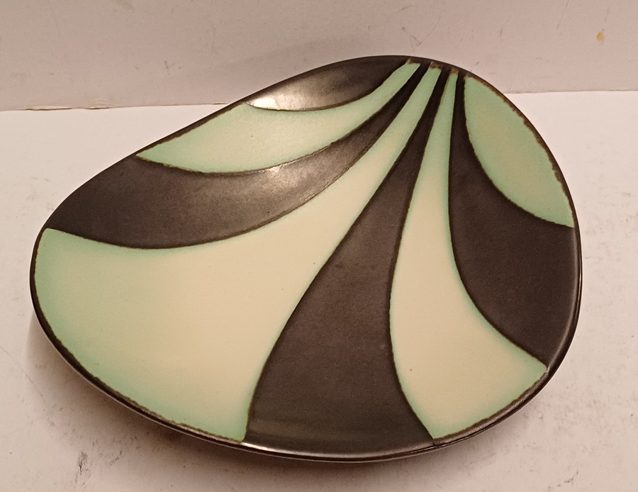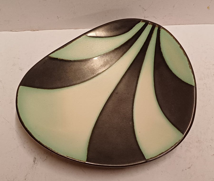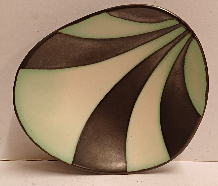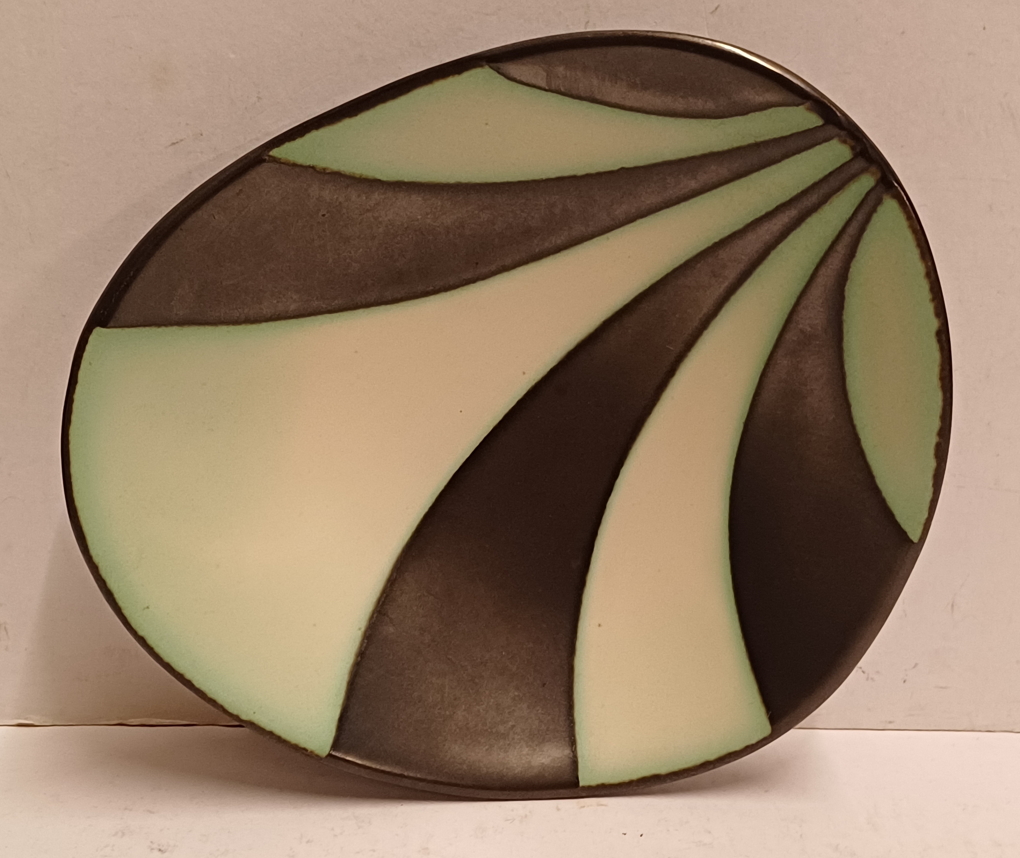 Aardewerken schaal met wit groene banen op zwarte ondergrond. Onderzijde gemerkt met monogram en modelnummer.