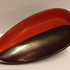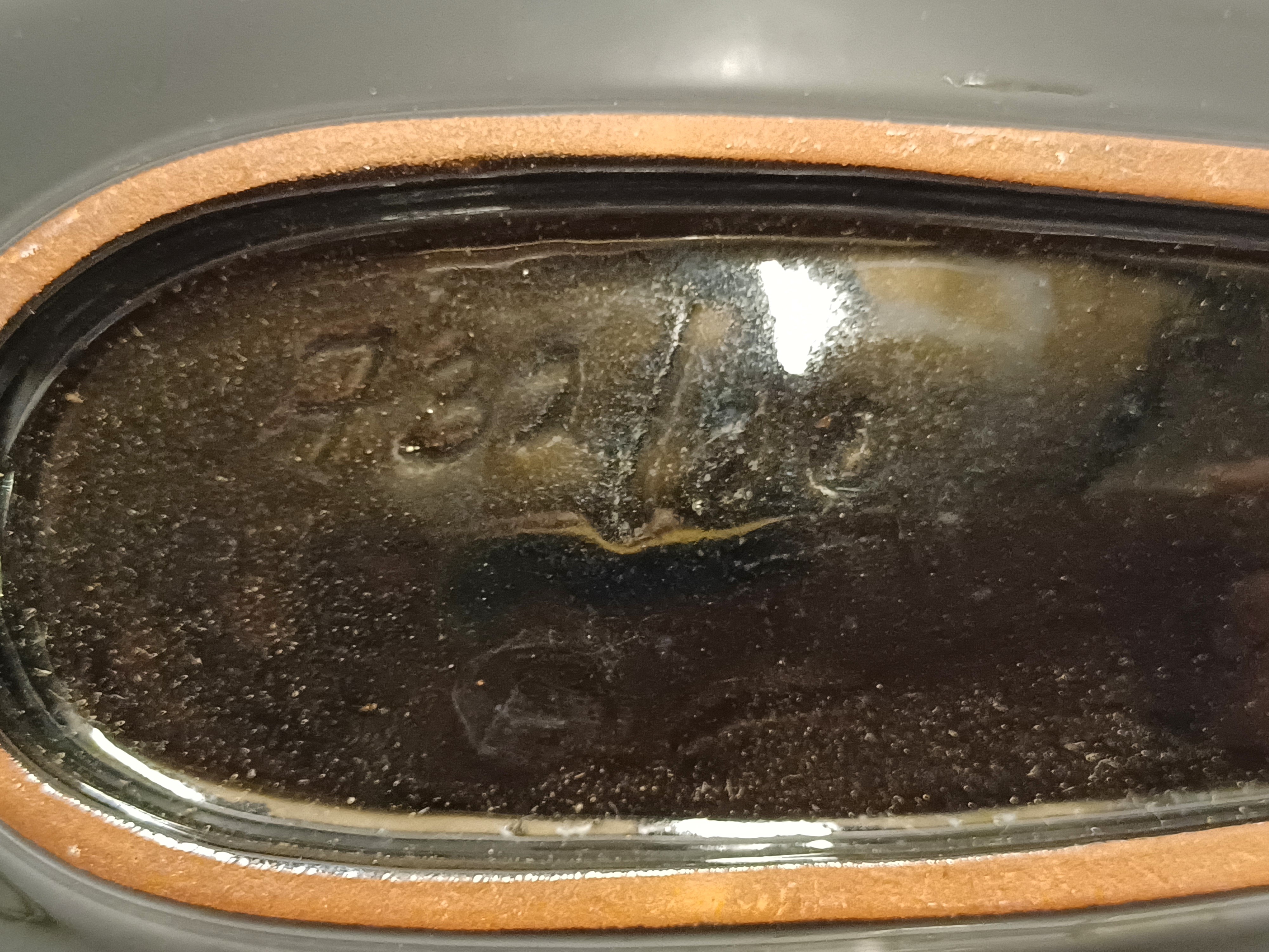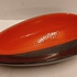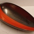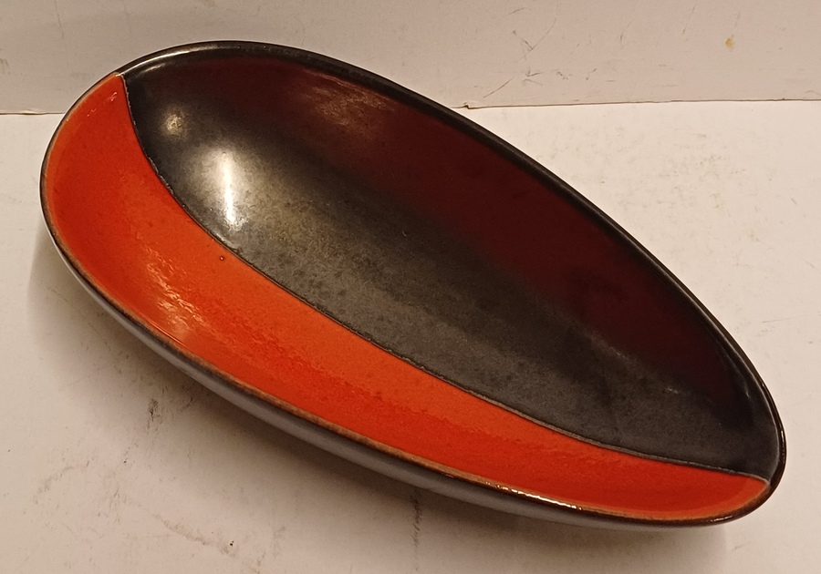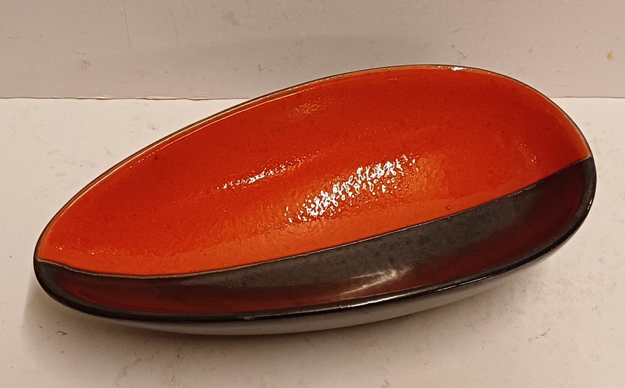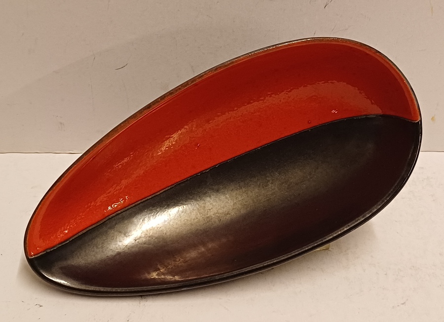 Gegoten aardewerken schaal met rode en zwarte glazuur. Onderzijde met signatuur en modelnummer.