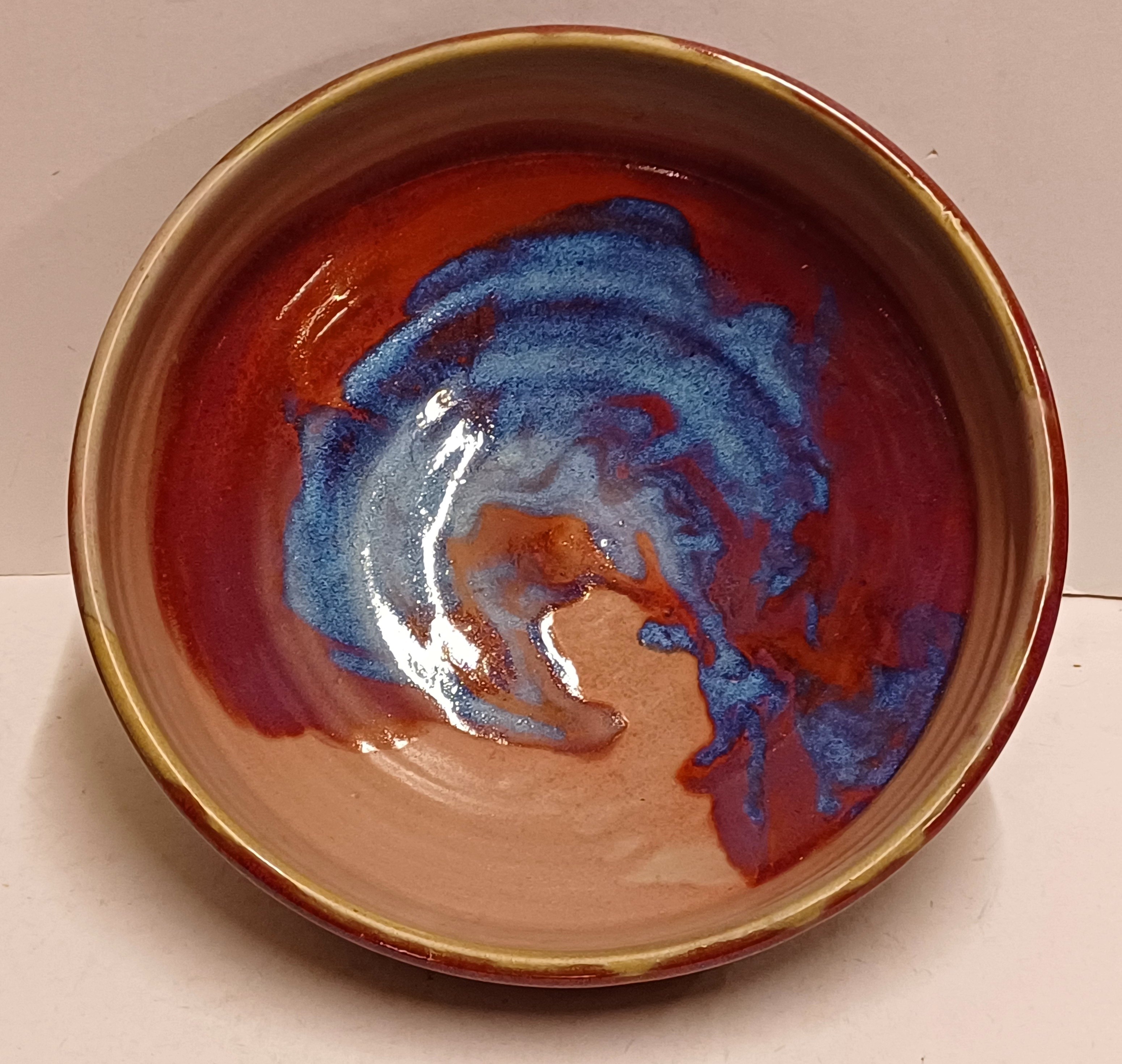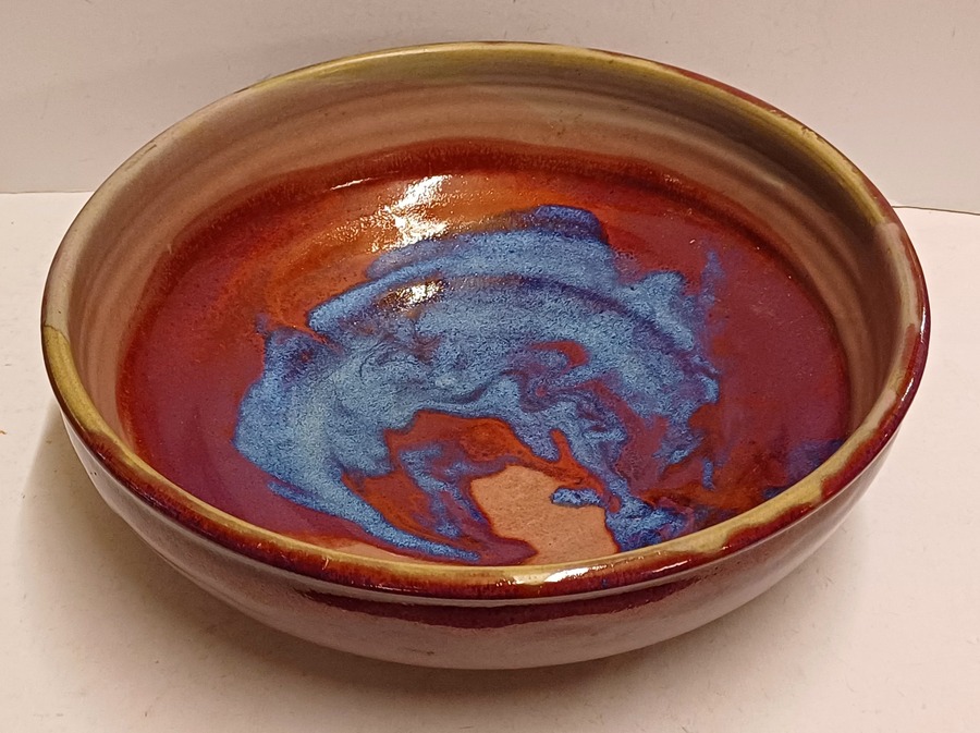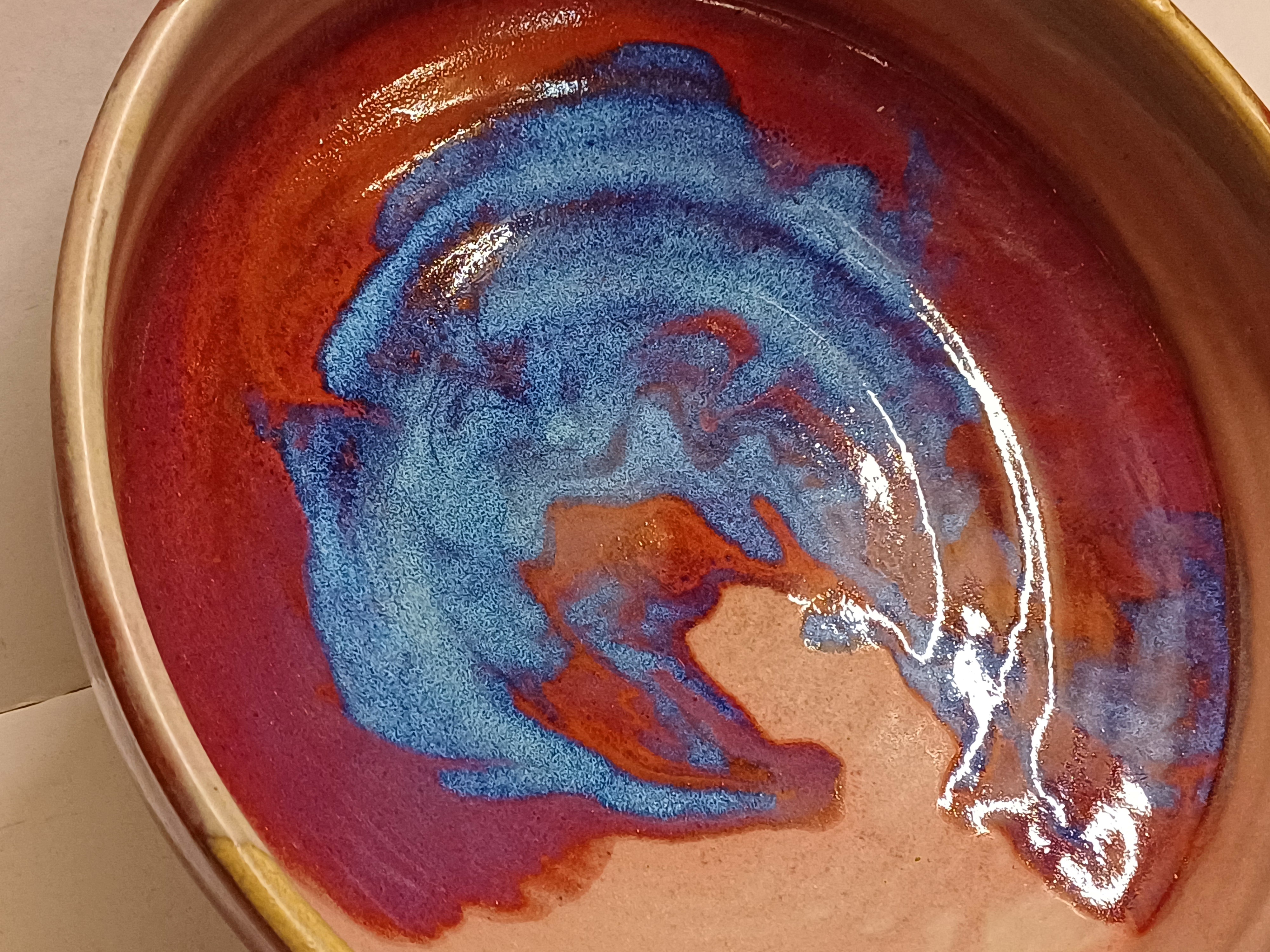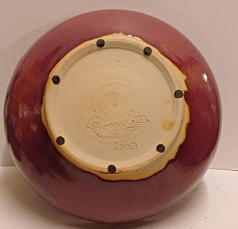 Steengoed schaal met paarse rode Sang de Bouef glazuur met blauwe splash. Onderzijde voluit gesigneerd en gedateerd 2008.