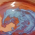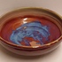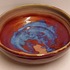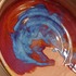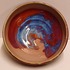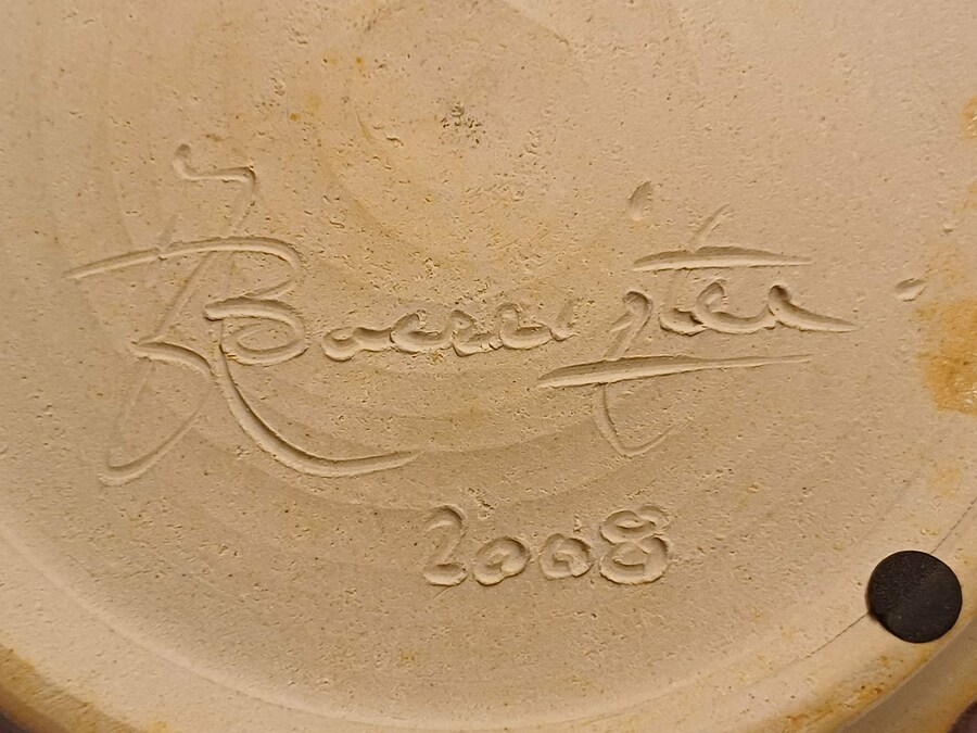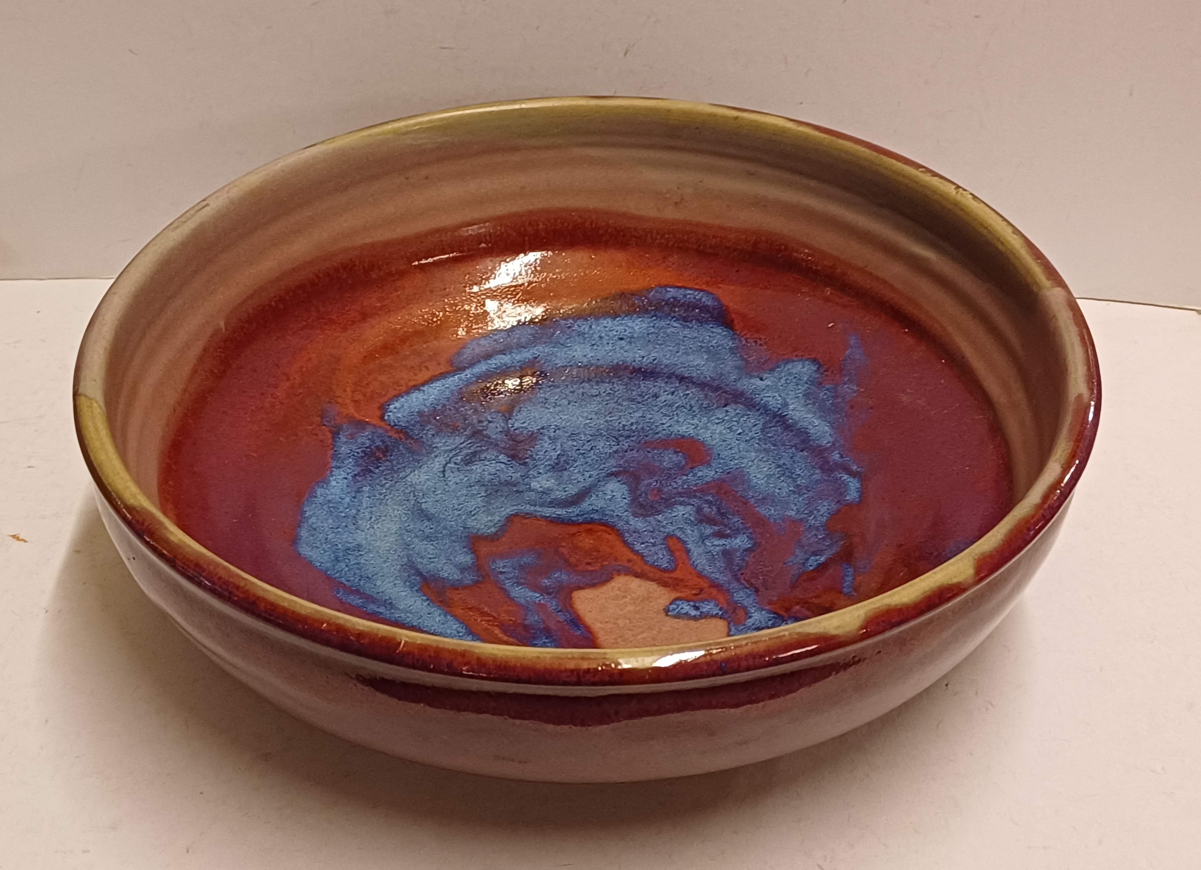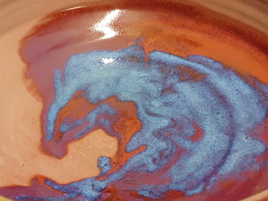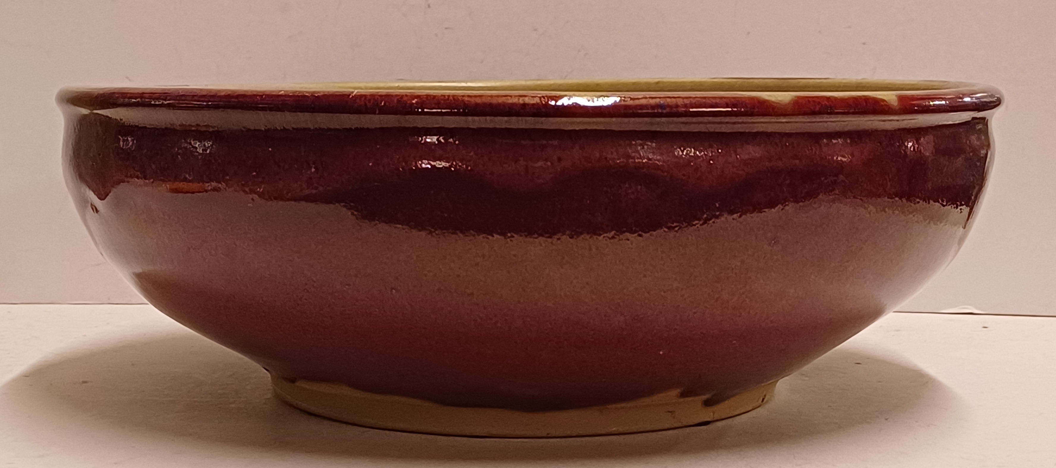 Steengoed schaal met paarse rode Sang de Bouef glazuur met blauwe splash. Onderzijde voluit gesigneerd en gedateerd 2008.