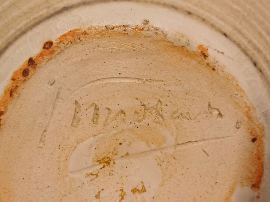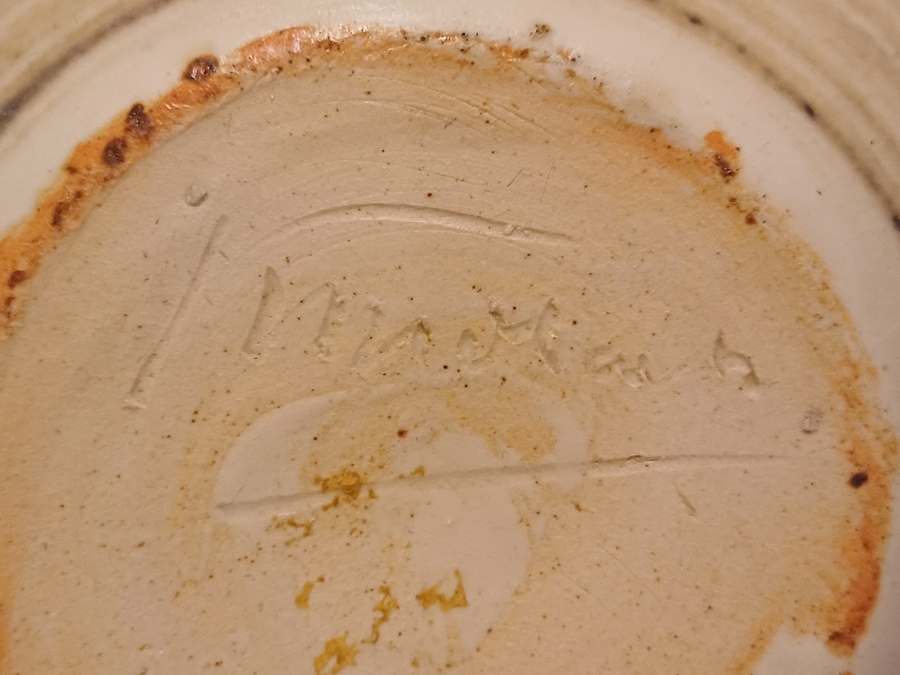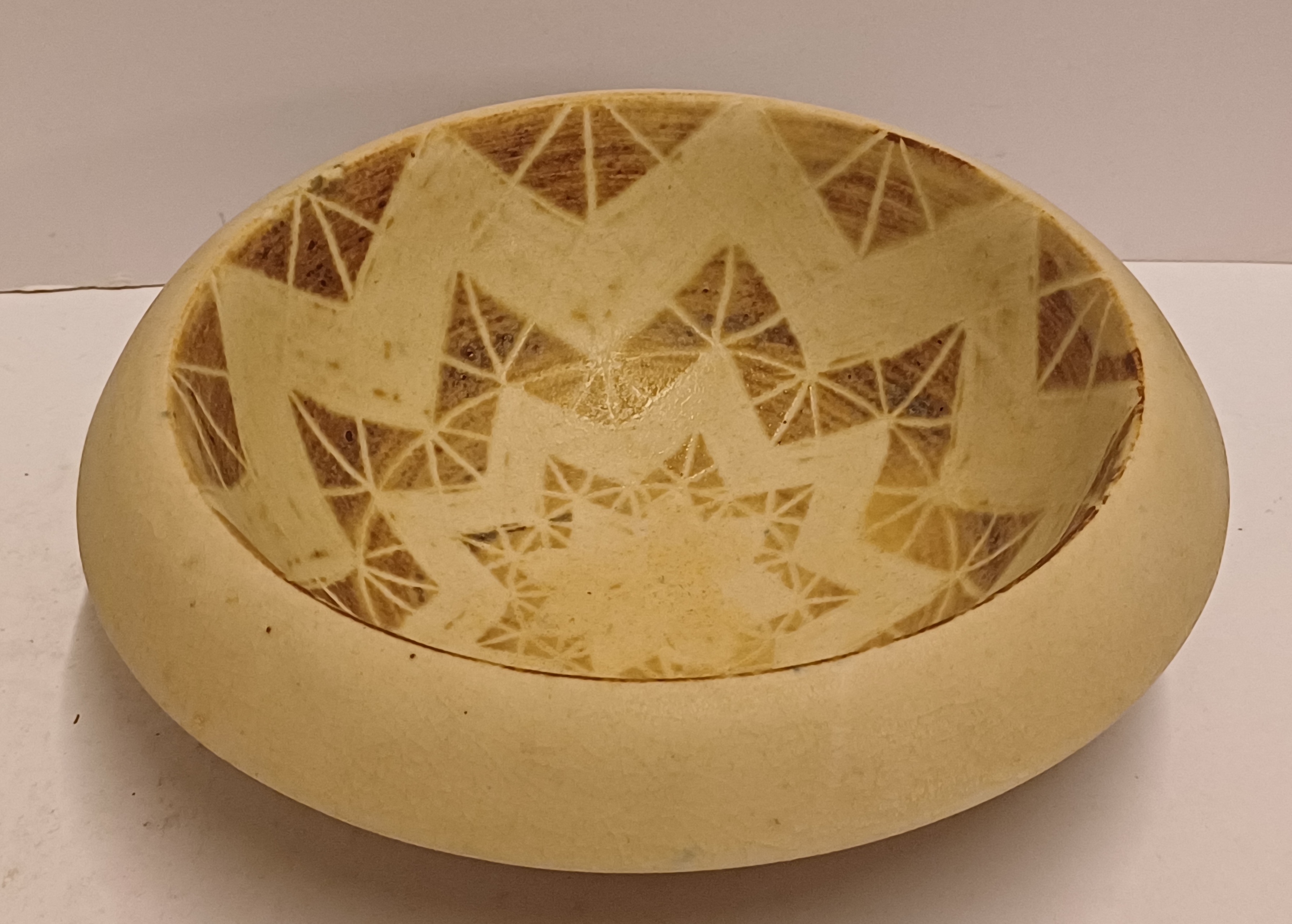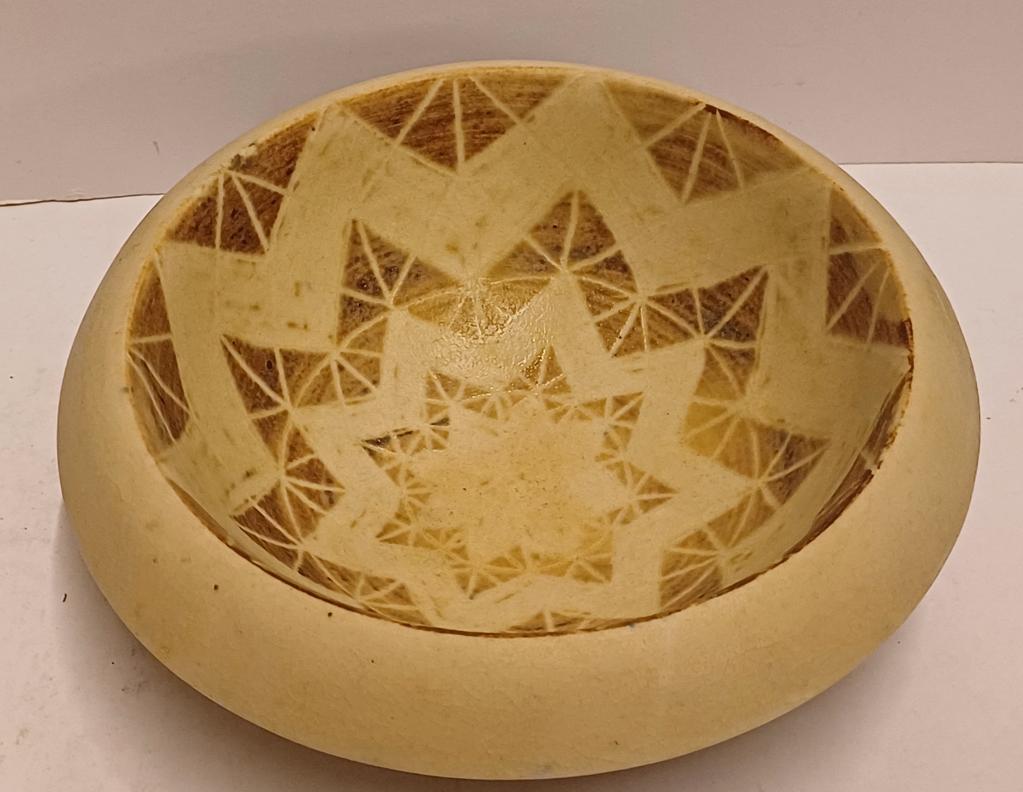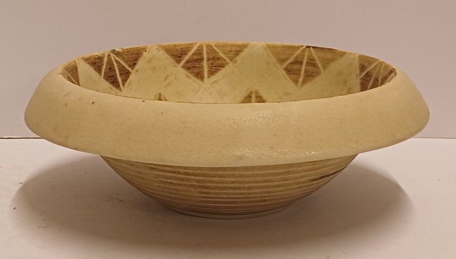 Ciotola smaltata in crema con motivo geometrico. Parte inferiore con firma.