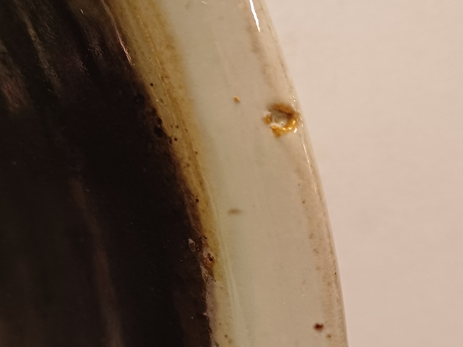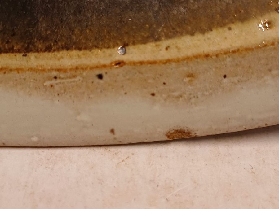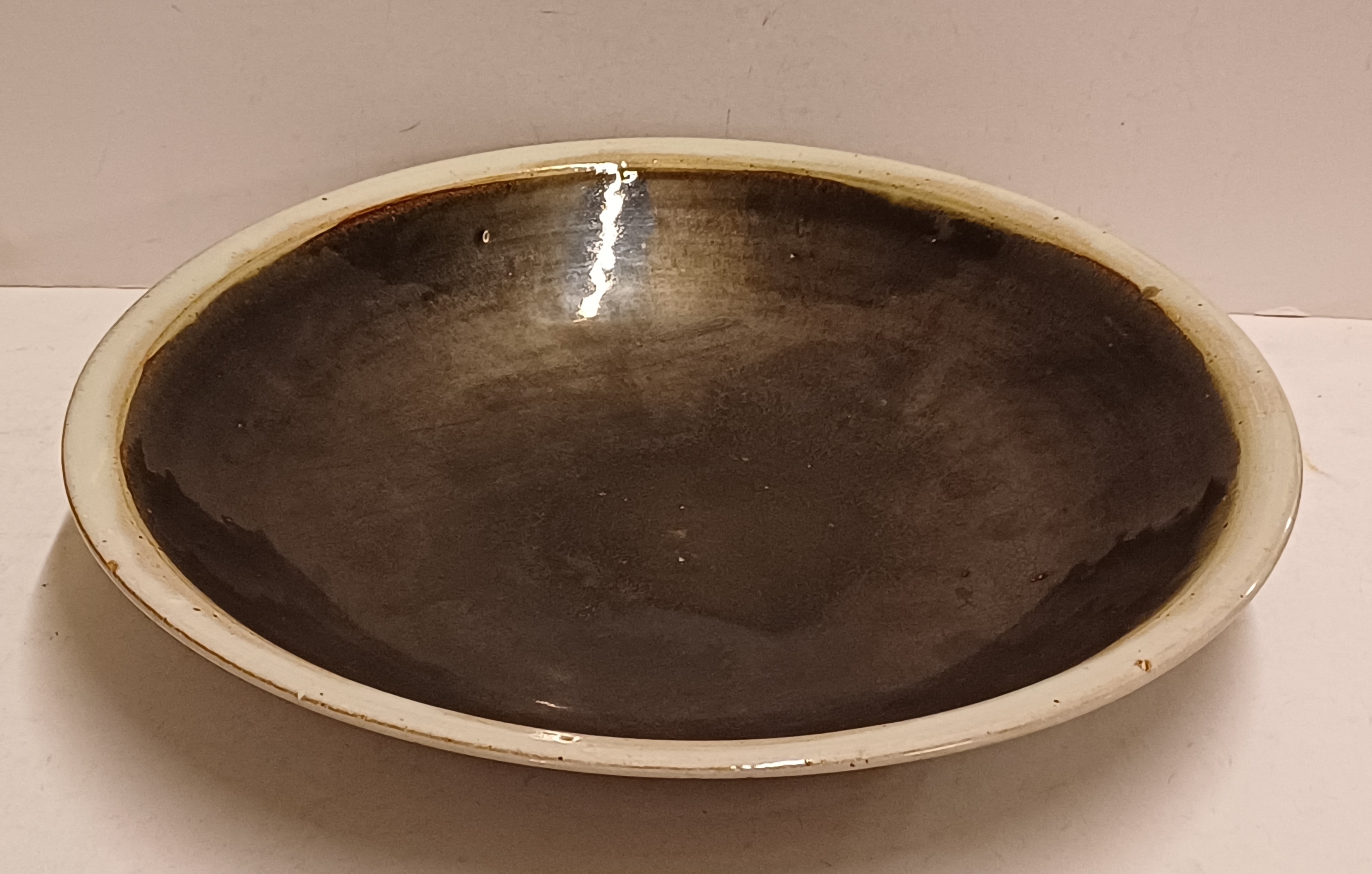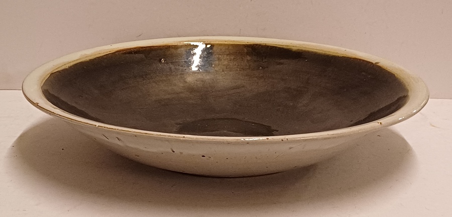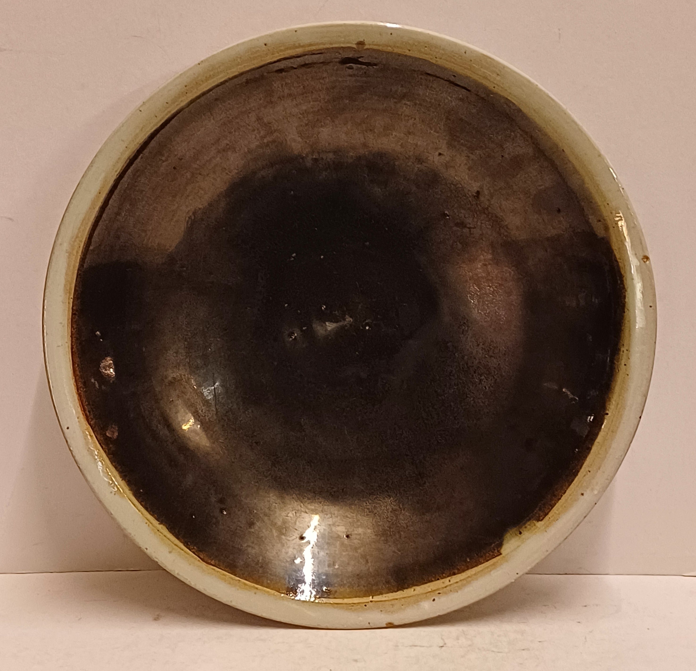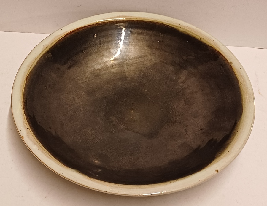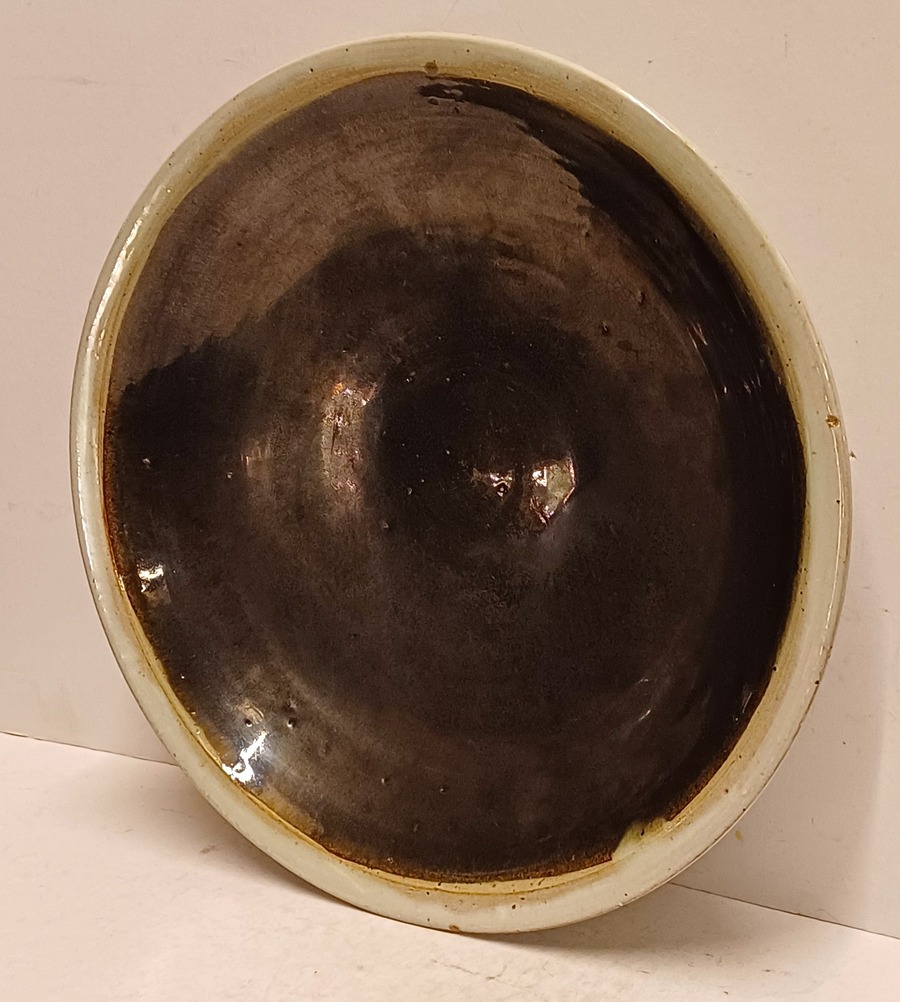 Perfect gedraaide aardewerken schaal met zwarte metallic glazuur en grijze rand, de onderzijde met volledig grijze glazuur. Uitvoering Potterie Het Kruikje Putten, gemerkt met logo en made in Holland.