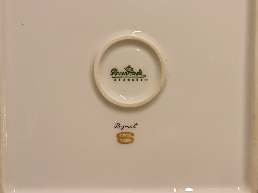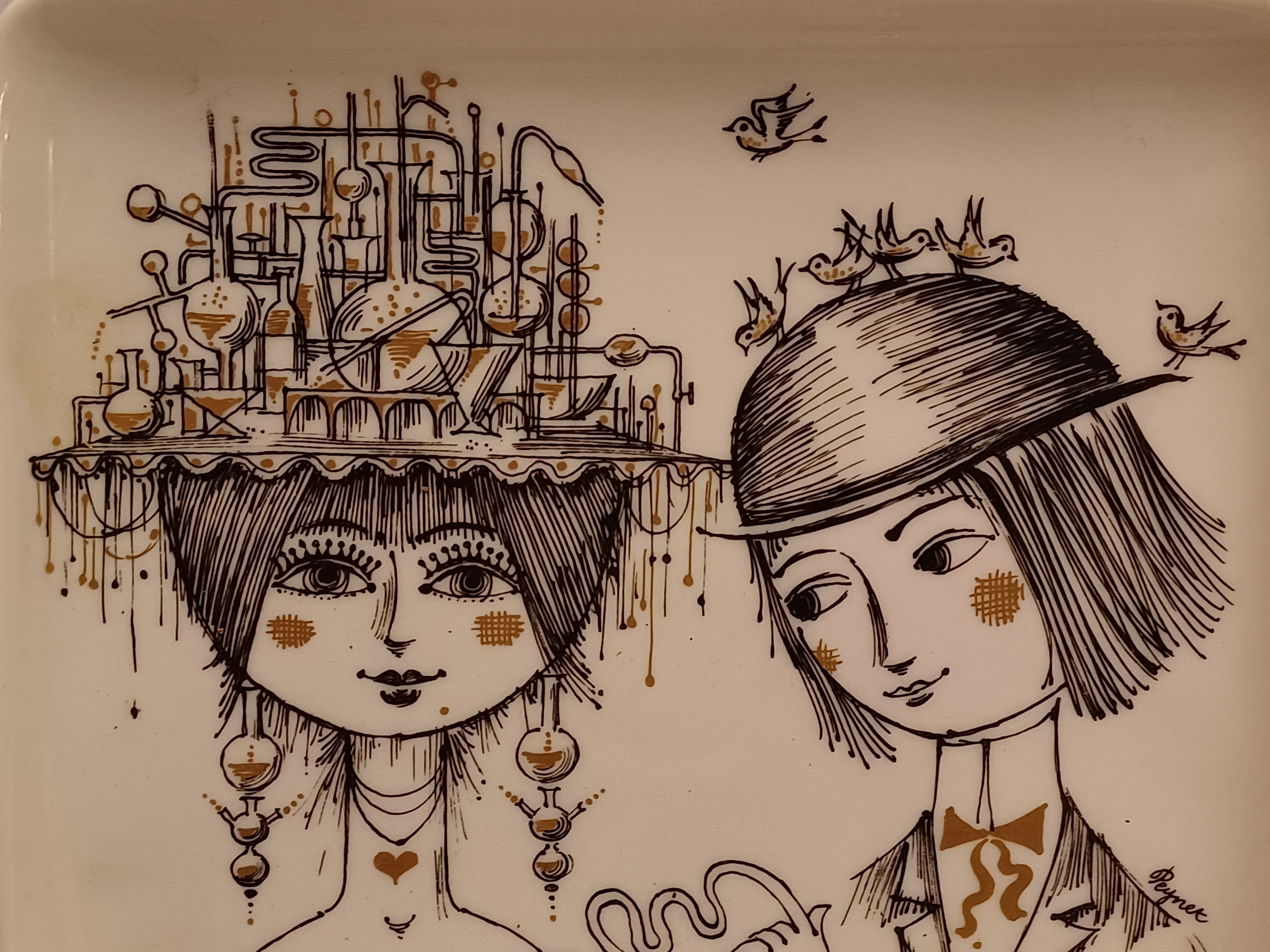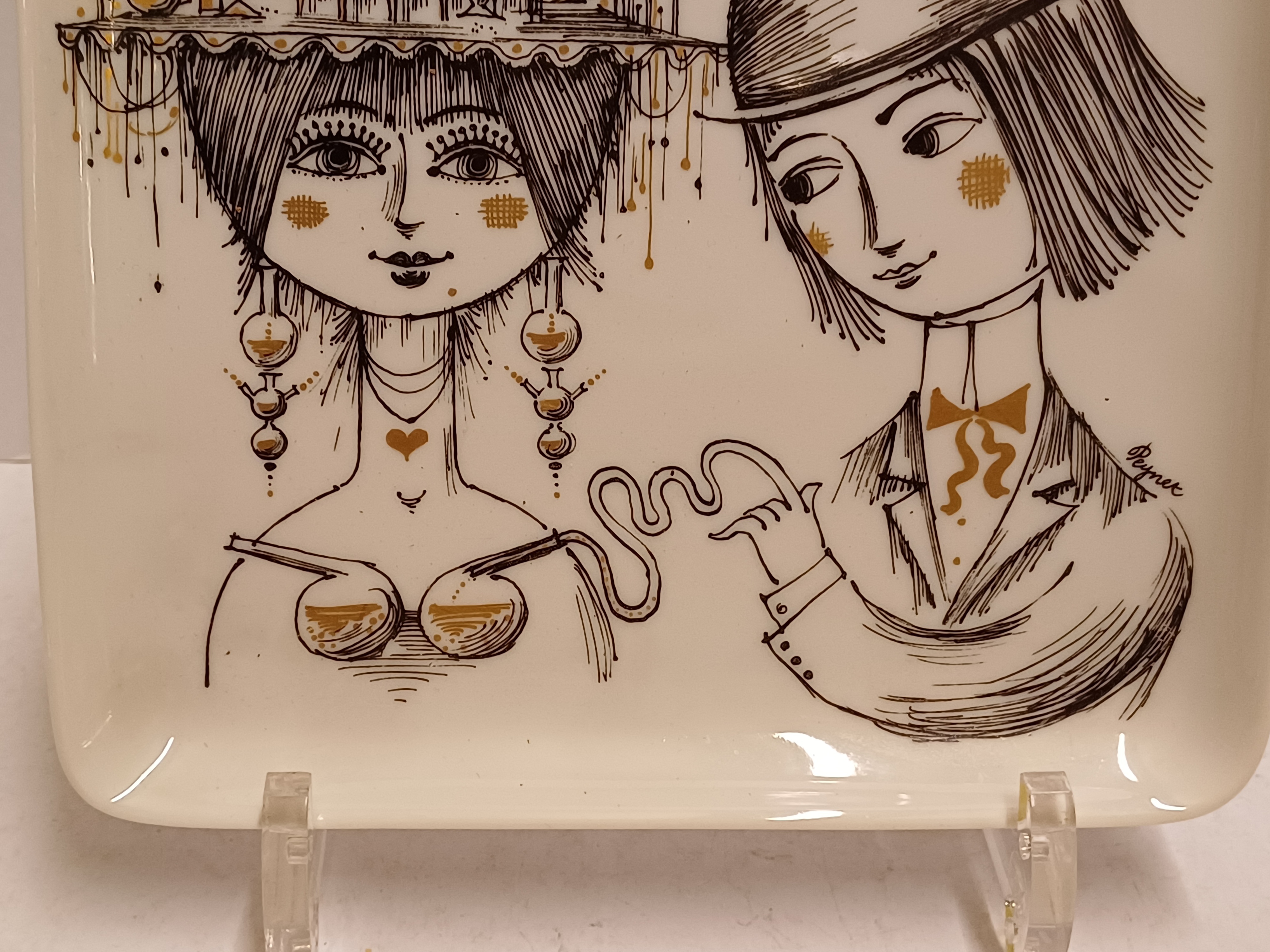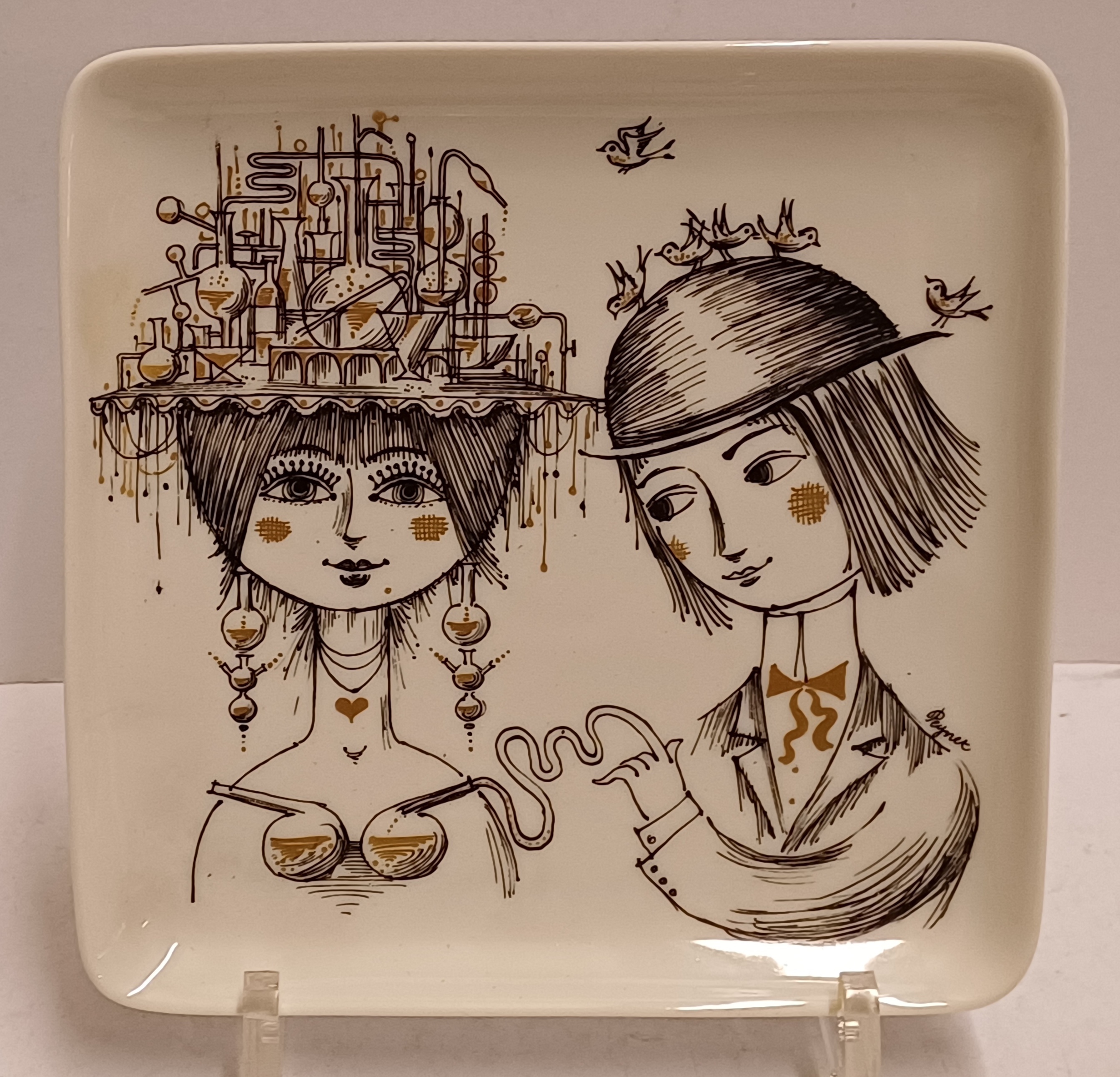 Piatto quadrato con decorazione nera di un uomo e una donna con accenti dorati. Sul retro marchio della fabbrica e marchio Studio Line.