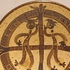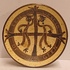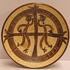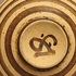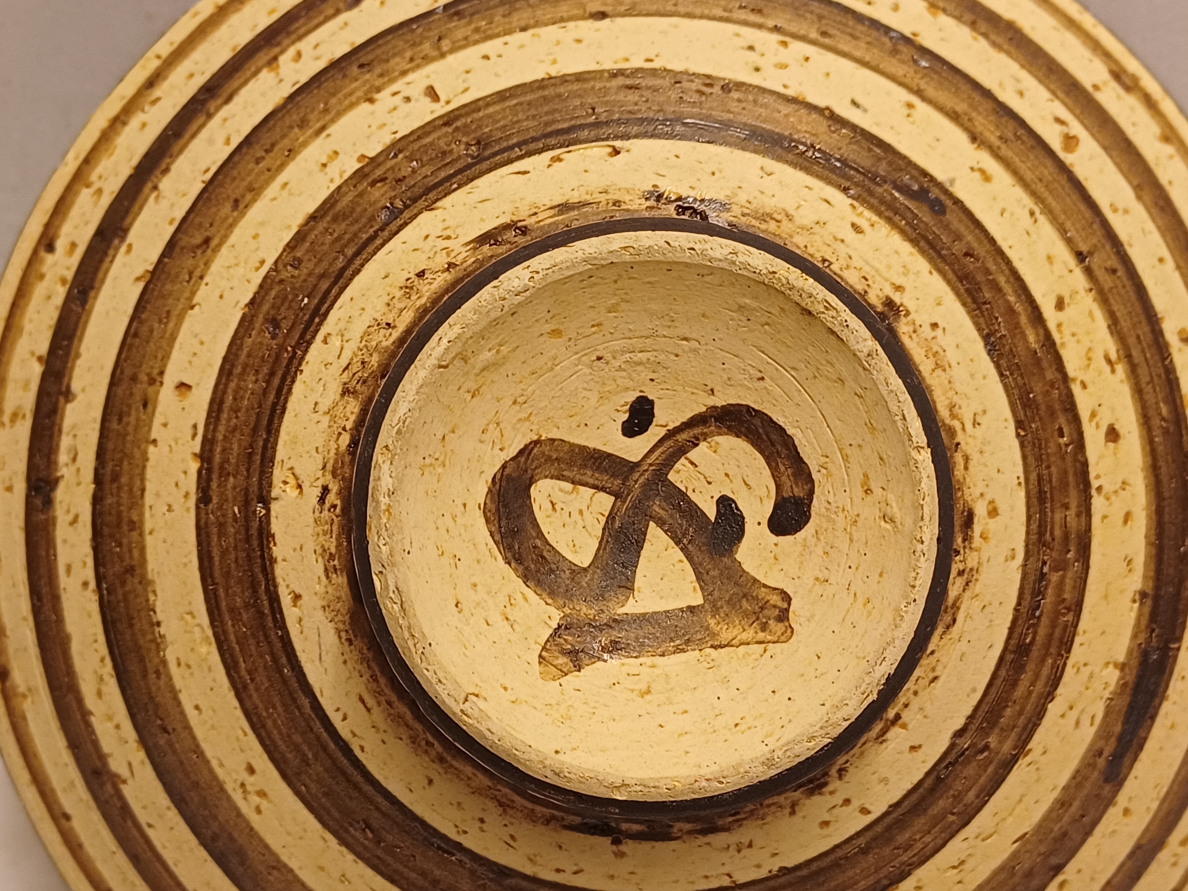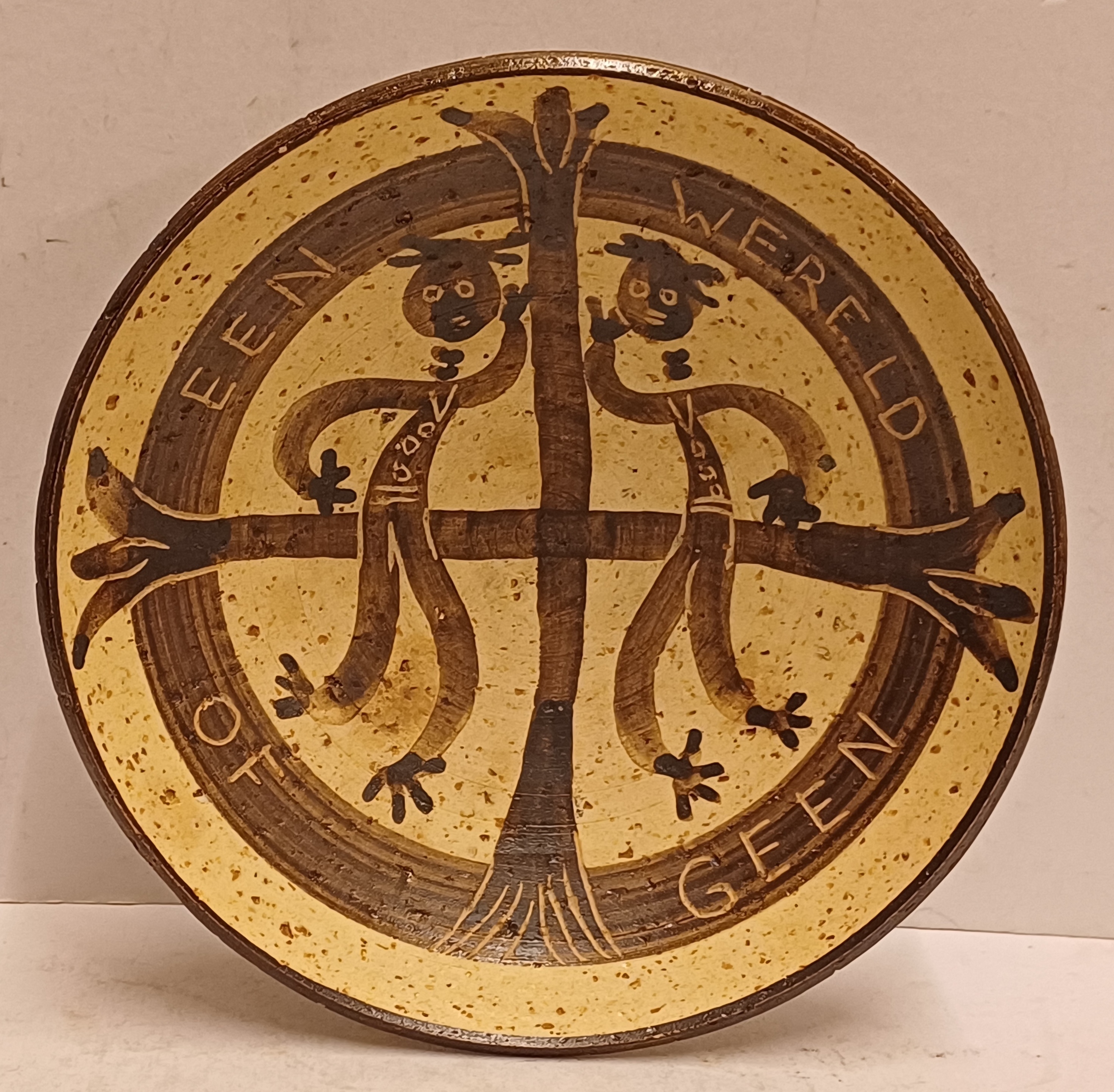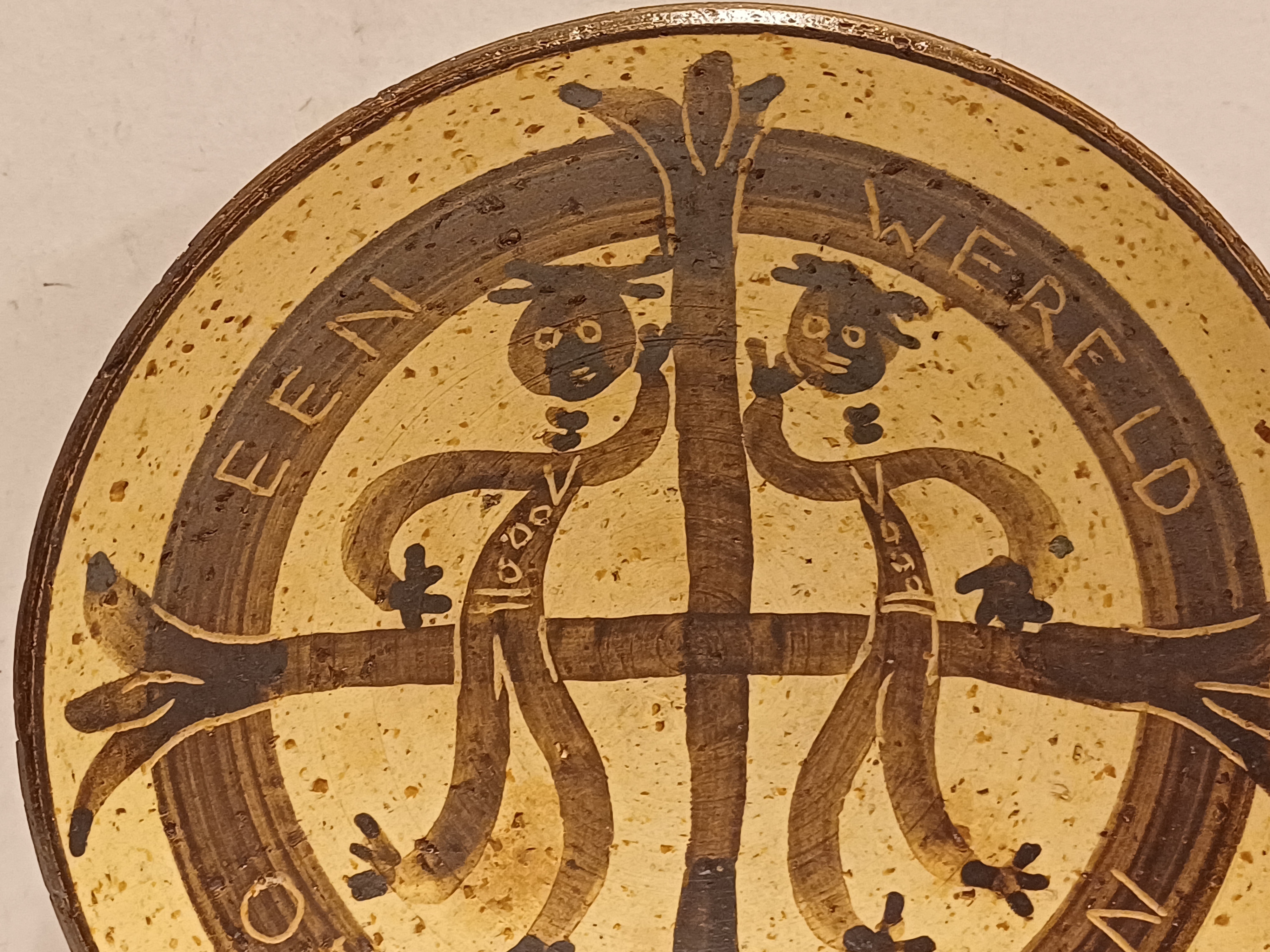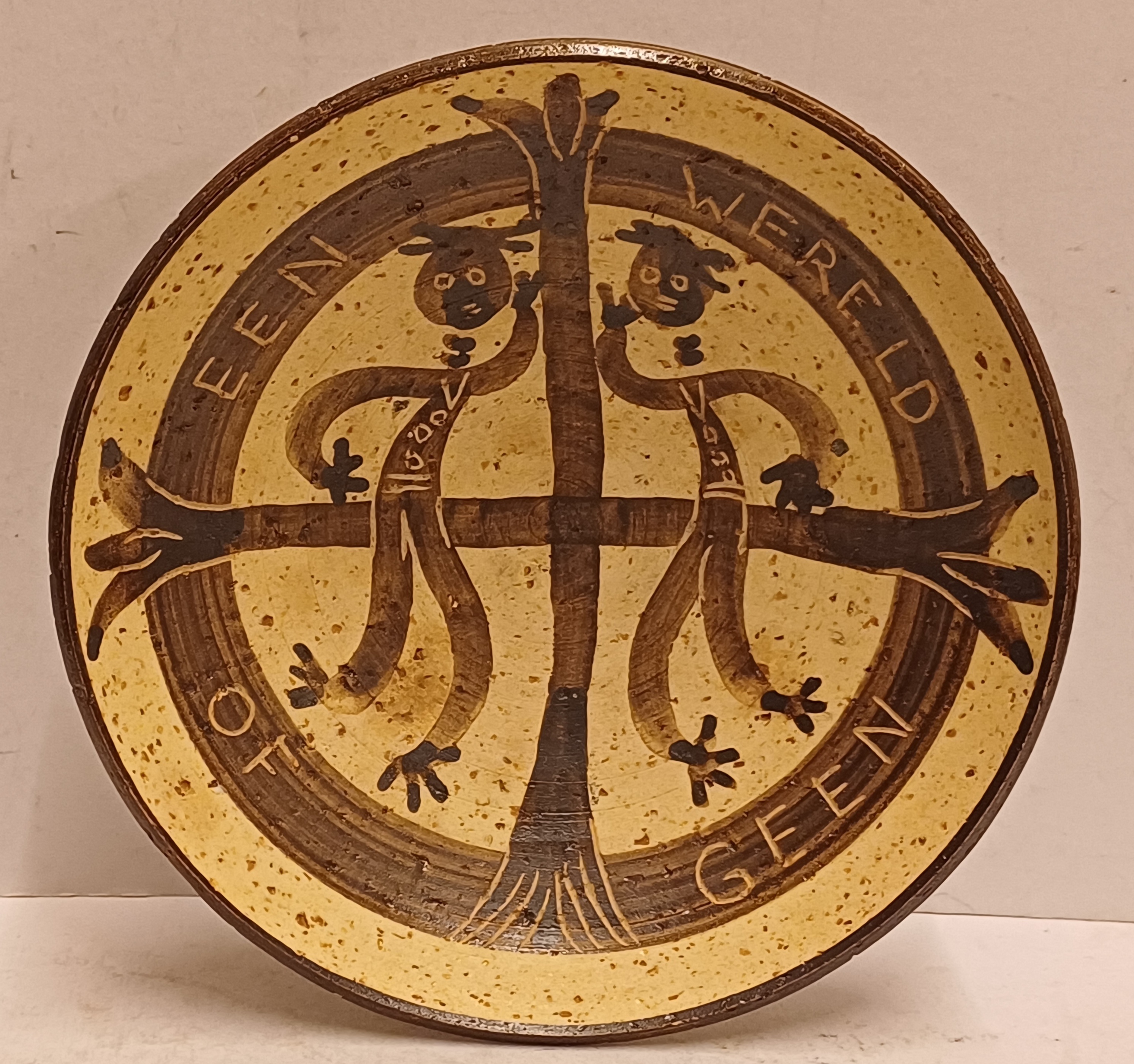 Aardewerken schaaltje met berkenbast decor en gedecoreerd met 2 figuren en de tekst Een wereld of geen wereld. Onderzijde met monogram.