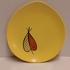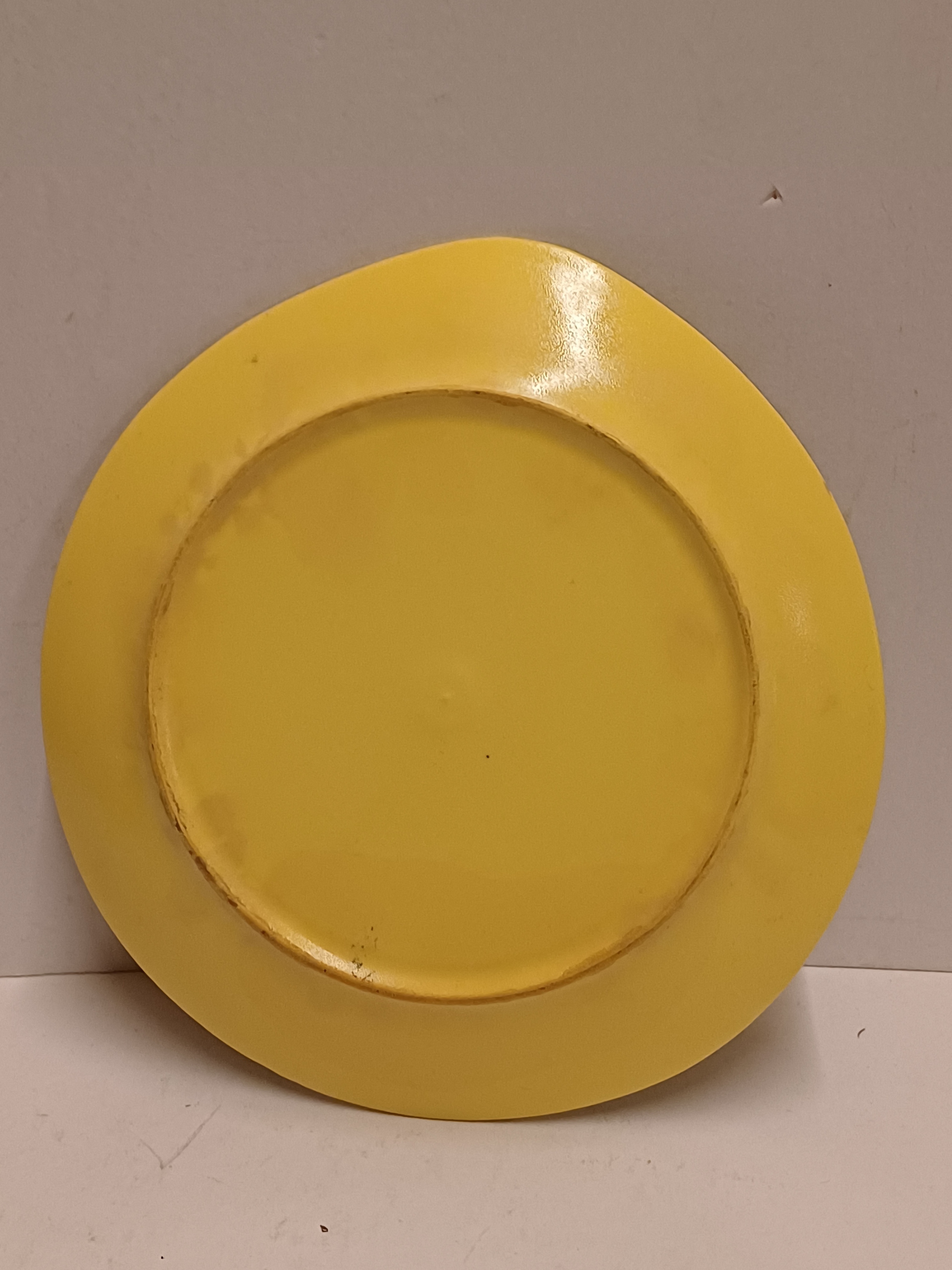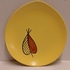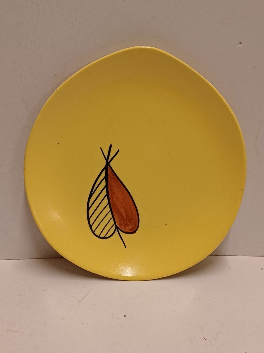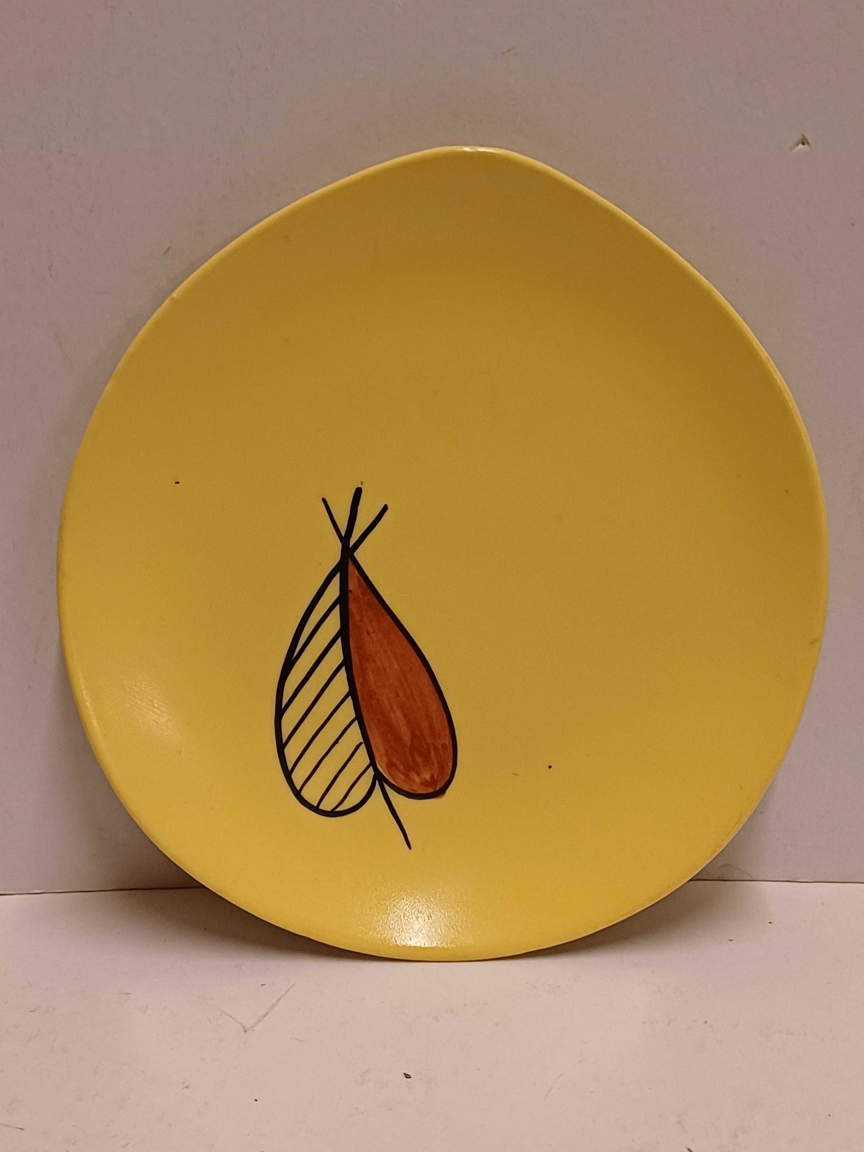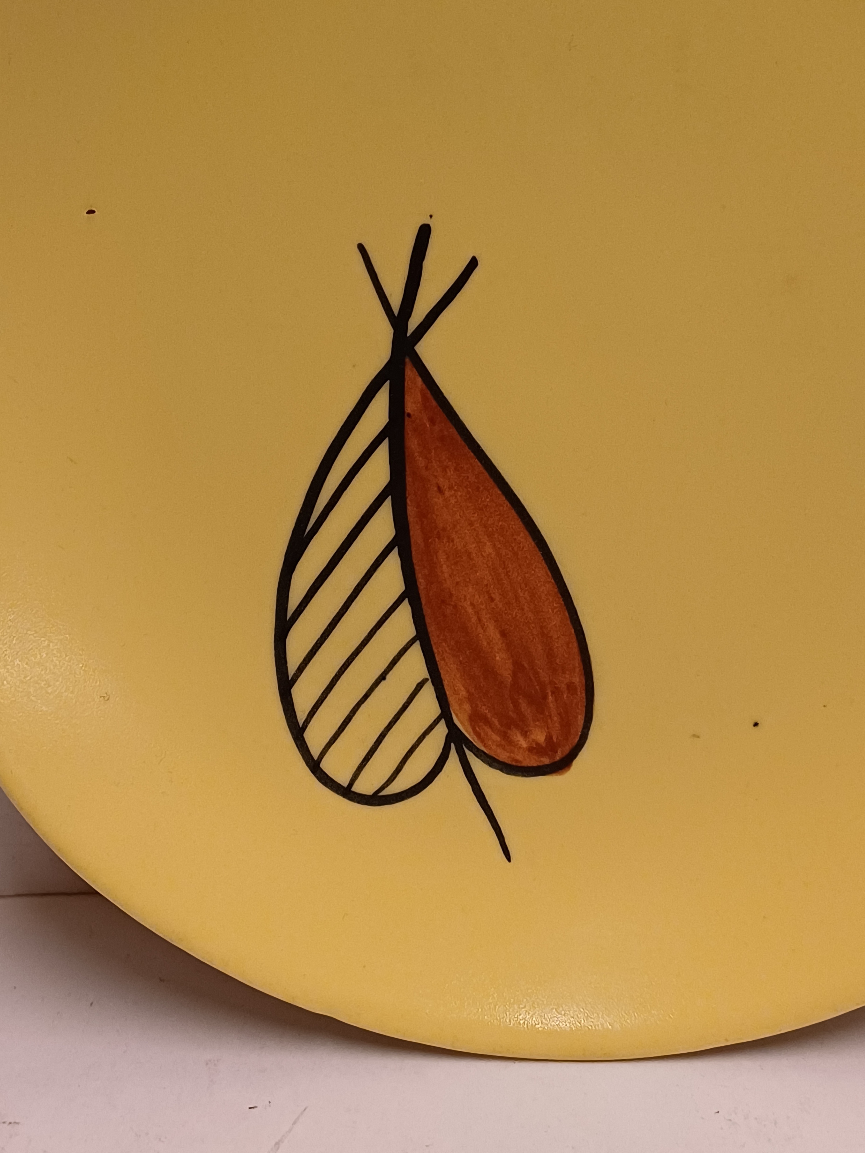 Scaletta in terracotta a forma di goccia con decoro a foglie su sfondo giallo. Non firmata.