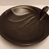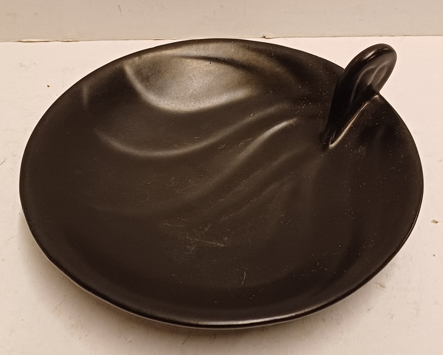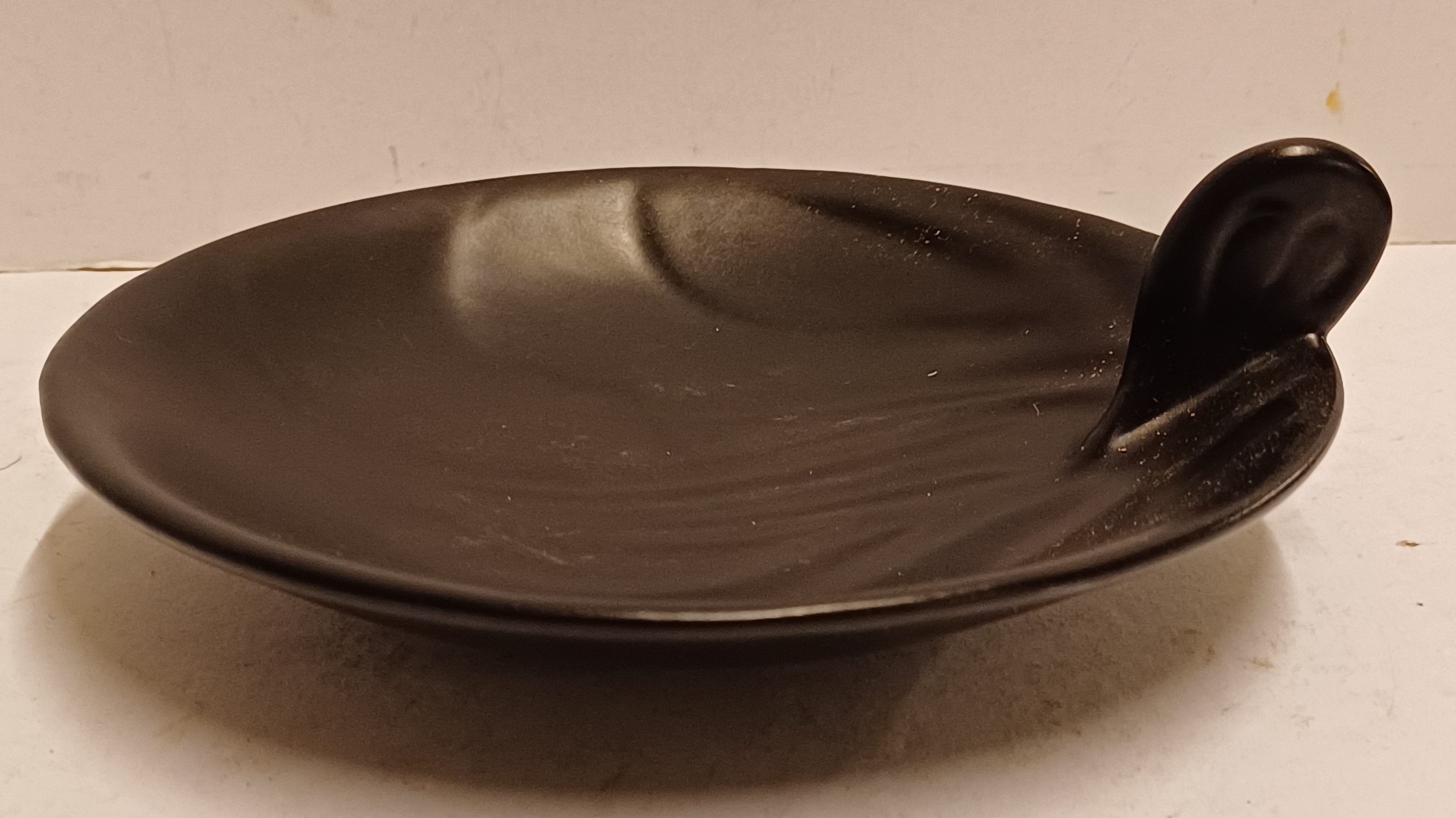 Piatto in ceramica nera con decoro irregolare e maniglia stilizzata. Design di Willem Stuurman, firmato sul fondo.