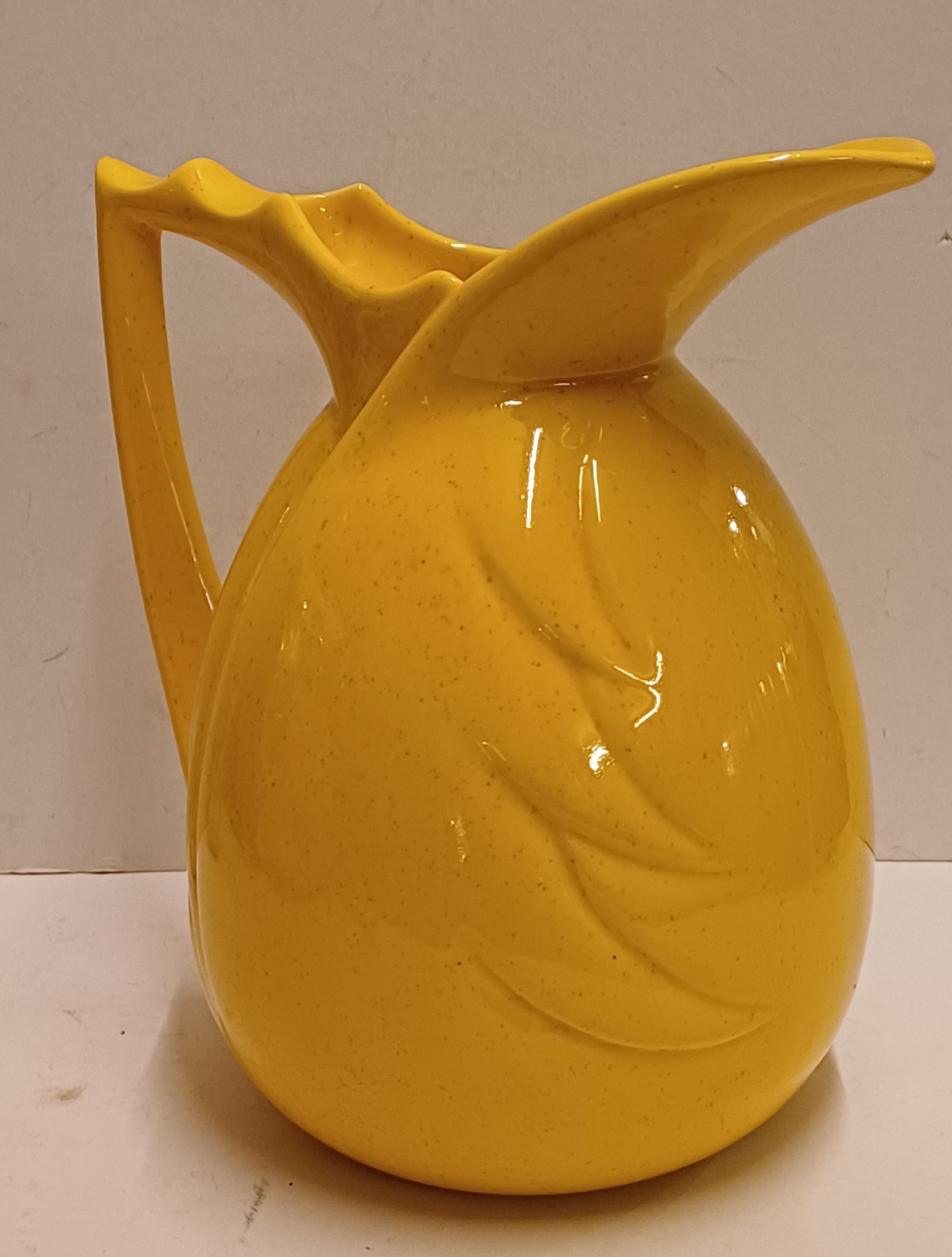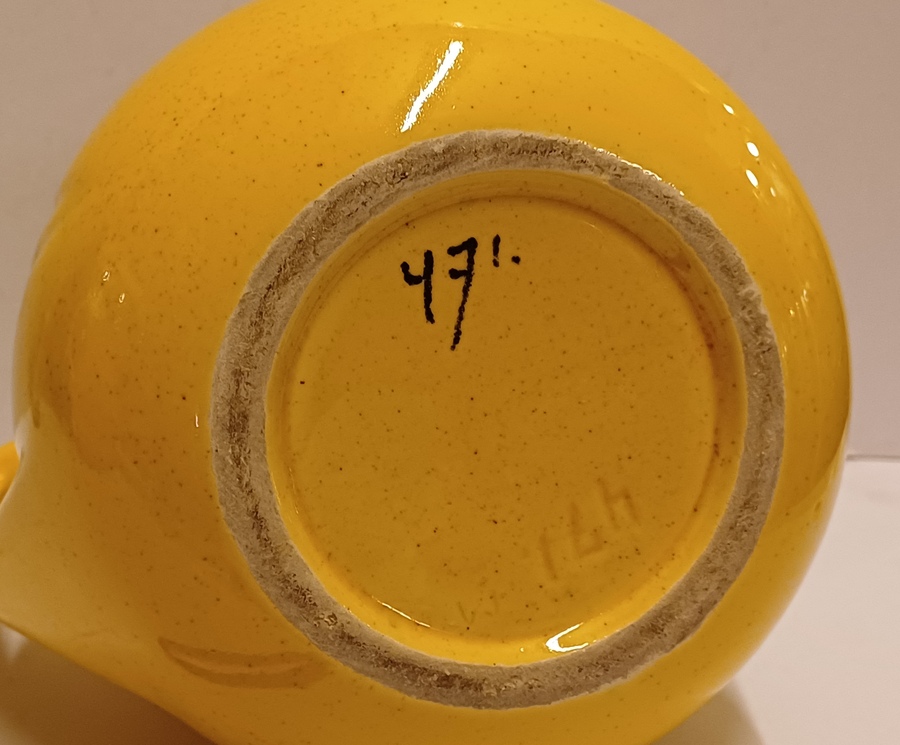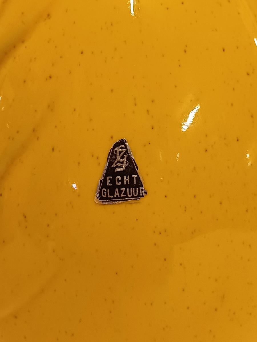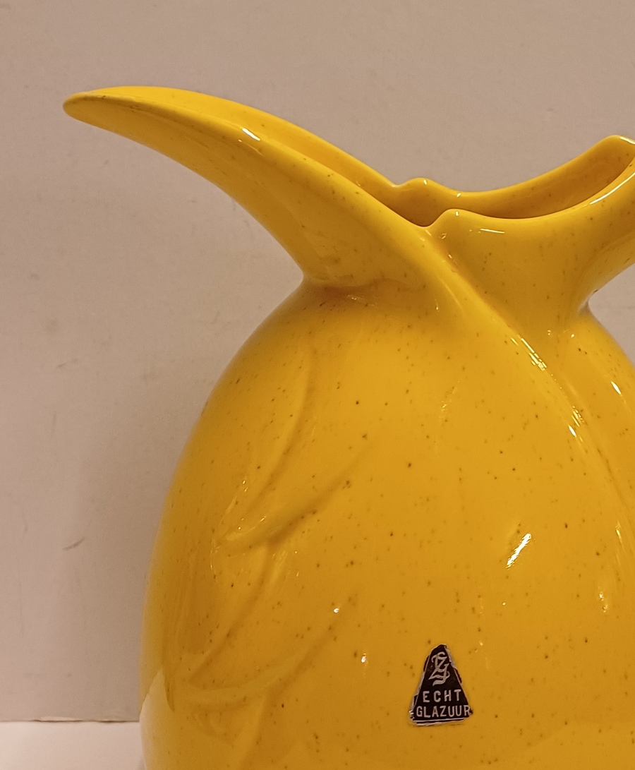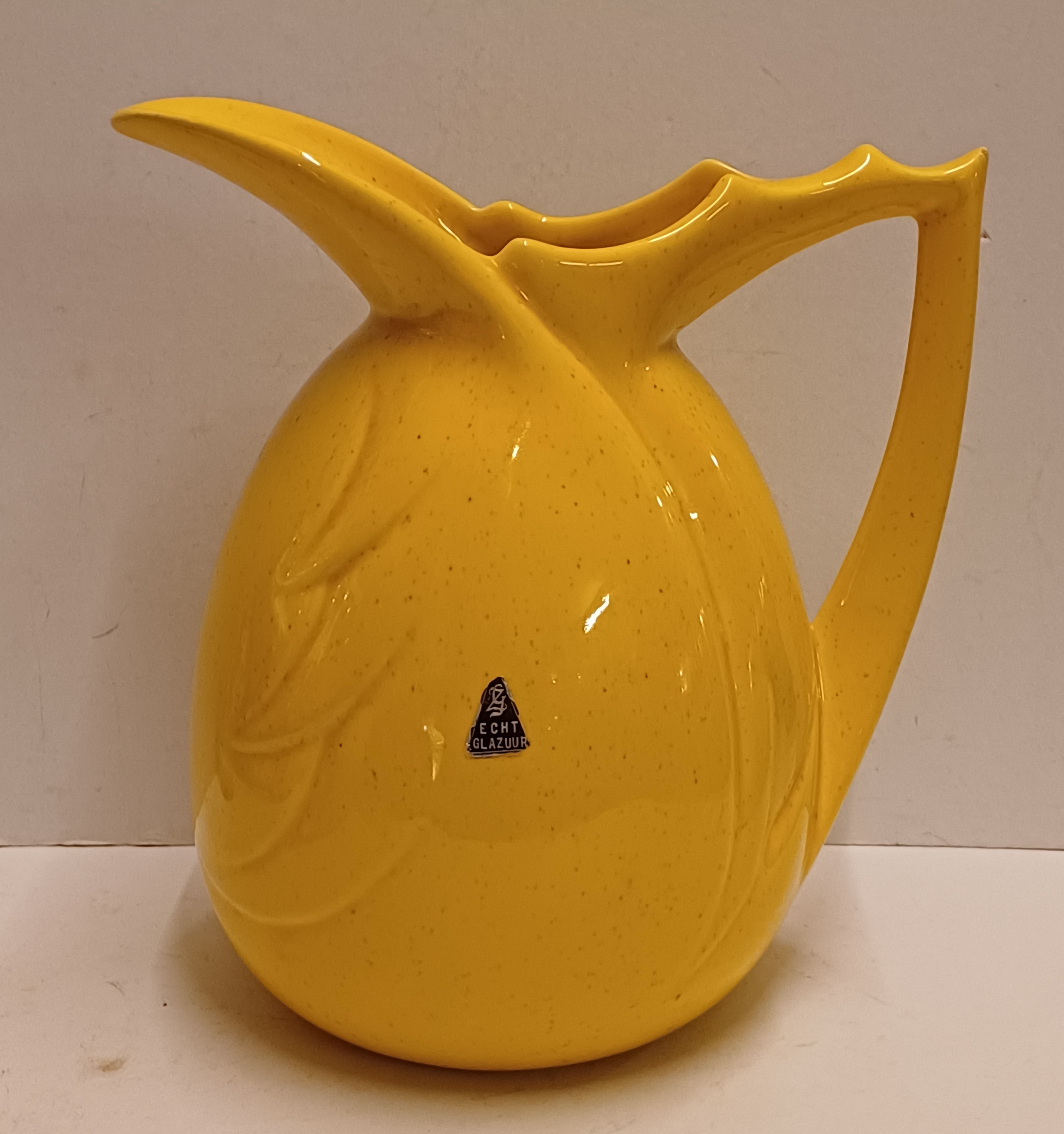 Aardewerken kan met grillige decoratie, ontwerp Willem Stuurman.Onderzijde met modelnummer en sticker Echt Glazuur.