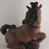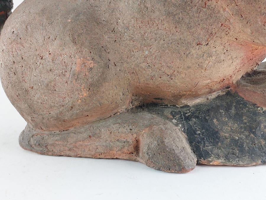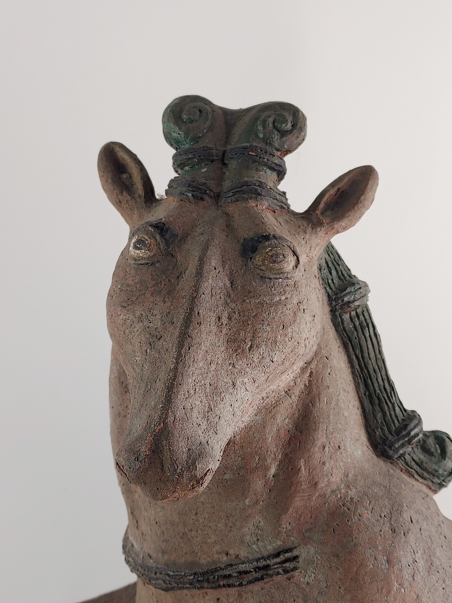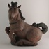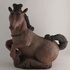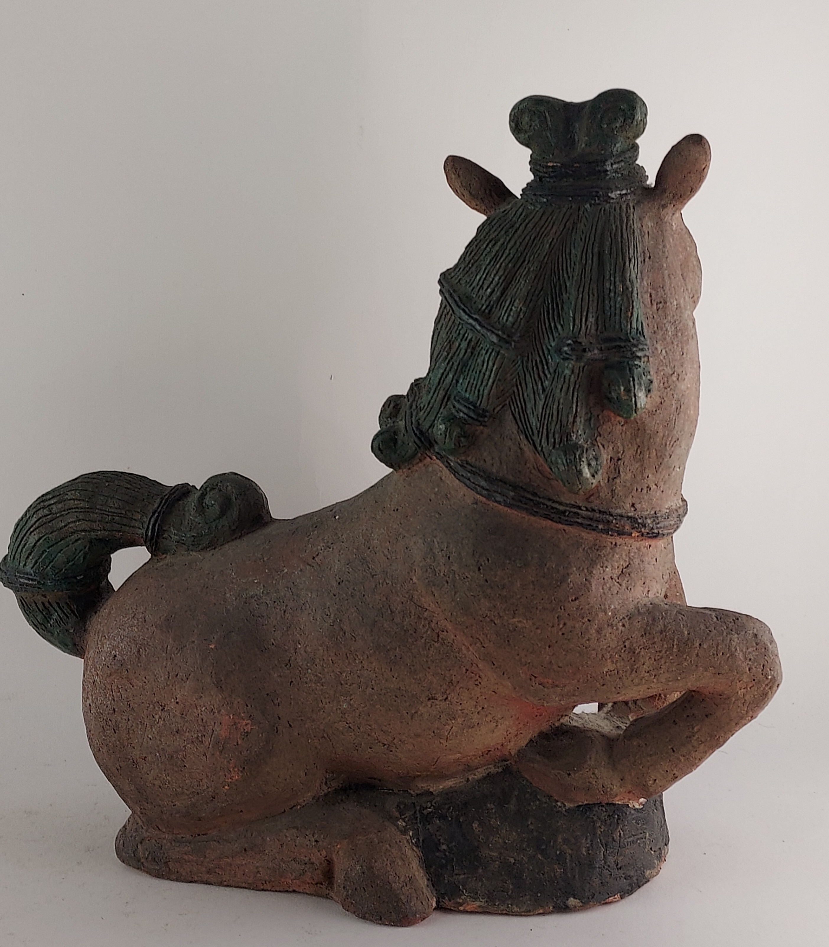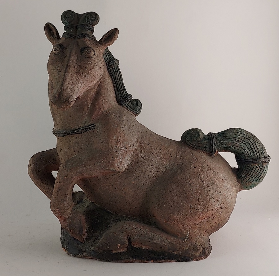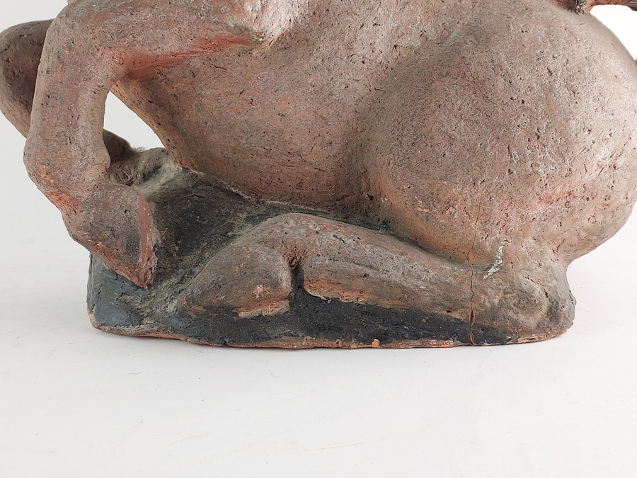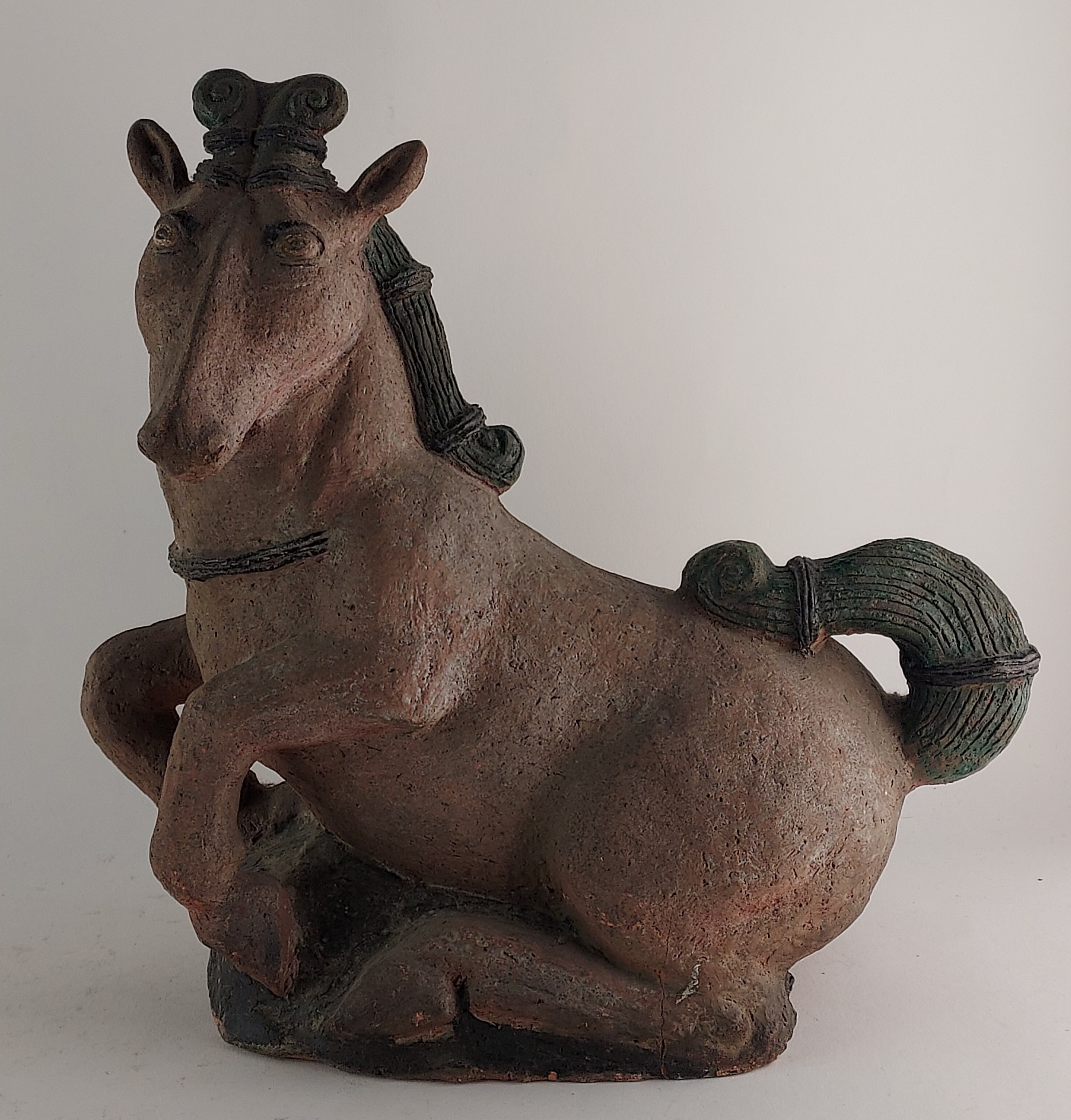 Scultura ceramica modellata a mano raffigurante un cavallo seduto. Non firmata, parte interna con vecchio etichetta cartacea con firma e annotazione "Te leen aan geboden Hr Krul 21/7 60". Realizzata nel proprio atelier a Wassenaar.