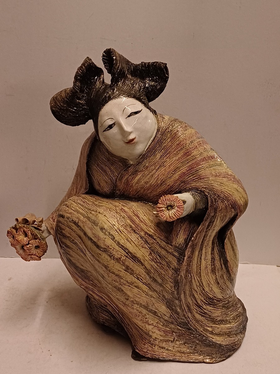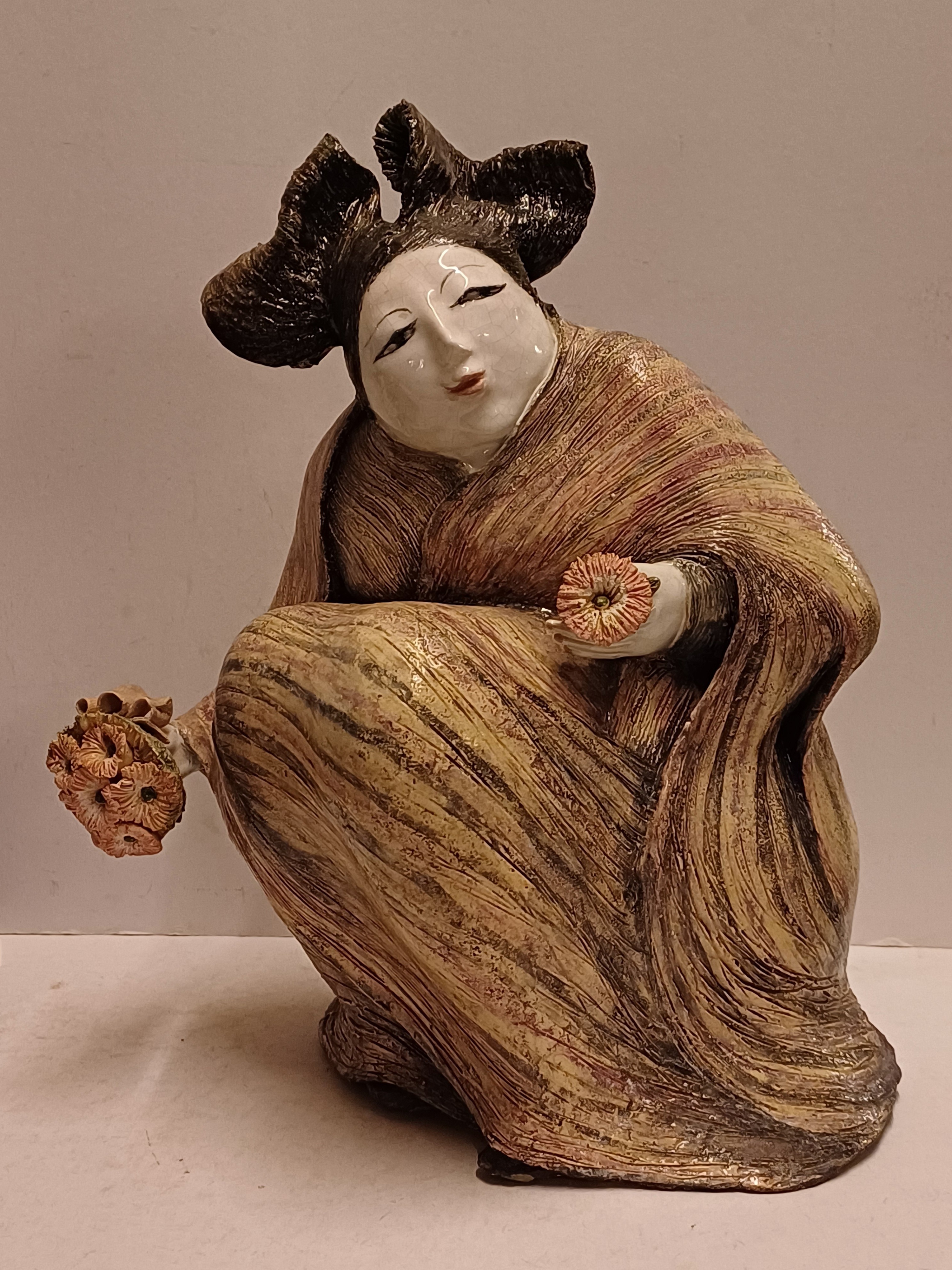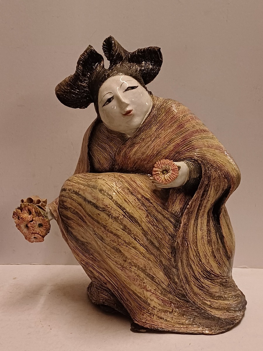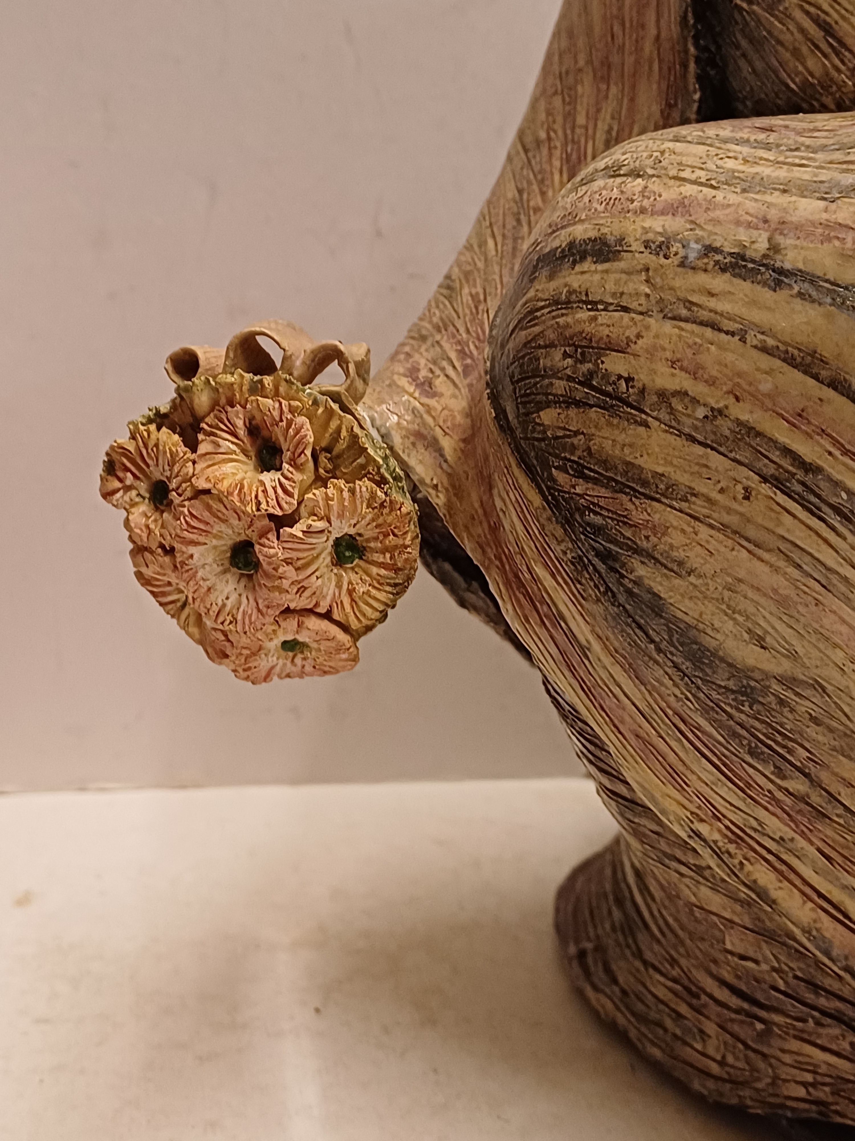 Aardewerken hand gemodelleerd vormstuk van een dame met bloemen. Onderzijde voluit gesigneerd.