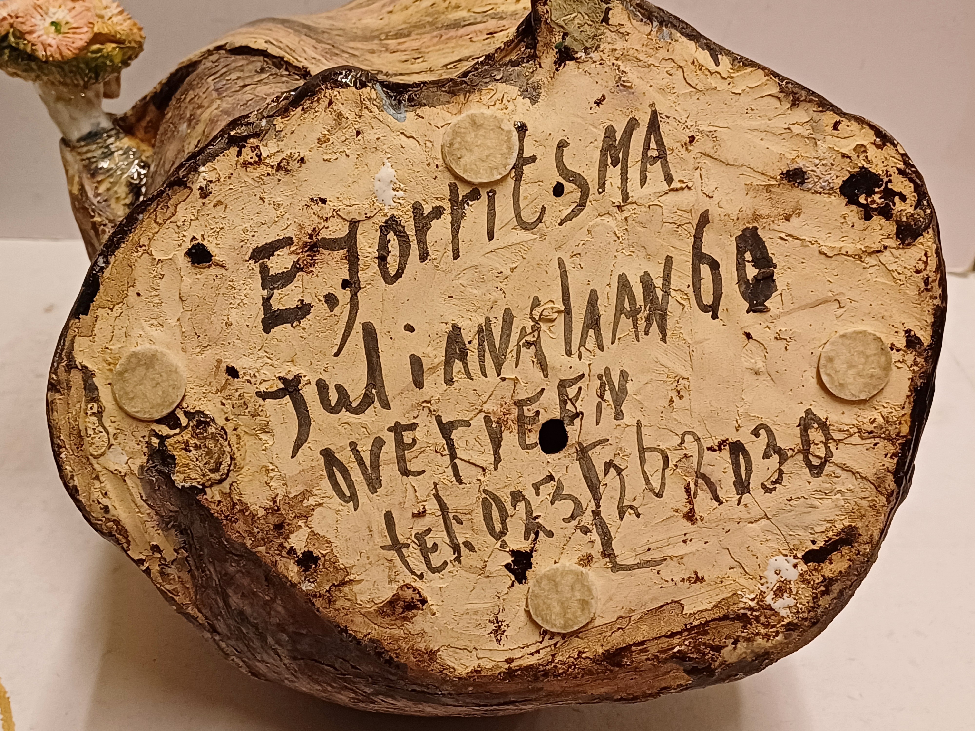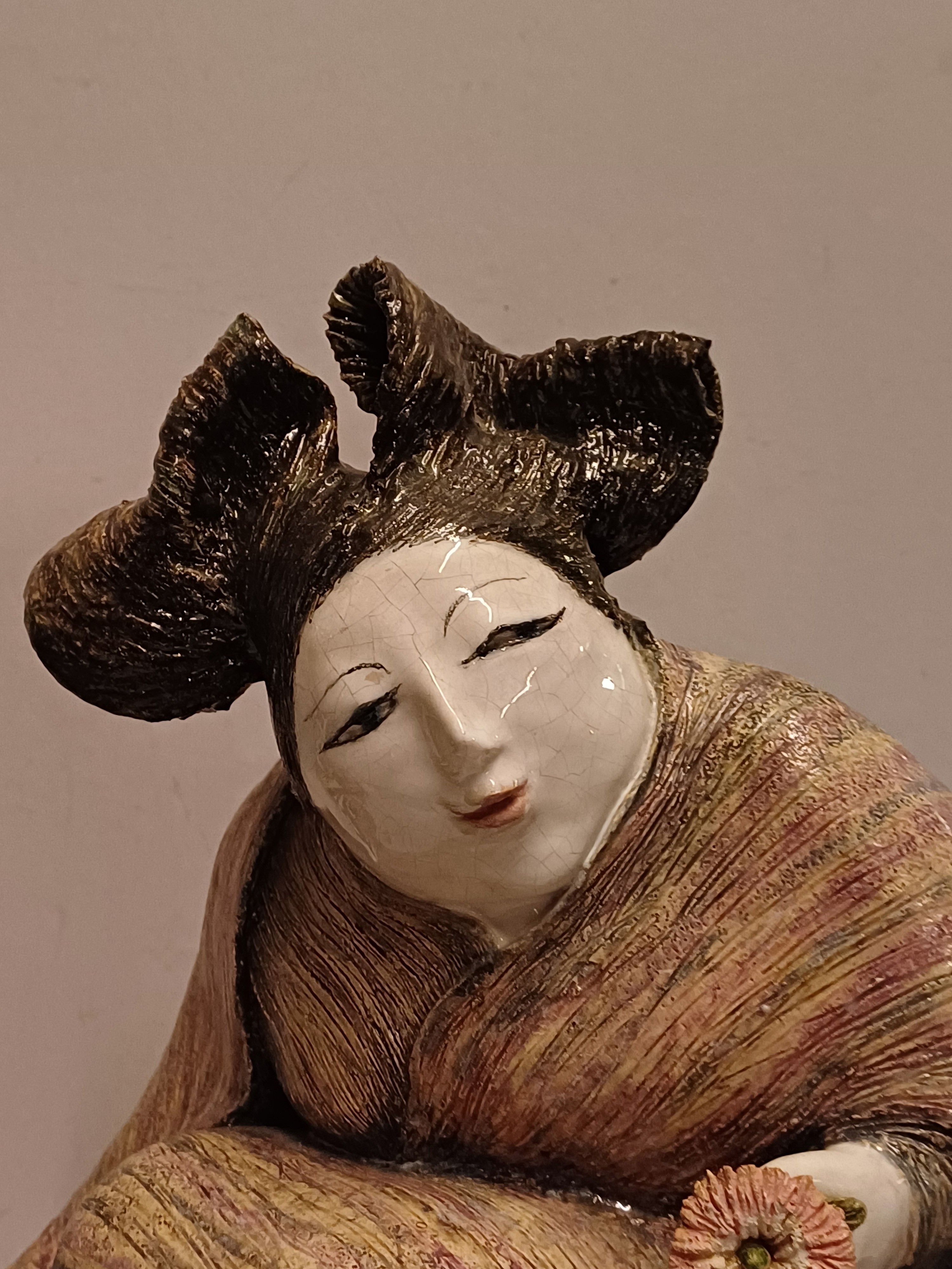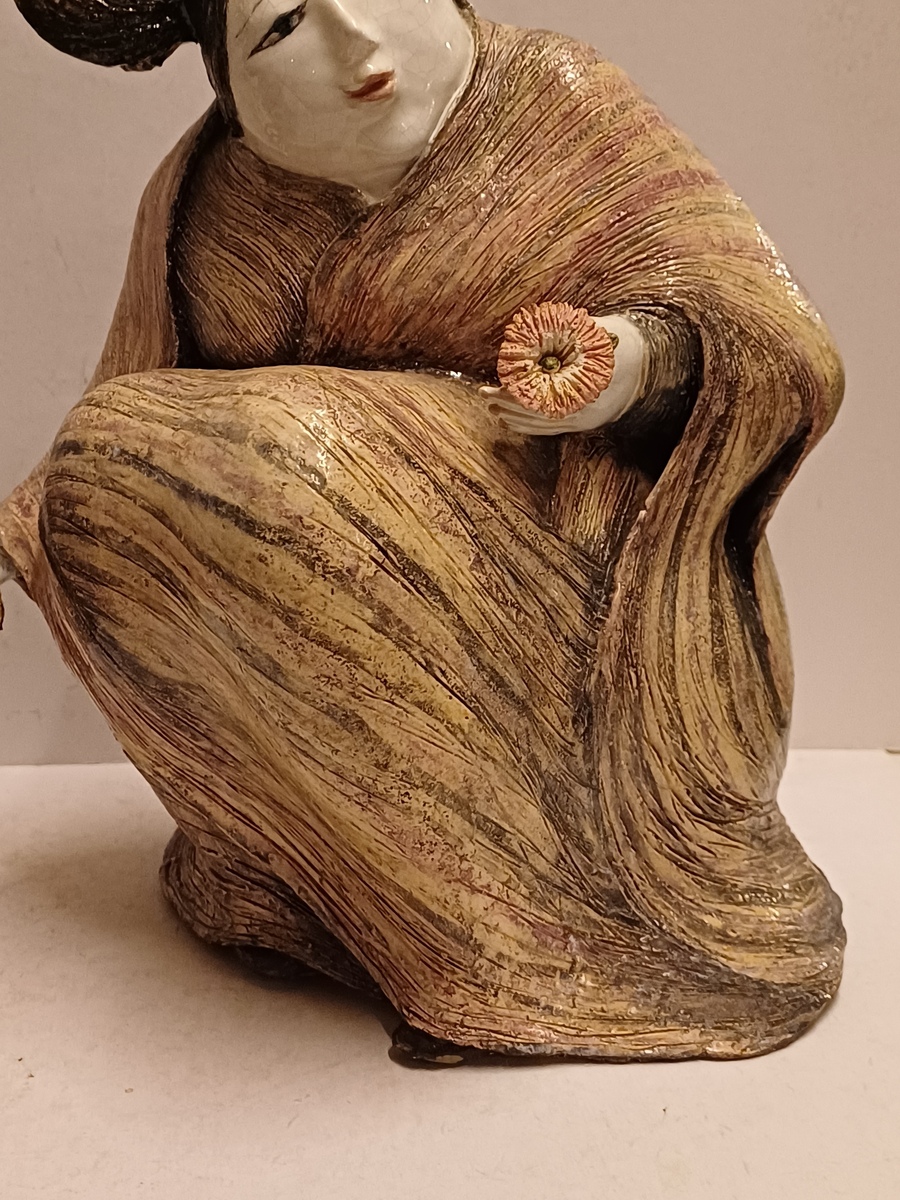 Aardewerken hand gemodelleerd vormstuk van een dame met bloemen. Onderzijde voluit gesigneerd.