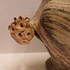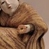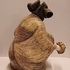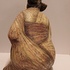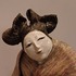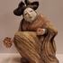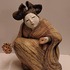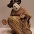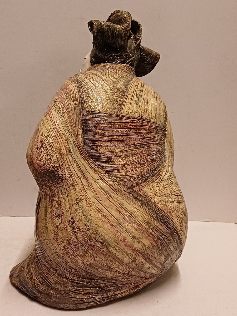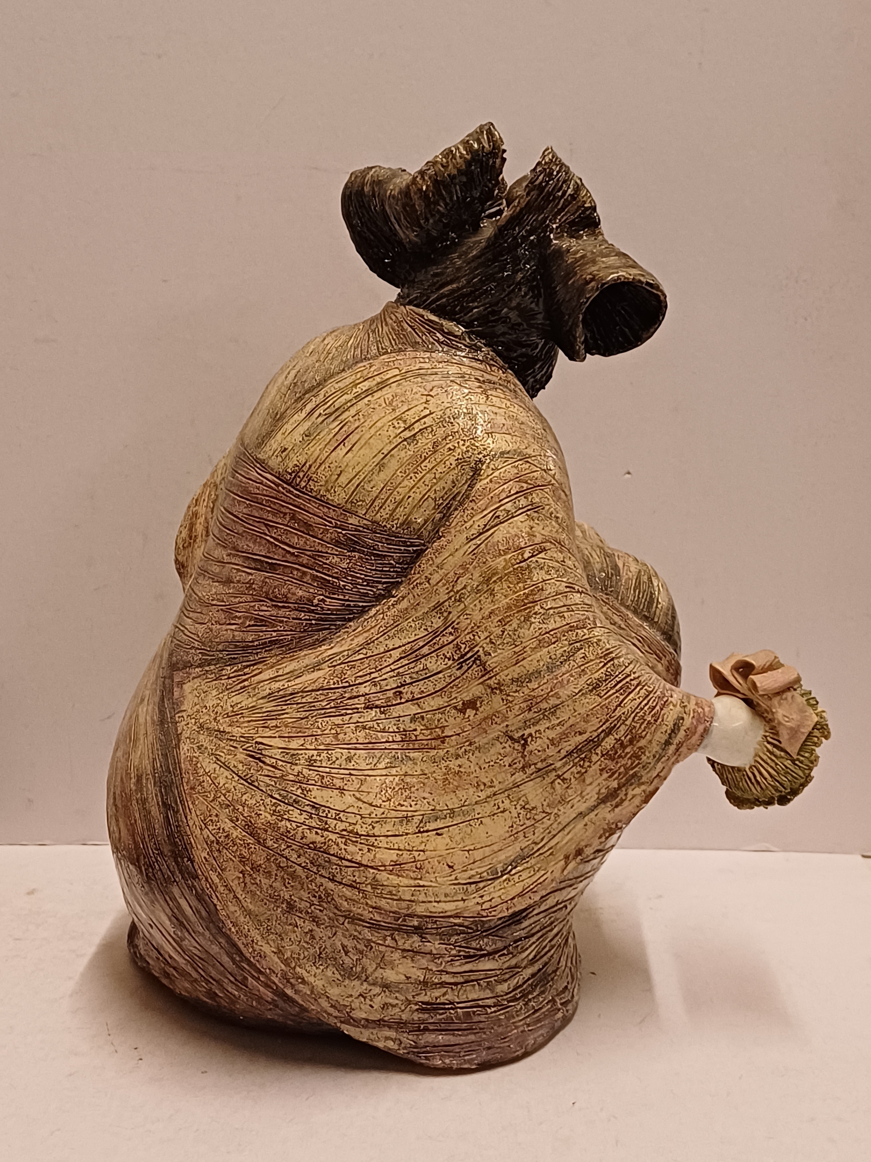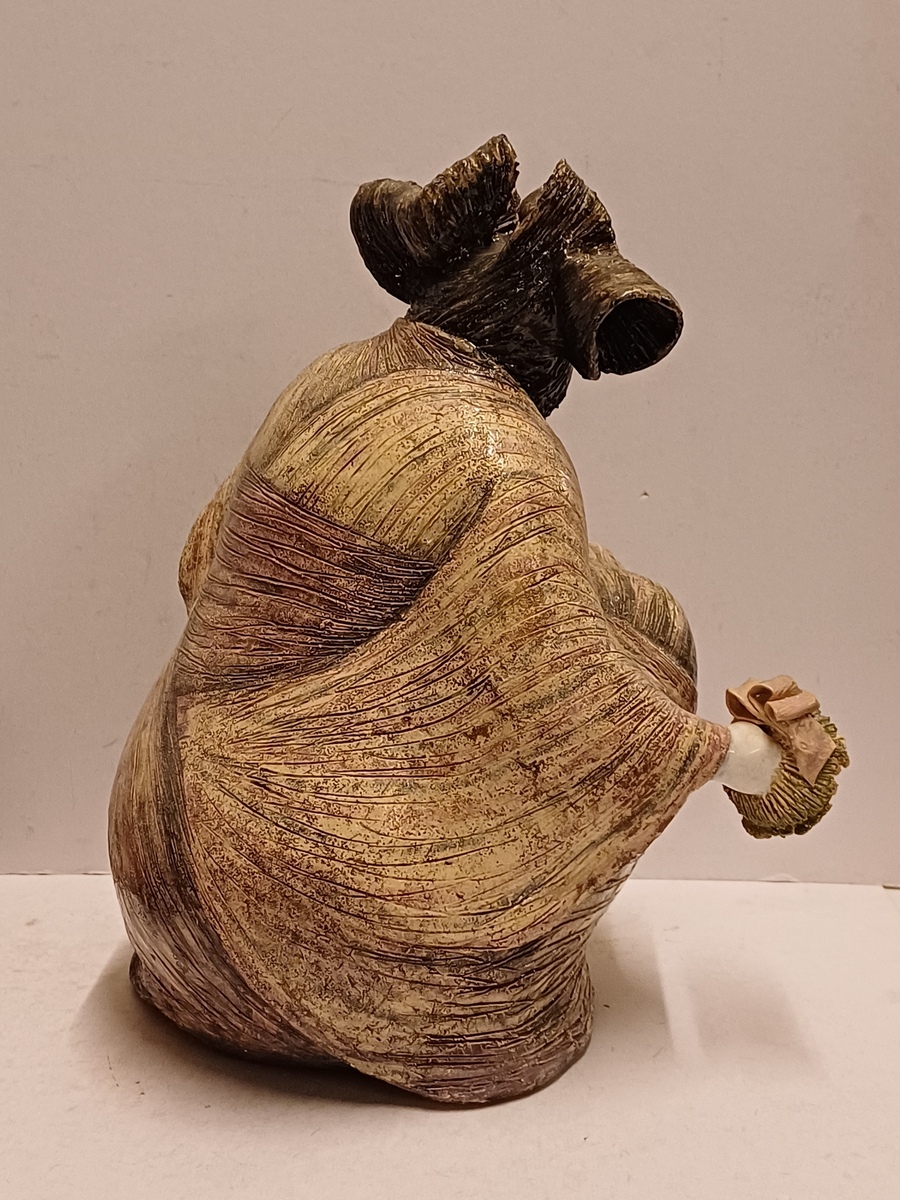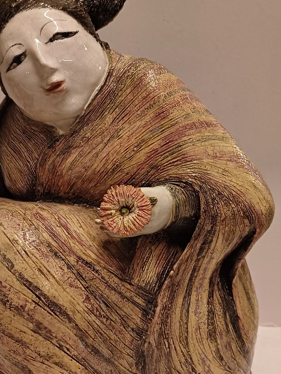 Aardewerken hand gemodelleerd vormstuk van een dame met bloemen. Onderzijde voluit gesigneerd.