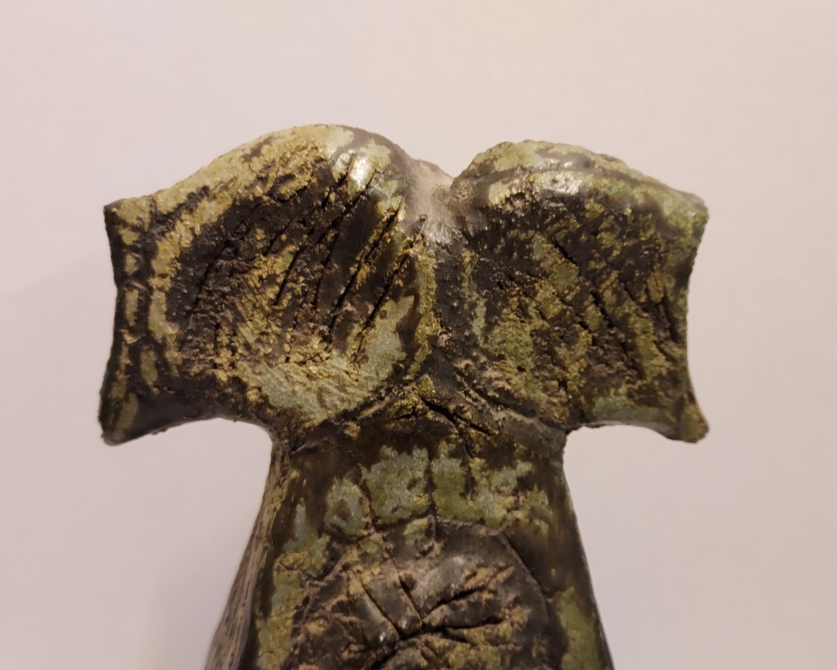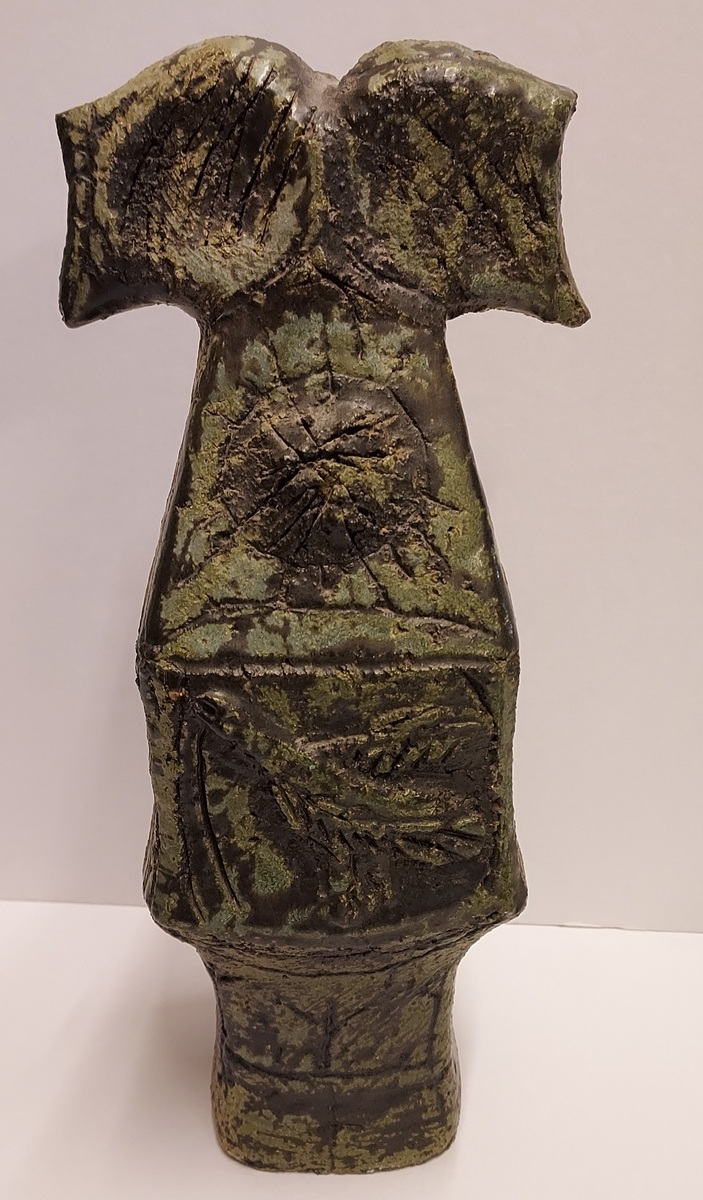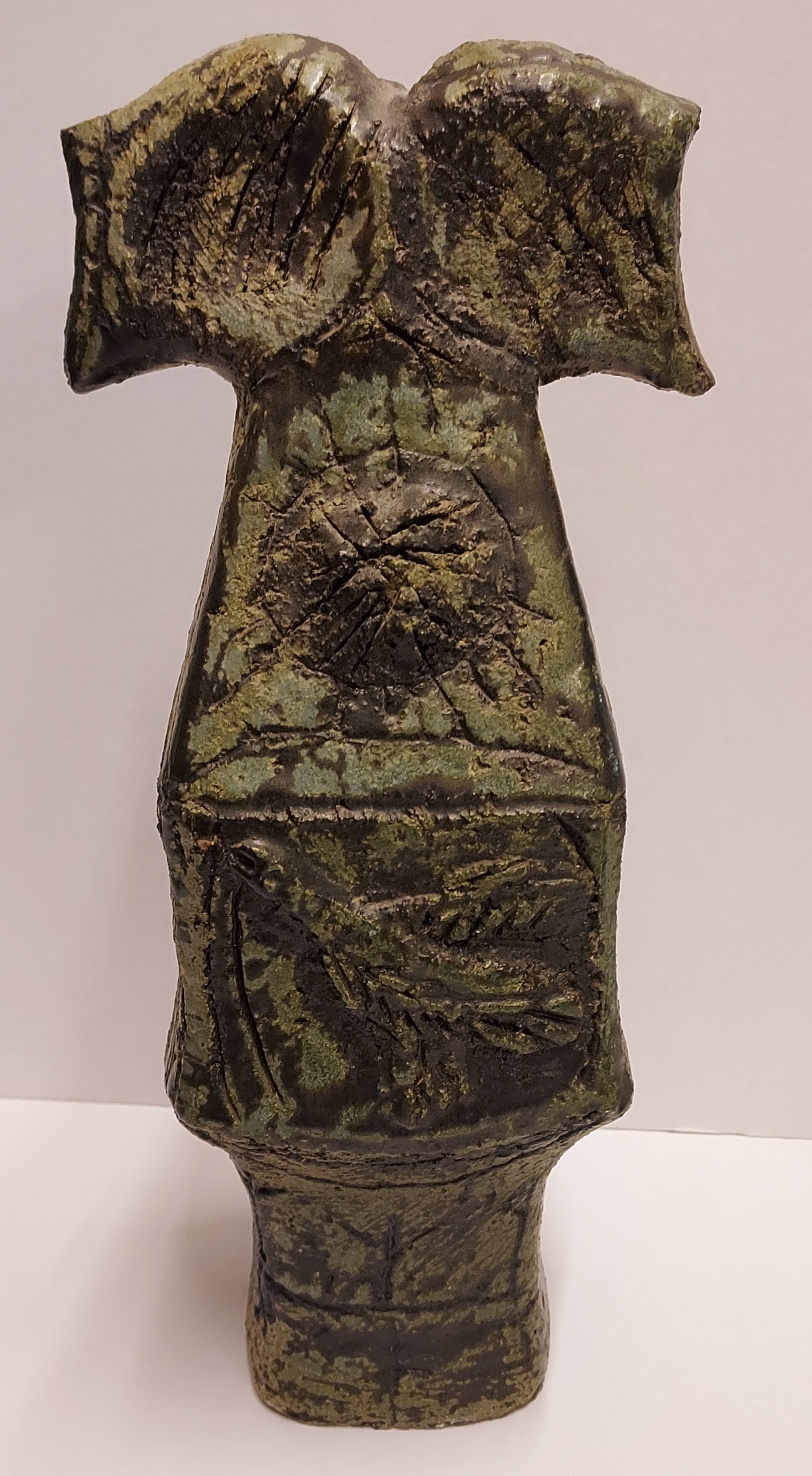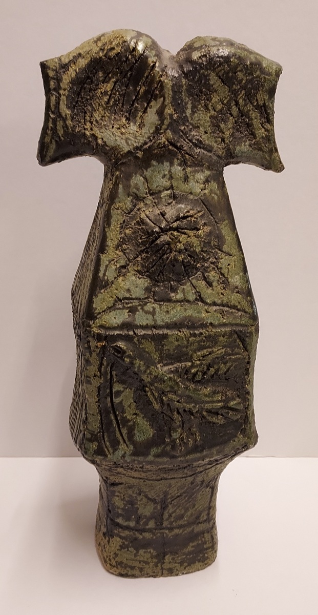 Scultura modellata a mano con smalto verde nero e decorazioni incise. Titolo "Madame Butterfly". Realizzata dall'Experimentele afdeling Porceleyne Fles Delft nel 1961. Il fondo è firmato con il marchio della fabbrica, il monogramma dell'artista e il numero 690, Ex collezione J.W.N. van Agterbergh.
