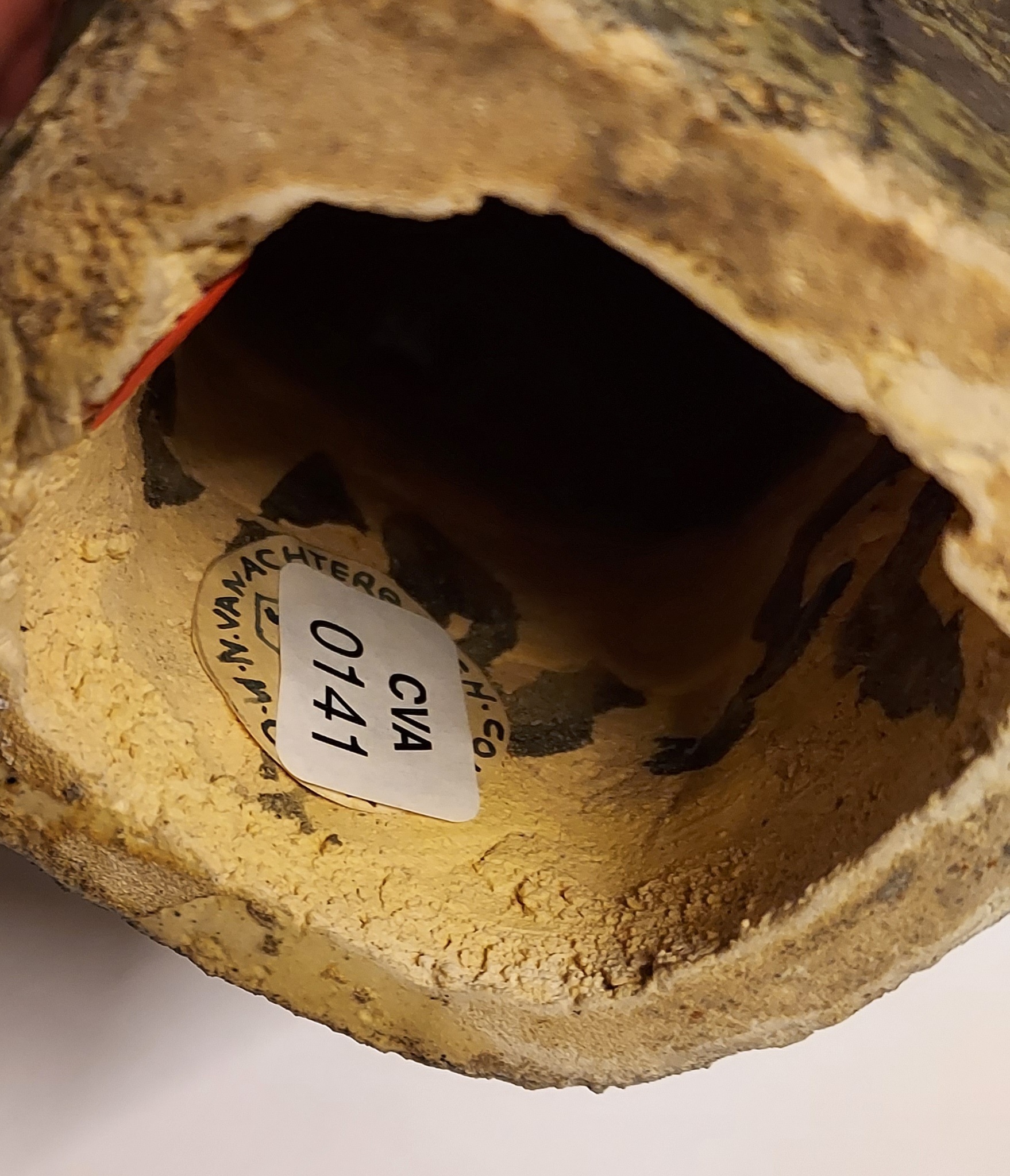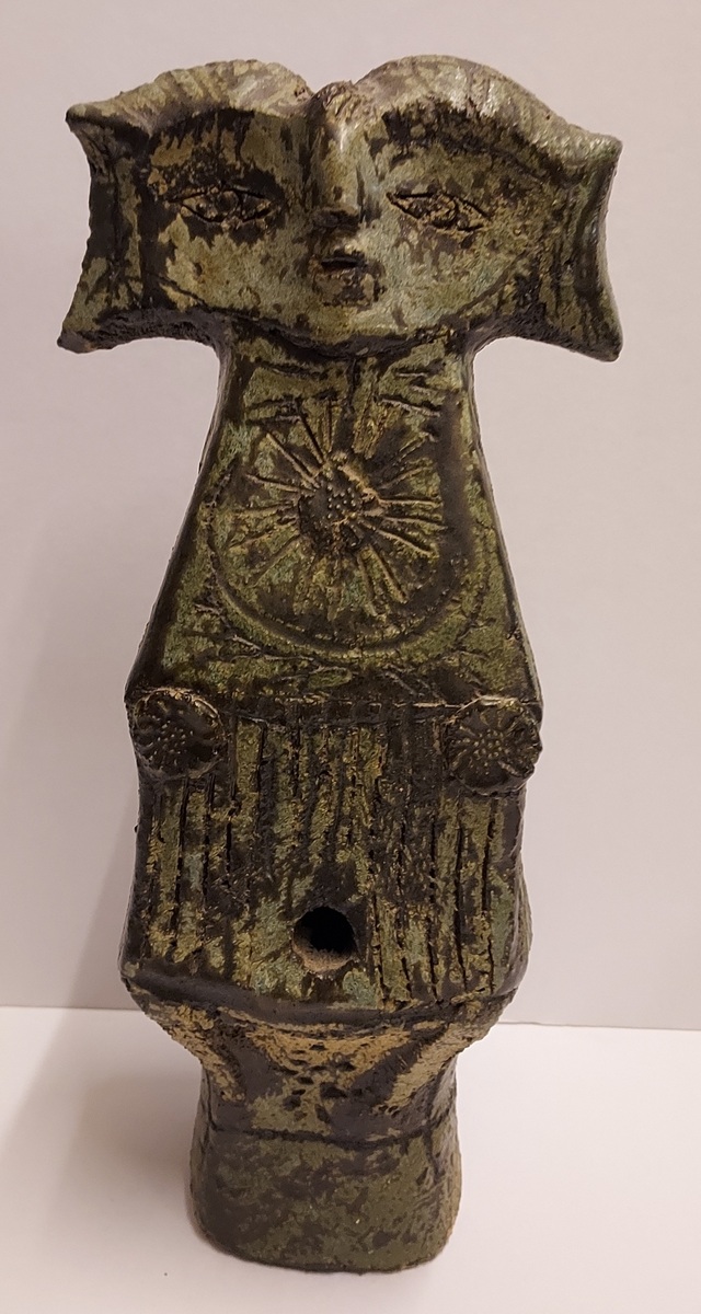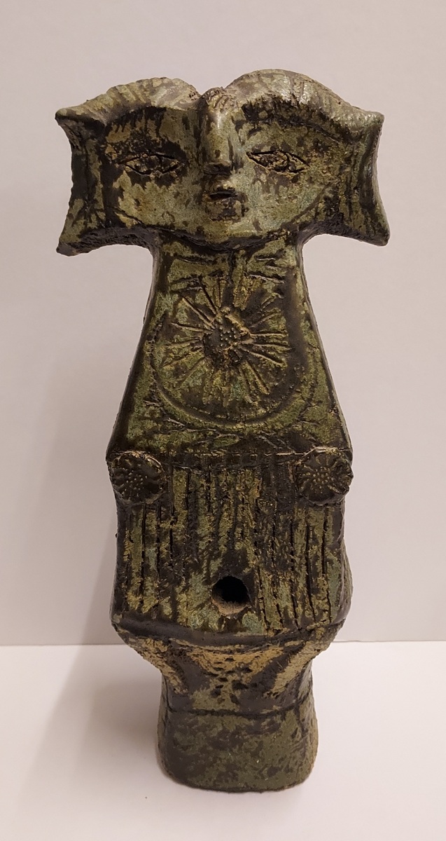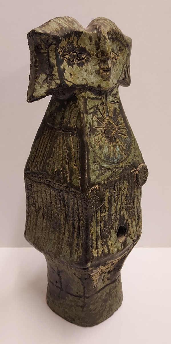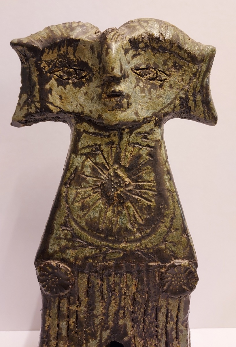 Scultura modellata a mano con smalto verde nero e decorazioni incise. Titolo "Madame Butterfly". Realizzata dall'Experimentele afdeling Porceleyne Fles Delft nel 1961. Il fondo è firmato con il marchio della fabbrica, il monogramma dell'artista e il numero 690, Ex collezione J.W.N. van Agterbergh.