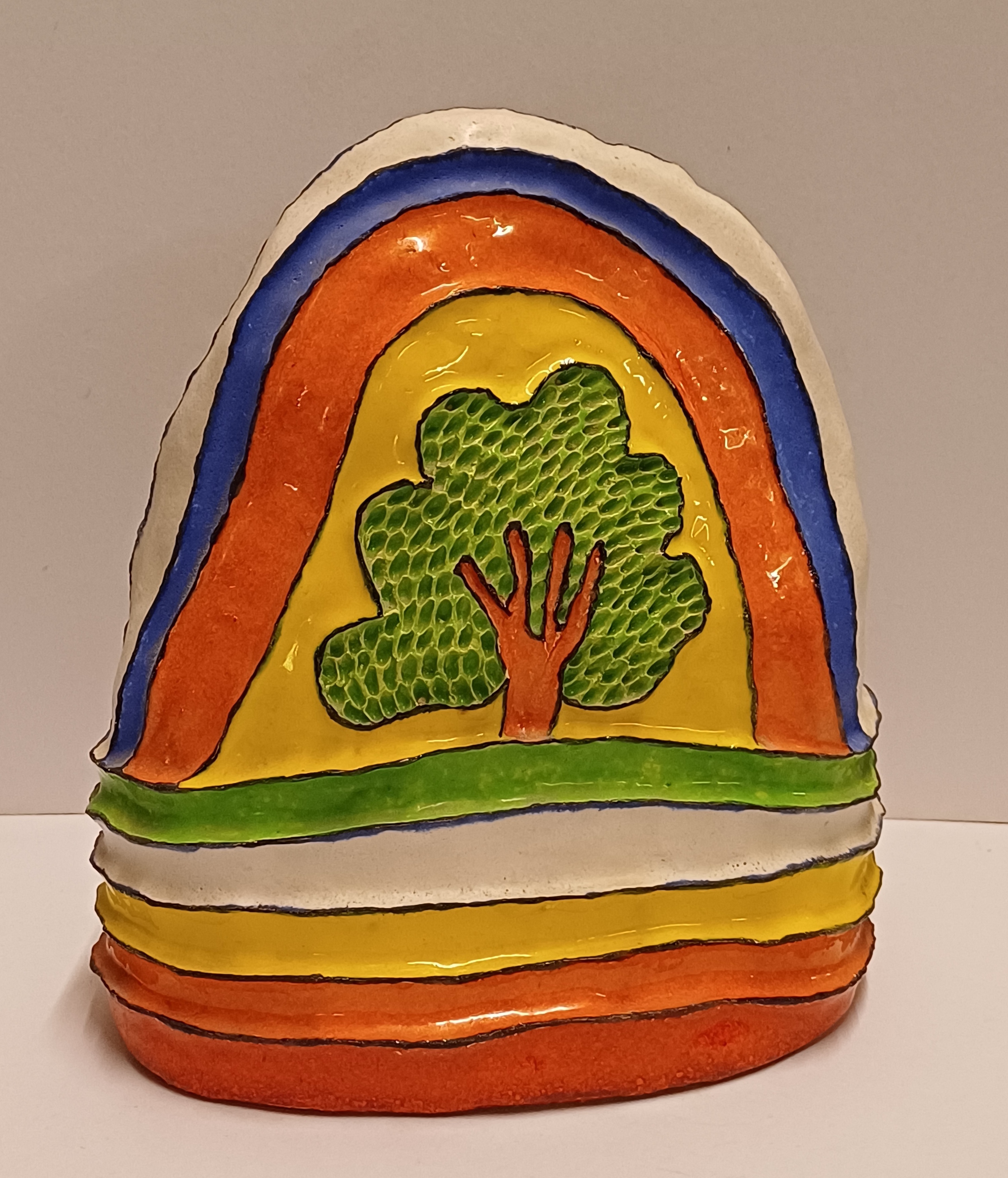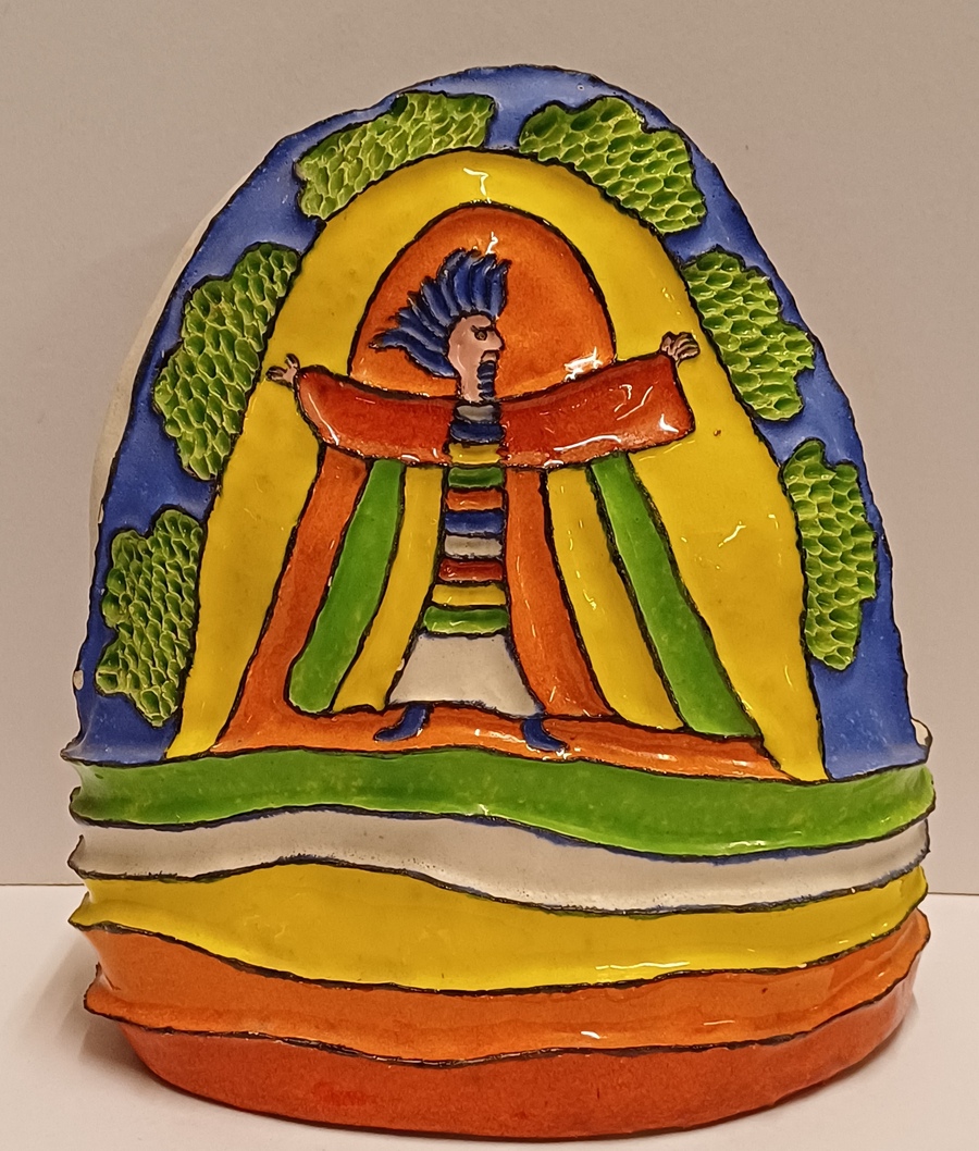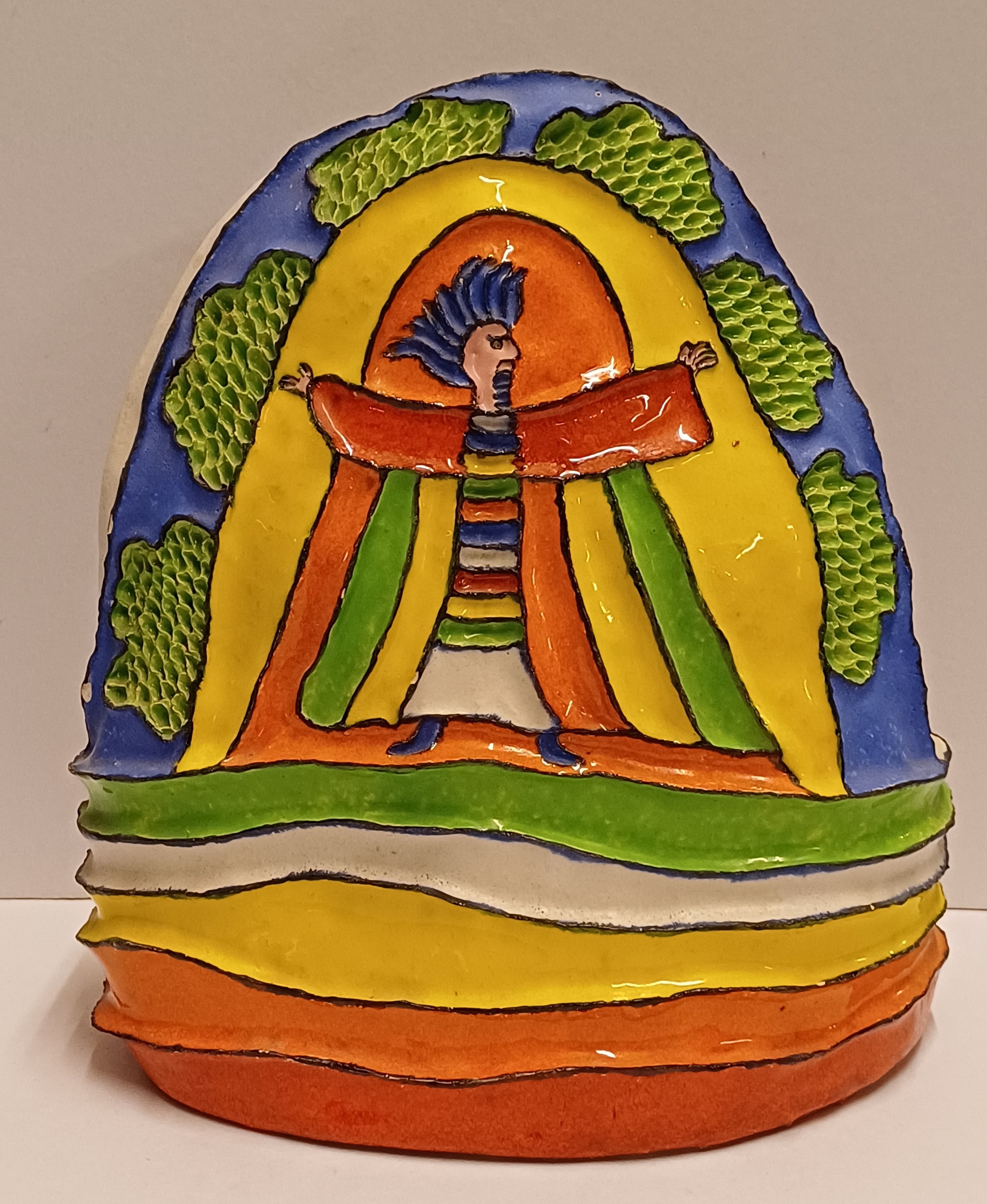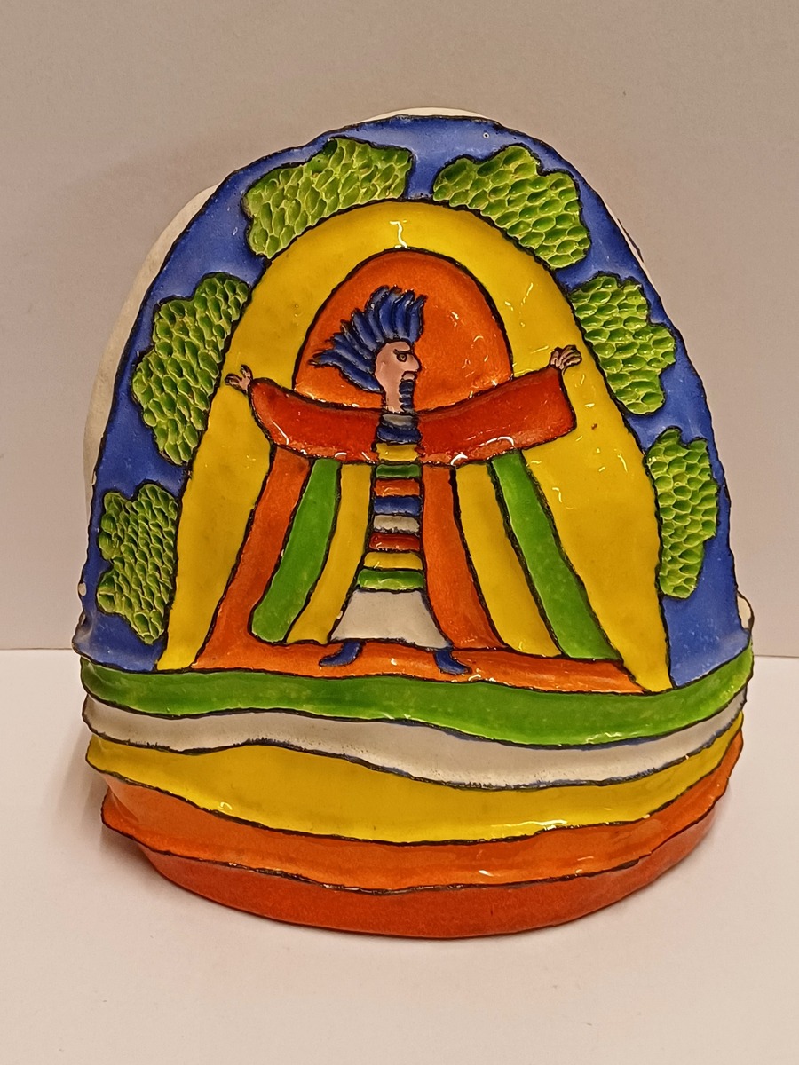 Aardewerken landschap met figuur in veelkleurige rok, verso een boom. Onderzijde gesigneerd en gedateerd 1979.