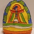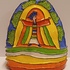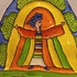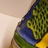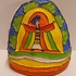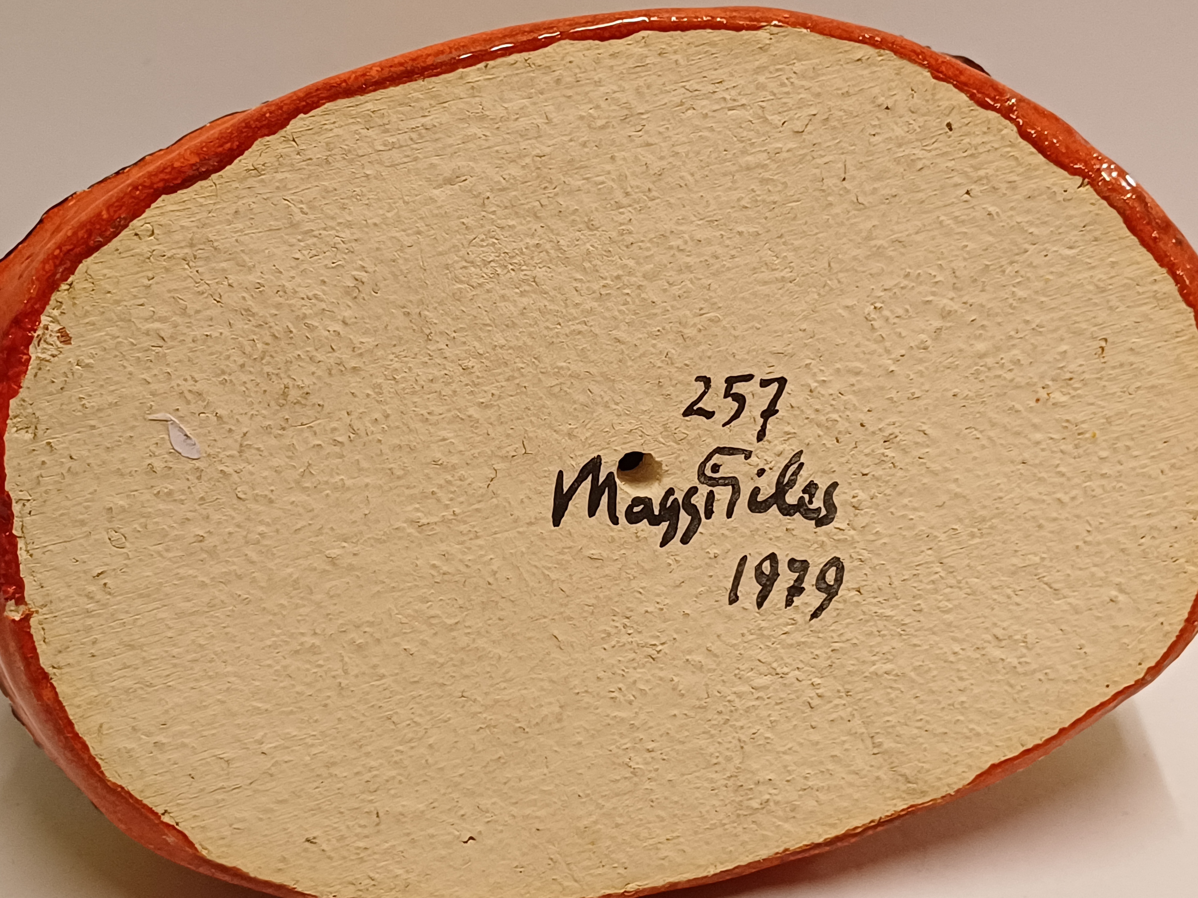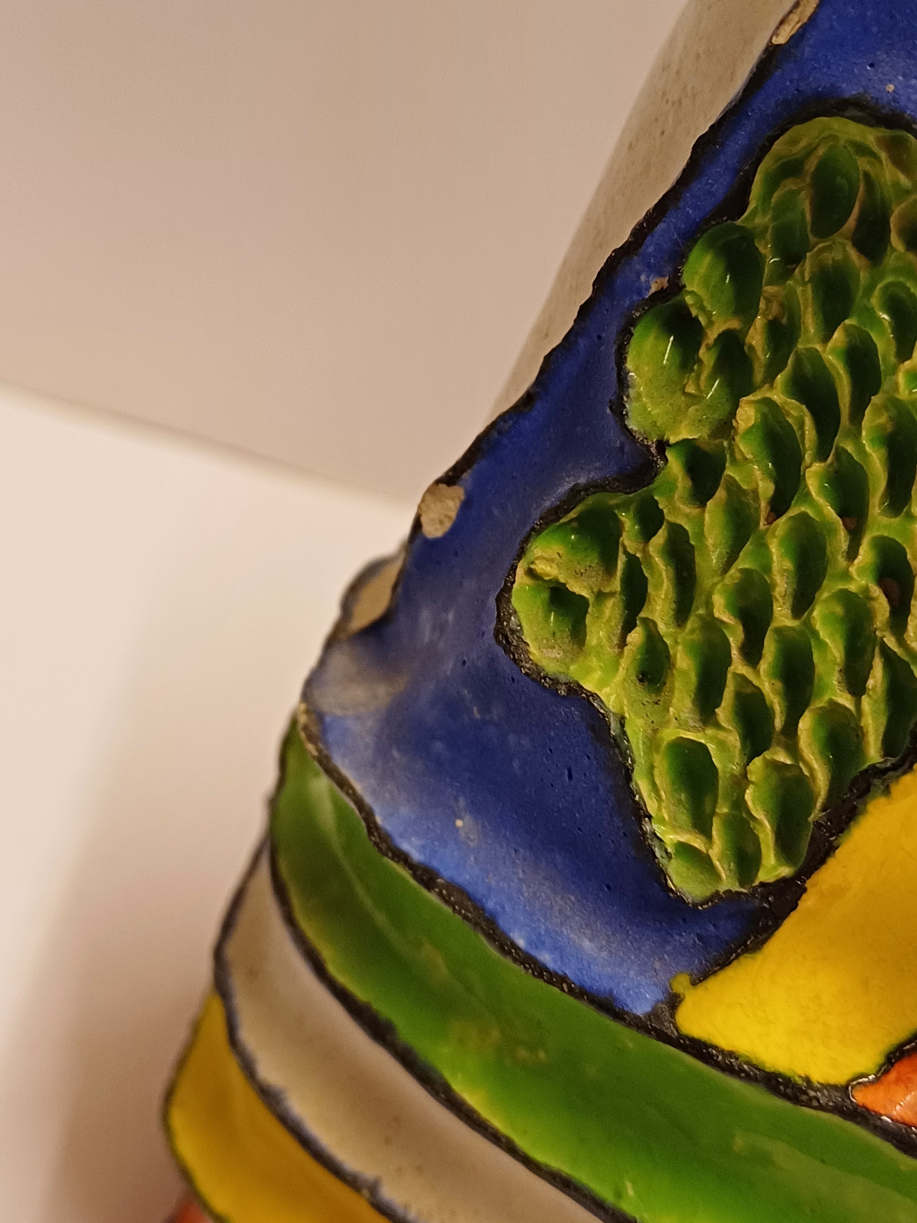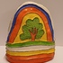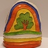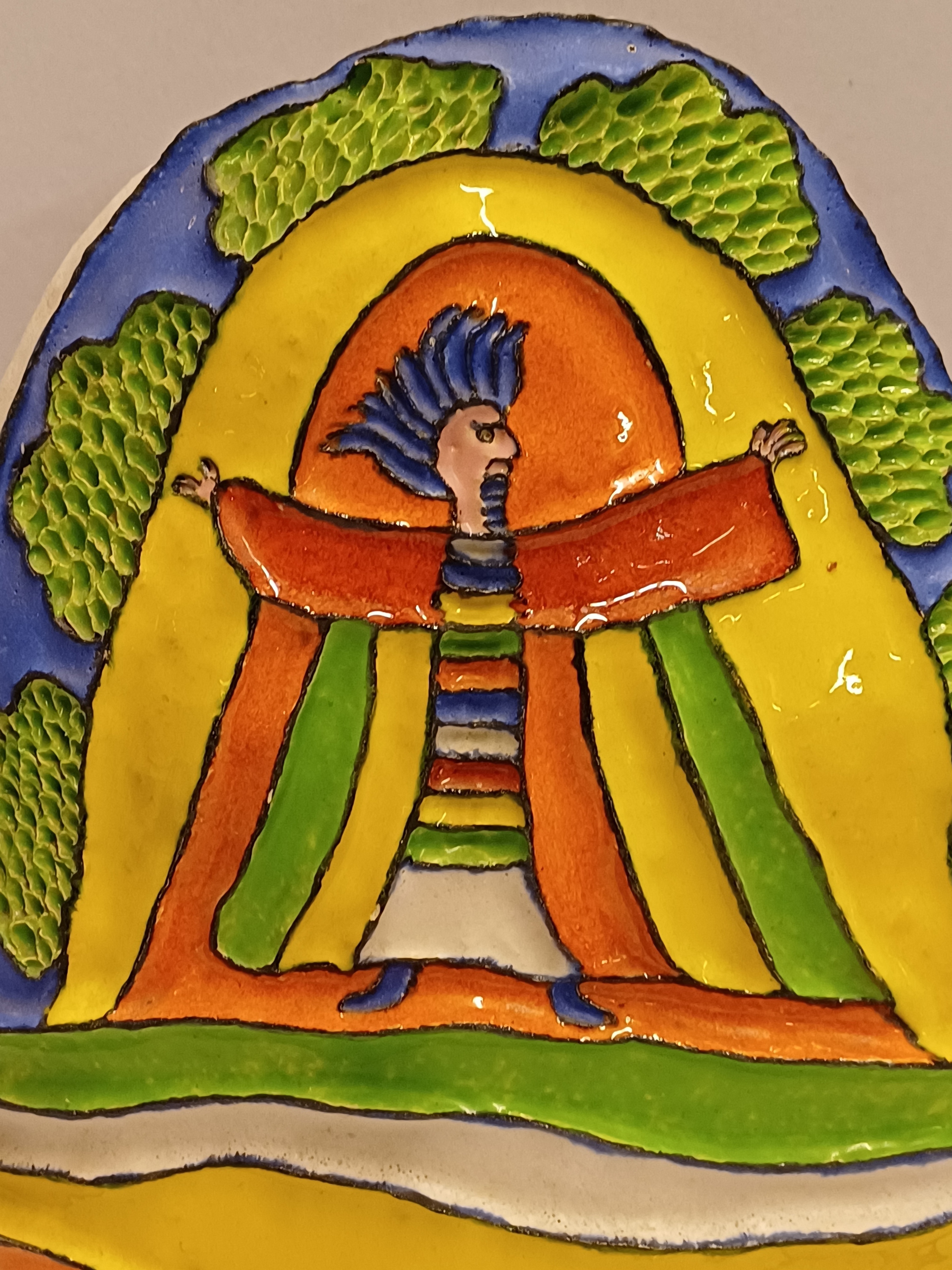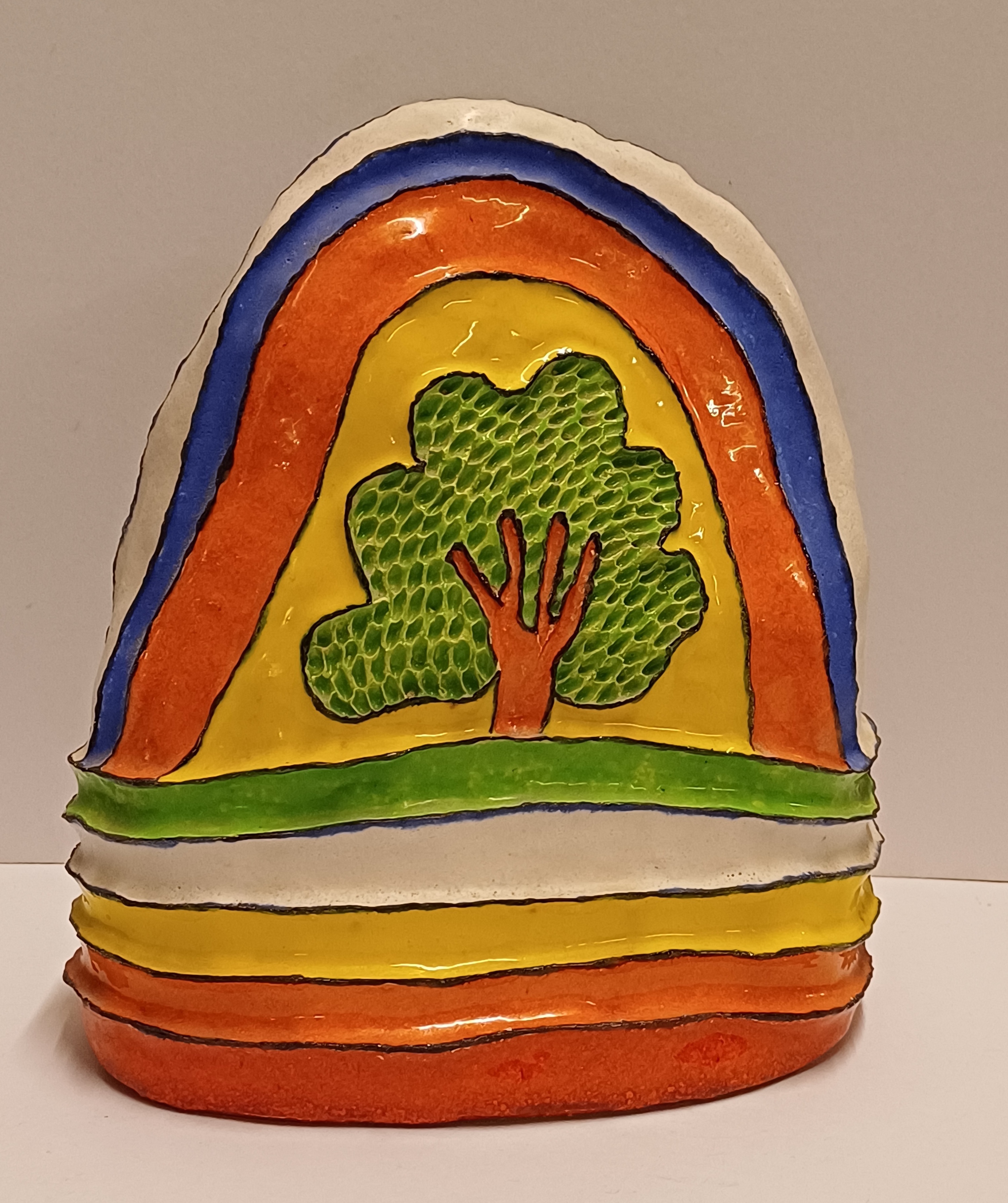 Aardewerken landschap met figuur in veelkleurige rok, verso een boom. Onderzijde gesigneerd en gedateerd 1979.