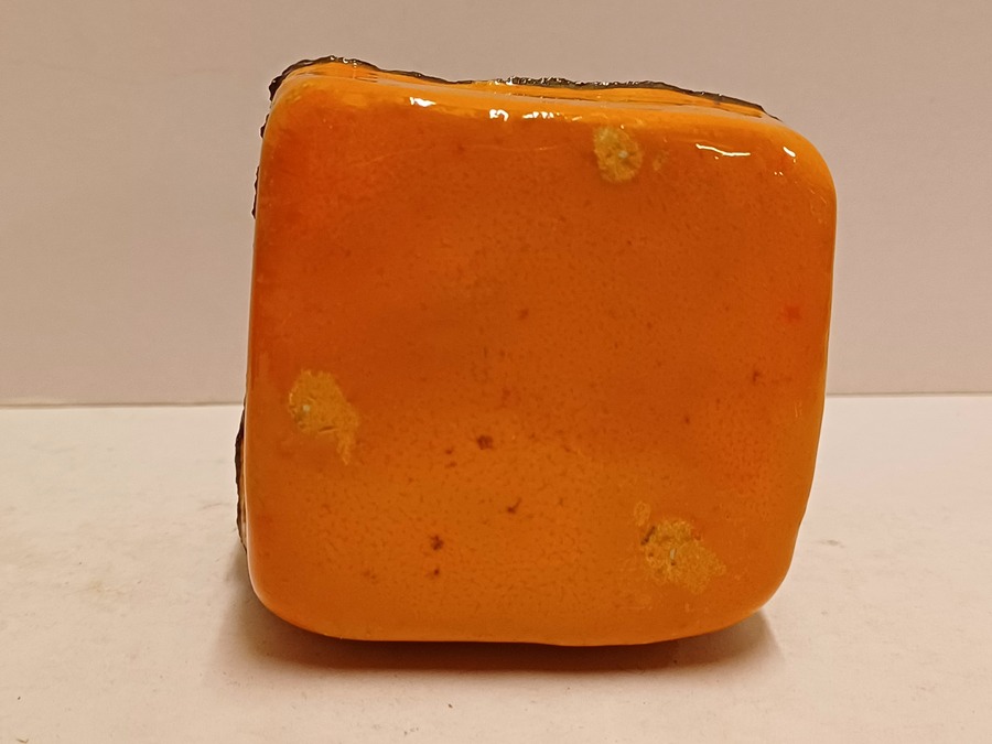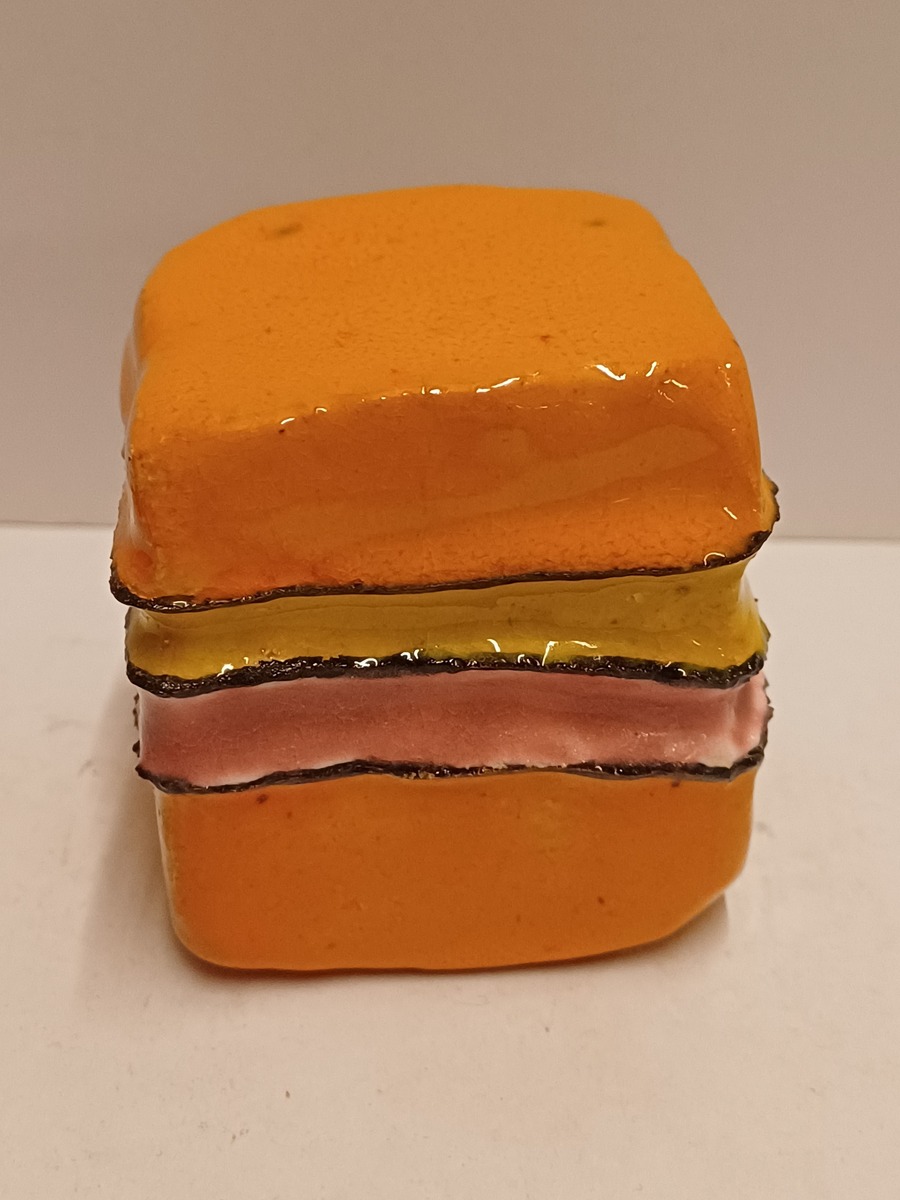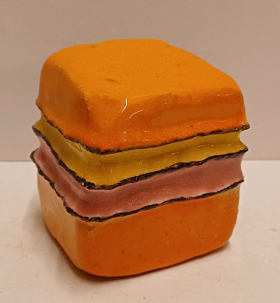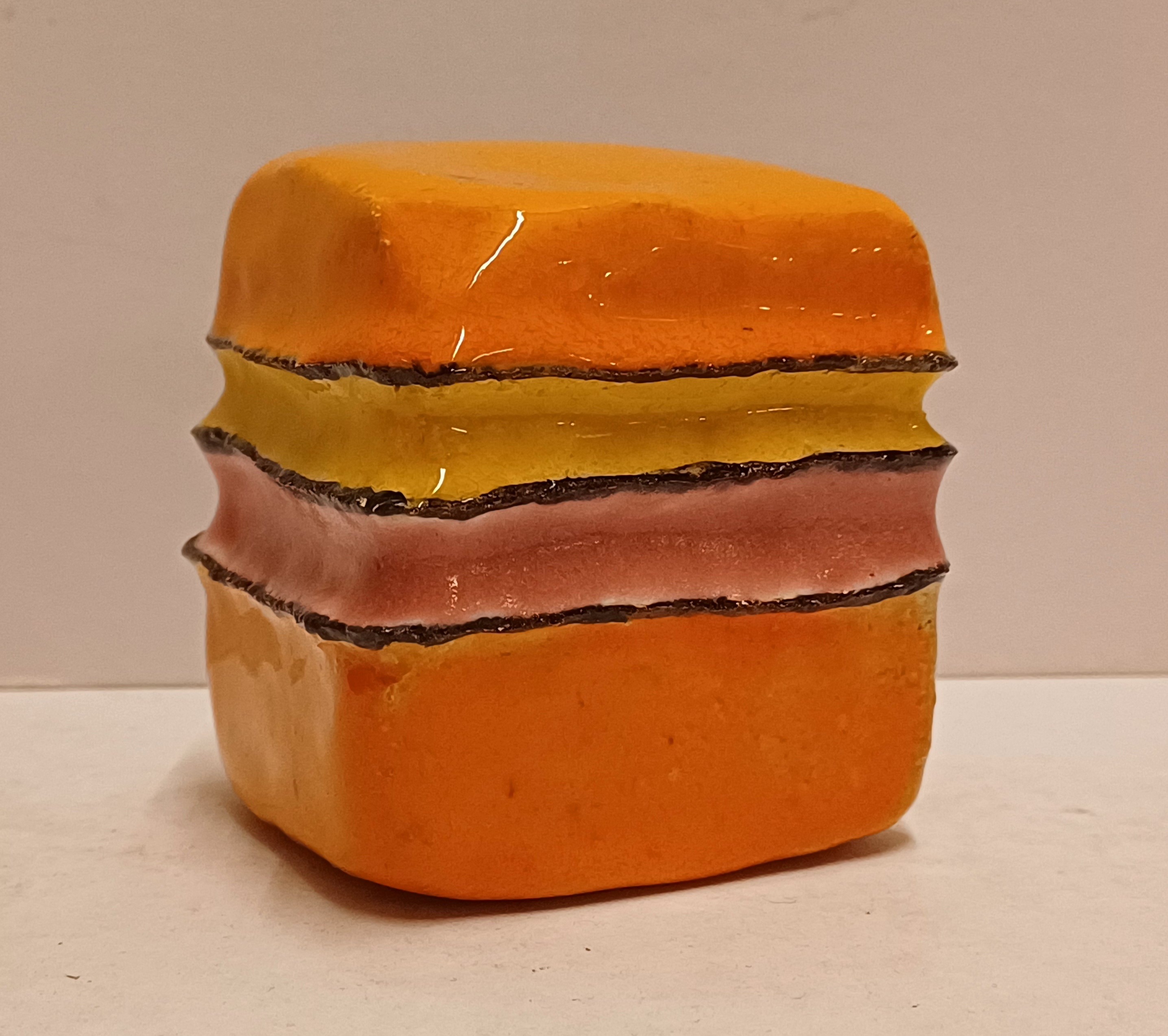 Kleine aardewerken stapeling met veelkleurige glazuur. Ogenschijnlijk niet gesigneerd