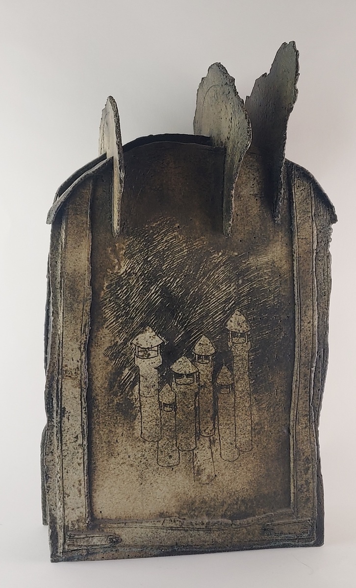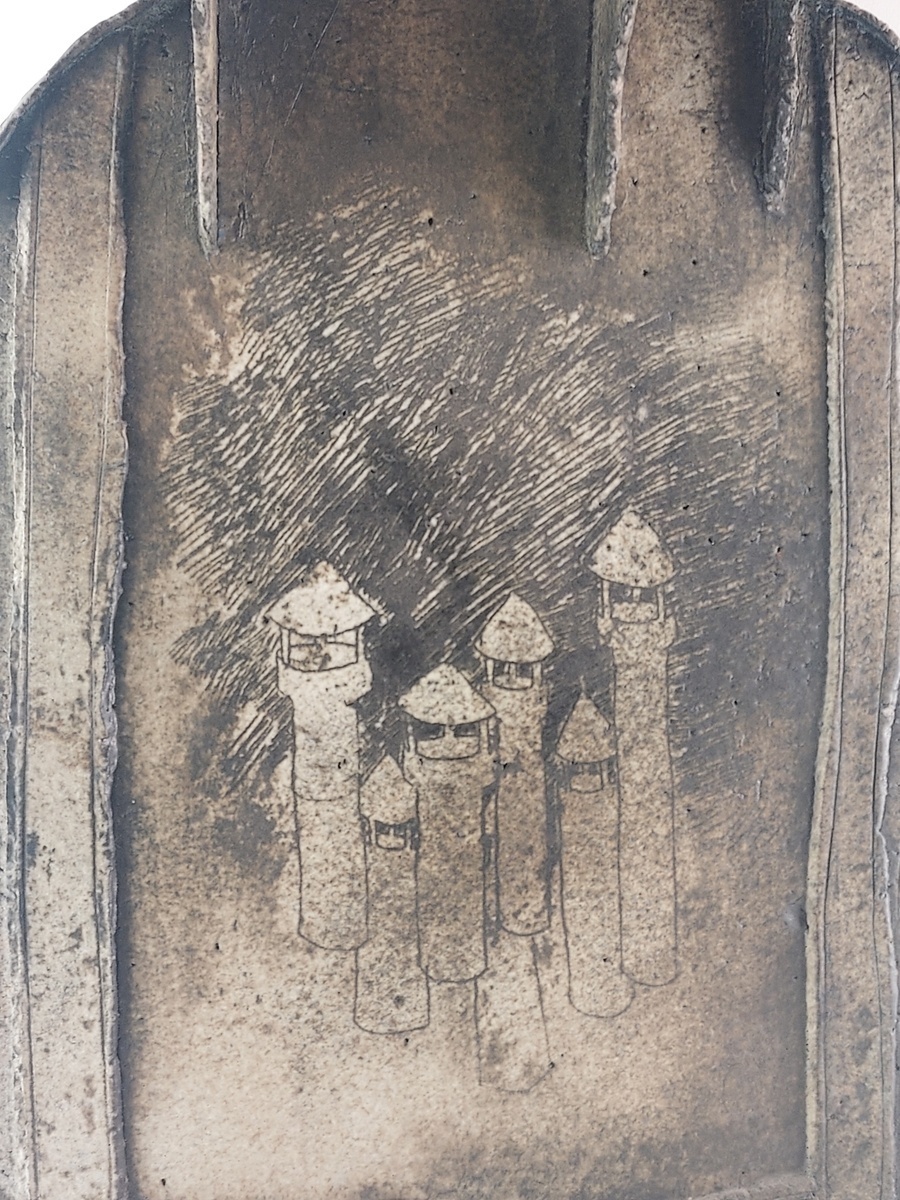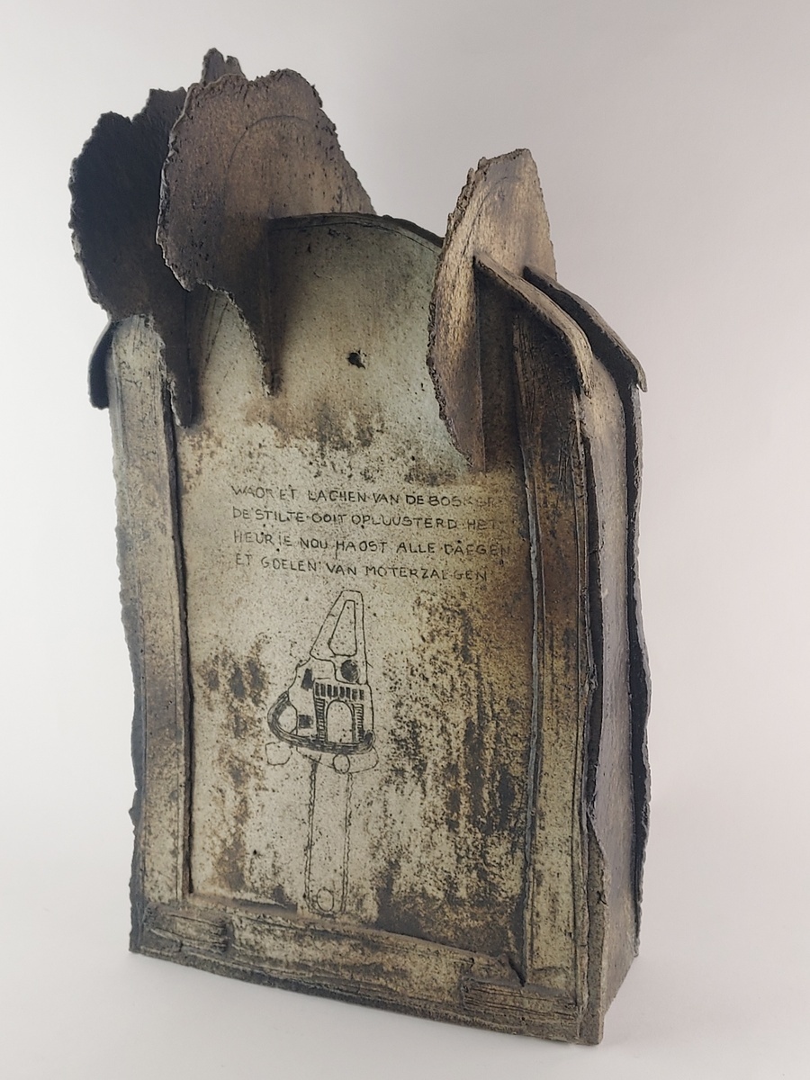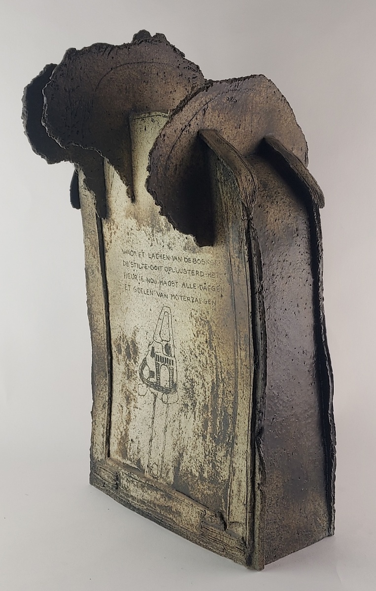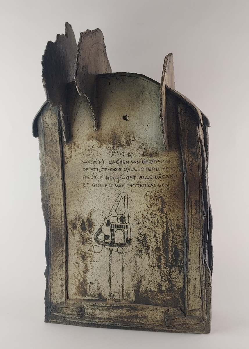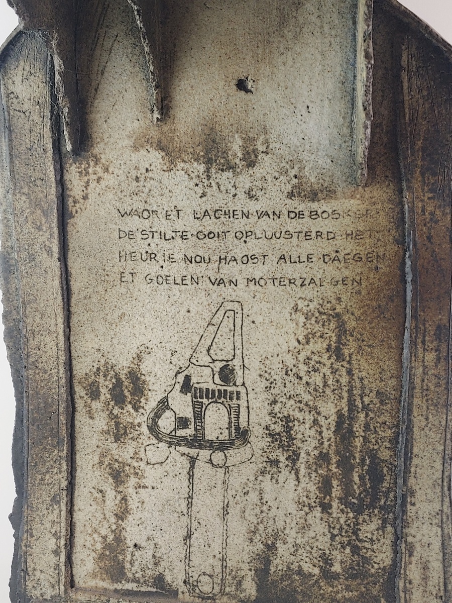 Opera precoce di una serie dedicata ai Stellingwerven. Raffigurazione di una motosega, torri di guardia e un testo di Harrie Ernst (poeta/scrittore di Olderberkoop). Inizio degli anni '80. Ex Collezione Stubbe Groningen.